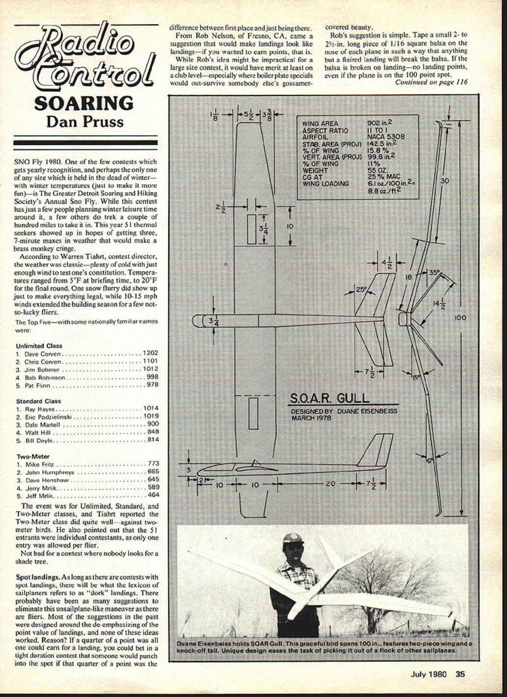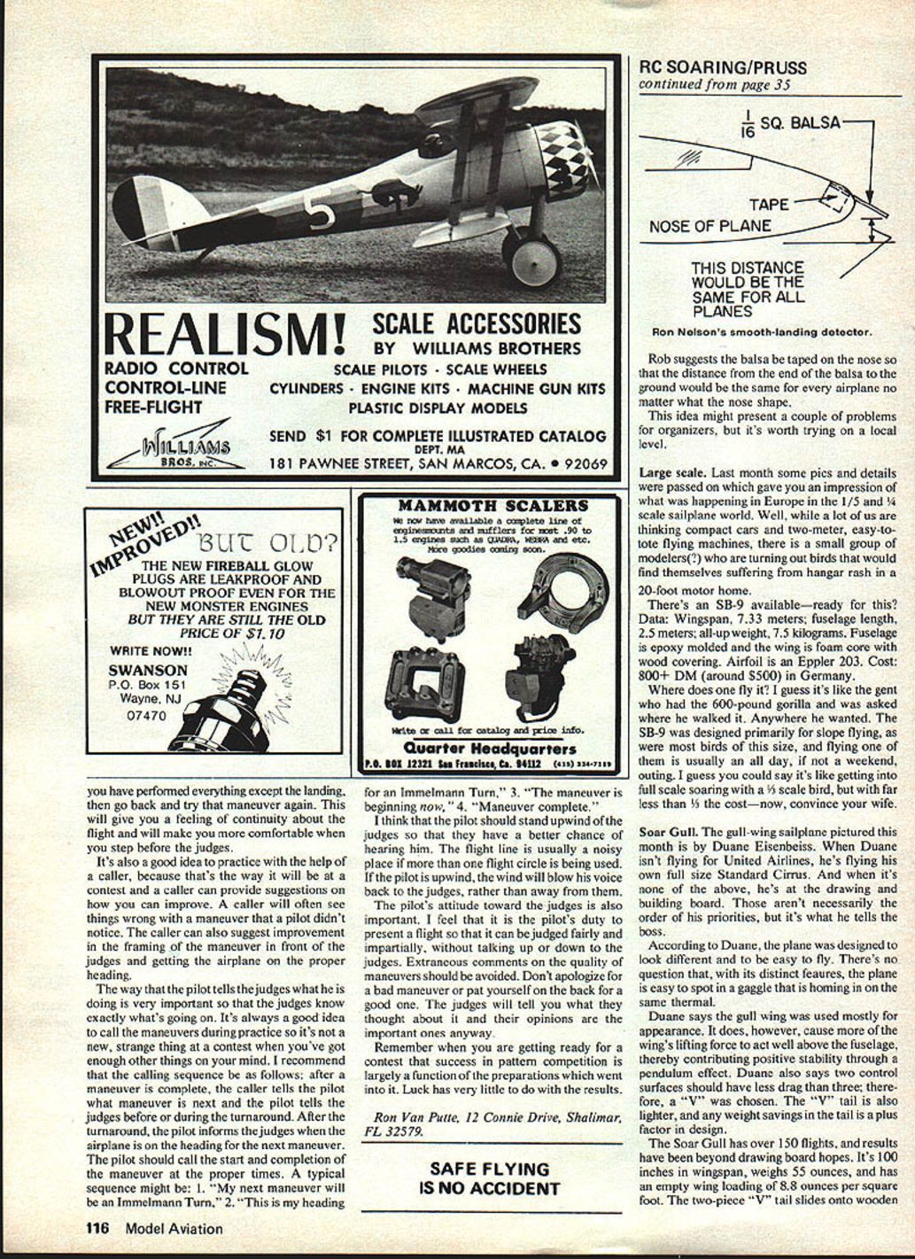 SOARING Dan Pruss difference between first place just being therecovered beauty Rob Nelson Fresno CA came Robs suggestion simple Tape small 2- suggestion would make landings look like 22-in long piece 1/16 square balsa landingsif wanted earn points nose plane such way anything Robs idea might impractical flaired landing will break balsa large size contest would have merit least balsa broken landingno landing points club levelespecially boilerplate specials plane 100 point spot would out-survive somebody elses gossamer- Continued page 116 SNO Fly 1980 few contests gets yearly recognition perhaps size held dead winter winter temperatures just make funis Greater Detroit Soaring Hiking Societys Annual Sno Fly contest has just few people planning winter leisure time around few others trek couple hundred miles take year 5 1 thermal seekers showed up hopes getting three 7-minute mazes weather would make brass monkey cringe According Warren Tiahrt contest director weather classicplenty cold just enough wind test ones constitution Tempera tures ranged 50F briefing time 200F final round snow flurry did show up just make everything legal 10-15 mph winds extended building season few notso-lucky fliers Top Fivewith some nationally familiar names Unlimited Class 1Dave Corven1202 2Chris Corven1101 3Jim Bohmer1012 4Bob Robinson998 5Pat Flinn978 Standard Class 1Ray Hayes1014 2Eric Podzielinski1019 3Dale Martell900 4Walt Hill848 5Bill Doyle814 Two-Meter 1Mike Fritz73 2John Humphreys665 3Dave Henshaw645 4Jerry Mrlik589 5Jeff Mrlik464 event Unlimited Standard Two-Meter classes Tiahrt reported Two-Meter class did quite wellagainst twometer birds also pointed out 5 1 entrants individual contestants entry allowed per flier bad contest nobody looks shade tree Spot landings As long contests spot landings will what lexicon sailplaners refers dork landings probably have suggestions eliminate unsailplane-like maneuver fliers Most suggestions past designed around de-emphasizing point value landings ideas worked Reason quarter point could earn landing could bet tight duration contest someone would punch spot quarter point July 1980 35 have peiformed everything except landing go back try maneuver again will give feeling continuity about flight will make comfortable step before judges Its also good idea practice help caller because thats way will contest caller can provide suggestions can improve caller will often see things wrong maneuver pilot didnt notice caller can also suggest improvement framing maneuver front judges getting airplane proper heading way pilot tells judges what doing very important judges know exactly whats going Its always good idea call maneuvers during practice its new strange thing contest youve got enough other things mind recommend calling sequence follows after maneuver complete caller tells pilot what maneuver next pilot tells judges before during turnaround After turnaround pilot informs judges airplane heading next maneuver pilot should call start completion maneuver proper times typical sequence might 1 next maneuver will Immelmann Turn 2 heading MAMMOTH SCALERS r have available ccuplete Jam Inesvazta aml rojfflers ,at 90 334718 hita a2og Quarter PS USE 12221 Sm Igmeim Ca 5*112 Immelmann Turn 3 maneuver beginning now 4 Maneuver complete think pilot should stand upwind judges have better chance hearing him flight line usually noisy place flight circle being used pilot upwind wind will blow voice back judges rather away pilots attitude toward judges also important feel pilots duty present flight can judged fairly impartially talking up down judges Extraneous comments quality maneuvers should avoided Dont apologize bad maneuver pat yourself back good judges will tell what thought about opinions important ones anyway Remember getting ready contest success pattern competition largely function preparations went Luck has very little results Ron Van Putte 12 Connie Drive Shalimar FL 32579 SAFE FLYING IS NO ACCIDENT RC SOARING/PR USS Co ntinued page 35 IBALSA SQ 16 TAPE- NOSE OF PLANE THIS DISTANCE WOULD BE THE SAME FOR ALL PLANES Ron Nelsons smoothlanding detector Rob suggests balsa taped nose distance end balsa ground would same airplane no matter what nose shape idea might present couple problems organizers its worth trying local level Large scale Last month some pics details passed gave impression what happening Europe 1/5 scale sailplane world Well lot us thinking compact cars two-meter easy-totote flying machines small group modelers turning out birds would find themselves suffering hangar rash 20-foot motor home Theres SB-9 availableready Data Wingspan 733 meters fuselage length 25 meters all-up weight 75 kilograms Fuselage epoxy molded wing foam core wood covering Airfoil Eppler 203 Cost 800 DM around $500 Germany does fly guess its like gent 600-pound gorilla asked walked Anywhere wanted SB-9 designed primarily slope flying birds size flying usually day weekend outing guess could say its like getting fill scale soaring scale bird far less 1/3 costnow convince wife Soar Gull gull-wing sailplane pictured month Duane Eisenbeiss Duane isnt flying United Airlines hes flying own full size Standard Cirrus its above hes drawing building board arent necessarily order priorities its what tells boss According Duane plane designed look different easy fly Theres no question its distinct feaures plane easy spot gaggle homing same thermal Duane says gull wing used mostly appearance does however cause wings lifting force act well above fuselage thereby contributing positive stability through pendulum effect Duane also says two control surfaces should have less drag three fore V chosen V tail also lighter weight savings tail plus factor design Soar Gull has over 150 flights results have beyond drawing board hopes Its 100 inches wingspan weighs 55 ounces has empty wing loading 88 ounces per square foot two-piece V tail slides onto wooden 116 Model Aviation REALISMSCALE ACCESSORIES TY WILLIAMS BROTHERS RAD