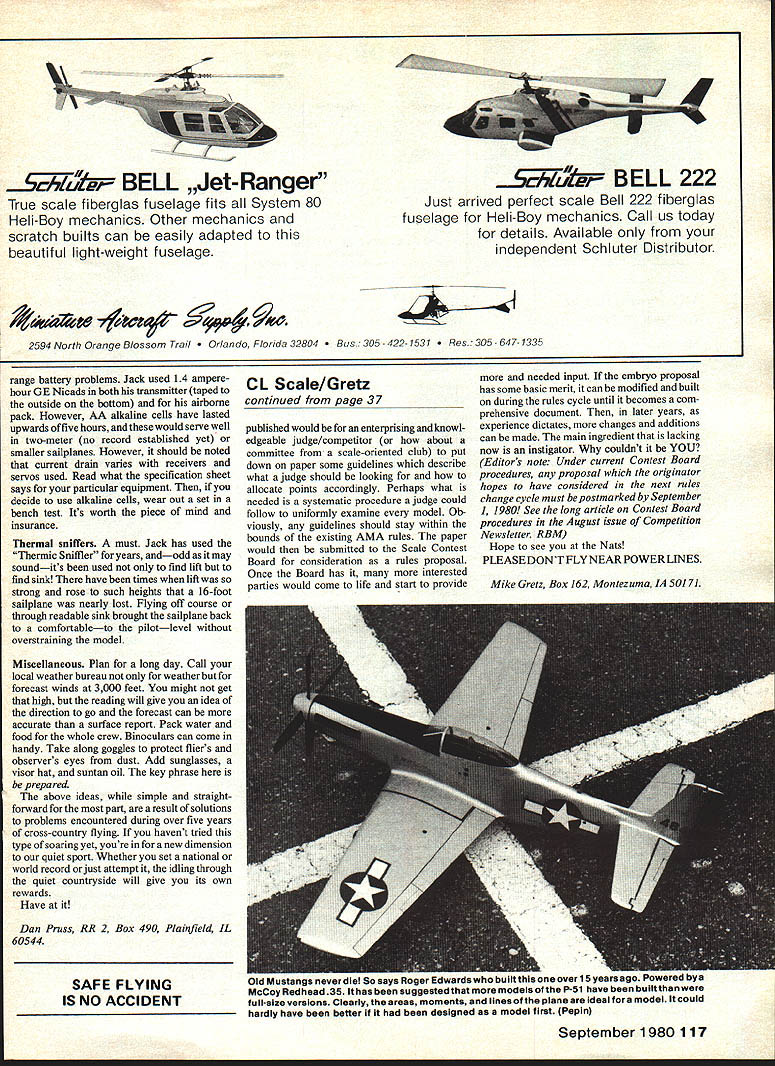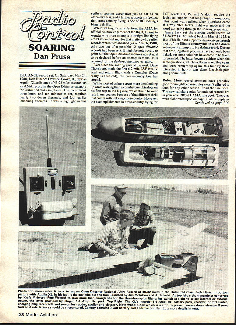 SOARING Dan Pruss DISTANCE record set Saturday May 24 1980 Jack Hiner Downers Grove IL flew AquiIa-XL distance 4592 miles establish AMA record Open Distance category Unlimited class sailpianes record took three hours ten minutes set required nearly two dozen thermals four earlier launching attempts highlight scribes soaring experience just act official witness further supports feelings cross-country flying RC soarings biggest thrills waiting reply AMA official acknowledgement flight came wonder attempts straight line flying arent attempted matter earlier records werent established March 1980 two out possible 12 open distance records set might noteworthy point out open distance requires no set goal declared before attempt made required declared distance category Ever since soaring guru west Dave Thornburg made first 62 mile LSF level V goal return flight Cumulus Dave really old cross-country bug has spread us have spent time looking up walking country bumpkin does first trip big city continue wear ruts courses because different thrill comes trekking cross-country However accomplishments cross-country flying LSF levels III IV V dont require logistical support long range soaring does point realized questions came way after Jacks flight made word got going through soaring grapevine Since Jack set current world record 5128 km 3186 miles back May 1975 few die-hard supporters have driven through Illinois countryside half dozen subsequent attempts break record During time logistical problems have licked some solutions have come taken granted latter became evident same questions asked five years ago brought up again time interested done Let Jack pass along some hints Rules record attempts have probably gone naught because rules werent adhered other reason Read fine print new sailplane rules national records new 1980-81 AMA rule book rules elaborated upon page 80 Septem Continued page 116 28 Model Aviation Photo trio shows what took set Open Distance National AMA Record 4992 miles ma uniimimea uass ack Hiner ommom picture Aquila XL lap guy did trickassisted Jim Mcintyre Al Zolecki top left transmitter converted Kraft Midwest Pete Watersl give enough life three-hour-plus flight has switch right select internal external power latter provided plug-in 14 Amp Hr pack Top Right XLs innardsi 4 Amp Hr battery pack receiver on/off switch charging plug receptacle servos rudder spoiler elevator Note wood block stop prevent excess down elevator servo fails interference should encountered Canopy contains 9-volt battery Thermic Sniffler Lots details text MPS S MODEL PROTECTIVE SYSTEMS NOW CHECKING YOUR BATTERIES ON PART TIME BASIS IS ONLY THE HALF OF IT relying Battery Cyclers LEDs ESVs new mercury measunng devices getting partial protection Receiver POWER Alert ONLY UNIT will give audible warning instantly voltage problem arises Power Alert installed transmitter also will give total battery protection Power Alert $1995 Us Funds plus $100 postage Products fully guaranteed year Also available Plane-Alert $1295 System Alert $2795 Positive System Alert combination Power Alert Plane-Alert unit difficult later talc used surface will reticulate myriad small cracks Use talc mixture over balsa sheeted block surfaces never over open silk areas Usually two coats will suffice hide balsa grain Sand smooth extra fine paper removing almost talc leaving enough fill grain silk weave Raw silk edges should also sanded have found unnecessary sand open silk areas Give areas open silk talc treated alike another three four coats clear dope can either sprayed brushed preference brush flowed smoothly soft brush no brush marks should evident Without clear dope treatment over talc areas will found later coats color dope may adhere especially peeling off masking tape later steps Use enough thinner get COUPLE AILERON AND RUDDER. Simply quickly effectively Jomars new electronic module Designed install between receiver servos 3 wire radio system Neutral rudder stick position allows rudder follow ailerons Moving rudder stick allows uncoupled control Specify positive negative pulse ordering 4495 2028 KNIGHTSBRIDGE DR CINCINNATI OHiO 4 smooth flow point entire plane should have smooth blemish-free surface color dope will expected hide imperfections obvious advantage minimum color required weight build-up avoided Most heavy talc has sanded off now need enough color render open areas opaque bright sunlight some better scale models quite opaque hand laid top surface visible shadow viewed underneath open silk areas represents least possible build-up weight color application talc covered areas good simulation metal covered portions plane model has fiberglass cowl wheel pants other parts dope talc can used give fine finish same procedure outlined previously Finished clear dope color will appear made metal Bob Dolly Wisclrer Rt 1 S-221 Lapham Peak Road Delafield WI 53018 RC Soaring/Pruss continued page 28 ber 1979 issue Model Aviation FAI records get copy rules through AMA FAIs sporting code course Know Better yet Select would-be routes well beforehand select possible wind direction goes saying distance runs best made running downwind Choose roads out country traffic barely exists during Jacks run thermals cars Remote country roads also provide laying out winch line tying up traffic Know what irregu larities might exist such crossing busy highway railroad tracks speed limits through small towns specifically watchful things such grove trees might block out line sight happened Jack during attempt new FAI record three years ago Riding lift right course row trees blocked view time obstruction cleared bird lost found plane radio thermal sniffer destroyed year plane flown directly overhead through same area Com mon sense bet sometimes have have once Chase car LSF levels III IV V regular four-door sedan has served us well Poking ones head transmitter out car window tolerablefor about hour sun roof extends maybe hour half would-be record setters best way go 