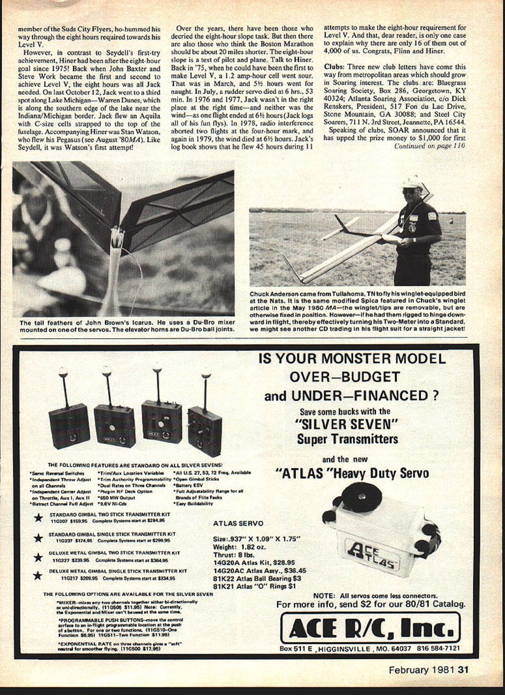 V SOARING Dan Pruss IF YOU THOUGHT Two-Meter designs drab unimaginative winners ugly duckling look-alike contest missed few pleasant surprises appeared year s AMA Nationals True Tom Killough Alabama won 2M event simple straightforward designa Drifter Craftaire just goes prove three Pspilot plane prac ticestill win contests Nats saw three-piece wings winglets pylon-mounted wings T-tails V-tails mention some tall tales bird solar cells mounted wings Less half planes spoilers did some clever linkage installations Anybody can line up battery receiver bank servos Behemoth 14 installa tion looks like showcase display look John Gunsaullus 2M creation Some say fuselage thin has side What see fuselage photo pod pod-and-boom configuration radio installa tion looked like printed place Jim White Californiathe parachute man flew 2M version Sagitta third servo spoilers located fuselage line wing just behind main support rod installation scheme similar standard Sagitta could adapted other existing designs couple years ago 2M class just catching Since LSF Tournaments AMA Nationals Two-Meter Cup open international competition see November 80 MAhave proven Two-Meter stay Yet local level few clubs have promoted class cost radios material increasing trend smaller cars Two-Meter birds just could become popular class block club sponsoring contest budget wont allow trophies extra event combine couple others Example combine Standard Unlimited give separate awards Two-Meter class Besides promoting event youll also save towline wear over months column has begun sound like PR vehicle Pat Flinn Jack Hinerso Since cross-country achieve ments last summer both gents entered select group fliers now nubmers 16 Right after Flinns Great Race V win November MA flew eight-hour slope requirement next day logged third required win become 15th LSF Level V out over 4000 members think have go Torrey Pines other spots along West Coast shoreline get eight hours Midwesterners can head wagons Lake Michigan instead Pat got spot called Sleeping Bear Dune Its up near Traverse City area right eastern shore Lake Michigan Its great vacation spot dunes Pat perched eight hours 450 feet high Nice Across lake just south Milwaukee Cudahy bluffs dont have tourist attractions Michigan side does slopes have kind least few fliers Last summer Greg Seydel Milwaukee 30 Model Aviation New Yorks John Grigg believes using aU Two-Meter wing Short pylon wing mount assures wing completely undisturbed airstream Italys Paglianoan F36 designerhas tested similar designs wind tunnel Model also features pod-and-boom T-tail Everybody wants get act Al Doig has exercised design talents see can makeaTwo-Meterbreakdown intosmallenough components fit glove compartment jim wnite witn nis Two-Meter Sagittaone few using spoilerson 1-muriod l uunsauiius wisn ulira-sKinny Two-Metership Thewings Two-Meter ship Hatch between thumbs lifts up access spoiler modified Hobie Hawk fuselage pod-and-boom Uses rudder/elevator servo ballast compartment member Suds City Flyers ho-hummed way through eight hours required towards Level V However contrast Seydells first-try achievement Hiner after eight-hour goal since 1975 Back John Baxter Steve Work became first second achieve Level V eight hours Jack needed last October 12 Jack went third spot along Lake MichiganWarren Dunes along southern edge lake near Indiana/Michigan border Jack flew Aquila C-size cells strapped top fuselage Accompanying Hiner Stan Watson flew Pegasus see August 8OMA Like Seydell Watsons first attempt Over years have decried eight-hour slope task also think Boston Marathon should about 20 miles shorter eight-hour slope test pilot plane Talk Hiner Back 75 could have first make Level V 12 amp-hour cell went sour March 5 hours went naught July rudder servo died 6 hrs 53 mm 1976 1977 Jack wasnt right place right timeand neither windas flight ended 6 hours Jack logs fun flys 1978 radio interference aborted two flights four-hour mark again 1979 wind died 6 hours Jacks log book shows flew 45 hours during 11 attempts make eight-hour requirement Level V dear reader case explain 16 Out 4000 us Congrats Flinn Hiner Clubs Three new club letters have come way metropolitan areas should grow Soaring interest clubs Bluegrass Soaring Society Box 286 Georgetown KY 40324 Atlanta Soaring Association Dick Renskers President 517 Fon du Lac Drive Stone Mountain GA 30088 Steel City Soarers 711 N 3rd Street Jeannette PA 16544 Speaking clubs SOAR announced has upped prize money $1000 first Continued page 110 ChuckAnderson came Tullahoma TN tofly winglet-equipped bird Nats same modified Spica featured Chucks winglet article May 1980 MAthe winglet/tips removable otherwise fixed position Howeverif rigged hinge down ward flight thereby effectively turning Two-Meter Standard might see another CD trading flight suit straight jacket T IS YOUR MONSTER MODEL T THE FOLLOWING FEATURES ARE STANDARD ON ALL SILVER SEVENS Servo Reversal SwitchesTrim/Aux Location VariablesAll US 27 53 72 Preq Available Independent Throw AdjastTrim Authority Programmability Open Gimbal Sticks ChannelsDual Rates Three ChannelsnEattery ESV lndependsnt Center AdjsstPIugin RF Deck OptionFulI Adjustability Range f Throttle Aus As II650 MW DutpsitSrands Flit Packs Retrect Channel Fall Adjust9BV NiCdsnEasy Buildability * STANDARD GIMBAL TWO STICK TRANSMITTER KIT 11G207 $15995 Complete Systems start 128496 * STANDARD GIMBAL SINGLE STICK TRANSMITTER KIT 110237 $17496 Complete Systems start 129995 * DELUXE METAL GIMBAL TWO STICK TRANSMITTER KIT 11G227 $23995 Complete Systems start $36495 * DELUXE METAL GIMBAL SINGLE STICK TRANSMITTER KIT 11G217 $20996 Complete Systams start $33496 THE FOLLOWING OPTIONS ARE AVAILABLE FOR THE SILVER SEVEN nMIXER.mixes two channels together either bi-directionally arunidirectionally 110506 $1196 Note Currently Exponential Mixer cant beaned seine time PRcoRAMMABLE PUSH BUTTONS-move control surface inf light programmable location posit abutton two funstiom