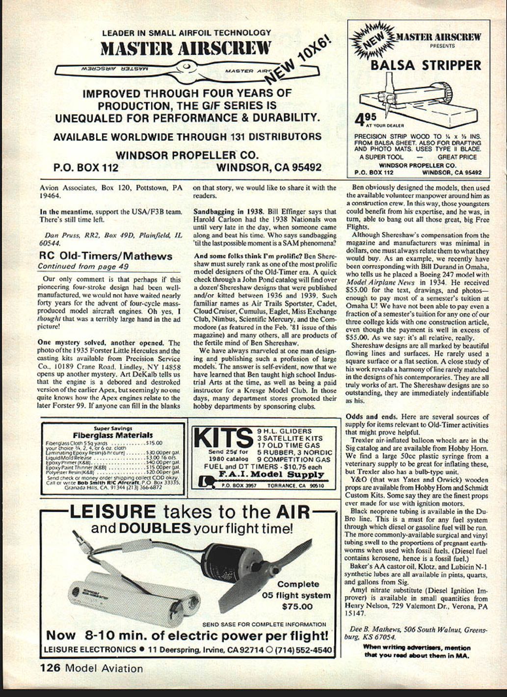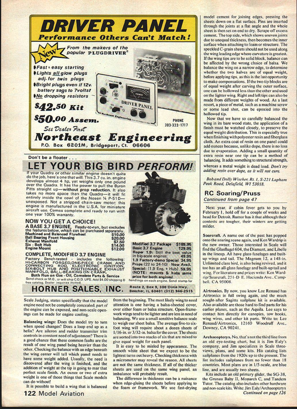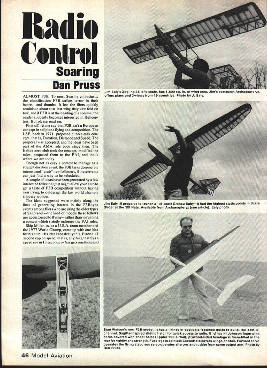 Soaring Dan Pruss ALMOST F3B Soaring enthusiasts classification F3B strikes terror heartsand thumbs has fliers quickly reminisce about last wing saw fold tow F3 B heading column reader suddenly becomes interested Helicop ters please read First off let say F3B isnt European concept sailplane flying competition LSF back 1971 proposed three-task con cept Duration Distance Speed proposal accepted ideas have part AMA rule book since Italian aero club took concept modified rules proposed FAT thats today Though easy contest manage straight duration event F3B tasks generate interest grab new followers events can just find way scheduled couple ideas have generated few interested folks just might allow club get taste F3B competition having trying outdesign last world champs slippery wonder ideas suggested mainly along lines generating interest F3B-type events among fliers using older types Sailplanesthe kind models fellows accustomed flyingrather running contest strictly enforces FAT rules Skip Miller twice USA team member 1977 World Champ came up idea club idea basically Place 13 second cap speed anything flys speed run 13 seconds less gets thousand Stan Watsons new F3B model has kinds desirable features quick-to-build low cost 2channel Sagitta-inspired sliding hatch quick access radio Bird has Hi Johnson foam wing cores covered sheet balsa Eppler 193 airfoil plywood-sided fuselage foam-filled rearfor rigidity strength Fuselage painted EconoKote covers wings tail Forward servo operates flying stab rear servo operates ailerons rudder same output arm Photo Dan Pruss 46 Model Aviation Control Jim Ealys Zogling 38 /4-scale nas 1 uu sq wing area Jims company IArcnaeopseryx offers plans 3-views 19 countries Photo J Ealy Jim Ealy Ill prepares launch 1/5-scale Granau Babyit highest static points Scale Glider 80 Nats Available Archaeopteryx see article Ealy photo points Flights slower 13 seconds would receive reduced scores oPSO points per second down 17 seconds 800 points Anything greater 17 seconds would worth 700 points Any attempt Speed would get no less 700 points Remember contest idea getting new blood figura tively speaking course F3B Any flight crossed center line safety line would also get 700 points rather customary zero course idea will require support flier Screamin Eagle can turn 95 Speed support will help new kid block entered Oly II As Duration task no changes required As matter fact kid Oly II could find himself beat Back team selection finals last year group us talked about ways get newcomer interested F3B Speed decided major drawbackbut because aver age Duration flier thinks doesnt have anything competitive us felt series contests could scheduled whereby Speed task would have cap say 17 seconds first contest Following contests series could have speed cap diminished second per contest would easy way new F3B competitors ease type flying Since method competition involves series contests would take groups have long summer schedule such East Coast Soaring League Great Lakes Soaring League Northwest Soaring Society SC2 run effective series last final suggestion run good old straight Duration/landing contests end contest day allow fliers interested fly F3B Speed task order make runs meaningful get flying allow flier get three runs succession could average three take best three whatever suits three-flight rounds could flown depending time number fliers Scoring Speed would separate counted Duration awards advantage suggestion would interested fliers have compete bystanders would exposed task ranks know always get few want meet new challenge Snow Fli Detroits annual winter bash took place February 15and ask annual eleventh row Anybody Out longer streak club sponsored events Drop line think yearly thermal underwear special local event 57 fliers will argue other wise Warren Tiahrt CDed event said summer contests should good Seventeen entered Unlimited young Eric Tiahrt outscored 1208 out possible 1395 Bob Scott 1024 best out of37 Standard class fliers Chris Corven won Jr-Sr 736 Two Meter entries could fly Standard Unlimited good ol CD waxed em 914 Continued page 122 MODELMAN IA T111 TOT F TTF 110FF 1111001 ITO IFI IrFI TI FIP TFOlI.P9FE1IT FOLFIF905 990 01 TO IF P FLOT 01 19206 990 111 TIFITI PP 11191 II F - 0 iF500200 FOIl TIIITI 1 101-IT lIEIO9TT55250 FE IF 1 1 lIE FH lIFE FOL PP 11101 FR 0S 1 50 501999 901 50 992299 FF121 FIll 119114Ff 40954199 FF121 F 11 TPOIF5P955199 F 111 00FF 1-91 41954299 LINT952199 FIT FE IFIMENT952999 FE 1-P II 110FF P F952099 FEIFIEF OE1IOPTEF 100 9 5 092 1999517500 Fl TOEs 0 00 EPI IF HEN952199 FIITOEFI El 0 F 019 F\ 99 l1H SEEP 99950999 POPlIN IF F4F 41 H F 9111 72111-12 SPEF 9954099 FIITOEN lIP 4F 4 II 00l1O NIFAFI BOFT 1951299 I1OL2EEFI P91 FF111 111-Il952799 401411 Elf 14 0 OP 9 ELNEE 00 455200 1111111ET 1 9 P911 94 2 0 9961- 49952299 FIIILEF 511 FFI1lPPEEP 010011 01955299 PEPPY OPO IOFIFE PIT 59514990 FF11 FI-IPE 11101 FITS 49512990 FEEP FNP0 1111111 PIT 14511 990 TEPLIOF LIFEP P192119 TEE9S1599 TO ELITE 1111 P1-F NOPLEF952999 111 OTFIL 1- SF1 2 SONLIPAF TUlIP SAL P111-0201909911900 011 III' PLO 0 102EP 9T 0 FIFE L ITT 1150 POET OLIMEEP 91111 911 LIFFIEf 9111 101111104 TO F1F101L1191119 FF1 OFI 1 -01191 P901- 9 4 FILL PElLET EFT TI Fl-lANGEFIPPEE 01011 T1L 15TH SE POET ITFIFITH 112000 FLIEPENT IIEPLIEP 900 EIII-IILIOTE2 101 OFEFINI 11T FEEl 111TH 002000 OP SINE RE 9111 01 99 OPEl 11119011 WITH 09109 EPEE 0 IEEEGIET 111TH OLL OPEEP EPEE FIPIIEFI NO IlIPO0F102IFIlI SF111' 1-111 102 911 FOlIOS 111111110 9IA9 EIISCOLINT 11111 NET 10111 110 119 TEE 1 9 9CFEPTEE OLIT lOLl ElLIOT OrE SI 19FF TO TOTOLINTL 101 FOIl * 9911 EFPIE9TION FATE01EPINFo 1-1011011110 19 00 TFI 10 00 92100 191 TI 9199105001 TO 4090 921 409 411011 9001Ff4 001TO SF10 900 5 IIIIEE '1 1111 1111 1111 Ill IE 0 0 0111 L0 I II IEP Fl IE 1 EPS 14 00 FElT FIE FLINT II PIlE 1FlE TIlT NI EIIP 1111 1141 OLL SF10114 1111 T 00 11-4 11111 ElF 1-Il 101 F IPE 111491SLI 110 T 1111 POE 1-1-011 101 1 TFI 110111 IF 1001111