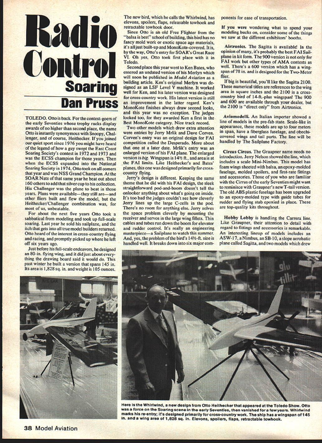 ConErol Soaring Dan Pruss TOLEDO Otto back contest-goers early Seventies trophy racks display awards no higher second place name Otto instantly synonymous Snoopy Chal lenger course Heithecker joined quiet sport since 1976 might have heard legend guy swept East Coast Soaring Societys contest 1972 1973 ECSS champion years ECSS expanded National Soaring Society 1974 Ottotookon comers year NSS Grand Champion SOAR Nats same year beat out about 160 others add silver cup collection Challenger plane beat years Plans availablethey still areand other fliers built flew model Heithecker/Challenger combination us unbeatable about next five years Otto took sabbatical modeling took up full-scale soaring Last year sold sailplane itch gets true model builders returned Otto heard interest cross-country flying racing promptly picked up left otT six years ago Just before full-scale endeavors designed 80-in flying wing did just about thing drawing board said would past winter built version spans 145 Its area 1828 sq weight 105 ounces new bird calls Whirlwind has elevons spoilers flaps releasable towhook retractable towhook door Since Otto old Free Flighter balsa best school building bird has no fancy mold work exotic space age materials its just built-up MonoKote-covered way Ottos entry SOARs Great Race VI Oh yes Otto took first place Toledo Second place year went Ken Bates entered undated version Merlyn will soon published Model Aviation building article Kens original Merlyn de signed LSF Level V machine worked well Ken later version designed cross-country work latest version still improvement latter regard Kens MonoKote finishes always draw second looks year no exception judges looked too awarded Ken first Best MonoKote category Nice track record Two other models drew extra attention entries Jerry Mrlik Dave Corven Corvens entry original design FAI competition called Desperado about later date Mrliks entry enlarged version FAI plane enlarged version big Wingspan 14 ft area FAI limits Like Heitheckers Bates planes designed primarily crosscountry flying Jerrys design different Keeping same theme did FAI design sleek straightforward pod-and-boom doesnt tell onlooker anything about whats going inside Its too bad judges couldnt see cleverly Jerry lines up large C-cells pod Theres no room anything else Jerry solves space problem cleverly mounting receiver servos large wing fillets Thin cables tubes run down boom elevator rudder control Its really engineering masterpiecea Sailplane watch summer yes problem birds 14-ft size handled well breaks down six major com ponents ease transportation wondering what spend modeling bucks consider some things saw different exhibitors booths Airtronics Sagitta available opinion its probably best FAI Sail plane kit form 900 version FAT work other types AMA contests welL Theres 600 version has wing span 78 designed Two-Meter flier big beautiful youll like Sagitta 2100 numerical titles references wing area square inches 2100 crosscountry bird 14-if-plus wingspan 900 600 available through dealer 2100 direct Airtronics Aviomodelli An Italian importer showed line models prefab state Scale-like appearance models up four meters span have fiberglass fuselage obechi covered wings tail parts line will handled Sailplane Factory Circus Circus Graupner name needs no introduction Jerry Nelson showed line includes scale Mini-Nimbus model has foam wings sheeted balsa epoxy-molded fuselage molded spoilers first-rate fittings accessories familiar Cirrus early Seventies might want reminisce Graupners new T-tail version old ABS plastic fuselage has upgraded epoxy-molded type guide tubes rudder flying stab epoxied place top-quality kits throughout Hobby Lobby handling Carrera line Like Graupner attention detail regard fittings accessories remarkable An interesting lineup models includes ASW- 17 Nimbus SB-i 0 slope aerobatic plane called Sagitta two models drew 38 Model Aviation Whirlwind new design Otto Heithecker appeared Toledo Show Otto force Soaring scene early Seventies vanished few years Whirlwind marks re-entry its designed primarily cross-country work ship has wingspan 145 wing area 1828 sq Elevons spoilers flaps retractable towhook attention Draco Mistral Draco comes two versions 2001 has wingspan 98 3001 spans 126 wing 3001 different airfoil starts out root FX63-126 transitions FX63-l00 tip FX63- 126 somewhat symmetrical about 60 percent develops deep undercamber Building wing type ordinarily takes real model building skill wings balsacovered foam need glue leading edge Oh yes theres polyhedral already wing Mistral spans 14 ft 7 has spoilers ailerons rudder flying stab ailerons also used flaps Through mechanical mixing arrangement aileron/flaps can moved change wing camber fuselage Ferran Its molded fuselages whole line House Balsa new kid block asks what costs start hobby dont want scare him off keep House Balsas Two-Meter planes mind twochannel radio Two-Meter bird about low can get price scale Sailplane Factory As mentioned Junc issue place get hard-to-find Sailplane items catalog updated Toledo include Sailplanes accessories time read theyll have added other items including Italian line Aviomodelli Well just peeks few booths Toledo much better show year lastfrom modelers point view anyway number exhibitors restricted year order allow aisle room roamers Good show Dan Pruss Rt 2 Box 49D Plainfie1d IL 60544 August1981 39 SAFE FLYING IS NO ACCIDENT Two-Meter birds gaining popularity 14-footers cropping up cross-country heres step other direction Howard Evansons Bug Wingspan meter weighti 2 oz area 285 sq fishing rod forms boom little ship Howards pic wife Eddy holds NEW SMOOTHER SILKSPUN COVERITE exclusive Hi-Lo Temperature Range prevents accidental warping greatest sheeted surfaces Only 64 per sq ft C@VERTE J L 420 BABYLON RD. HORSHAM PA 19044