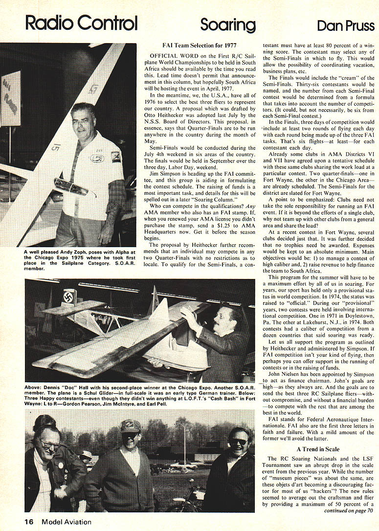 Radio Control Soaring Dan Pruss FAI Team Selection 1977 OFFICIAL WORD First R/C Sail plane World Championships held South Africa should available time read Lead time doesnt permit announce ment column hopefully South Africa will hosting event April 1977 meantime USA have 1976 select best three fliers represent country proposal drafted Otto Heithecker adopted last July NSS Board Directors proposal essence says Quarter-Finals run anywhere country during month May Semi-Finals would conducted during July 4th weekend six areas country finals would held September over three day Labor Day weekend Jim Simpson heading up FAI commit tee group aiding formulating contest schedule raising funds important task details will spelled out later Soaring Column can compete qualifications Any AMA member also has FAL stamp renewed AMA license didnt purchase stamp send $125 AMA Headquarters now Get before season begins proposal Heithecker further recom mends individual may compete two Quarter-Finals no restrictions locale qualify Semi-Finals contestant must have least 80 percent win ning score contestant may select Semi-Finals fly would allow possibility coordinating vacation business plans etc Finals would include cream Semi-Finals Thirty-six contestants would named number Semi-Final contest would determined formula takes account number competi tors could necessarily six Semi-Final contest Finals three days competition would include least two rounds flying day round being made up three FAI tasks Thats six flightsat leastfor contestant day Already some clubs AMA Districts VI VII have agreed upon tentative schedule same clubs sharing work load particular contest Two quarter-finalsone Fort Wayne other Chicago Area already scheduled Semi-Finals district slated Fort Wayne point emphasized Clubs need take sole responsibility running FAL event beyond efforts single club team up other clubs general area share load recent contest Fort Wayne several clubs decided just further decided no trophies need awarded Expenses would kept absolute minimum Main objectives would manage contest high caliber 2 raise revenue help finance team South Africa program summer will have maximum effort us soaring years sport has held provisional sta tus world competition 1974 status raised official During provisional years two contests held involving interna tional competition 1971 Doylestown Pa other Lakehurst NJ 1974 Both contests caliber competition dozen countries said soaring ready Let us support program outlined Heithecker administered Simpson FAI competition isnt kind flying perhaps can offer support running contests raising funds John Nielsen has appointed Simpson act finance chairman Johns goals high always goals send best three RC Sailplane flierswith out compromise financial burden compete rest among best world FAI stands Federal Aeronautique Inter nationale FAI also first three letters faith failure mild amount former well avoid latter Trend Scale RC Soaring Nationals LSF Tournament saw abrupt drop scale event previous year number museum pieces about same objets dart becoming discouraging fac tor us hackers new rules seemed average out craftsman flier providing maximum 50 percent continued page 70 16 Model Aviation well pleased Andy Zoph poses Alpha Chicago Expo 1975 took first place Sailplane Category SOAR member Above Dennis Doc Hall second-place winner Chicago Expo Another SOAR member plane Schul Gliderin full-scale early type German trainer Below Three Happy contestantseven though didnt win anything LOFTs Cash Bash Fort Wayne Ito RGordon Pearson Jim Mcintyre Earl Pell F0R FUN FLYING FLOATER IS HARD TO BEAT can now report flying experience FLOATER Since am sport flyer rather contest entrant cant tell great contest successes However fun flying FLOATER hard beat has outclimbed out flown just about everythingat local field have lost trackof number of approximately half hour flights have have two 2 hour flights evening first impression first test flight what delightful handling characteristics has flown some violent thermal conditions yet docile enough am using toteach eight year old son fly FLOATER flyer Bellevue Wash Wing Load$45O 7 3 ozlsqft Flat Bot NACA 6409 RC Soaring/Pruss continued page 16 perfect score scale fidelity flying proven 1975 LSF Tournament Ken Wagner not-so-museum-like Libelle took top honors Dont misled Kens efforts resulted beautiful plane just wasnt Gier Hall Pearson Thacker school detailing guy said asked wasnt difficult task making wheel chair trained flea act putting play Man Came Dinner No putting tiny ball bear ings wheels should realized soaring other aspects modeling certain individuals gather much pleasure building seeing perform craftsmen produce might enjoy shortcoming efforts much detail evaluated takes scru tinizing eyes competent judges breed found sailplane gathering As result largest contests can provide elite group sailplane builders turn tends further refine art reduce number entries capable turning Out model less years time Last July suggestion made NSS Board Directors meeting encour age simple formula scale competi tion suggestion eventwithout long drawn out rules wranglefor scale whereby club holding sailplane contest could also have event scale PEANUT SCALE I __ PLANS ACCESSORIES IComplete catalog 50f OX 2498-AM LA MESA cAIJF 9204t dealer direct Postpaid Send Stamp Literature ii/scfl Box 135 North ridge Cal 91324 Chet Tuthill Tullahoma Tenn came up set proposed rules surely worth trying suggestions I Number Models contestant will allowed entry RC Sport Scale addition entry may make other sailplane competition during same contest same plane may entered event however flight per round will allowed score round being applied both events contestant enters plane scale another plane regular competition will fly both planes task However points achieved scale sailplane will apply scale event points other plane will apply toward regu lar competition score 2 Special Contest Consideration con test siz