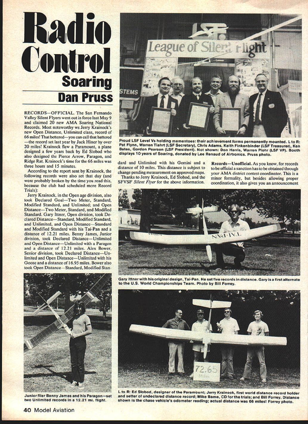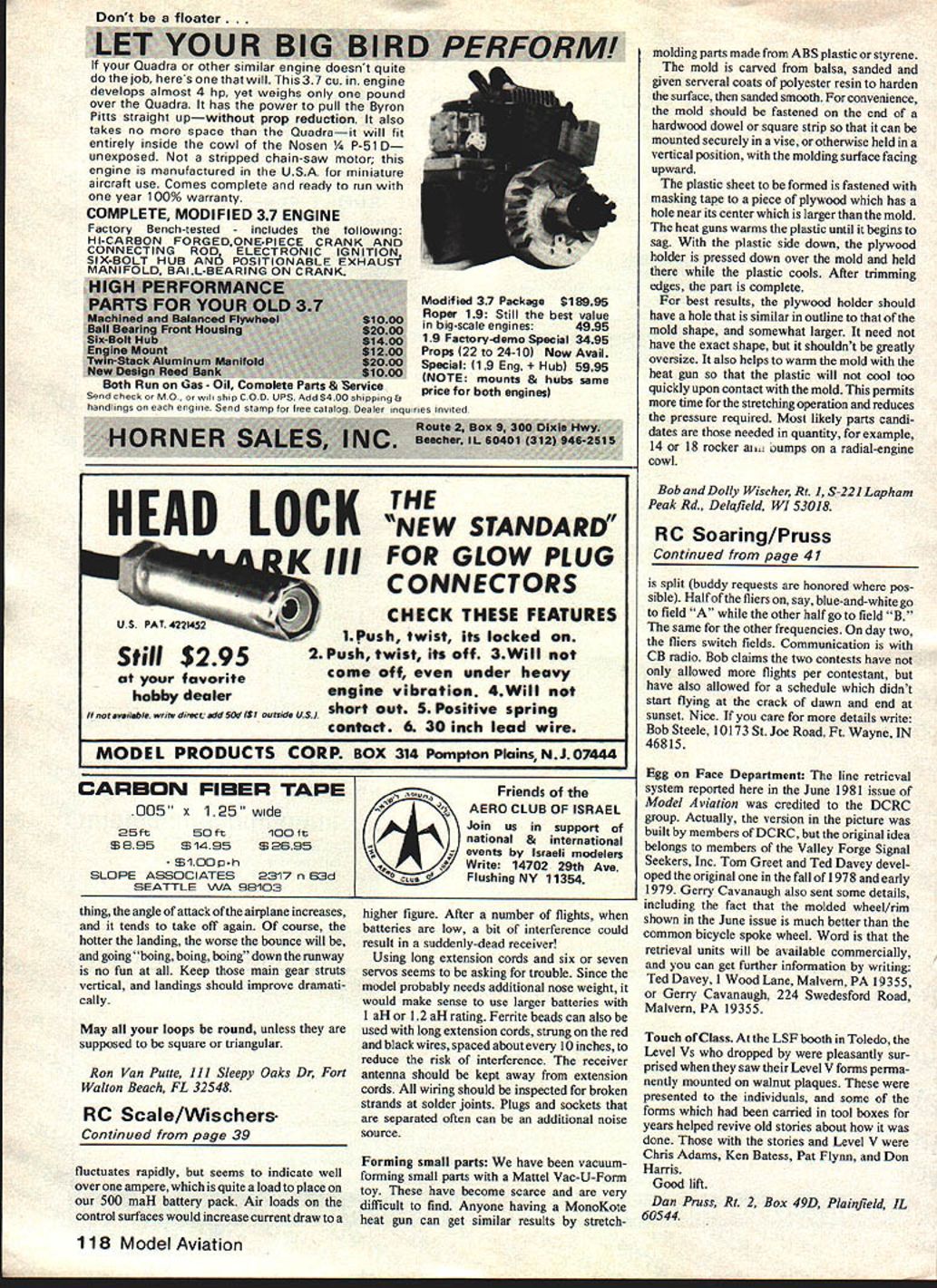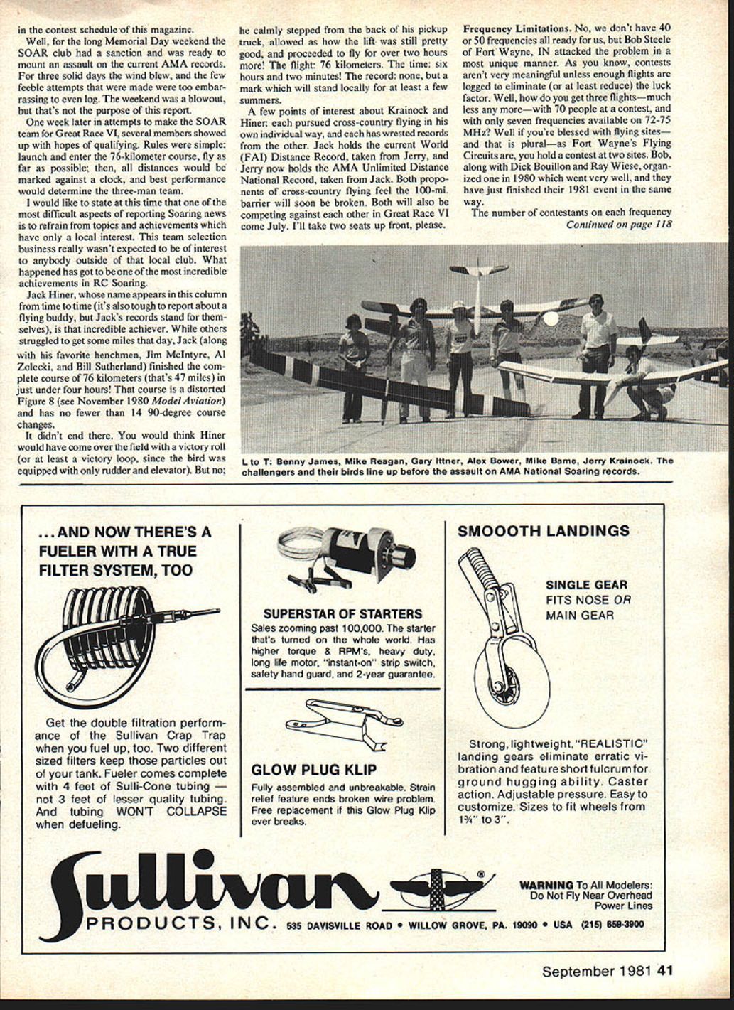 Radio Control Soaring Dan Pruss RECORDSOFFICIAL San Fernando Valley Silent Flyers went out force last May 9 claimed 20 new AMA Soaring National Records Most noteworthy ws Jerry Krainocks new Open Distance Unlimited class record 66 miles betteredyou can call battered record set last year Jack Hiner over 20 miles Krainock flew Paramount plane designed few years back Ed Slobod also designed Pierce Arrow Paragon Ridge Rat Krainocks time 66 miles three hours 15 minutes According report sent Krainock following records also set day probably broken time read because club scheduled Record Trials Jerry Krainock Open age division also took Declared GoalTwo Meter Standard Modified Standard Unlimited Open DistanceTwo Meter Standard Modified Standard Gary Ittner Open division took De clared DistanceStandard Modified Standard Unlimited Open DistanceStandard Modified Standard Tai-Pan distance 1221 miles Benny James Junior division took Declared DistanceUnlimited Open DistanceUnlimited Paragon distance 1221 miles Alex Bower Senior division took Declared DistanceUn limited Open DistanceUnlimited Goose distance 1695 miles Bower also took Open DistanceStandard Modified Standard Unlimited Gemini RecordsUnofficial As know records distance 10 miles distance subject to official sanction has obtained through change pending measurement approved maps AMA district contest coordinator Thanks Jerry Krainock Ed Slobod minor formality besides allowing proper SFVSF Silent Flyer above information coordination also gives announcement 40 Model Aviation Proud LSF Level Vs holding mementoes achievement forms permanently mounted L R Pat Flynn Warren Tiahrt LSF Secretary Chris Adams Keith Finkenbinder LSF Treasurer Ken Bates Gordon Pearson LSF President shown Don Harris Warren Plohr LSF VP Booth displays 10 years Soaring donated Lee Renaud Airtronics Pruss photo Gary lttner original design Tal-Pan set five records distance Gary first alternate US World Championships Team Photo Bill Forrey L H Ed Slobod designer Parambunt Jerry Krainock first world distance record holder Junior flier benny James Paragonset setter undeclared distance record Mike Bame CO trials Bill Forrey Distance two Unlimited records 1221 mi flight shown chase vehicles odometer reading actual distance 66 miles Forrey photo contest schedule magazine Well long Memorial Day weekend SOAR club sanction ready mount assault current AMA records three solid days wind blew few feeble attempts made too embar rassing log weekend blowout thats purpose report week later attempts make SOAR team Great Race VI several members showed up hopes qualifying Rules simple launch enter 76-kilometer course fly far possible distances would marked against clock best performance would determine three-man team would like state time difficult aspects reporting Soaring news refrain topics achievements have local interest team selection business really wasnt expected interest anybody outside local club What happened has got incredible achievements RC Soaring Jack Hiner name appears column time time its also tough report about flying buddy Jacks records stand selves incredible achiever others struggled get some miles day Jack along favorite henchmen Jim McIntyre Al Zolecki Bill Sutherland finished com plete course 76 kilometers thats 47 miles just under four hours course distorted Figure 8 see November 1980 ModelAviation has no fewer 14 90-degree course changes didnt end would think Hiner would have come over field victory roll least victory loop since bird equipped rudder elevator no . AND NOW ThERES FUELER WITh TRUE FILTER SYSTEM TOO Get double filtration perform ance Sullivan Crap Trap fuel up too Two different sized filters keep particles out tank Fueler comes complete 4 feet Sulli-Cone tubing 3 feet lesser quality tubing tubing WONT COLLAPSE defueling calmly stepped back pickup truck allowed lift still pretty good proceeded fly over two hours flight 76 kilometers time six hours two minutes record mark will stand locally least few summers few points interest about Krainock Hiner pursued cross-country flying own individual way has wrested records other Jack holds current World FAI Distance Record taken Jerry Jerry now holds AMA Unlimited Distance National Record taken Jack Both propo nents cross-country flying feel 100-mi barrier will soon broken Both will also competing against other Great Race VI come July Ill take two seats up front please SUPERSTAR OF STARTERS Sales zooming past 100000 starter thats turned whole world Has higher torque & RPMs heavy duty long life motor instant-on strip switch safety hand guard 2-year guarantee GLOW PLUG KLIP Fully assembled unbreakable Strain relief feature ends broken wire problem Free replacement Glow Plug Klip ever breaks Frequency Limitations No dont have 40 50 frequencies ready us Bob Steele Fort Wayne IN attacked problem unique manner As know contests arent very meaningful unless enough flights logged eliminate least reduce luck factor Well get three flightsmuch less morewith 70 people contest seven frequencies available 7 2-75 MHz Well youre blessed flying sites pluralas Fort Waynes Flying Circuits hold contest two sites Bob along Dick Bouillon Ray Wiese organ ized 1980 went very well have just finished 1981 event same way number contestants frequency Continued page 118 SMOOOTH LANDINGS SINGLE GEAR FITS NOSE OR MAIN GEAR Strong lightweight R EALISTIC landing gears eliminate erratic vi bration feature shortfulcrum ground hugging ability Caster action Adjustable pressure Easy customize Sizes fit wheels 13/4tO 3 WARNING Modelers Fly Near Overhead Power Lines P R 0 D U C T S N C 535 DAVISVILLE ROAD OW GROVE PA 19090 215 6592900 September 1981 41 L s uenny James Mike tleagan uary ITTner Alex uower MIKe usme jerry jralnocK ne challengers birds line up before assault AMA National Soaring records Dont floater LET YOUR RIG RtRD PL Quadra other similar engine doesnt quite job heres will 37 Cu engine develops almost 4 hp yet weighs pound over Quadra has pow