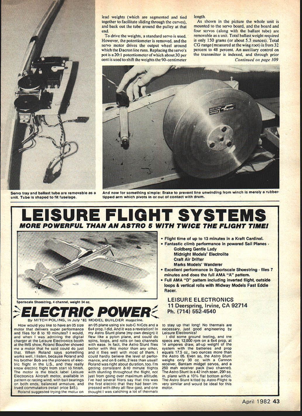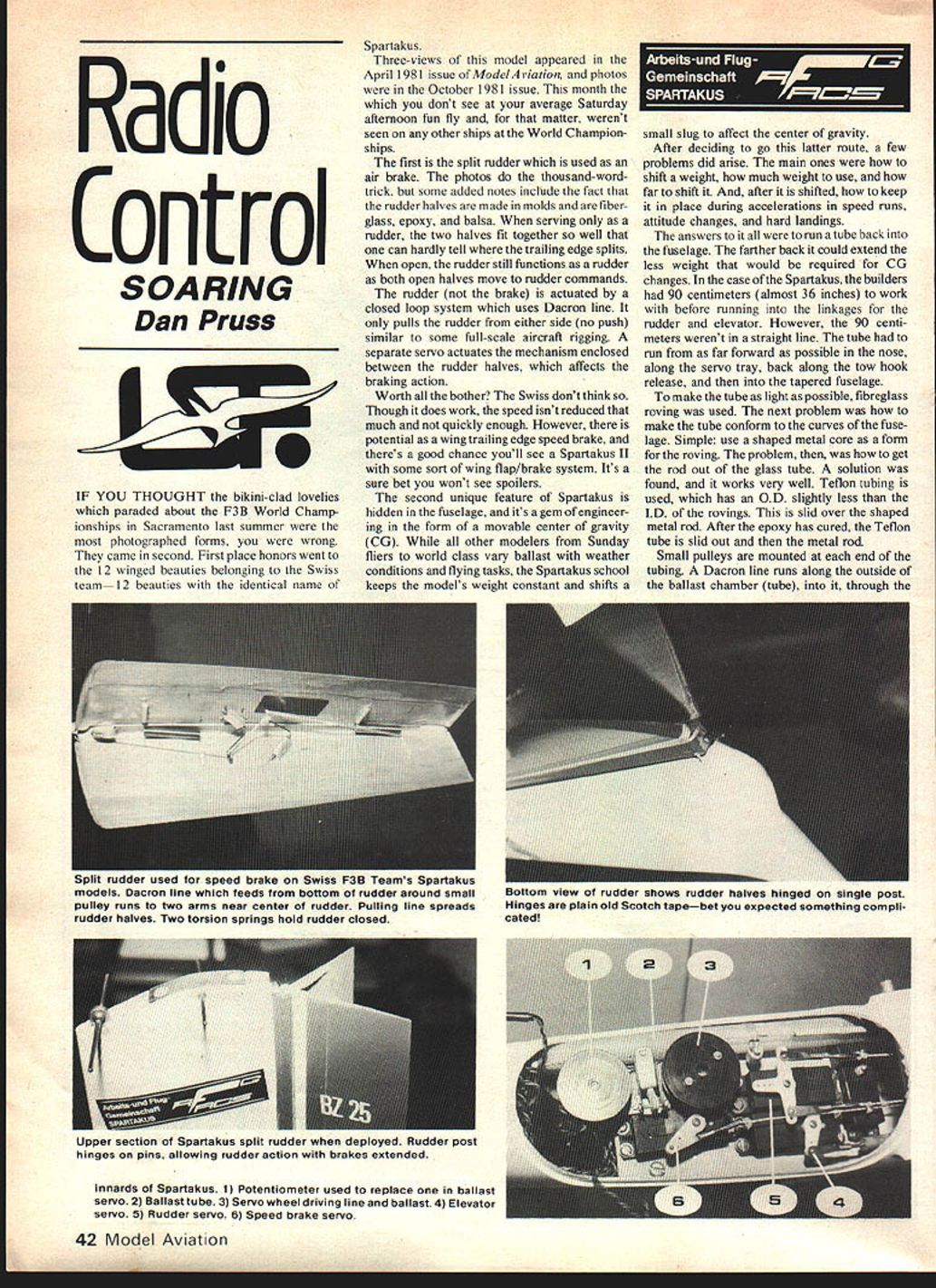 Radio Control SOARING Dan Pruss IF YOU THOUGHT bikini-clad lovelies paraded about F3B World Champ ionships Sacramento last summer photographed forms wrong came second First place honors went 12 winged beauties belonging Swiss team 12 beauties identical name Spartakus Three-views model appeared April 1981 issue ModelAijation photos October 1981 issue month dont see average Saturday aftemoon fun fly matter werent seen other ships World Champion ships first split rudder used air brake photos thousand-wordtrick some added notes include fact rudder halves made molds fiber glass epoxy balsa serving rudder two halves fit together well can hardly tell trailing edge splits open rudder still functions rudder both open halves move rudder commands rudder brake actuated closed loop system uses Dacron line pulls rudder either side no push similar some full-scale aircraft rigging separate servo actuates mechanism enclosed between rudder halves affects braking action Worth bother Swiss dont think Though does work speed isnt reduced much quickly enough However potential wing trailing edge speed brake theres good chance youll see Spartakus II some sort wing flap/brake system Its stire bet wont see spoilers second unique feature Spartakus hidden fuselage its gem engineer ing form movable center gravity CG other modelers Sunday fliers world class vary ballast weather conditions flying tasks Spartakus school keeps models weight constant shifts small slug affect center gravity After deciding go latter route few problems did arise main ones shift weight much weight use far shift after shifted keep place during accelerations speed runs attitude changes hard landings answers run tube back fuselage farther back could extend less weight would required CG changes case Spartakus builders 90 centimeters almost 36 inches work before running linkages rudder elevator However 90 centi meters werent straight line tube run far forward possible nose along servo tray back along tow hook release tapered fuselage make tube light possible fibreglass roving used next problem make tube conform curves fuse lage Simple use shaped metal core form roving problem get rod out glass tube solution found works very well Teflon tubing used has OD slightly less ID rovings slid over shaped metal rod After epoxy has cured Teflon tube slid out metal rod Small pulleys mounted end tubing Dacron line runs along outside ballast chamber tube through 42 Model Aviation Split rudder used speed brake Swiss F3B Teams Spartakus models Dacron line feeds bottom rudder around small pulley runs two arms near center rudder Pulling line spreads rudder halves Two torsion springs hold rudder closed uottom view OS rudder shows rudder halves hinged single post Hinges plain old Scotch tapebet expected something compli cated Upper section Spartakus split rudder deployed Rudder post hinges pins allowing rudder action brakes extended innards Spartakus 1 Potentiometer used replace ballast servo 2 Ballast tube 3 Servo wheel driving line ballast 4 Elevator servo 5 Rudder servo 6 Speed brake servo lead weights segmented tied together facilitate sliding through curves back out tube around pulley end drive weights standard servo used However potentiometer removed servo motor drives output wheel around Dacron line runs Replacing servos pot 201 potentiometer about 30 per cent used shift weights 90-centimeter length As shown picture whole unit mounted servo board board four servos along ballast tube removable Unit Total ballast weight required 150 grams about 53 ounces Total CG range measured wing root 32 percent 48 percent An auxiliary control transmitter indexed through prior Continued page 109 LEISURE FLIGHT SYSTEMS MORE POWERFUL THAN ASTRO 5 WITH TWICE THE FLIGHT TIME would like have 05 size motor delivers super performance flies 8 10 minutes would admiring digital charger Leisure Electronics booth MS show Roland Boucher showed motor said could just Roland says something works well listen because Roland brother Bob pioneers elec tric flight US really know electric flight start finish motor black label Leisure Electronics Aircraft motor available pattern racing wind ball bearings both ends balanced armature trued commutators retail price $451 Roland suggested trying motur 05 plane using six sub-C NiCds 6x4 prop did revelation Astro Stunt plane own design flew like pylon plane could spins ioops rolls two channels ease fact Astro Stunt flies better motor other flies well could hardly believe level perfor mance 6 cells 2 less usual Roland right about duration too Im getting consistent 8-10 minute flights stunting throughout flight just going over maximum altitude lye several fliers say first electric im pressed Ithey flew gas thought catching lot thermals Flight time up 13 minutes Kraft Cardinal Fantastic climb performance powered Sail Planes Goldberg Gentle Lady Midnight Models Electrolite Craft Air Drifter Marks Models Wanderer Excellent performance Sportecale Shoestring flies 7 minutes does full AMA pattern Full AMA D pattern including inverted flight outside loops & vertical rolls Midway Models Fast Eddie Racer LEISURE ELECTRONICS 11 Deerspring Irvine CA 92714 Ph 714 552-4540 stay up long No thermals necessary just good engineering Leisure Electronics did some ground testing tne specs 12000 rpm 6x4 prop 14 amperes draw all-up weight system batteries prop equals 175 oz two ounces Astro 05 Astro Stunt weighs 30 oz Cannon receiver Bantam midget servos 250 mah receiver pack two channel Astro Stunt 42 inch soan 290 plane 100/o flat bottom airfoil Astro Stunt kitted Astro Flight very similar would ideal motor April 1982 43 ervo cray anu oaiiast tuoe removable unit Tube shaped fit fuselage MHU now cor sometnung simple nrae prevent iine unwinding winch merely rubbertipped arm pivots Out contact drum channel weight 34 oz POWER MITCH POLING July 81 MODEL BUILDER magazine has undergone same transition have seen Sport Scale Models have become increasingly complex sophisticated externa