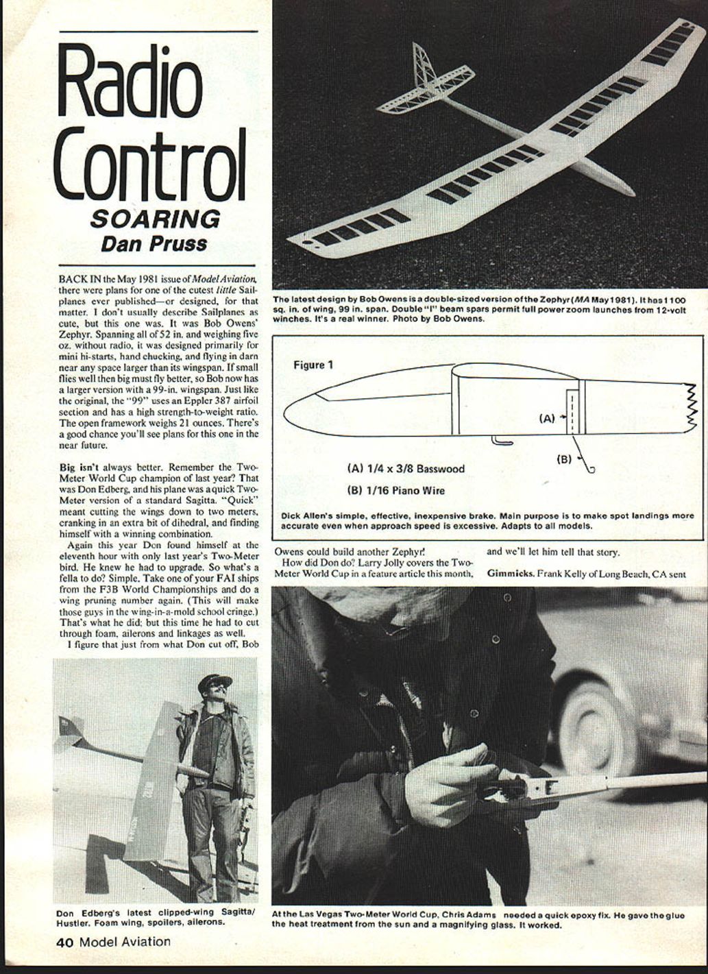 Radio Control SOARING Dan Pruss BACK IN May 1981 issue ofModelAviation plans cutest little Sailplanes ever publishedor designed matter dont usually describe Sailpianes cute was Bob Owens Zephyr Spanning 52 weighing five oz radio designed primarily mini hi-starts hand chucking flying darn near space larger its wingspan small flies well big must fly better Bob now has larger version 99-in wingspan Just like original 99 uses Eppler 387 airfoil section has high strength-to-weight ratio open framework weighs 21 ounces Theres good chance youll see plans near future Big isnt always better Remember TwoMeter World Cup champion last year Don Edberg plane quick Two Meter version standard Sagitta Quick meant cutting wings down two meters cranking extra bit dihedral finding himself winning combination Again year Don found himself eleventh hour last years Two-Meter bird knew upgrade So whats fella Simple Take FAI ships F3B World Championships wing pruning number again will make guys wing-in-a-mold school cringe Thats what did time cut through foam ailerons linkages well figure just what Don cut off Bob Owens could build another Zephyr did Don Larry Jolly covers Two Meter World Cup feature article month well let him tell story Gimmicks Frank Kelly Long Beach CA sent 40 Model Aviation latest design Bob Owens double-sized version ZephyrMA May1981 has 1100 sq wing 99 span Double beam spars permit full power zoom launches 12-volt winches Its real winner Photo Bob Owens Figure 1 B A 1/4 x 3/8 Basswood B 1/16 Piano Wire Dick Allens simple effective inexpensive brake Main purpose make spot landings accurate approach speed excessive Adapts models Don Edbergs latest clipped-wing Sagitta/ Hustler Foam wing spoilers ailerons Las Vegas Two-Meter World Cup Chris Adams needed quick epoxy fix gave glue heat treatment sun magnifying glass worked unusual shot Aquila Aquila Mounting Vivitar motorized 110 camera place canopy Frank held camera place using rubberbands added extra servo uses high throttle trip shutter has mounted camera various ways shoot forward side aft gets optical feedback sees flash go off Lets see now. have man-on-man contest four planes launch first take pictures other three get back Fotomat nab forget gimmicks Dick Allen Endicott NY sends sketch what calls Allen Air Brake Dick calls because air stream top wing forces glider against ground prevents bounce brings stop See Figure 1 skid 1/16 wire pushed 4 x x l piece basswood mounted vertically 1/16 diameter hole drilled up center basswood Dicks Paragon mounted plywood fuselage former wings trailing edge slight bend portion wire goes basswood block prevents wire falling out still allows easy removal trial error Dick found skid length 2 work best Dick also points out negative wing incidence 40 respect ground works will model has high positive wing incidence begin youll have vary skid length accordingly still gimmicks visited Kenn Rolin Sailplane Factory calls business looked over supply hardware kits Most Kenns line hard-to-find items Germany have ever looked Graupner WIK Carrera Robbe kits four different kinds spoilers different styles first reaction probably hardware lengths retractable wheels releasable aero packages gadgets Kenn stocks nearly tow hook mixers bellcranks wing blades items separately Canopy latches Continued page 98 June 198241 Unusual photo Frank Kelly shows released chute behind Aquila Site SULA field Cal State Dominquez Hills Cameras natural Sailpianesno oil vibration #3 #4 #6 #8 SIZE #212 #312 #412 #612 #812 SIZE AMT/BAG #212 #312 #412 #612 #812 Remember Aerotrend source fine modeling hardware also offer complete line wood fiber glass field caddies other acces sories Send SASE free catalog todayDEALERS INVITED ERO TREND PRODUCTS 44W Prospect St New Haven CT06515 POWRWINCH perfect ampanion RETRIEVER Both units use special 4pole permanent nianet low current drain 12 volt ootor design also incurpor ates lightweight bit heavy duty welded painted steel fra features adjustable sotor amting plate insure proper drive tension R NCH has 0 Power handle either r unlimited sonsters anything between noid pro tected foot switch operation ed towline drun cunstruction ruired anti-kiting braking can readily disengaad al drus brake retrieval take-up onntrole 2000 feet braided nylon line tow ribban bell-bearing swivel bearing turnaround hub RETR EVER will eliminate losing turn fruency because long turnaraw tus retrieving lines Line crossings due wind shifts using sultiple winches will ne longer problan Best youll have launch-a--minute capability Other features inclnde -free operation due flycasting onde 0 Battery cables heavy duty clips feet braided nylon line ball bearing swivel Guide line aligmnt takeup imxle nd prevent line tangling drive shaft ORIER DIRECT FFCt4 *DAVEY UPmSYSTEMS CORPORATION ONE WOOD LANEMALVERNPA19355 2151644-0692 engine shafts out end case however shaft want use has left-hand thread prop adapter screws onto shaft locked place two cap screws single li-in prop bolt used con sider marginal size engine props will use certainly call six-bolt hub engine has exceptionally blocky look because cooling shroud cast cylinder along cooling fins shroud cant doing us harm its well worth few ounces adds Despite its size engine easily started handled well another power source well suited larger higher-performance models wish thank following firms cooperation Air Tech PO Box 9044 Little Rock AR 72219 Westbend Contempo Hobby Products 11611 Cantara St North Hollywood CA 91605 Magnum II Dynathrus Props Inc 2541 NE 11th Ct Pompano Beach FL 33062 Grish Bros St John IN 46373 JZ Products 25029 So Vermont Ave Harbor City CA 90710 Zinger Roush Manufacturing PO Box 251 Sandy ville OH 44671 Kioritz Jr Titan Top Flite Models Inc 1901 Narragansett Ave Chicago IL 60639 AMA Building/Mankowski Continued page 39 Futaba Corp America2000 Hobby Publications1500 Donations $1000 K&B Manufacturing Midwest Products Dick McCoy Model Aero nautic Publications Baltek Corp C