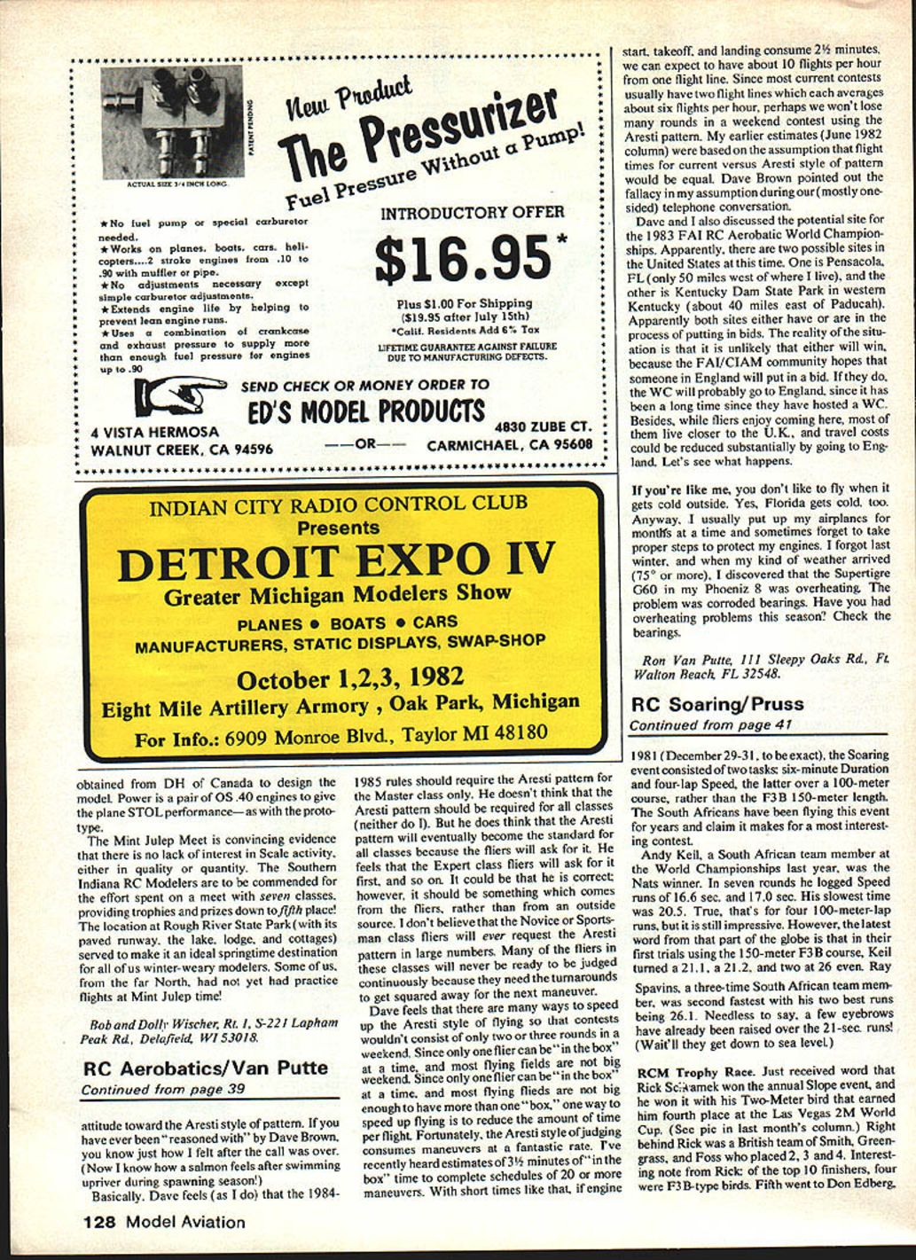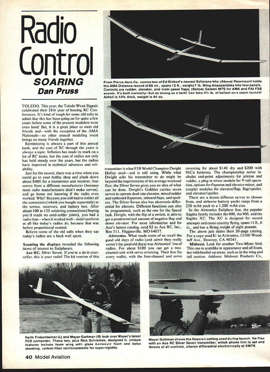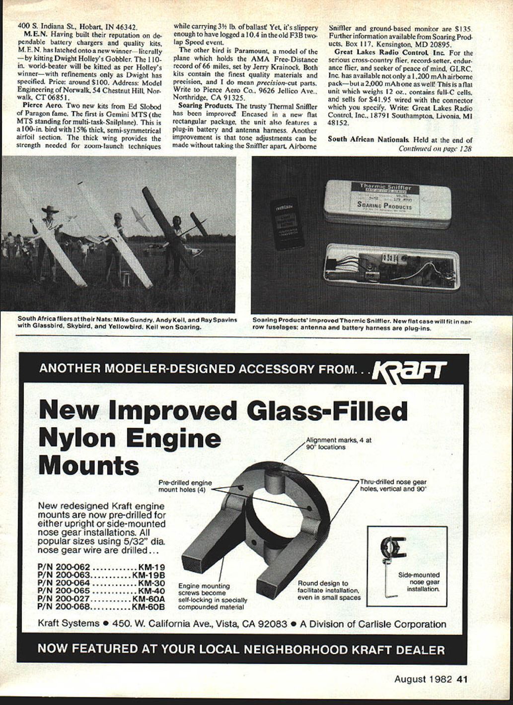 Rddio Control SOARING Dan Pruss TOLEDO year Toledo Weak Signals celebrated 28th year hosting RC Con ferences Its kind tough some old salts admit has going quite few years before some present modelers horn great place meet old friends andwith exception AMA Nationalsno other annual modeling event brings friends together Reminiscing always part annual bash cost RC through years always topic Inflation has made its mark lot RC items cost radios has held steady over years radios have improved technical advances reli ability Just record time could go hobby shop plunk down about $400 transmitter receiver four servos different manufacturer because radio manufacturers didnt make servos go home knowing radio worked Because still solder connectors bought separately servos receivers battery hox After about 100 150 soldering connections hoping youd made no cold-solder joints radio thatwhen worked welldidnt perform like todays radios because before proportional control Believe some old salts say todays radios buck well spent Scouting displays revealed following items interest Sailplaners Ace RC Silver Seven youre do-it-your selfer radio kit version transmitter what F3 B World Champion Dwight Holley used still using what Dwight asks transmitter might beyond requirements average weekend flier Silver Seven gives idea what can done Dwights Gobbler carries seven servos operate dual-rate elevator mixed rudder outboard flaperons inhoard flaps spoil ers Silver Seven also has electronic differ ential ailerons Different functions can also programmed such the Speed task Dwight flip switch able get predetermined amount negative flap down elevator information Aces lastest catalog send $2 Ace RC Inc Box 511 Higginsville MO 64037 Airtronics What made some us recall good old days radio admit really werent good old days Airtronics line radios about $100 can get twochannel unit servo reversing line fits wallet four-channel servo reversing about $140 dry $200 NiCd batteries championship series cludes end-point adjustments aileron rudder plug-in mixer module V-tail opera tion options flaperon elevator mixer coupler modules elevator/flap flap/spoiler elevator/spoiler dozen different servos choose airborne battery packs range 250 mAh pack 1200 mAh size Airtronics Sailplane line popular Sagitta family includes 600 900 Sagitta XC XC designed record attempts cross-country flying spans 14 ft 6 has flying weight eight pounds above just skims 20-page catalog copy send $1 Airtronics 12160 Wood ruff Ave Downey CA 90241 Midwest Look another TwoMeter bird scalelike appearance foam beefed-up areas such wing tail section Address Midwest Products Co 40 Model Aviation Pierce Aero Co comes two Ed Slobods newest Sailplane kits Above Paramount holds AMA Distance record of66 mi spans 13 ft weighs 7 lb Wing disassembles four panels Controls rudder elevator main panel flaps Below Gemini MTS AMA FAI F3B events Its built normallybut strong tank Can take 31/2 lb ballast zoom launch Airfoil 15% thick weight 44 oz Keith Finkenbeiner L Meyer Guttman R look over Meyeis latest F3B contender two plus Rick Schramek designed lt Unique features include foam wing glass between foam balsa sheeting carbon fiber reinforcements super-rigidity Meyer Guttman shows flaperon setting used during launch lie flies Ace RC Silver Seven transmitter allows him set end throws controls aileron differential electronically XMTR 400 S Indiana St Hobart IN 46342 MEN Having built reputation de pendable battery chargers quality kits M E N has latched Onto new winnerliterally kitting Dwight Holleys Gobbler 110in world-beater will kitted per Holleys winnerwith refinements Dwight has specified Price around $100 Address Model Engineering Norwalk 54 Chestnut Hill Nor walk CT 06851 Pierce Aero Two new kits Ed Slobod Paragon fame first Gemini MTS MTS standing multi-task-Sailplane 100-in bird 15% thick semi-symmetrical airfoil section thick wing provides strength needed zoom-launch techniques carrying 3 lb ballast Yet its slippery enough have logged 104 old F3 B twolap Speed event other bird Paramount model plane holds AMA Free-Distance record 66 miles set Jerry Krainock Both kits contain finest quality materials precision mean precision-cut parts Write Pierce Aero Co 9626 Jellico Ave. Northridge CA 91325 Soaring Products trusty Thermal Sniffler has improved Encased new flat rectangular package unit also features plug-in battery antenna harness Another improvement tone adjustments can made taking Sniffler apart Airborne Sniffler ground-based monitor $135 Further information available Soaring Prod ucts Box 117 Kensington MD 20895 Great Lakes Radio Control Inc serious cross-country flier record-setter endur ance flier seeker peace mind GLRC Inc has available 1200 mAh airborne packbut 2000 mAh well isa flat unit weighs 12 oz. contains full-C cells sells $4195 wired connector specify Write Great Lakes Radio Control Inc 18791 Southampton Livonia MI 48152 South African Nationals Held end tinued pare 128 Nylon Engine Mounts New redesigned Kraft engine mounts now pre-drilled either upright side-mounted nose gear installations popular sizes using 5/32 dia nose gear wire drilled . P/N P/N P/N P/N PIN P/N 200-06 2 KM-i 9 200-063KM-19B 200-064 KM-30 200-065KM-40 200-02 7KM-60A 200-068KM-60B Alignment marks 4 9Q0 locations Thru-drilled nose gear hoIe vertical 900 Round design facilitate installation small spaces Kraft Systems 450 W California Ave Vista CA 92083 S Division Carlisle Corporation August 1 982 41 South Africa fliersattheir Nats Mike Gundry Andy Keil RaySpavins Glasabird Skybird Vellowbird Keil won Soaring oaring rroaucls Improved i nermic Sniffler New flat case will fit nar row fuselages antenna battery harness plug-ins New Improved Glass-Filled Pre-drilled engine mount holes 4 -mounted nose gear installation INTRODUCTORY OFFER a.ea4~ ..aaasa * No fuel pump special carburetor needed * Works planes boats cars heli copters..2 stroke engines 10 90 muffler pipeuJLUUUDmm5U5 * No adjustments n
