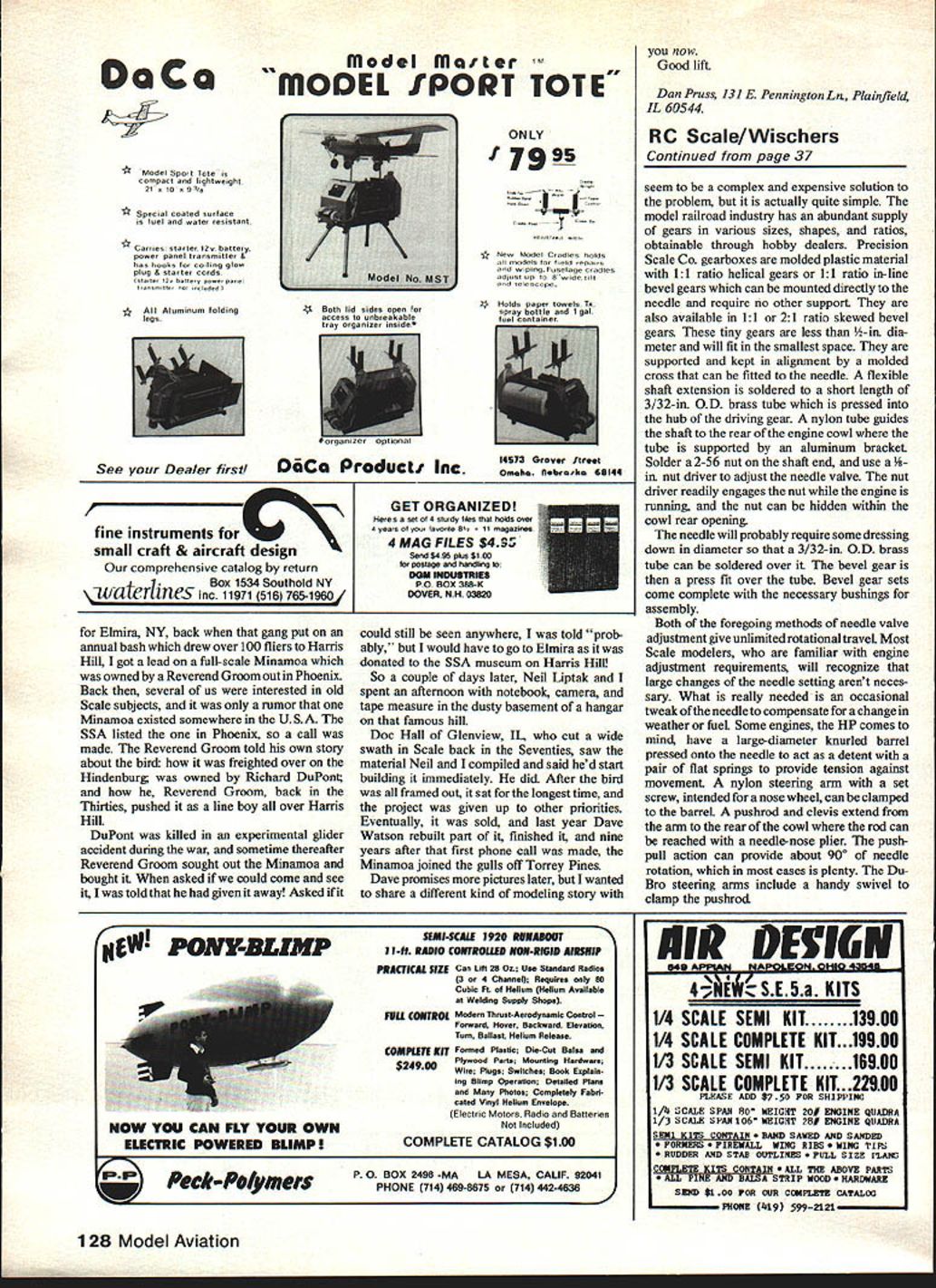 Radio Control SOARING Dan Pruss NEW ALTITUDE RECORD Since 1975 Jack Hiner current Distance World Record holder has trying establish new record altitude Using Replogle barograph same type used full-scale soaring its record ing traces have indicated over 6000 feet some unofficial flights flights either filed official witnesses present official flights top lift too short record May 81982 different new AMA national record 5100 feet set Open Unlimited-class Sailplanes Using Pegasus Model Aviation plan No 307 Jack stretched span 171 All-up weight including barograph 10 lb 11 oz Wing area 1726 sq horizontal stab area 218 sq Wing loading just over 14 oz per sq ft launch made 200-meter winch line although up 300 meters allowed World Records flight wasnt booming thermal came through took ones plane nearly out sight came down landed within 20 minutes Hiner launched under scattered cloud condi tion barographs trace showed just 3000 ft attained 20 minutes later Forthe next 25 minutes downhill flight 45minute mark Jack back down about 500 feet found lift again rose back up 2000 ft 115 mark horizontal sta iizer disap peared view rest plane still vis ible use binoculars point Jack de cided bird high enough brought down Fourteen minutes later flight Aldin Shlpp Quincy IL launches Minnow St Louis contest new breed Saliplanes featuring ailerons flaps beginning appear scene often Using Ace Silver 7 XMTR eases use such features coupled ailerons/rudderwhich can instantly decoupled too mixed flaps/ailerons Costlow photo 34 Model Aviation Bird Time reminds us theoldJascoThermic FFTowline Gliders Red Costlow Higginaville MO finished beautiful Bird white blue trim fuselage red trim wings tall used Monoote K&B epoxy Costlow photo epiogie ecoraing oarograpn neajies witnin pou mop JacIl u-liners MItIiuue-recora-aelmlng Pegasus Plane enlargedto 171-in 141/2 ft wingspan features rudder elevator spoiler controls Kraft XMTR thermal sensor receiver rest between flights Hiner photo WUb uIW JI Urn ilium pupumar urbuau sa.pcuu5 Thiruu u fine model constructed Doc Hall finished flown Dave Watson Controls include rudder elevator ailerons spoilers Its scaled after the SSA museum Elmira NY ended stopwatch showing 1 hr 30 mm altitude 5100 feet above ground level new AMA record Sidelights flight Jack covers planes orange MonoKote fuselage top flying surfaces Black Mono Kote used undersides feels although white better against blue sky orange/black combination best suited sky conditions Thermal Sniffler must lift sink indicator safety aspect high altitudes its difficult times judge planes attitude rate climb well-conditioned ear can recognize unusual situation quicker long-staring eye barograph calibrated Schweizer Air craft Company approved facility Soaring Society America SSA Although 5100 feet set new national record FAI World Record 4988 feet still intact Jack did exceed mark slightly required 2% felt since stood long hed just wait until conditions somewhat better fore trying again Incidentally Ray Smith set exist ing World Record back September 2 1968 New faces Having done few numbers RC Pattern Scale end Continued 125 Terry Lucenbachs original designanother new breed al though design over two years old lVs 2-Meter wings covered balsa over metal Uses flaperons rudder elevator Rick Schrameks Facctor kit Great Britain Design clearly shows Dassel influence Austria wings obechi-covered foam instead fiberglass/foam contrail background Ricks earlier flight Modeler Hardware Tools 4 T-NUTS.CAP SCREWS. 2 sizes cadmium plated large2 sizes hardened steel black flanges precision threadsoxide finish sizes 4-40 x 3/4 popular sizes 4-40 P/N 200-240 &P/N 200-242 & 6-32 x 1 6-32 P/N200-241P/N200-243 / 4-I / HEX TOOLS. 2 sizes extra long blades sturdy plastic handles precision machined close tolerances Unique ball end tightening removing socket head screws hard-to-reach areas Sizes 4-40 P/N 200-237 & 6-32 P/N200-238 Kraft has hardware line popular sizes todays modeling needs Kraft Systems W California Ave Vista CA 92083 0 Division Carlisle Corporation September 1982 35 EOLEthe French RC Soaring Organizationknows recruit new members ladies know build flyand just local group modelers New Line broad much weaker Much less time spent circling lift earlier flight Some very large areas light lift flown straight down road best sink rate lift would become stronger Jack would make large gentle turns gain altitude lift would stop Jack would speed up bit cover some ground slowing lift encountered Altitude became important later day Jack knew Pegasus ever got down 1000 feet less would beginning final glide landing altitude pro tected Pegasus could fly another two hours little over hour later 324 Pegasus over goal up near cloud base Landing 331 pm new FAI World Record 5581 miles flight fraction distance could covered Three downwind distance flights over 40 miles area have averaged little over 15 mph over 20 mph Two flights Aquila XLs rather slow sailplane cross-country flying Yet Aquila XL averaged over 20 mph flight over 40 miles day strong thermals brisk tail wind None flights flown aggressively faster efficient Sailplane would allow aggressive flying style make possible average speed 25 mph good days right weather conditions long June day possible fly RC Sailplane cross-country seven hours area Simple math indicates possible 100-mile flight floater Sailplane designed fast cross-country flying 200-mile flight should within reach RC Soaring/Pruss Continued page 35 modeling including beautiful 30-lb 1/3scale Christen Eagle Red Costlow Ace RCs right-hand men decided go silent route Bird-of-Time according pic ture looks though hes off right track Red also sent picture Aldin Shipp Minnow Two-Meter bird cludes flaps ailerons F3B scene Two Meter World Cup probably desire just increase Sailplane performancenotto mention desire tinker has opened up whole new breed designs polyhedral-wing-and-two-channel ship has dominated majority flying fieldsand will continue pop