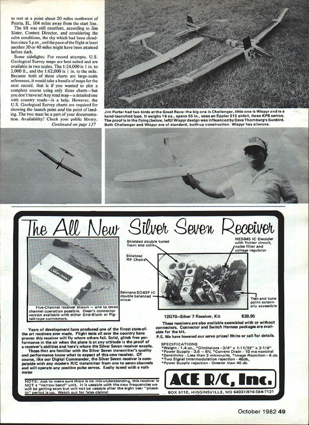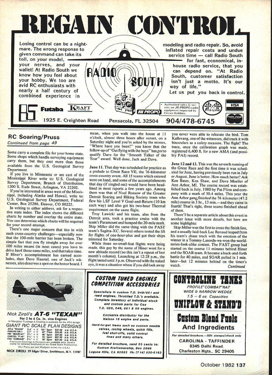 Radio Control SOARING Dan Pruss TO PARAPHRASE old song title June busted out over Some events took place June 1982 will highlighted chron ologically can determine order impact RC Soaring June 5 column reading like press release certain folks its being read wrong Anybody has stared sky over hour has hoped will appreciate follow ing accomplishment others mentioned report first acccomplishment can summed up Hiner does again time 104 miles started out Declared Distance goal 73 miles FAI World Record Launching Kankakee IL flight along westerly course five hours thirty-five minutes later goal reached plane excellent lift reason took long cover distance 73 miles flown 5-10 mph crosswind Lift condi tions remained excellent 5 pm wind subsided Jim McIntyre suggested waste daygo AMA Open Distance shot Jack needs little prodding such matters decided press Shortly after 6 pm transmitter batteries weakening decision made land 624 pm CDT7 hours 14 minutes after launchJacks Pegasus came team Michigan Radio Control Society Ann Arbor Ml finished 76 km 472 ni Great Race VII course 3 hr 13 mm 1 R Dave Moeller Ken Shaw Ken Bates modal called Pieceodisits made up parts several models 48 Model Aviation Jack Miner tabove set second consecutive Altitude record birdPegasus AMA plan No307 Pod atop fuselage holds Replogle recording barograph used verify altitude photo left below Jack holds recording drum barograph Too bad trace doesnt show went 6400 ft Duane Eisenbeiss below right fullscale soaring pilot checks barograph reading after flight Jacks Pegasus now holds Open Distance Altitude records Previous renrdhnIdAr w Dnve Peltz nt 3539 ft Peaasus soans 171 rest point about 20 miles northwest Peoria IL 104 miles away start line lift still excellent according Jim Slater Contest Director considering calm conditions sky cloud less since 5 pm pace flight least another 30 40 miles might have attained before dark Some sidelights record attempts US Geological Survey maps best suited available two scales 124000 2000 ft 162000 1 mile Because both charts large-scale references would take bundle maps next record wanted plot complete course using chartsbut dont have Any road mapa detailed country roadsis help However US Geological Survey charts required showing launch point point land ing two must part documenta tion Availability Check public library Continued on ~ rT Aff N IDiJfr 9t&/ek @eVe% QeeeWe Shielded double tuned front end Shielded RF Choke\ limansSO42P IC uble balanced Ixer Years development have produced finest state-ofthe art receivers ever made Flight tets over country have proven Feceiver will fly others fail Solid glitch free per formance air plane attitude proof receivers abilities heres tile Silver Seven receiver excells familiar Silver Seven transmitters quality performance know what expect new receiver course like Digital Commander Silver Seven receiver com patable modern RIC transmitter seven channels will operate positive pulse servos Easily tuned volt meter NOTE Just make sure no mis-understanding receiver NOT narrow band unit useable new frequencies wel will getting soon will useable after eight veer phasein neriod uD Watch Out false claimal NE5045 IC Decoder flutter circuit j noise filter [voltaae regulator 12G70Silver 7 Receiver Kit Test tune point extern ally accessible $3895 receivers also available assembled connectors Connector Switch Harness packages avail able kit PS have lowered servo prices Write call details SPECI FICATIONS Weight- 14 oz Dlminsiona-3/4 x 1-11/32 x 2-1/4 Power Supply 36 Current Drain 10 ma nominal Sensitivity Less 2 mlcrovolts image Rejection -6db Two Signal intermodulation rejection 46db Power Supply rejection Greater 40db ACE EI Mini BOX 511EHIGGINSVILLEMO 64037/816-5847121 ber 1982 49 Jim Porter two birds Great Race big Challenger little wispyr isa hand-launched type weighs 16 os spans 55 uses Eppler 212 airfoil three KPS servos proof flying below left Wispyr design influenced Dave Thornburgs Sunbird Both Challe 4 Afl I 44 kiI4. n-n*r,-*In Winu h iIrnn I channel operation posslole ueans cunneur version available either End-Block Pig- tail-type connectors ~1 tL AIN Losing control can night mare wrong response given command can take its toll model nerves wallet Radio South know feel about hobby too avid RC enthusiasts nearly half century combined experience (NIROJ modeling radio repair So avoid inflated repair costs undue service time Radio South fast economical inhouse radio service can depend Radio South customer satisfaction isnt just motto Its way life Let us put back control m e a_____________ -7v Ce JR PROPO radro Author zed sales & ser LVISA CusHobbesbpro Line E9 Futaba K___________ 925 E Creighton RoadPensacola FL 32504 904/478-6745ifli RC Soaring/Pruss Continued page 49 Some carry complete file home state Some shops handle surveying equipment carry cost available US Geological Survey Department live Minnesota east Mississippi River write US Geological Survey Department Branch Distribution 1200 5 Eads Street Arlington VA 22202 youre interested areas west Missis sippi including Alaska Hawaii write US Geological Survey Department Federal Center Box 25286 Denver CO 80225 writing either address ask respec tive state index index shows different charts number overlay entire state can determine charts will required record attempt Theres major concern ties such cross-country challengesespecially now 100-mile barrier has broken simple fact fly straight away over 100 miles means cases have drive back same miles takes time Hiners accomplishment has earned acco lades Dave Haertel Jacks wit nesses also deserves spot honorboard mean walk house 11 oclock almost three hours after sunset Saturday night youre asked missus have you know follow-up Out flying boys hasgotto qualify Dave Smooth Talker Year award Well done Jack Dave June 11 day scheduled practice prelude Great Race VII 76-kilometer cross-country event 15 teams entered hand some accomplishments day singled out would have head 