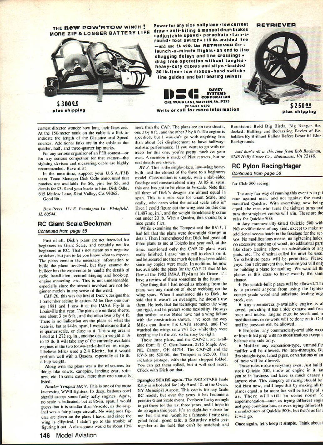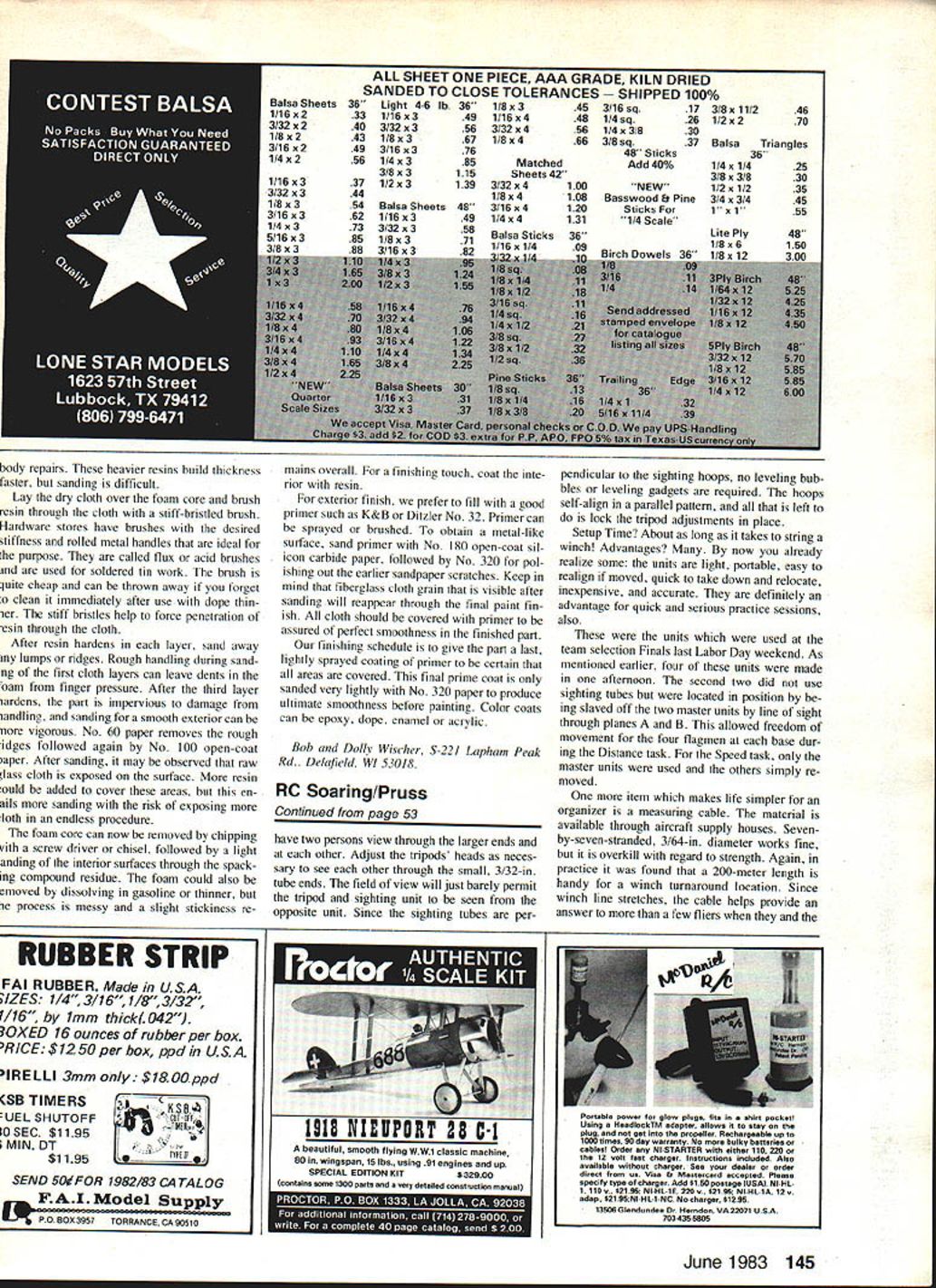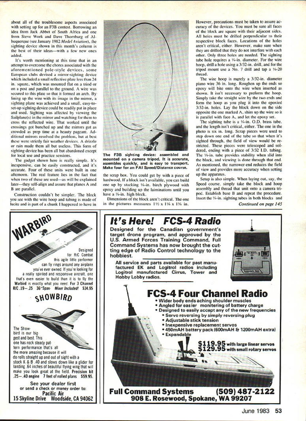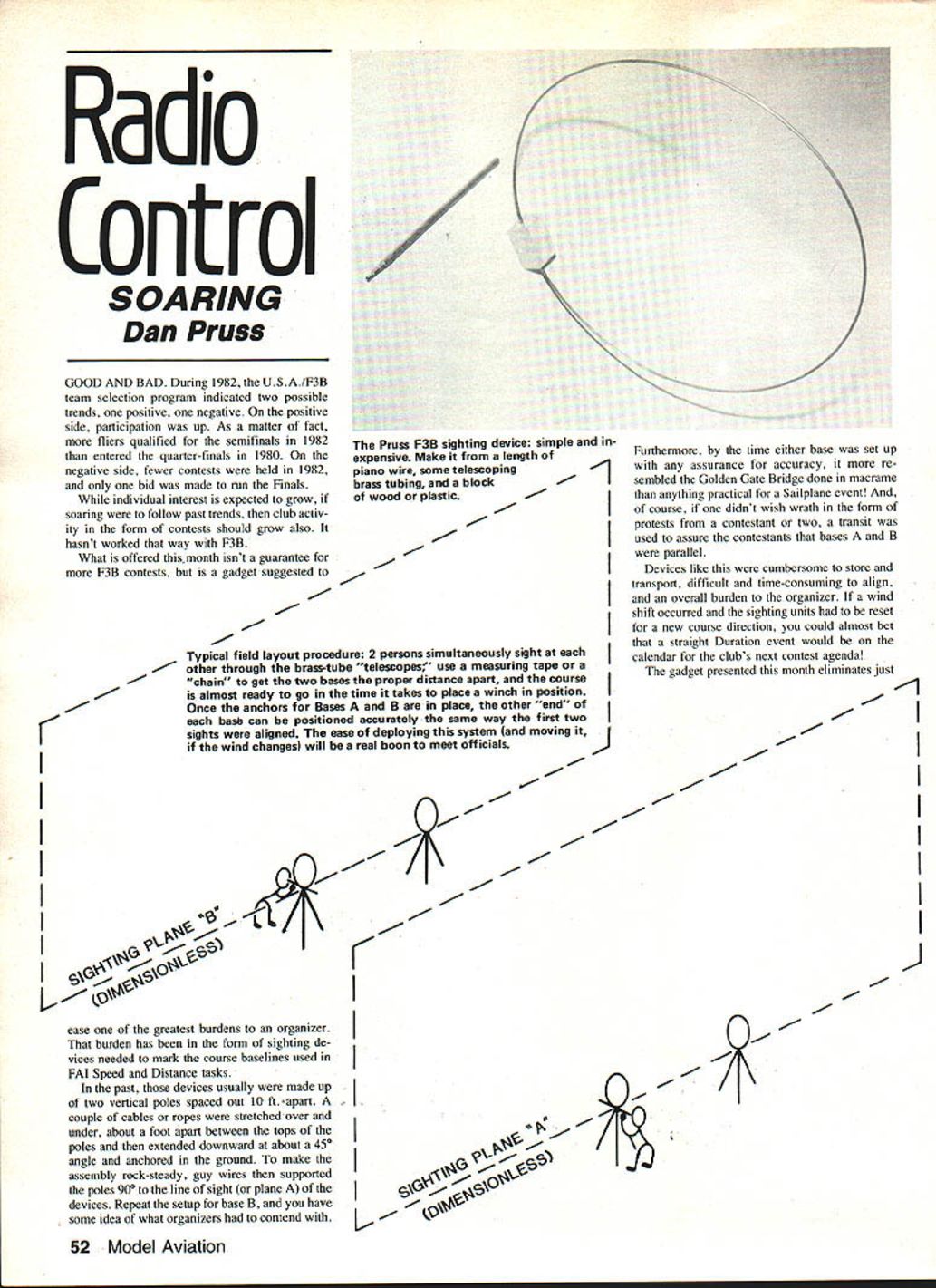 Radio Control SOARING Dan Pruss GOOD AND BAD During 1982 USA/F3B team selection program indicated two possible trends positive negative positive side participation up As matter fact fliers qualified semifinals 1982 entered quarter-finals 1980 negative side fewer contests held 1982 bid made run Finals individual interest expected grow soaring follow past trends club activ ity form contests should grow also hasnt worked way F3B What offered month isnt guarantee F3B contests gadget suggested K / Pruss F3B sighting device simple expensive Make length piano wire some telescoping-1 brass tubing blockI wood plastic Typical field layout procedure 2 persons simultaneously sight other through brass-tube telescopes use measuring tape chain get two bases proper distance apart course almost ready go time takes place winch position Once anchors Bases B place other end base can positioned accurately same way first two sights aligned ease deploying system moving wind changes will real boon meet officials -- IK II Furthermore time either base set up assurance accuracy re sembled Golden Gate Bridge done macrame anything practical Sailplane event course didnt wish wrath form protests contestant two transit used assure contestants bases B parallel Devices like cumbersome store transport difficult time-consuming align overall burden organizer wind shift occurred sighting units reset new course direction could almost bet straight Duration event would calendar clubs next contest agenda gadget presented month eliminates just ~-1 -J ease greatest burdens organizer burden has form sighting de vices needed mark course baselines used FAI Speed Distance tasks past devices usually made up two vertical poles spaced out 10 ft apart couple cables ropes stretched over under about foot apart between tops poles extended downward about 450 angle anchored ground make assembly rock-steady guy wires supported poles 900 line sight plane devices Repeat setup base B have some idea what organizers contend 1 s 2 Model Aviation 1% about troublesome aspects associated setting up F3B contest Borrowing idea Jack Abbot South Africa Steve Work Dave Thomburg Al buquerque see January 1982 ModelAviation sighting device shown months column best ideaswith few new ones added Its worth mentioning time attempt overcome chores associated aforementioned pole-style devices some European clubs devised mirror-sighting device included small reflective plate less 24 square mounted flat triod post parallel ground wire secured plate formed arch lining up wire its image mirror sighting plane achieved small easy-toset-up sighting device could readily put place used Sighting affected viewing Sailplanes mirror watching cross reflected wire worked until crossings got bunched up mirrors got crowded prep time beauty pageant Ad ditional mirrors resolved problem best strictly fair weather devices drizzle rain made useless form sighting device has abandoned except local use practice sessions gadget shown really simple Its inexpensive can easily constructed its accurate Four units built afternoon real feature lies fact two usedas will explained laterthey self-align assure planes B parallel Construction couldnt simpler block see wire hoop tubing made lucite part chunk happened have scrap box could get piece hardwood block isnt available can build up stacking /8-in birch plywood epoxy building up laiminations until have -in high block Dimensions block arent critical pictures measures l/2 x l/x x l/4 However precautions must taken assure ac curacy devices must sure faces block square adjacent sides holes must drilled perpendicular respective block faces Locations holes arent critical either However make sure drilled interfere other Only three holes needed sighting tube hole requires /4-in diameter wire hoop drill hole using 3/32-in drill tripod mount use No 7 drill tap -20 thread wire hoop merely 3/32-in diameter piano wire 36 long Roughen up ends epoxy will bite onto wire inserted shown isnt necessary preform hoop Simply take straight wire two ends form hoop plug epoxied 3/32-in holes Lay block down side opposite marked shim up wire parallel face let epoxy set sighting tube -in OD brass tube length isnt critical either photo six long Scrap pieces used step down end tube its sighted through field view would re stricted pieces telescoped sol dered ending piece 3/32 ID tubing -in tube provides stability slid block viewing done through end As mentioned narrower end reduces field view provides accuracy setting up apparatus Setup also simple laying out say Speed course simply take block hoop assembly thread unit onto camera tri pod Establish base B repeat procedure Insert -in sighting tubes both blocks Continued page 145 Designed RIC Combat agile little performer can fly rings around airplane youve ever owned youre looking really spirited responsive aircraft thats easier build fly Warbird exactly whaf need 3 Channel RIC 19 25 36 Span Mieer Included $3495 OWBIRD Show bird big gest best has rock steady pat tern performance thats amazing because will rolls straight up out sight stock K & B 40 slows down like glider landing 64 inches beautiful flying wing will make look great field Precision kit 25 40 engine 7 feel rolled plans $5995 See dealer first send check money order Pacific Air 15 Skyline Drive Woodside CA 94062 June 1983 53 U F3B sighting device assembled mounted camera tripod accurate assembles quickly easy transport Make four FAI Speed/Distance course Its FCS-4 Radio Designed Canadian governments target drone program approved US Armed Forces Training Command Full Command Systems has now brought cut ting edge Radio Control technology hobbiest __________________ service parts available past manu factured EK Logitrol radios including Logitrol manufactured Cirrus Tower Hobby Lobby radios N FCS-4 Four Channel Radio Wider body ends aching shoulder muscles Angled easier monitoring battery charge Designed easily accept new frequencies Servo reversing simply reversing plug Ad