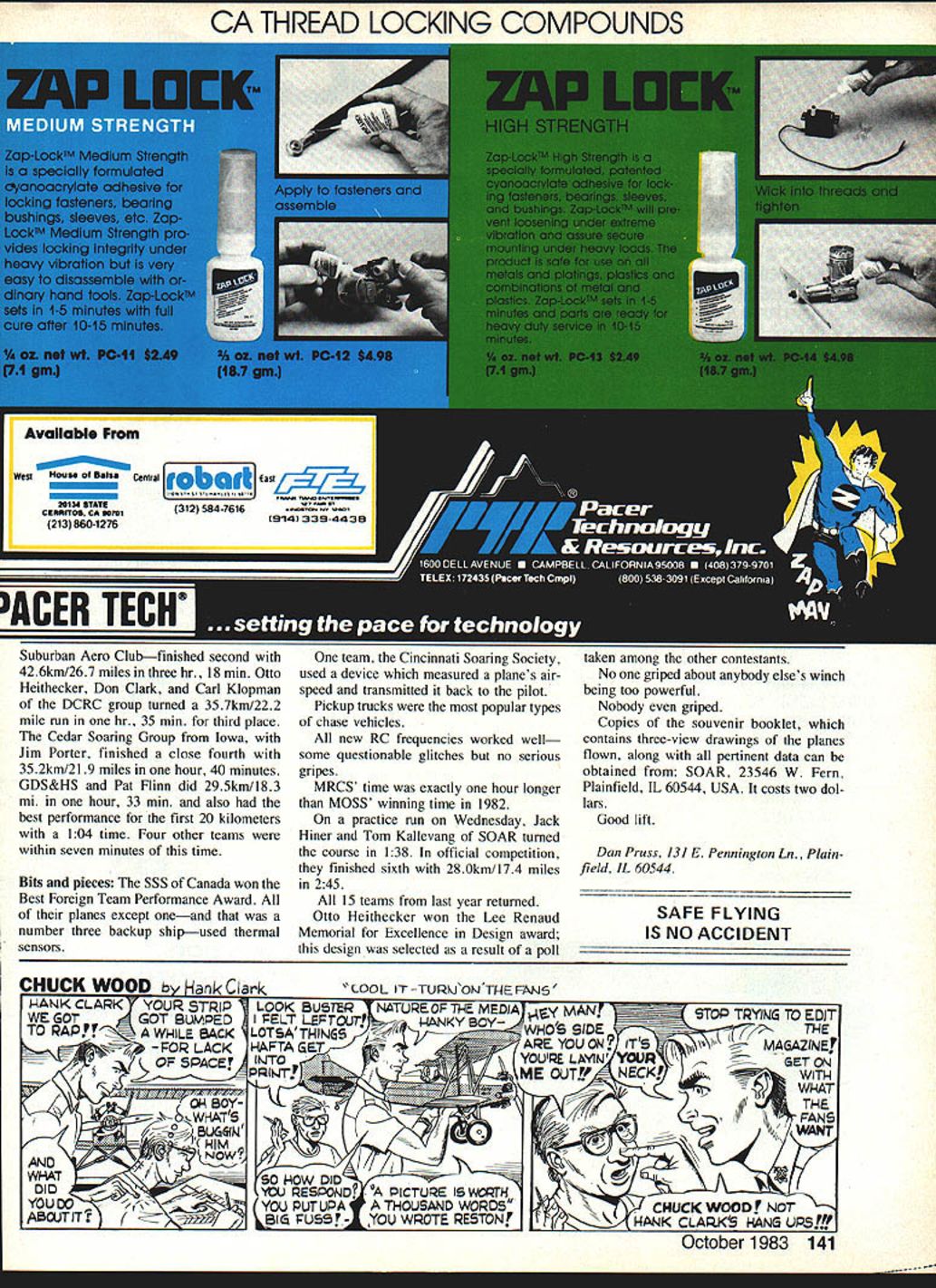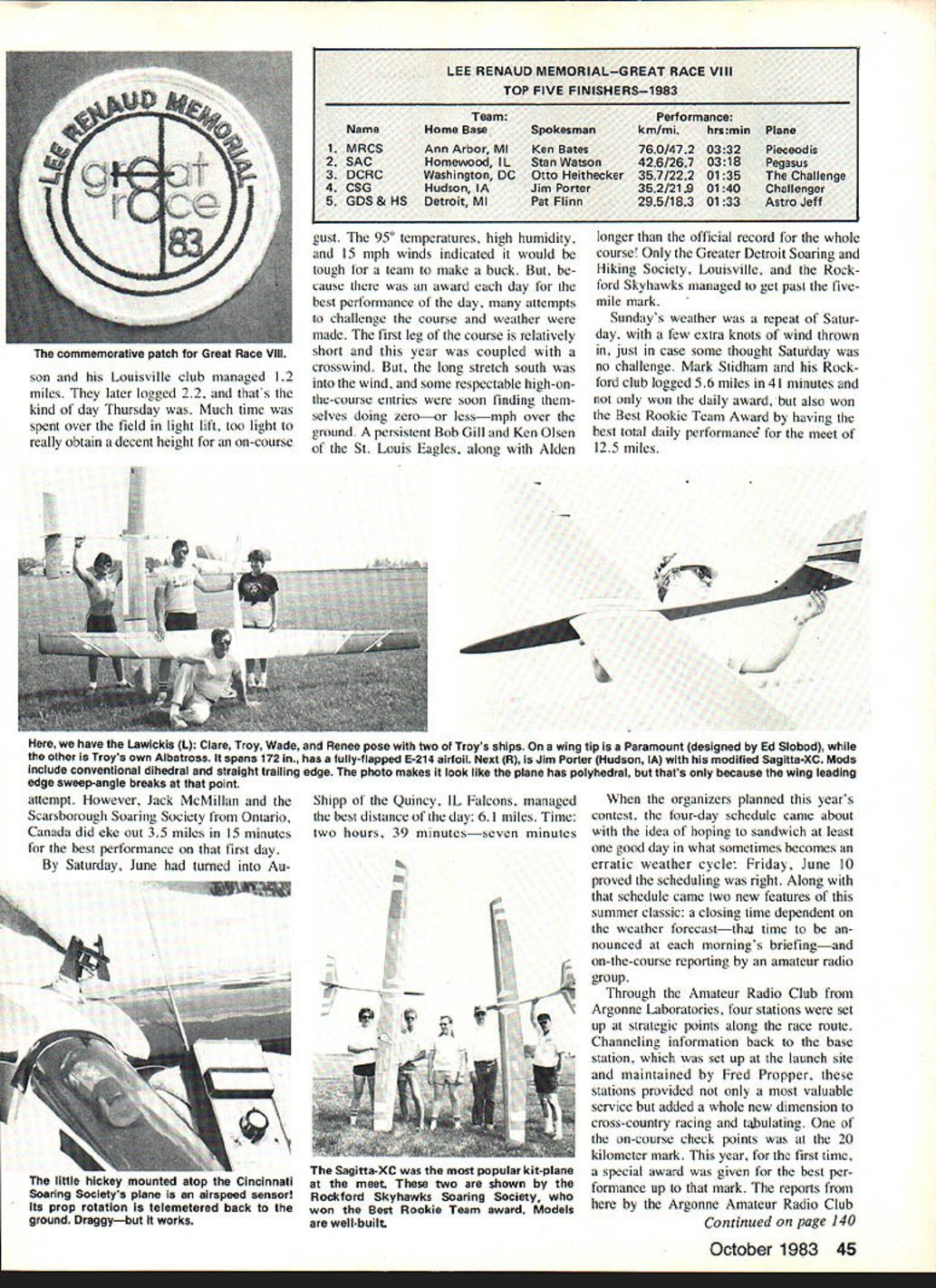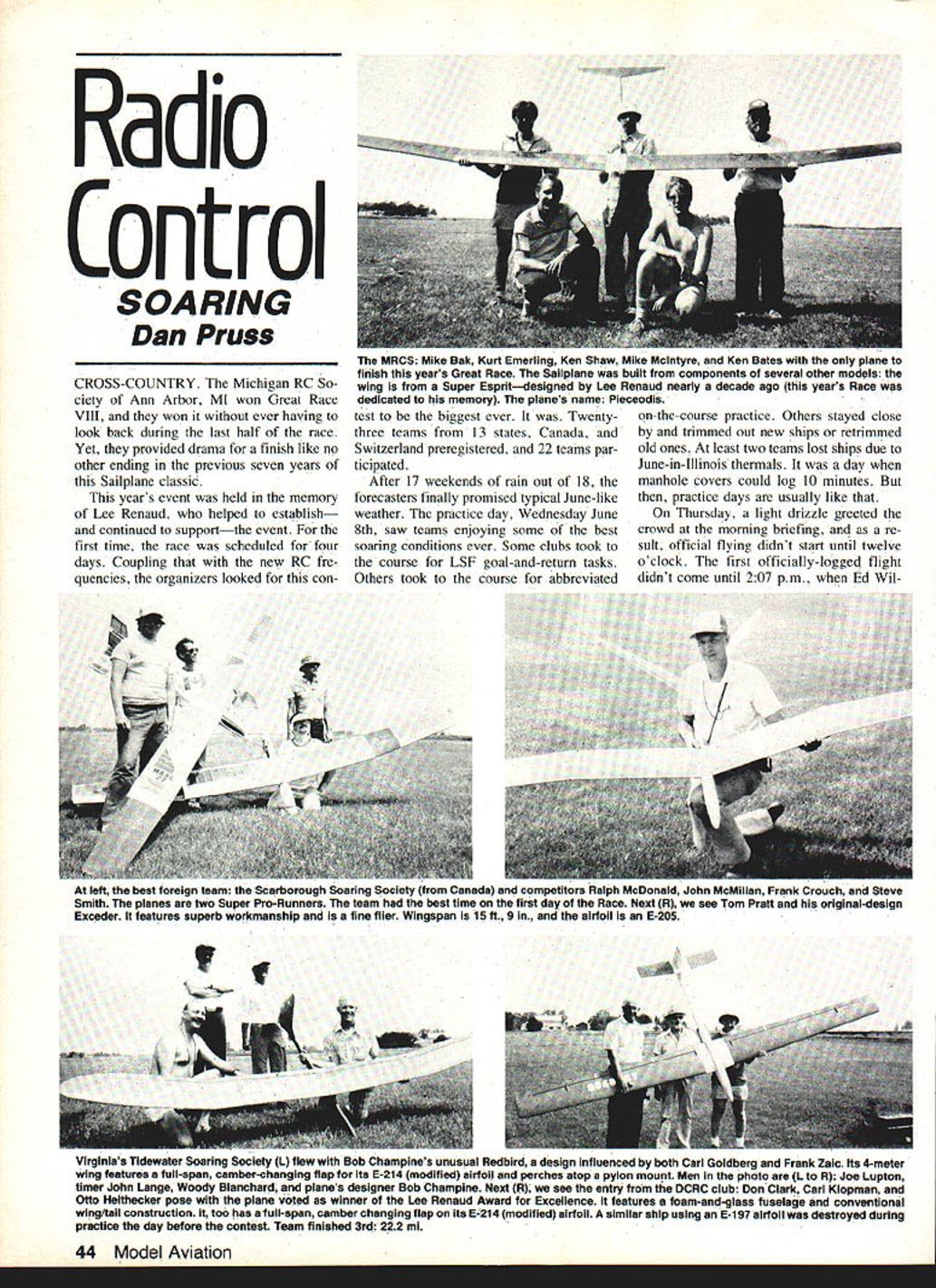 Radio Control SOARING Dan Pruss CROSS-COUNTRY Michigan RC So ciety Ann Arbor MI won Great Race VIII won ever having look back during last half race Yet provided drama finish like no other ending previous seven years Sailplane classic years event held memory Lee Renaud helped establish continued supportthe event first time race scheduled four days Coupling new RC fre quencies organizers looked contest biggest ever Twentythree teams 13 states Canada Switzerland preregistered 22 teams par ticipated After 17 weekends rain out 18 forecasters finally promised typical June-like weather practice day Wednesday June 8th saw teams enjoying some best soaring conditions ever Some clubs took course LSF goal-and-return tasks Others took course abbreviated on-the-course practice Others stayed close trimmed out new ships retrimmed old ones least two teams lost ships due June-in-Illinois thermals day manhole covers could log 10 minutes practice days usually like Thursday light drizzle greeted crowd morning briefing re sult official flying didnt start until twelve oclock first officially-logged flight didnt come until 207 pm Ed Wil vf Virginias Tidewater Soaring Society L flew Bob Champines unusual Redbird design influenced both Carl Goldberg Frank Zaic Its 4-meter wing features full-span camber-changing flap its E-214 modified airfoil perches atop pylon mount Men photo R Joe Lupton timer John Lange Woody Blanchard planes designer Bob Champine Next R see entry DCRC club Don Clark Carl Klopman Otto l4elthecker pose plane voted winner Lee Renaud Award Excellence features foam-and-glass fuselage conventional wing/tail construction too has alull-span camber changing flap its E214modified airfoil similar ship using E-197 airfoil destroyed during practice day before contest Team finished 3rd 222 ml 44 Model Aviation MRCS Mike Bak Kurt Ernerling Ken Shaw Mike Mcintyre Ken Bates plane finish years Great Race Sailplane built components several other models wing Super Espritdesigned Lee Renaud nearly decade ago years Race dedicated memory planes name Pieceodis left best toreign team Scarborough soaring society trom Canada Competitors Halpfl McDonald John McMillan Frank Crouch Steve Smith planes two Super Pro-Runners team best time first day Race Next R see Tom Pratt original-design Exceder features superb workmanship fine flier Wingspan 15 ft 9 airfoil E-205 son Louisville club managed 12 miles later logged 22 thats kind day Thursday Much time spent over field light lift too light really obtain decent height on-course gust 950 temperatures high humidity 15 mph winds indicated would tough team make buck cause award day best performance day attempts challenge course weather made first leg course relatively short year coupled crosswind long stretch south wind some respectable high-onthe-course entries soon finding selves doing zeroor lessmph over ground persistent Bob Gill Ken Olsen St Louis Eagles along Alden longer official record whole course Only Greater Detroit Soaring Hiking Society Louisville Rockford Skyhawks managed get past fivemile mark Sundays weather repeat Satur day few extra knots wind thrown just case some thought Saturday no challenge Mark Stidham Rockford club logged 56 miles 41 minutes won daily award also won Best Rookie Team Award having best total daily performance meet 125 miles N have Lawickis L Clare Troy Wade Renee pose two Troys ships wing tip Paramount designed Ed Slobod other Troys own Albatross spans 172 has fully-flapped E-214 airfoil Next R Jim Porter Hudson IA modified Sagitta-XC Mods include conventional dihedral straight trailing edge photo makes look like plane has polyhedral thats because wing leading edge sweep-angle breaks point attempt However Jack McMillan Scarsborough Soaring Society Ontario Canada did eke out 35 miles 15 minutes best performance first day Saturday June turned Au Sr Shipp Quincy IL Falcons managed best distance day 61 miles Time two hours 39 minutesseven minutes organi7ers planned years contest four-day schedule came about idea hoping sandwich least good day what sometimes becomes erratic weather cycle Friday June 10 proved scheduling right Along schedule came two new features summer classic closing time dependent weather forecastthat time nounced mornings briefingand on-the-course reporting amateur radio group Through Amateur Radio Club Argonne Laboratories four stations set up strategic points along race route Channeling information back base station set up launch site maintained Fred Propper stations provided valuable service added whole new dimension cross-country racing tabulating on-course check points 20 kilometer mark year first time special award given best per formance up mark reports Argonne Amateur Radio Club Continued page 140 October 1983 45 LEE RENAUD MEMORIALGREAT RACE VIII TOP FIVE FINISHERS1983 TeamPerformance NameHome BaseSpokesmankm/mihrsmin Plane 1MRCSAnn Arbor MIKen Bates760/4720332Pieceodis 2SACHomewood ILStan Watson426/2670318Pegasus 3DCRCWashington DCOtto l-leithecker357/2220135The Challenge 4CSGHudson IAJim Porter352/2190140Challenger 5GOS & HSDetroit MIPat Flinn295/1830133Astro Jeff commemorative patch Great Race VIII Sagitta-XC popular kit-plane little nickey mounted atop Cincinnati meet two shown Soaring Societys plane airspeed sensort Roclcford Skyhawks Soaring Society Its prop rotation telemetered back won Best Rookie Team award Models ground Draggybut works well-built Electrics/Kopski Continued paqe 137 date variety electric power systems planned construction article Next up Part Three will discuss pro pellers electric power motors sole function convert energy stored battery propeller thrust Im sure will amazed just what takes turn prop various props com pare prop change affects flight performance think youll find Part Three enlightening though still fundamental also graphic unique dont think thing like has published before Part Four will devoted bat teries about batteries Installations planes follow Now answer title question goo