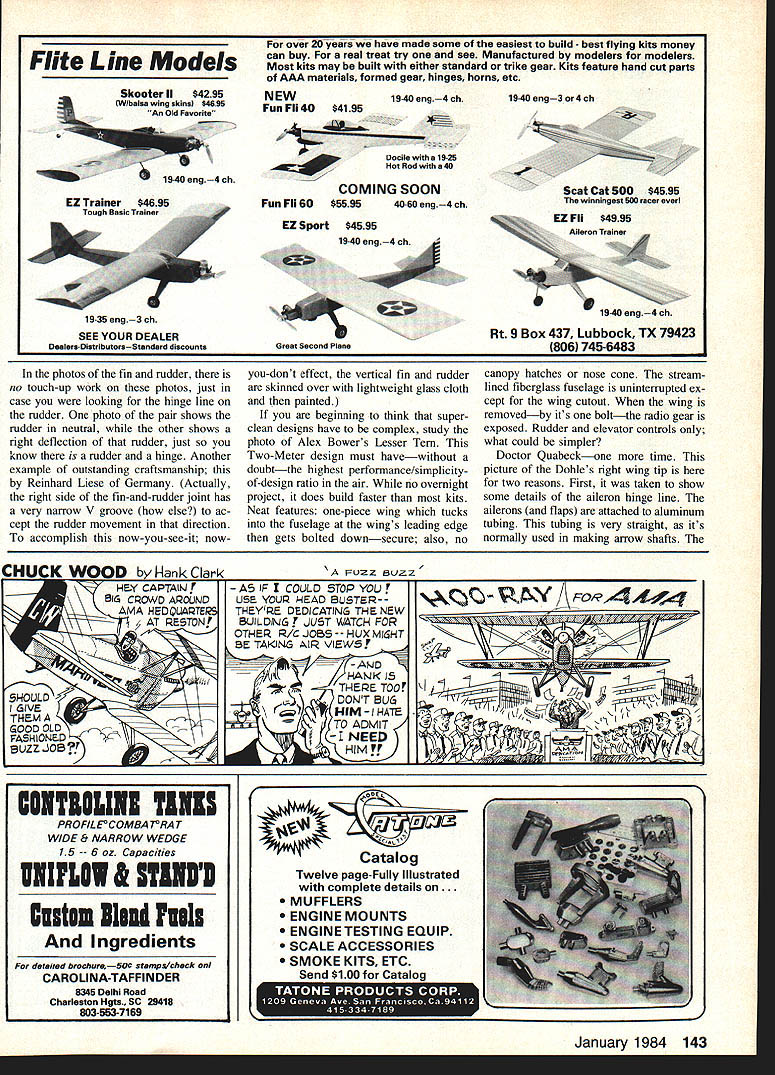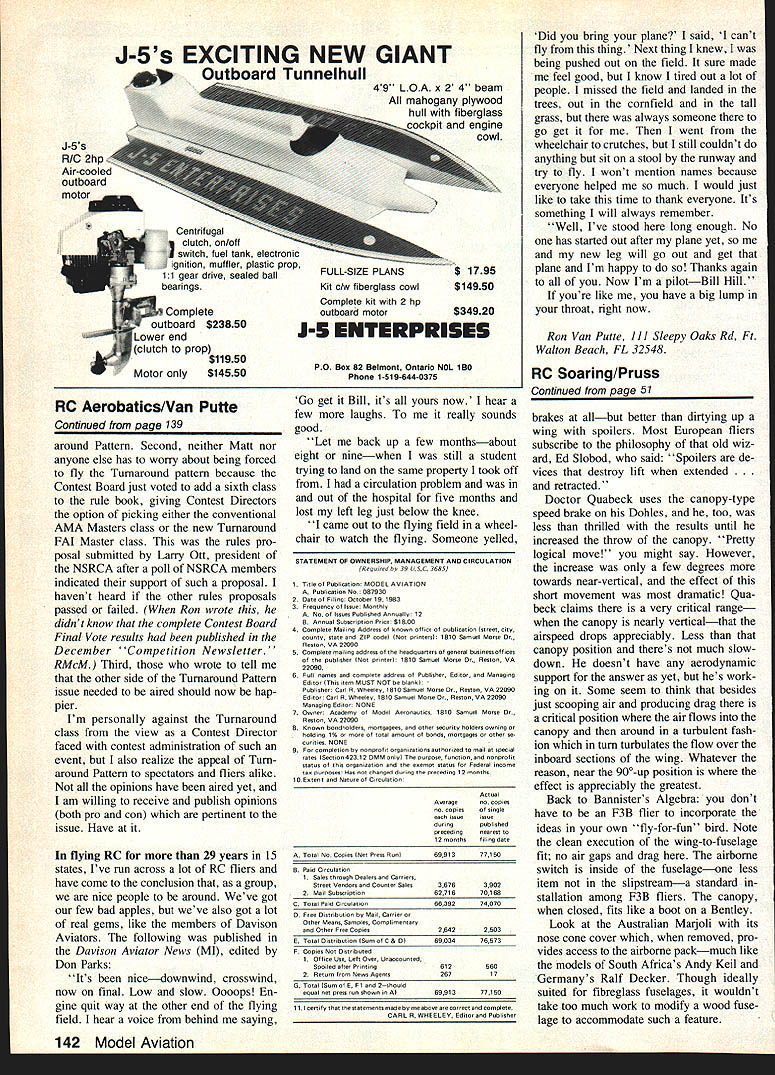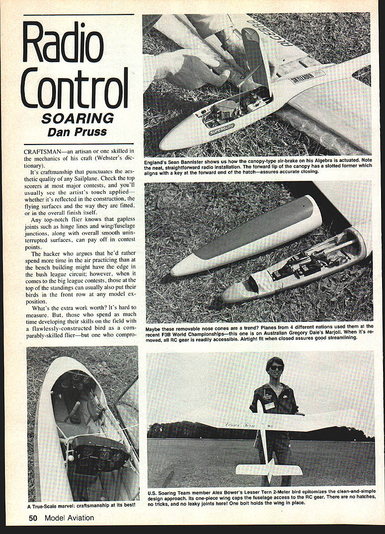 Radio Control SOARING Dan Pruss CRAFTSMANan artisan skilled mechanics craft Websters dic tionary Its craftmanship punctuates aes thetic quality Sailplane Check top scorers major contests youll usually see artists touch applied whether its reflected construction flying surfaces way fitted overall finish itself Any top-notch flier knows gapless joints such hinge lines wing/fuselage junctions along overall smooth unin terrupted surfaces can pay off contest points hacker argues hed rather spend time air practicing bench building might have edge bush league circuit however comes big league contests top standings can usually also put birds front row model ex position Whats extra work worth Its hard measure spend much time developing skills field flawlessly-constructed bird com parably-skilled flierbut compro 50 Model Aviation Englands sean tsannister shows us canopy-type air-brake Algebra actuated Note neat straighttorward radio installation forward lip canopy has slotted former aligns key forward end hatchassures accurate closing Maybe removable nose cones trend Planes 4 different nations used recent F3B World ChampionshipsthiS Australian Gregory Dales Marloli its re moved RC gear readily accessible Airtight fit closed assures good streamlining US Soaring Team member Alex Bowers Lesser Tern 2-Meter bird epitomizes clean-and-simple design approach Its one-piece wing caps fuselage access RC gear no hatches True-Scale marvel craftsmanship its oesu no tricks no leaky loints bolt holds wing place mises bench argues itll show up points An extra-clean Sailplane could mean extra minute air man-onman contest could mean nearly six minutes dead air F3B extra lap Distance seconds off Speed run As suming skill levels fliers about equal put money ones clean machines photos month some out standing examples craftsmanship Some way mechanical some way models finished out standing examples art canopy brake Sean Bannisters Algebra featured pictures As European fliers believe keeping wings clean costs slowing down affected open canopy English gent has using type sys tem several years long series similar designs side note some first-time users such Seeing double Let us explain two photos show invisible rudder ninge-line Reinhard Lieses Germany model Left rudder neutral right rudder deflected right can see ever-so-slight difference light reflected rudder info column braking device arent too pleased canopys slowing-down effectiveness Some treat system slightly better no Continued page 142 top view right wing tip Dr Quabecks Dohiethe tip-bevel contrary usual practicebut wind tunnel tests prove superiort Fine hinge line possible because aluminum arrow-shaft torque tube INDSONG THE LOOK OF WINNER THE PERFORMACE OF CHAMPION Send 2 stampS complete catalog gviog fall details a]] toree oar multichasnel gliders featuring SOLIDCORE WINGS SEAMLESS FIBERGLASS FUSELAGES EPPLER 214 AIRFOIL FLAP AND AILERON CONTROL AND NEW STANDARD OF PERFORMANCE ORe 1gC3 contest results in the WINDEONG has proven itself THE PROMISE EDLEILLED major contests across tbe nation wherever tasks challenging air times hard cone WINDSDNG has SET ERR STANDARD OF PERFORMANCE slow steep fully controlled Windsong landinR approach itself has opened new era landing precision talking about RD degrees flaps combined new automatic elevator compensator appropriately nicknamed Oar Oeaastatvr Tke supplemental use spoiling action possible variable negativecamber ailerons offers still another dimension planes seemingly unbelievable speed glidepooh control TOM DRIGHTEILL won RIGREST SOARING HONDR NATION winning lii Johnson TROPHY RIGREST DOERALL SCORE 19D3 NATIONALS MA truphy based un 24 seven mis flights per contestant about 125 cvntestantsl Ton flew Oodgson Designs Windoung open class Camano 100 standard class KMinnow 2 Meter clvss three ships feature incredible Eppler 214 airfoil SIX WINDOONGS flown FDBR FINISHED IN THE TROPHIES including ROB DODGODNO 2nd PLACE OPEN CLASS WIN Two uf regional National Soaring Society contest won Winosongs BBR3 two held Corpus Chnisti Texas Portland Oregon Rob Dudguon won big trophy 19B3 NWSS Championship Contest Richlana WA flying original prototype Windsvng Bob finisned 2nd NWSS total seuson psi ecu being beaten Dy TIME SEASON CHAMPION DADE JOHNSON flying tanano 100 TEe INDIDIOJAL WINOSONG CONTEST WINS around nation TOO NDMEROBS TO LIST thanks great pilots like Rernie Coleman Josh Gluab Tom Neilson Jim Tnvnas etc THE WINDOONG HAS CLEARLY ESTABLISHED ITSELF paut seasvn AS THE NEW TCERMAL COMPETITION PERFOgMANCE CHAMPION WITCOOI PEERI DODGSON DESIGNS Sw Camano Dr Camano lsWa 982q January 1984 51 -u 0 U N, e C C a U -u 0 0 C 0 4 S Above Photo her Todi Dvogson modeling Ontil January 30th BBRA offering Winosong Camanv Island sunshine 11th Anoioersary 15% off Special three sits purchased retail direct factory special prices fol lows Windoong Rag Price $lBRDBSpecial slEBBE CamanoRag Price $1N9BESpecial $135R6 KMinnv Rag Price $149gSSpecial $12246 J-5s R/G 2hp Air-cooled outboard motor u8c Complete outboard $23850 r end ictutch prop $11950 Motor only$14550 RC Aerobatics/Van Putte Continued 1mm page 139 around Pattern Second neither Matt nor anyone else has worry about being forced fly Turnaround pattern because Contest Board just voted add sixth class rule book giving Contest Directors option picking either conventional AMA Masters class new Turnaround FAI Master class rules pro posal submitted Larry Ott president NSRCA after poll NSRCA members indicated support such proposal havent heard other rules proposals passed failed Ron wrote didnt know complete Contest Board Final Vote results published December Competition Newsletter' RMcM Third wrote tell other side Turnaround Pattern issue needed aired should now hap pier Im personally against Turnaround class view Contest Director faced contest administration such event also realize appeal Turn around Pattern spectators fliers alike opinions have aired yet am willing receive publish opinions bo