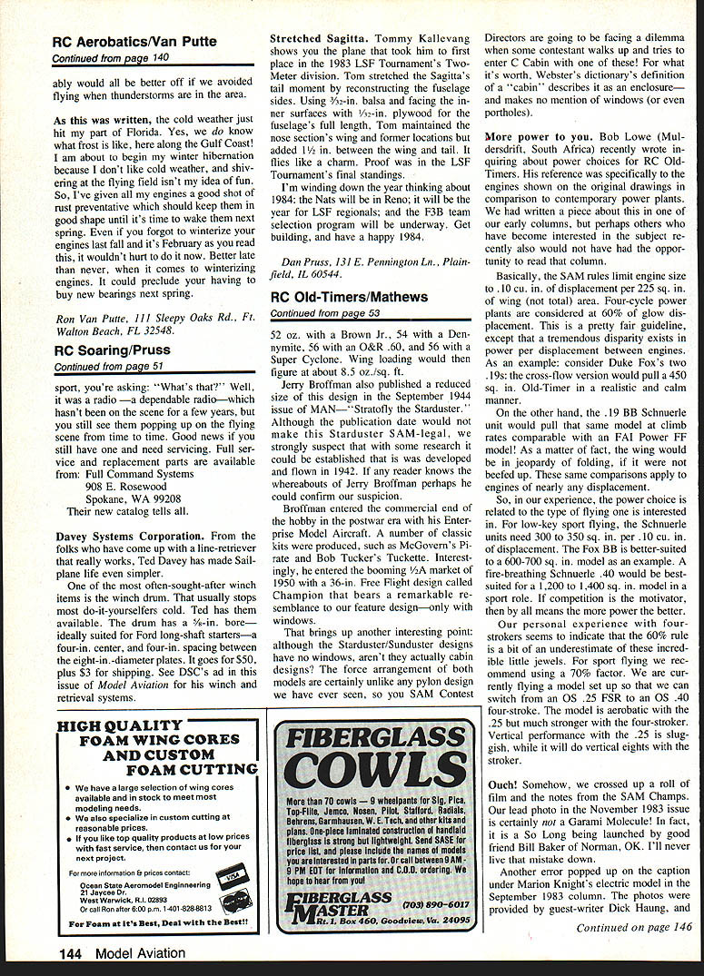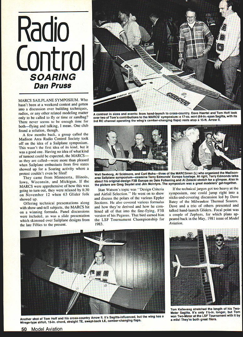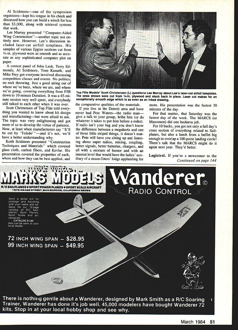 Radio Control SOARING Dan Pruss MARCS SAILPLANE SYMPOSIUM hasnt weekend contest gotten discussion over building techniques radios other related modeling matter called fly time sandbag never seems enough time bothflying talking mean club found solution though few months back group called Madison Area Radio Control Society took off idea Sailplane symposium wasnt first idea its kind good Having no idea what kind turnout could expected MARCS calledwere pleased Sailplane enthusiasts five states showed up Soaring activity protest couldnt filed came Minnesota Illinois Iowa Wisconsin Michigan MARCS apprehensive going turn out relaxed 830 November 12 63 Glider folk showed up Offering technical presentations along show-and-tell subjects MARCS hit winning formula Panel discussions included slide presentation skimmed over Sailplane designs late Fifties present Stan Watsons topic Design Criteria Airfoil Selection went show discuss polars various Eppler Sections also covered various formulas theyre derived com bined fine-flying F3B version Pegasus bird earned him LSF Tournament Championship 1983 technical jargon got too heavy symposium could jump right sticks-and-covering discussion led Dave Batey Milwaukee Thermal Soarers Dave trio others presented talked hand-launch Gliders Focal point couple Zephyrs plans ap peared back May 1981 issue Model Aviation 50 Model Aviation M wjii5st sizes events hand-launch cross-country Dave Iiaenei ano iom non lOOK over two Toms contributions MARCS symposium 17-oz mini 64-in-span Sagitta its 3rd RC channel operating wings camber-changing flaps rests atop 15-ft Arrow Walt seaborg Al Scidmore Carl Mohsthree MARCSmen L organized Madisonarea Sailplane symposiumexamine Terry Edmonds Europa fuselage right Terry Edmonds talks about original-design F3B Europa Dale Folkening Al Zolecki stretch glimpse Also picture Greg Seydel Jim Mcintyre symposium great modelers get-together Another shot Tom Hoff cross-country Arrow Ii Its Sagitta-influenced wing has Mirage-type airfoil 1 5-In chord straight TE swept-back LE camber-changing flaps Tom Kallevang stretched length TwoMeter Sagitta Its 1-in longer Tom won Two-Meter LSF Tournament mile Theyre both great fliers Al Scidmoreone symposium organizerskept tongue cheek discussed can build winch less $3000 along retrieval systems work Lee Murray presented Computer-Aided Wing Construction another topic en tirely new However Lees discussion cluded laser-cut airfoil templates samples various Eppler sections cut /4-in plywood smooth accu rate sophisticated computer plot paper contest panel John Lusk Terry Ed monds Al Scidmore Tom Kunath Mike Frey got everyone involved discussing competition classes events No politics no rock throwing Just good airing out weve where going covering everything F3B down 10-minute Duration 45-mi nute session very well spent everybody still talked other over Scott Christensen Top Flite told thing wanted know about kit design manufacturingbut afraid ask topic very enlightening got us develop virtue patience Now least manufacturers say Itll out Toledo its well have better understanding Keith Scidmore presented Construction Techniques Materials covered glass cloth carbon fibers Kevlar presentation covered properties can best applied comparative qualities materials live Detroit area have never Pete Watersthe radio man give talk group bribe him whatever takes put him before mike radio isnt bag dont know difference between megahertz little striped things doesnt mat ter Pete will have sitting up listen ing about super radios mixing coupling better signals better batteries chargers mixture humor interest level would have ladies aux iliary steam-fitters lodge applauding presentation fastest 30 minutes day matter Saturday fastest day week MARCS Marcsmen did heckuva job 10 bucks got full days cross section everything related Sailplanes also lunch buffet big enough overlap 100-point landing circle Theres talk MARCS might again next year Theyd better Logictrol youre newcomer Continued page 144 March 1984 51 Top Flue Models Scott Christensen L questions Lee Murray about Lees laser-cut airfoil templates ones shown cut -In plywood stuck back place Laser cut makes exceptionally smooth edge Inked drawing RC AerobaticsNan Putte Continued page 140 ably would better off avoided flying thunderstorms area As written cold weather just hit part Florida Yes know what frost like along Gulf Coast am about begin winter hibernation because dont like cold weather shiv ering flying field isnt idea fun So Ive given engines good shot rust preventative should keep good shape until its time wake next spring forgot winterize engines last fall its February read wouldnt hurt now Better late never comes winterizing engines could preclude having buy new bearings next spring Ron Van Putte 111 Sleepy Oaks Rd Ft Walton Beach FL 32548 RC Soaring/Pruss Continued page 51 sport youre asking Whats Well radio dependable radiowhich hasnt scene few years still see popping up flying scene time time Good news still have need servicing Full ser vice replacement parts available Full Command Systems 908 E Rosewood Spokane WA 99208 new catalog tells Davey Systems Corporation folks have come up line-retriever really works Ted Davey has made Sail plane life simpler often-sought-after winch items winch drum usually stops do-it-yourselfers cold Ted has available drum has 5/s-in bore ideally suited Ford long-shaft startersa four-in center four-in spacing between eight-in -diameter plates goes $50 plus $3 shipping See DSCs ad issue Model Aviation winch retrieval systems HIGH QUALITY FOAM WING CORES AND CUSTOM FOAM CUTTING have large selection wing cores available stock meet modeling needs also specialize custom cutting reasonable prices like top quality products low prices fast service contact us next project information & p ces contac Ocean State Aeromode Eng nneer ng 21 Jaycee Dr West Warwick Rl 02893 OrcallRonaftar6OOpm -40 82888 3 Fec Feam its Beat Deal Best Stretched Sagitta