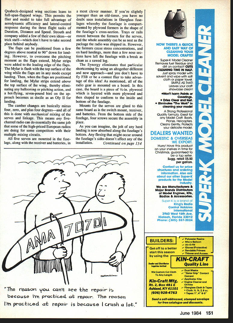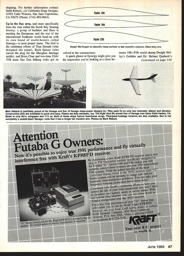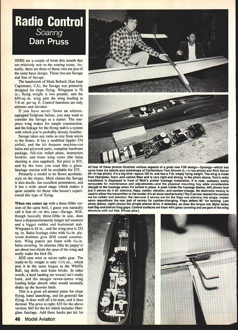 HERE couple birds month relatively new soaring scene Ac tually three two just same basic design two Savage Son Savage handiwork Mark Rebeck San Juan Capistrano CA Savage primarily designed slope flying Wingspan 70 flying weight two pounds 650-sq-in wing puts wing loading 7-8 oz per sq ft Control functions ailerons elevator have never flown aileronequipped Sailplane before may want consider Savage starter onepiece wing makes simple construction linkage flying stab system youre probably already familiar Savage takes radio size micro brutes has modified Eppler 374 airfoil kit features machine-cut balsa plywood parts complete hardware package full-size rolled plans instruction booklet foam wing cores balsa sheeting also supplied Kit price $55 time read glassfuselage version will available $75 Primarily model flown aerobatic style slopes Mark claims Savage also docile has excellent penetration has wide speed range makes quite suitable havent experi enced type flying comes up three-fifths ver sion same bird guess naturally call Son ofin caseSavage SOS though basically three-fifths size does have disproportionately longer tail moment bigger rudder horizontal stab Wingspan 42 wing area 233 sq Balsa fuselage sides /-in ply wood doublers give SOS sound construc tion Wing panels foam o-in balsa covering Its ailerons like its pappys about two-thirds span wing really make bird flit SOS uses mini micro radio gear ready-to-fly weight 11 /2 oz puts same league Whiffle Ball rag dolls foam bricks other words hard landing worse isnt really hard meager seven-ounce wing loading helps absorb what would normally shake up heavier birds great all-around plane slope flying hand launching general fun flying does well off hi-start does thermal price right $35 above version $45 kit includes fiber glass fuselage Add three bucks per kit four photos Illustrate various aspects great new P38 designSynergywhich has come talents workshops CalIfornians Tom Strouth 1in top photo Rich Spicer Rin top photo fls big birdspans 120 has 7-lb empty flying weight wing made fiberglass foam carbon fiber very rigid strong photo above Toms radio installation displayed front Richs similar fuselage installation neat compact easily removable maintenance adjustmentsand plywood mounting tray adds considerable stength fuselage its bolted place peek inside fuselage below left shows lust 5 servos ailerons flaps rudder elevator camber-change No electronic mixing used either transmitter model its done mechanicallyl 2 servos nearest camera rudder elevator rearmost 2 servos flaps ailerons single middle servo repositions rear pair servos camber-changing Flaps deflect 90 landing Last photo below right shows simple aileron drive detaches does torque rod Mylar strips seal flap aileron hing gaps Control surfaces foam glass covering part wing structure until cut free Pruss pica shipping further information contact Mark Rebeck California Slope Designs 31932 Calle Winona San Juan Capistrano CA 92675 Phone 714 493-0843 Up Bay area specifically clan called South Bay Soaring Society group builders fliers meeting Europeans rest international Sailplane world head-on its own brand world-beaters called Synergya proper name bird combined efforts Tom Strouth designed plane Rich Spicer carved plug fiberglass fuselage molds Brian Chan two-time USA F3B team flier Don Edberg got inEppler 180 Oopsl forgot identify airfoils last months column volved constructiontween 1981 F3B world champ Dwight Hol quick glance Synergy might give youleys Gobbler Dr Helmut Quabecks impression youre looking cross be-Continued page 150 June 1984 47 Mark Rebeck justifiably proud Savage Son Savage slope-soarer designs L fly two channels aileron elevator Construction kits available quick easy Planes fully aerobatic too flIght shot R shows Son Savage over Dana Point Harbor CA Model 42-in wingspan 11 oz Both ships feature foam/balsa wings Fiberglass-fuselage versions also available Son completely scaled-down Savagenote has longer tail moment arm Photos Mark Rebeck REBEL a/c 861 1mm RoadSan Antonio TX 78216 512 341-6712 FUTABA 7FGKFM20995 6FGK FMSOLDOUT 7FGK18495 6FGK16495 SFGK15495 6FG15495 4FG14395 4L3-S/2810495 2F2/S-28-R4H7495 S-28SERVO1895 S-32SERVO2595 COVERINGS Momokote Opaque 3 Rolls1695 Monokole Trans 3 Rolls1695 Monokole Met. 3 Rolls2095 CYANOACRYLATE Hot Stuff MS-I e149 Hot Stuff HSTl e149 Hot Stuff HS4 2 Ounce499 Hot Stuff HST-4 2 Ounce499 Hot Shot245 Jet e179 Super Jet e179 Jet 2 Ounce599 Super Jet 2 Ounce599 EPOXY GLUE Deveon 30 Minute 9 Ounce595 Deveon 5 Minute 9 Ounce595 Hobbypoxy 8 Ounce359 Hobbypoxy IV 8 Ounce559 Hobbypoxy 1118 Ounce295 SULLIVAN MT #600 Starter2595 HID #601 Stance2695 HTI-24 #602 Starter3695 PLEASE NOTE Prices subject change manufacturers prices change Alt Items subject availability time sale Prices effect until next Model Aviation Issue Show room prices may slightly higher Visit show room San Antonio 100 discount price list refunded first order Shipping& Handling Prepald orders S390 COD Credit Card orders S595 Overseas orders add estimated shipping 25% deposit re4nired first lime COD 55% sales tax required Texas residents Personal checks detay shipping IS days Coming Soon ~ 1/5 SCALE RIO MODEL 62 SPAN NGINE CHANNEL R/C FOR ADVANCE INFO WRITE TO ST CROIX OF PARK FALLS LTD PO Box 2790 Park Falls WI 54552 Computer/Sarpolus-Raad Continued paqe 147 ventional configuration 17 Li Distance between stabilizer wing root inches length fuselage between wing stab 18 Wi Total weight ounces i9 E9 Engine size cubic inches structure program such prompt value of pa rameters listed above have enter particular value gets stored memory until used sub sequently Compute lines 540 850 Assuming input sequence performed correctly program performs com putations needed between lines 540 850 computations involve finding aero dynamic centers surfaces surface areas area moments balance point center gravity location wing loading en gine loading Output lines 860 1760 Lines 860 1760 mostly compr