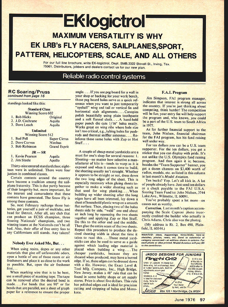 Y Soaring first contest modest entry ten fliers February no doubt some effect such low attendance zero temperature kept fair weath er fliers close fire records show contest mild success Fliers worked radios didnt vice versa Contestants came far away Chicago doesnt necessarily make contest successful modest beginning gents Detroit good thing going cause next five years interest attendance grew Fliers came far Maryland Pennsylvania some Texans couldnt stay away 1975 year 61 contestants showed up proves building season isnt long enough cabin fever during midwest winters has reached epidemic pro portions nuts sport Ed Slobod ever guessed past five Snow Flys lived up contest name year however title misnomer Mud-Fly would have appropriate After unseasonable warm week before contest date foot snow would have periled driving winching fly ing landing melted left field mud itself wasnt bad Sunday February 15th dawned 30 mph winds greeted 61 contestants Temperatures high 30s Contest Director Art Slagle nounced tasks Six-minute duration optimistic CD ever would goal Landings made within circle 25-ft radius no points awarded landing within zonebut lose 25 points making contest would three rounds Transmitter impound would honor system contestant would responsible being sure TX turned off kept warm after flight system worked Open winches order day after first few launches thought contest would over lunch time planes didnt fold wings found challenge two minute mark few exceptions USA Dan Pruss Above For $10 become US Team Supporter receive bumper sticker see text lnw Keith Finkenbiner NSS Rules Chairman wind now 20 mph gusts up 38 mph winch lines closer much closerto 150 meters length 300 meters thought kiting means overcoming short launch facilities found themselves far down wind no altitude advantage thetime released didnt make back no point landing zone theres lesson learned concern ing FAI rules winch restrictions open winch announcement made Slagle stipulated time limit round flew wanted didnt get flight time limit got zero round system worked everyone beat clock sailplanes left Two classes recognized unre stricted standard class unlimited class Best single flight instigator now annual event Bud Pell GDS&HS time407 includ ed no-point landing 247 seconds tougher ten-minute flight August attrition rate highest ever seen reporter contest least two dozen ships fell victim overwinching high wind gusts few trees dust er ah mud settled continued page 97 16 Model Aviation Radio Control TEAM SUPPORTER BACK IN FEBRUARY 1971 GDS&HS stalwart group die hards announced sailplane contest Michigan February No other name would appropriate Snow Fly standings looked like Standard Class Winning Score 602 1Bob HicksOriginal 2JD CochraneAquila 3Dave LeachAquila Unlimited Winning Score 512 1 Bud PellSuper Cirrus 2 Dave CorvenNimbus 3 Bob RobinsonGrand Esprit JRSR 1 Kevin Pearson 2 Jim Steele Aquila Apollo Thirty-nine entered standard class eightteen unlimited four juniors combined classes Certain contests around country have become tradition among sail plane fraternity due partly because longevity important interest camaraderie contests have generated Snow Fly among contests So next February recharge bat teries get yourself pair mukluks head Detroit After club can produce ECSS champion three Soaring Nationals champions two winning teams Nationals cant bad Also offer free entry fees Californians still stands Any takers Nobody Ever Asked But. using resins dopes other materials give off unfavorable odors open bottle room air fresheners place close work possible open air freshener first. marking wire bent use small piece masking tape tape can removed after desired bend made.. bends 900 bends parallel use sheet graph paper reference ensure proper angle. peg board wall shop backing work bench peg board holes serve quick ref erence want just temporarily eyeball wing tail vertical fin horizontal stab alignments. pies polish beautifully using plain toothpaste soft flannel cloth. d-held paper punch die cuts 1/16 balsa neatly Works great wing ribs hole size isnt too critical eg tubing holes pushrods thermal sniffler antennas. nforce same holes Zap Hot Stuff.. couple cheap metal yardsticks must ones shop several reasons Sheetingno matter selective man ufacturer kits istends warp exposed comes time build sheeting usually isnt straight Whether appears straight dress down two long edges sheet especially necessary gluing sheets gether make wider sheeting such used wing planking . ding up wider sheeting after long edges have trimmed lay down sheet household plastic wrap smooth flat surface placing two balsa sheets side side weld end about inch long squeezing two sheets together applying Zap Hot Stuff other end middle glue entire seam two sheets Repeat procedure produce de sired sheeting width about time takes read tal yard sticks can also used serve guide against leading edge material placed building wing . cheaper yardsticks because sheared produced may have burred edge edges can dressed down file However Exact Level & Tool Mfg Company Inc High Bridge New Jersey makes 48 rule can found some hobby shops art supply stores Price about five dollars rule has polished edges ideal precision cutting stripping balsa Mono kote Jim Simpson FAT program manager indicates interest strong across country youre just thinking about competing think harder competition will fun entry fee will help support program knows could part US team South Africa 1977 As further financial support team John Nielsen financial chairman FAT program has fund raising well under way ten dollars can US team supporter ten dollars get sticker can display pride Its unlike US Olympics fund raising program again because besides Team Supporter banner get dozen chances $3400 worth radios models etc listed column last months ModelAviation Ten bucks Yep Lets kick lot people already have Just send ten dollars check payable FAT USA Soaring Team Fund John Nielsen 3744 Lake Ave Wilmette IL 