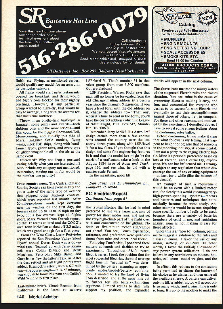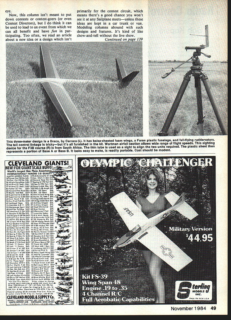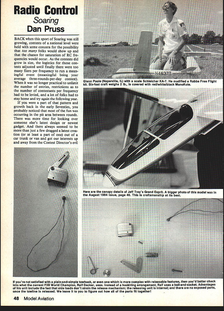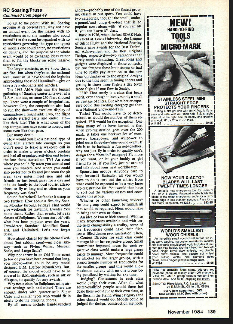 Radio Control Soaring Dan Pruss BACK sport Soaring still growing contests national level held some concern possibility too folks would show up chance saturation RC fre quencies would occur As contests did grow size logistics con tests adjusted until finally too fliers per frequency run mean ingful event meaningful being average three-rounds-per-day contest no longer practical unlimit number entries restrictions number contestants per frequency levied lot folks stay home try again following year part pattern growth back early Seventies probably noticed fun occurring pit area between rounds time looking over someone elses latest design newest gadget always seemed just few dragged latest crea tion least part out car trunk van got interests up away Contest Directors evil 48 Model Aviation pervilie e Schlelchera Robbe Free Flight kit Six-foot craft weIghs 2 lb covered redlwhitelbiack MonoKate canopy details Jeff Troys Grand Esprit bigger photo modei Auaust 1984 Issue aae 46 ThIs craftsmanshlo its haRt youre satisfied plain-and-simple towhook complex releasabie features youd better check what current F3B World Champion Raif Decker uses instead hooklring arrangement Raif uses bail-and-socket Advantages unit Include fact side loads dont strain reiease mechanism releasing unit internal no exposed parts once towilne released leave figure out parts fit together eye primarily contest circuit Now column isnt meant put means theres good chance wont down contests contest-goers see Sailplane meetsunless Contest Directors think can ideas kept car trunk van used lead event Modeling columns abound such can benefit have fun par- designs features Its kind like ticipating Too often read article show-and-tell live show about new idea design ont three-meter design Draco Carrera L has baisa-sheeted foam wings Foran plastic fuseiage fuii-fiying ruddervators tall controi linkage trickybut its furnished kit Wortman airfoil section allows wide range flight speeds sighting device F3B course R South Africa thin tube used sight align two units required plastic sheet represents portion Base Base B looks easy make readily portable Cost should modest CLEVELAND GIANTSI NEW FOR GIANTSALE BUFFS Worlds Largest Gas Plans Assortme RNATIONALLY FAMOUS C-D OUALIfl MASTER MODELS PLANS 54S 0 Deororoelln 21 $4 78CnnoI Cot PRY5A $42 72 Cor 020 1/4 L&S $46 04 Cnn Cot FEY5A $56 62 Hoorord Rooc lb $4396 Wriglrr-NooyRnn $48r- 77 Boeing 8-1 7G Fort $35 52W-WorolSi EodL $36 102 Rn BuG Fort $55 77 WWorl 21 Rod L $48in 68 Song O46A Ob. $32 * 84 Fokkr 07 Ftr$39 105 Sinkor S3R Aorpb $49 60 Honoord PM Ron 522r 60 En. 100 Sport $36 70 Eyl G.Ee $32 90 Eon 100 SportS49o 60 Onperororin 568 $24 OODtinALogo Wing $56 89 Soperororino S6R $22 50 MorOn 74 TAM1 $39 62 Con Honok P60 $42 78 HP5 0400 Boork $42 94 CnrHoob P6E Fir $54 104 H-Pg 0400 Born $56 62 Looklreed V5$24 65 MCinino Clippor $55 74 SoolittI 05 11 $45- 97 MCirinn Clipper $75 95 Morronoop Sport $38- 68 We6 Wbnlooind $52 80 Holi Spr Boildog $43 65 Ryon Nonon$29 107 Aernono C3 Dpi $30688 Bonbon VT $29 81 Songlo 03R Ob $33 77 Loonorob Sedon $25 122 Songlo 03rOb $49 73 N M oh Boorb $49 94 Pogoc Con Bonor $45o 65 M Mo node 5 26 $49 71 Morrin 510 Bomb $29 8105 Mooqo Sb $42 78 Tnrnr WW Ron $35 0509 Mor5n Sorrrb $55 oo Goohk P1 C $42 98 Sino PT 7koydi $56 n 94 Cor Goohk Fl 1C3 55499 N 81kw door P61 $69 06 0900 Coorot Ron 534 71 Song DC 3 Son $32 * 62 HornMr Molligno $35 95 Song DC 3 0 om 555 94 HooMr Molligon 845 86 Honoko Toonno 15552 63 90105 P26A Fir $36 109 Co 0201 4 L&S $56 84 Boeing P26A Fir 545 60 Dooglo M 2 Mo $24 69 Woon C6 Cnbirr $36 68 8 toI En dog F $20 64 Boonk C17S 0mg $55 595 orooRoroMoLA $54 96 SoonIr C17R Sm5 849 107 G nor Senor F8F $54 50 Look 11 Eleotro $30 73 7 000 6000 $24 85 Look 11 Elnoiro 840 107 Mo ME 1 Born $44 62 Orinoon 0 W SR7 s16 OIL odhe go NO 211 539 SiSrinnoonT WSR7 $34 10SF0 rhPT19T$59 122 Orirroorm 0 W 097 $38 SO Woro ToporWinog $39 n0o 59 Briorol Frr F2B $20 75 W,iI4 Lycoodor $32 78 Briorol Prr P25$32 100 WesrId Lyonder $49 118 Briorol Fm P28 $49 57 Ford Triroro 4AT 528 __ 74 TO P000 Spon 545r 76 Ford Triinnir 4AT $45 63 Skyrookor XF5F1 $30 114 Ford Triorrr 4AT $59 * 56 Cnn Worhk P40 024 84 SoriJoyn 5FJ5 ook Ligbrrrg P38 $38 93 Loorring C2AorpIr $69 56 99 5090 Aor 554 58 GrnorJ2F Snob $39 74 RepSooB Aorph $59 78 GrnorJ3P Donk $56 106 Piper J3 Cob$39 59 Gorho GIV Boor $22 95 Look Hodoon Bork $38 117 Gotbo DiV Boor $39 0 63 Grnor FOP HeIloor 825 68 BronWinklo Bird 045 00 06 82 Tingor Moilo S39 54 Cnrr Soniti 0p954 $28 Nor Sold Thro DenierPrio.onbleor io ohorgo *0000 VOiCe NOlcoteS niotoTon OiZ0 14000 PonO Coon 1200 Odror 6 75 P05. Inol SOo Up Add 10% 0 oIl ordor br obipping & in. oro USA Con & Moo Eioooohr ii 15% 125% iR olni Piororiol onrolog 5200 Irnolodo Prig Lion Prioc br oeriion olon 51 00 oir torolon odd $100 CLEVELAND MODEL&SUPPLY Co 000000 t noXnIOnoIOTIooO 0600 flrEOO 00400 ci 18307K DETROIT AVE CLEVELAND OHIO 44183 yfloregOrorriniroorinO 00000oroinger logo November 1984 49 RC SoaringlPrus Continued page 49 get point RC Soaring growing its present rate have annual event masses no restrictions number could attend Let event organized no restrictions governing type types models could enter no restrictions designs purpose whole event would exchange ideas rather fill blocks some massive scoreboard larger contests know fine theyre national level us have found logistics approaching Hannibalsgive take few elephants winches 1983 AMA Nats saw biggest gathering Soaring contestants ever USA contest some 250 fliers showed up couple irregularities however competition also run showan excellent display camaraderie might add Two flight schedule started early ended late like dark late what some top competitors have come accept some like pace dont would like national type event started late enough didnt need leave wake-up call order make seven oclock briefing organized activities end before late show started TV An event could fly wanted what wanted could also prefer fly just ro