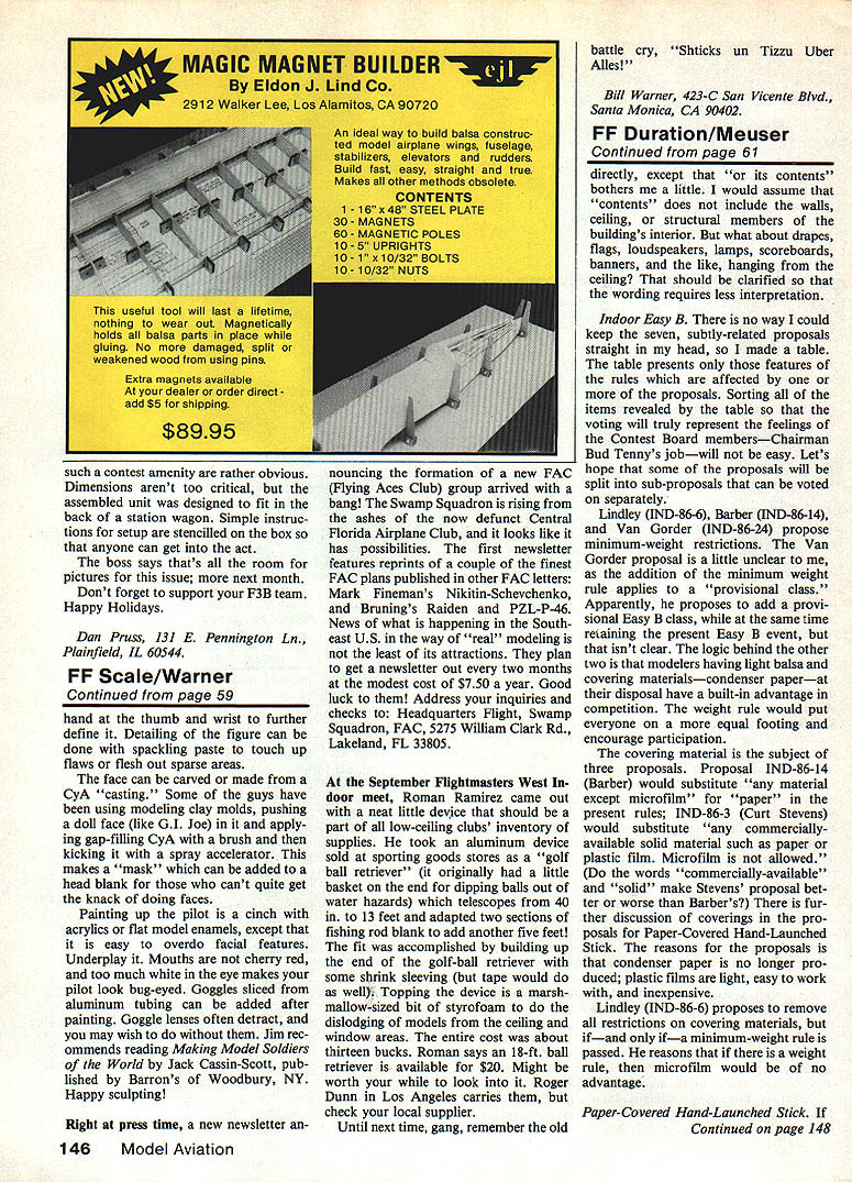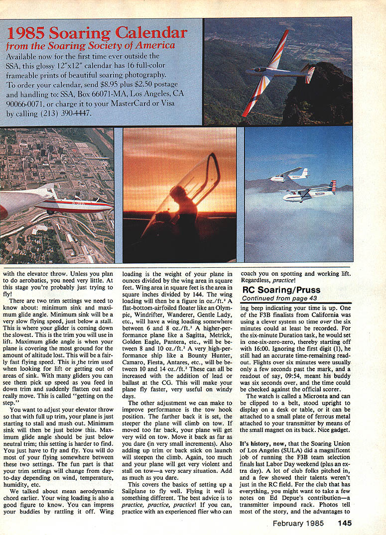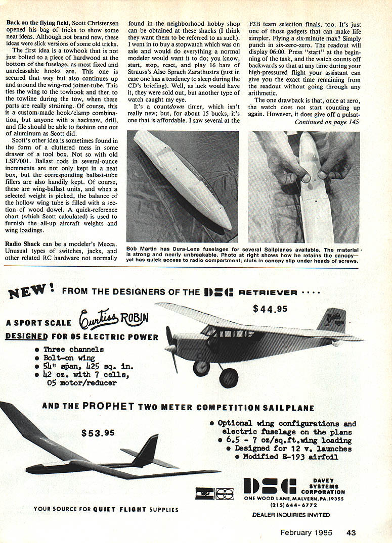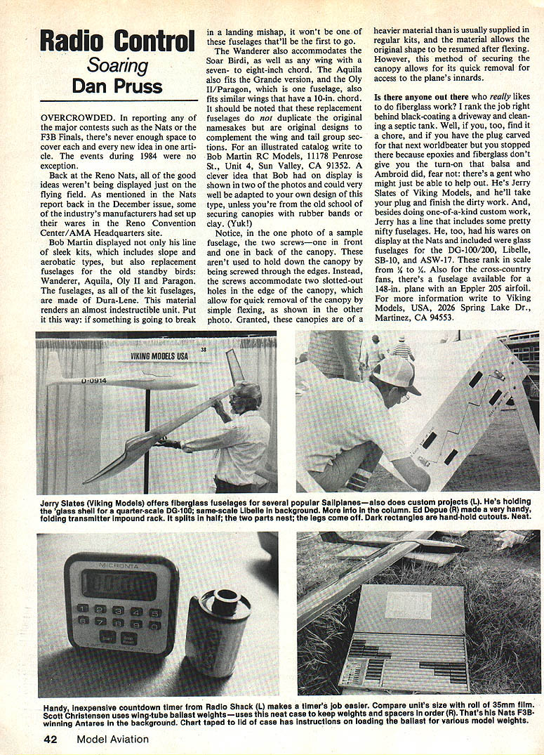 Radio Control Soaring Dan Pruss OVERCROWDED reporting major contests such Nats F3B Finals theres never enough space cover new idea arti cle events during 1984 no exception Back Reno Nats good ideas werent being displayed just flying field As mentioned Nats report back December issue some industrys manufacturers set up wares Reno Convention Center/AMA Headquarters site Bob Martin displayed line sleek kits includes slope aerobatic types also replacement fuselages old standby birds Wanderer Aquila Oly II Paragon fuselages kit fuselages made Dura-Lene material renders almost indestructible unit Put way something going break landing mishap wont fuselages thatll first go Wanderer also accommodates Soar Birdi well wing seven- eight-inch chord Aquila also fits Grande version Oly Il/Paragon fuselage also fits similar wings have 10-in chord should noted replacement fuselages duplicate original namesakes original designs complement wing tail group sec tions illustrated catalog write Bob Martin RC Models 11178 Penrose St Unit 4 Sun Valley CA 91352 clever idea Bob display shown two photos could very well adapted own design type unless youre old school securing canopies rubber bands clay Vuk Notice photo sample fuselage two screwsone front back canopy arent used hold down canopy being screwed through edges Instead screws accommodate two slotted-out holes edge canopy allow quick removal canopy simple flexing shown other photo Granted canopies heavier material usually supplied regular kits material allows original shape resumed after flexing However method securing canopy allows its quick removal access planes innards anyone out really likes fiberglass work rank job right behind black-coating driveway clean ing septic tank Well too find chore have plug carved next worldbeater stopped because epoxies fiberglass dont give turn-on balsa Ambroid did fear theres gent might just able help out Hes Jerry Slates Viking Models hell take plug finish dirty work besides doing one-of-a-kind custom work Jerry has line includes some pretty nifty fuselages too wares display Nats included glass fuselages DG-l00/200 Libelle SB-b ASW-17 rank scale / Also cross-country fans theres fuselage available 148-in plane Eppler 205 airfoil information write Viking Models USA 2026 Spring Lake Dr Martinez CA 94553 Jerry Slates Viking Models offers fiberglass fuselages several popular Salipianesalso does custom projects L Hes holding glass shell quarterscaie DG100 samescaie Libelle background Info column Ed Depue R made very handy folding transmitter Impound rack splits half two parts nest legs come off Dark rectangles handhold cutouts Neat Handy inexpensive countdown timer Radio Shack 1 makes timers job easier Compare units size roll 35mm film Scott Christensen uses wingtube ballast weightsuses neat case keep weights spacers order R Thats Nate F3B winning Antares background C hart taped lid case has instructions loading ballast various modei weights 42Model Aviation Back flying field Scott Christensen opened bag tricks show some neat ideas Although brand new ideas slick versions some old tricks first idea towhook just bolted piece hardwood bottom fuselage fixed unreleasable hooks secured way also continues up around wing-rod joiner-tube ties wing towhook towline during tow parts really straining course custom-made hook/clamp combina tion anyone hacksaw drill file should able fashion out aluminum Scott did Scotts other idea sometimes found form cluttered mess some drawer tool box old LSF/001 Ballast rods several-ounce increments kept neat box corresponding ballast-tube fillers also handily kept course wing-ballast units selected weight picked balance hollow wing tube filled sec tion wood dowel quick-reference chart Scott calculated used furnish all-up aircraft weights wing loadings Radio Shack can modelers Mecca Unusual types switches jacks other related RC hardware normally found neighborhood hobby shop can obtained shacks think want referred such went buy stopwatch sale would everything normal modeler would want know start stop reset play 16 bars Strausss Also Sprach Zarathustra just case has tendency sleep during CDs briefing Well luck would have sold Out another type watch caught eye Its countdown timer isnt really new about 15 bucks its affordable saw several F3B team selection finals too Its just gadgets can make life simpler Flying six-minute max Simply punch six-zero-zero readout will display 0600 Press start begin ning task watch counts off backwards time during high-pressured flight assistant can give exact time remaining readout going through arithmetic drawback once zero watch does start counting up again However does give off pulsat Continued page 145 y4EW THE DESIGNERS OF THE I4 RETRIEVER SPORT SCALE DESIGNED FOR 05 ELECTRIC POWER Three channels Bolt-on ieing 51k span 1s25 sq i2 os viti 7 cells OS motor/reducer YOUR SOURCE FOR QUIET FLIGHT SUPPLIES Optional virig configurations electric fuselage plans 65 7 oz/sqftwing loading Designed 12 v launches Modified E-193 airfoil ISYSTEMS Y U CORPORATION ONE WOOD LANEMALVERNPA19355 215644-6772 DEALER INQUIRIES INVITED February 198543 Bob Martin has Dura-Lene fuselages several Sailpianes available material strong nearly unbreakable Photo right shows retains canopy yet has quick access radio compartment slots canopy slip under heads screws $4495 AND THE PROPHET TWO METER COMPETITION SAILPLANE $5395 elevator throw Unless plan aerobatics need very little stage youre probably just trying fly two trim settings need know about minimum sink maxi mum glide angle Minimum sink will very slow flying speed just below stall gilder coming down slowest trim will use lift Maximum glide angle plane covering ground amount altitude lost will fair ly fast flying speed isthe trim used looking lift getting out areas sink gliders can see pick up speed feed down trim suddenly flatten out really move called getting step' want adjust elevator throw full up trim plane just starting stall mush out Minimum sin