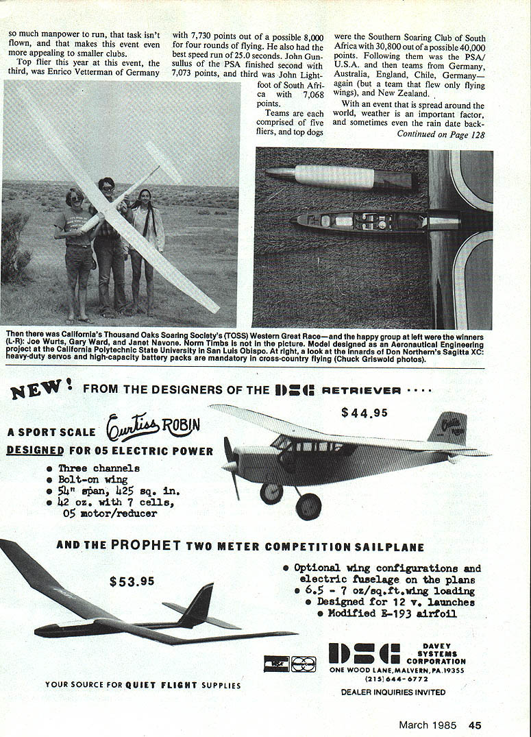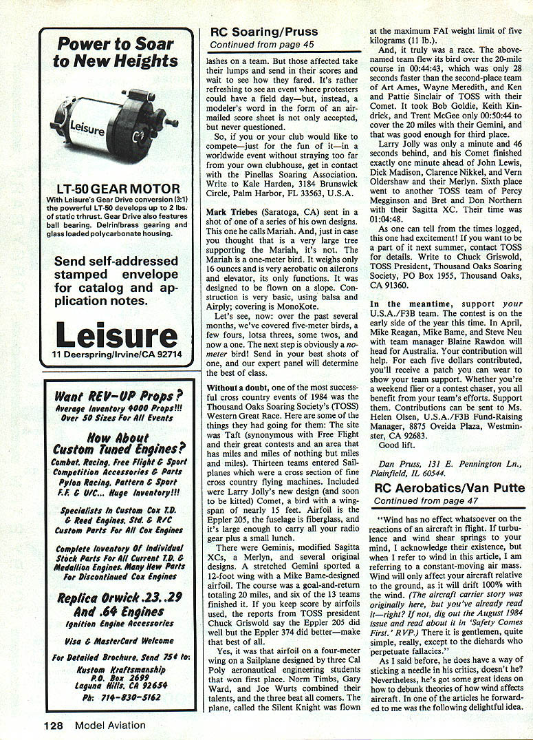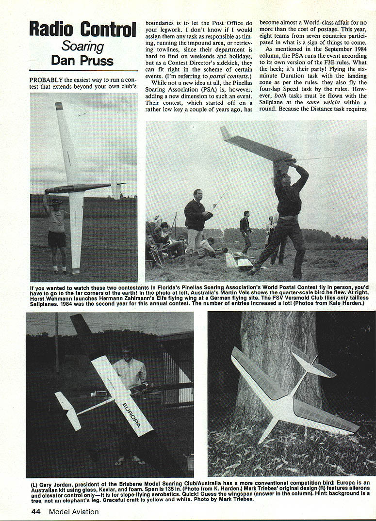Radio Control Soaring Dan Pruss PROBABLY easiest way run con test extends beyond own clubs boundaries let Post Office legwork dont know would assign task responsible tim ing running impound area retriev ing towlines since department hard find weekends holidays Contest Directors sidekick can fit right scheme certain events Im referring postal contests new idea Pinellas Soaring Association PSA however adding new dimension such event contest started off rather low key couple years ago has become almost World-class affair no cost postage year eight teams seven countries partici pated what sign things come As mentioned September 1984 column PSA runs event according its own version F3B rules What heck its party Flying sixminute Duration task landing zone per rules also fly four-lap Speed task rules ever both tasks must flown Sailplane same weight within round Because Distance task requires L Gary Jordan president Brisbane Model Soaring ClublAustralia has conventional competition bird Europa Australian kit using glass Keviar foam Span 135 Photo K Harden Mark Triebes orlglnai design R features ailerons elevator control onlyit slopeflying aerobatics Quick Guess wingspan answer column Hint background tree elephants leg Graceful craft yellow white Photo Mark Triebas 44 Model Aviation wanted watch two contestants Fioridas Pinellas Soaring Associations World Postal Contest fly p arson youd have go far corners earth photo left Australias Martin Vels shows quarter-scale bird flaw right Horst Wehmann launches Hermann Zahlmanns Elf flying wing Germ flying site FSV Versmold Club flies tailless Sallplanes 1984 second year annual contest number entries increased lot Photos Kale Harden much manpower run task isnt flown makes event appealing smaller clubs Top flier year event third Enrico Vetterman Germany 7730 points out possible 8000 four rounds flying also best speed run 250 seconds John Gun sullus PSA finished second 7073 points third John Lightfoot South Afri ca 7068 points Teams comprised five fliers top dogs Southern Soaring Club South Africa 30800 out possible 40000 points Following PSA USA teams Germany Australia England Chile Germany again team flew flying wings New Zealand event spread around world weather important factor sometimes rain date backContinued Page 128 Californias Thousand Oaks Soaring Societys TOSS Western Great Raceand happy group left winners LR Joe Wurts Gary Ward Janet Navone Norm Timbe picture Model designed Aeronauticai Engineering Caiifornia Polytechnic State University San Luis Obispo right iook innards Don Northerns Sagitta XC roject servos high-capacity battery packs mandatory cross-country flying Chuck Griswoid photos FROM THE DESIGNERS OF THE I4 RETRIEVER SPORT SCALE DESIGNED FOR 05 ELECTRIC POWER Three channels Bolt-on wing 5t span 1s25 sq 142 os vit 7 ceUs OS motor/reducer AND THE PROPHET TWO METER COMPETITION SAILPLANE $5395 4 YOUR SOURCE FOR QUIET FLIGHT SUPPLIES Optional wing configurations electric fuselage plans 65 7 oz/sqftwirag loading Designed 12 v launches Modified B-i 93 airfoil hin DAVEY ISYSTEMS U CORPORATION ONE wooo LANEMALVERNPA19355 215644-6772 DEALER INQUIRIES INVITED March 1985 45 ft $4495 RC Soaring Pruss Continued page 45 lashes team affected take lumps send scores wait see fared Its rather refreshing see event protesters could have field daybut instead modelers word form airmailed score sheet accepted never questioned So club would like competejust fun itin worldwide event straying too far own clubhouse get contact Pinellas Soaring Association Write Kale Harden 3184 Brunswick Circle Palm Harbor FL 33563 USA Mark Triebes Saratoga CA sent shot series own designs calls Mariah just case thought very large tree supporting Mariah its Mariah one-meter bird weighs 16 ounces very acrobatic ailerons elevator its functions designed flown slope Con struction very basic using balsa Airply covering MonoKote Lets s see now over past several months weve covered five-meter birds few fours lotsa threes some twos now next step obviously nometer bird Send best shots expert panel will determine best class Without doubt success ful cross country events 1984 Thousand Oaks Soaring Societys TOSS Western Great Race some things going site Taft synonymous Free Flight great contests area has miles miles nothing miles miles Thirteen teams entered Sailplanes cross section fine cross country flying machines Included Larry Jollys new design soon kitted Comet bird wing span nearly 15 feet Airfoil Eppler 205 fuselage fiberglass its large enough carry radio gear plus small lunch Geminis modified Sagitta XCs Merlyn several original designs stretched Gemini sported 12-foot wing Mike Bame-designed airfoil course goal-and-return totaling 20 miles six 13 teams finished keep score airfoils used reports TOSS president Chuck Griswold say Eppler 205 did well Eppler 374 did bettermake best Yes airfoil four-meter wing Sailplane designed three Cal Poly aeronautical engineering students won first place Norm Timbs Gary Ward Joe Wurts combined talents three beat comers plane called Silent Knight flown maximum FAI weight limit five kilograms 11 lb truly race abovenamed team flew its bird over 20-mile course 004443 28 seconds faster second-place team Art Ames Wayne Meredith Ken Pattie Sinclair TOSS Comet took Bob Goldie Keith Kin drick Trent McGee 005044 cover 20 miles Gemini good enough third place Larry Jolly minute 46 seconds behind Comet finished exactly minute ahead John Lewis Dick Madison Clarence Nikkel Vein Oldershaw Merlyn Sixth place went another TOSS team Percy Megginson Bret Don Northern Sagitta XC time 010448 As can tell times logged excitement want part next summer contact TOSS details Write Chuck Griswold TOSS President Thousand Oaks Soaring Society P0 Box 1955 Thousand Oaks CA 91360 meantime support USA/F3B team contest early side year time April Mike Reagan Mike Bame Steve Neu team manager Blame Rawdon will head Australia contribution will help five dollars contributed youll receive pa