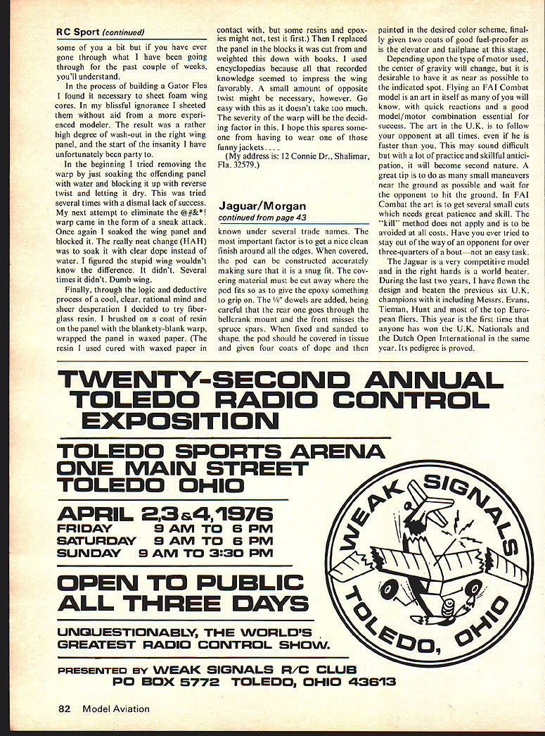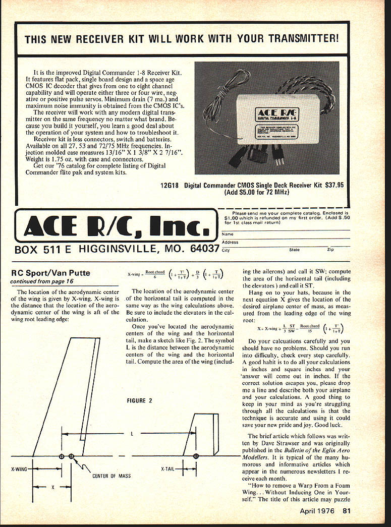 THE FINAL VOTE R/C Contest Board 1976-1977 competition rules came out just after sent last months column havent seen dig out January 1976 Model Aviation take peek pages 61-64 surface changes appear involve minor revisions Pattern sched ules renaming classes B C D Novice Advanced Expert Masters However closer examina tion shows maneuvers Novice Advanced classes must per formed prescribed upwind-downwind sequence will probably cause some people including little grief because have gotten used doing certain maneuvers particular direction no mat ter way wind blows changes Pattern schedules look good doubt anyone especially judges will mourn pass ing Figure Eight old Class schedule didnt qualify good maneuver because difficult judge uniformly new maneuvers Novice class will take some getting used because require something unusual fliers just getting Pattern flying Outside Loop maneuver will show stopper some fliers have seldom pushed elevator stick forward Beginner-type airplanes dont generally fly too well inverted because usually have substantial dihedral provide lateral stability airplane lot dihedral flown inverted dihedral destabilizing beginner dares try outside loop inverted flying type airplane soon decides its risky business pilot moves up beginners airplane better suited Pattern work will probably edgy about first few outside loops bit practice should cure other maneuver will also take some practice getting used Two-Point Roll However should lot easier get used outside loop Touch-and-Go maneuver has al ways problem regular flying field has 200-ft-wide 4000-ftlong runway seldom practice maneuver limited area Consequently runway contest 30 ft 150 ft tend clutch Needless say removal Touch-and-Go delight ed However thinking about Nonrolling Figure M its place brought back down again Four-Point Roll FAI Horizon tal Eight removed Advanced class difficult perform well easy judge two primary criteria maneuver selection Slow Roll Double Immelmann also meet criteria cant really complain about switch except personal level Four-Point Roll FAI Hori zontal Eight just become comfortable Cant have everything real criticism new Ad vanced Pattern inclusion TwoPoint Roll seems appropriate maneuver Novice class sufficiently difficult relative other maneuvers Advanced class Id like see Four-Point Roll put back pattern place Two-Point Roll Advanced class Expert pattern basically FAI pattern Non-rolling Figure M removal Eight-Point Roll Running Eight very few contests last year old Class C pattern flown should wel 4 ROOT CHORD r FIGURE 1 Ron Van Pulte Tom Mahon poses proudly vintage KGKovel/Grant 10-lb bird really performs OS 60 Schnuerle Original Brown Junior appeared MAN 1934 come change Master Pattern full FAI Pattern will probably con tinue most-used contests around country received very nice letter Kemp Bunting R/C Category Director Nats Kemp corrected statement two three fliers remaining near end Round 6 heavy winds hit said .. round D Pattern Qualifying can celled because longest line seven planes fly ince Site B longest line must have Site assumption lines nearly must have wrong Last month promised present technique calculating center mass location model Because us likes set up airplane differently calculated center mass should considered starting point test flying technique guarantees air plane will stable pitch maneuverability required after test flights center mass should moved aft calculated point technique accurate airplanes swept tapered both wings horizontal tails real limitation wing tail leading trailing edges straight technique set up monowing airplanes enough requests similar technique biplane airplanes Ill present later column Lets start computing aerody namic center wing Fig shows half swept wing no leading edge sweep dimension D will zero taper ratio T ratio tip chord root chord T tipehord root chord continued page 81 0 TIP CHORD -I 16 Model Aviation THIS NEW RECEIVER KIT WILL WORK WITH YOUR TRANSMITTER improved Digital Commander 1-8 Receiver Kit features flat pack single board design space age CMOS IC decoder gives eight channel capability will operate either three four wire neg ative positive pulse servos Minimum drain 7 ma maximum noise immunity obtained CMOS ICs receiver will work modern digital trans mitter same frequency no matter what brand cause build yourself learn good deal about operation system troubleshoot Receiver kit less connectors switch batteries Available 27 53 72/75 MHz frequencies jection molded case measures 13/16 X 1 3/8 X 2 7/16 Weight 175 oz case connectors Get 76 catalog complete listing Digital Commander flite pak system kits 12G18 Digital Commander CMOS Single Deck Receiver Kit $3795 Add $500 72 MHz [v32][b-1-10-1-10]] Please send complete catalog Enclosed W$100 refunded first order Add $ 50 1st class mail return N g EUU sine Address BOX 511 E HIGGINSVILLE MO 64037cty State Zip RC Sport/Van Putte continued page 16 location aerodynamic center wing given X-wing X-wing distance location aero dynamic center wing aft wing root leading edge FL X-WING x Root chord T D__ Xwing 6\l / 3 \lTI location aerodynamic center horizontal tail computed same way wing calculations above sure include elevators cal culation Once youve located aerodynamic centers wing horizontal tail make sketch like Fig 2 symbol L distance between aerodynamic centers wing horizontal tail Compute area wing includ FIGURE 2 /77 /1 CENTER OF MASS XTAIL ft--a] ] ing ailerons call SW compute area horizontal tail including elevators call ST Hang hats because next equation X gives location desired airplane center mass meas ured leading edge wing root L ST Root chord V X Xwisgy5~15 1I \ lT/ calcuations carefully should have no problems Should run difficulty check step carefully good habit calculations inches square inches answer will come out inches correct solution escapes please drop line describe both airplane calculations good thing keep mind youre struggling through calculations technique accurate us