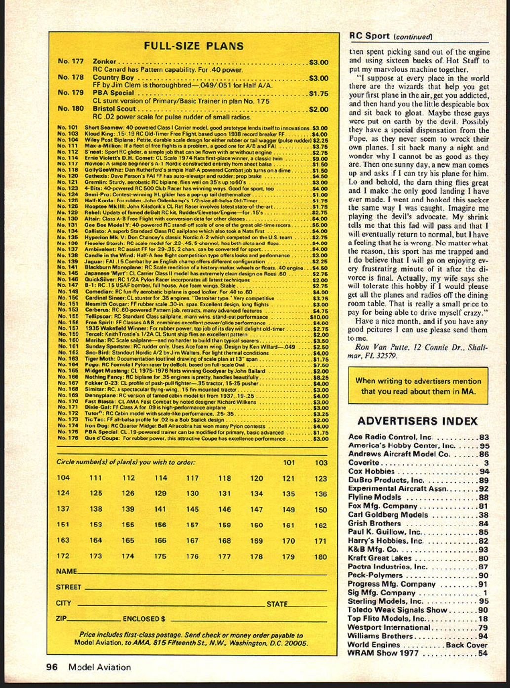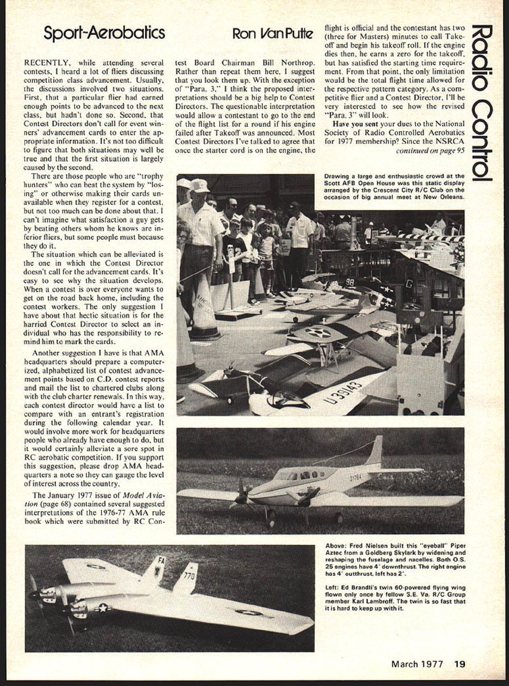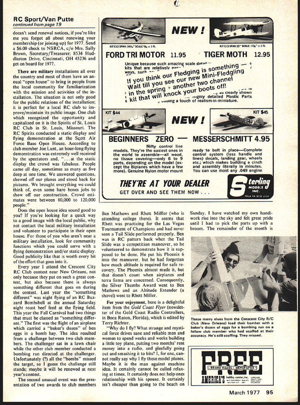 Sporl-Aerobahcs RECENTLY attending several contests heard lot fliers discussing competition class advancement Usually discussions involved two situations First particular flier earned enough points advanced next class hut hadnt done Second Contest Directors dont call event win ners advancement cards enter ap propriate information Its too difficult figure both situations may well true first situation largely caused second people trophy hunters can beat system los ing otherwise making cards un available register contest too much can done about cant imagine what satisfaction guy gets beating others knows ferior fliers some people must because situation can alleviated Contest Director doesnt call advancement cards Its easy see situation develops contest over everyone wants get road back home including contest workers suggestion have about hectic situation harried Contest Director select dividual has responsibility re mind him mark cards Another suggestion have AMA headquarters should prepare computer ized alphabetized list contest advance ment points based CD contest reports mail list chartered clubs along club charter renewals way contest director would have list compare entrants registration during following calendar year would involve work headquarters people already have enough would certainly alleviate sore spot RC aerobatic competition support suggestion please drop AMA head quarters note can gauge level interest across country January 1977 issue Model vialion page 68 contained several suggested interpretations 1976-77 AMA rule book submitted RC ConRon Van Putte test Board Chairman Bill Northrop Rather repeat suggest look up exception Para 3 think proposed inter pretations should big help Contest Directors questionable interpretation would allow contestant go end flight list round engine failed after Takeoff announced Most Contest Directors Ive talked agree once starter cord engine flight official contestant has two three Masters minutes call Take off begin takeoff roll engine dies earns zero takeoff has satisfied starting time require ment point limitation would total flight time allowed respective pattern category As com petitive flier Contest Director Ill very interested see revised Para 3 will look Have sent dues National Society Radio Controlled Aerobatics 1977 membership Since NSRCA continued page 95 March 1977 19 0 C 0 Drawing large enthusiastic crowd Scott AFB Open House static display arranged Crescent City R/C Club occasion big annual meet New Orleans Above Fred Nielsen built eyeball Piper Aztec Goldberg Skylark widening reshaping fuselage nacelles Both OS 25 engines have 4 downthrust right engine has 4 outthrust left has V Left Ed Brandlis twin 60powered flying wing flown once fellow SE Va R/C Group member Karl Lambroff twin fast hard keep up RC Sport/Van Putte continued page 19 doesnt send renewal notices youre like forgot about renewing membership joining up 1977 Send $600 check NSRCA c/o Mrs Sally Brown Secretary/Treasurer 8534 Hud dleston Drive Cincinnati OH 45236 get board 1977 military installations over country have an nual open house bring people local community familiarization mission activities stallation situation good public relations installation perfect local RC club im prove/maintain its public image club recognized opportunity capitalized Spirits St Louis RC Club St Louis Missouri RC Spirits conducted static display flying demonstration Scott Air Force Base Open House According club member Joe Lunt hour-long flying demonstration extremely well received spectators tic display crowd fabulous People came day sometimes five deep time answered questions showed off planes stood back pictures brought everything could think some bare bones jobs show off construction Crowd esti mates between 80000 120000 people Does open house idea sound good youre looking quick way good image local public contact local military installation volunteer participate open house arent near military installation look community functions could serve flying demonstration and/or static display Good publicity like worth bit effort goes year attend Crescent City RC Club contest near New Orleans because put such great con test also because always something different goes during contest Last year something different night flying RC Buz zard Bombshell annual Saturday night roast beef feed flying field year Fall Carnival two things must classed something differ ent first flight airplane carried bakers dozen hen eggs bomb bay idea resulted challenge between two club mem bers challenger sat lawn chair other club member conducted bombing run directed challenger Unfortunately s missed target guess challenge still stands maybe will renewed next years contest second unusual event pres entation two awards club members NEW FORD TRI MOTOR 1195 Unique because such amazing scale det kits relatively p ethifl W8Y5 suh redin iSSO~ d1in rine t yOU tIifl~ our e tWO ctia Wait ti yOU se anotber bootS oit sprifl ocW yoUV clearly shown Wt tbat WIIUUIng touiii ignly detailed Plastic Parts realism-in-miniature isiiiNNERS ZERO Nifty control line models Theyre easiest ones world assembleall wood no tissue coveringonly 6 9 parts depending model ex cept Biplanes have few Genuine Nylon motor mount NEW MESSERSCHMITT 495 ready bolt placeComplete control system less handle lines decals landing gear wheels etc makes building cinch assembly literally minutes can use 049 engine THEYRE AT YOUR DEALER GET OVER AND SEE THEM NOW Ben Mathews Rhett MillIer attending college seems Rhett practicing Las Vegas Tournament Champions never seen Tail Slide performed properly Ben RC pattern back Tail Slide competition maneuver volunteered demonstrate sup posed done put Phoenix 6 maneuver forgotten much altitude required safe re covery Phoenix almost made doesnt count airplanes terra firma concerned Consequently Silver Thumbs Award went Ben Mathews Altitude Extender shovel went Rhett Miller enjoyment delightful item Gold Coast Flyer newslet ter Go