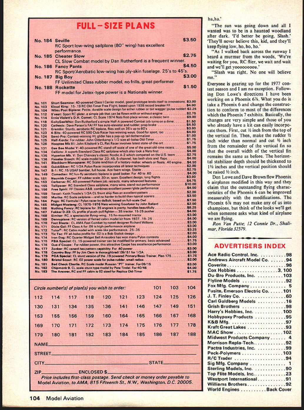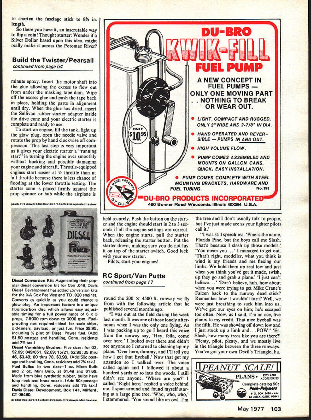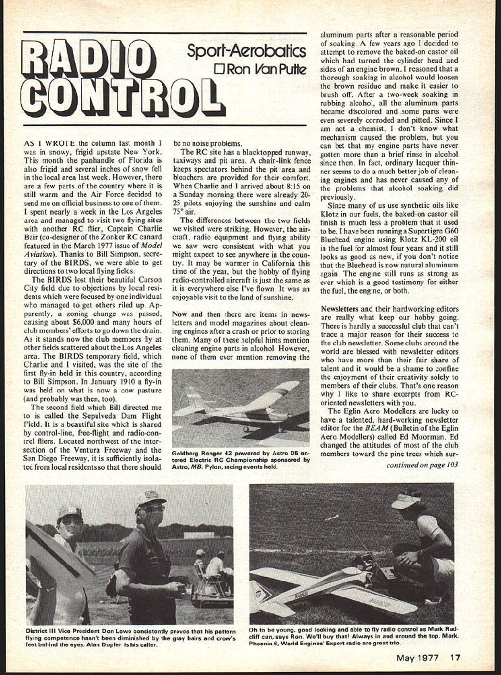 B Spori-Aerobalics ORon VanPutle AS WROTE column last month snowy frigid upstate New York month panhandle Florida also frigid several inches snow fell local area last week However few parts country still warm Air Force decided send official business spent nearly week Los Angeles area managed visit two flying sites another RC flier Captain Charlie Bair co-designer Zonker RC canard featured March 1977 issue Model Aviation Thanks Bill Simpson secre tary BIRDS able get directions two local flying fields BIRDS lost beautiful Carson City field due objections local resi dents focused individual managed get others riled up Ap parently zoning change passed causing about $6000 hours club members efforts go down drain As stands now club members fly other fields scattered about Los Angeles area BIRDS temporary field Charlie visited site first fly-in held country according Bill Simpson January 1910 fly-in held what now cow pasture probably too second field Bill directed called Sepulveda Dam Flight Field beautiful site shared control-line free-flight radio-con trol fliers Located northwest inter section Ventura Freeway San Diego Freeway sufficiently isola ted local residents should no noise problems RC site has blacktopped runway taxiways pit area chain-link fence keeps spectators behind pit area bleachers provided comfort Charlie arrived about 815 Sunday morning already 2025 pilots enjoying sunshine calm 750 air differences between two fields visited striking However air craft radio equipment flying ability saw consistent what might expect see anywhere coun try may warmer California time year hobby flying radio-controlled aircraft just same everywhere else Ive flown enjoyable visit land sunshine Now items news letters model magazines about clean ing engines after crash prior storing helpful hints mention cleaning engine parts alcohol However ever mention removing aluminum parts after reasonable period soaking few years ago decided attempt remove baked-on castor oil turned cylinder head sides engine brown reasoned thorough soaking alcohol would loosen brown residue make easier brush off After two-week soaking rubbing alcohol aluminum parts became discolored some parts severely corroded pitted Since am chemist dont know what mechanism caused problem can bet engine parts have never gotten brief rinse alcohol since fact ordinary lacquer thin ner seems much better job clean ing engines has never caused problems alcohol soaking did previously Since us use synthetic oils like Klotz fuels baked-on castor oil finish much less problem used have running Supertigre G60 Bluehead engine using Klotz KL-200 oil fuel almost four years still looks good new dont notice Bluehead now natural aluminum again engine still runs strong ever good testimony either fuel engine both Newsletters hardworking editors really what keep hobby going hardly successful club cant trace major reason success club newsletter Some clubs around world blessed newsletter editors have fair share talent would shame confine enjoyment creativity solely members clubs Thats reason like share excerpts RC oriented newsletters Eglin Aero Modellers lucky have talented hard-working newsletter editor BEAMBulletin Eglin Aero Modellers called Ed Moorman Ed changed attitudes of club members toward pine trees sur con tinued page 103 May1977 17 Goldberg Ranger 42 powered Astro 05 en tered Electric RC Championship sponsored Astro MB Pylon racing events held District Ill Vice President Don Lowe consistently proves pattern flying competence hasnt diminished gray hairs crows feet behind eyes Alan Dupler caller Oh young good looking able fly radio control cliff can says Ron Well buy Always around top Mark Phoenix 6 World Engines Expert radio great trio shorten fuselage stick 8 length So have inscrutable way flip coin Thought starter Wonder Silver Dollar based upon idea might really make across Potomac River Build Twister/Pearsall continued page 54 minute epoxy Insert motor shaft glue allowing excess flow out under masking tape dam Wipe off excess glue push tape back place holding parts alignment until dry glue has dried insert Sullivan rubber starter adapter inside drive cone electric starter complete ready use start engine fill tank light up glow plug open needle valve rotate prop hand clockwise off com pression last step very important gives electric starter running start turning engine over smoothly bucking possibly damaging engine aircraft Throttle-equipped engines start easier ttle full throttle because less chance flooding lower throttle setting starter cone placed firmly against prop spinner hub airplane Diesel Conversion Kit Augmenting pop ular diesel conversion kit Cox 049 Davis Diesel Development has added conversion kits hA Cox Pee Wee TD 020 engines Converts quickly could change glow plug An important feature unique fluorocarbon disc allows easy adjust able timing full power range 6 x 3 props 7-8000 rpm down 3000 rpm Fuelproofing requiredideal scale ships old-timers payload just fun Price $995 including /2 pint Diesel Power fuel Add $150 postage handling Conn residents add 7% tax Diesel Varnishing Brushes Five sizes 02 $269 049/051 $269 15/21 $298 35 thru 46 $349 60 thru 78 $398 Add 50c post age handling Conn residents add 7% tax Fuel Bulbs two sizesi oz Micro Bulb 2 oz Mini Bulb $149 $169 Made blue synthetic rubber bulbs have long neck brass nozzle Add SOc postage handling Conn residents add 7% tax Davis Diesel Development Box 141 Milford CT 06460 DU-BRO UULLLL FUEL PUMP N EW CONCEPT IN FUEL PUMPS ONLY ONE MOVING PART ING TO BREAK OR WEAR OUT 0 0 0 LIGHT COMPACT AND RUGGED ONLY 2 WIDEAND 2-7/8 INDIA HAND OPERATED AND REVER SIBLE S IN AND OUT HIGH VOLUME FLOW PUMP COMES ASSEMBLED AND MOUNTS ON GALLON CANS QUICK EASY INSTALLATION PUMP COMES COMPLETE WITH STEEL MOUNTING BRACKETS HARDWARE AND FUEL TUBINGNo191 BRO PRODUCTS INCORPORATED 480 Banner Road Wauconda IllinoIs 60084 USA held securely Push button start er engine should start 2 3 sec onds engine setting