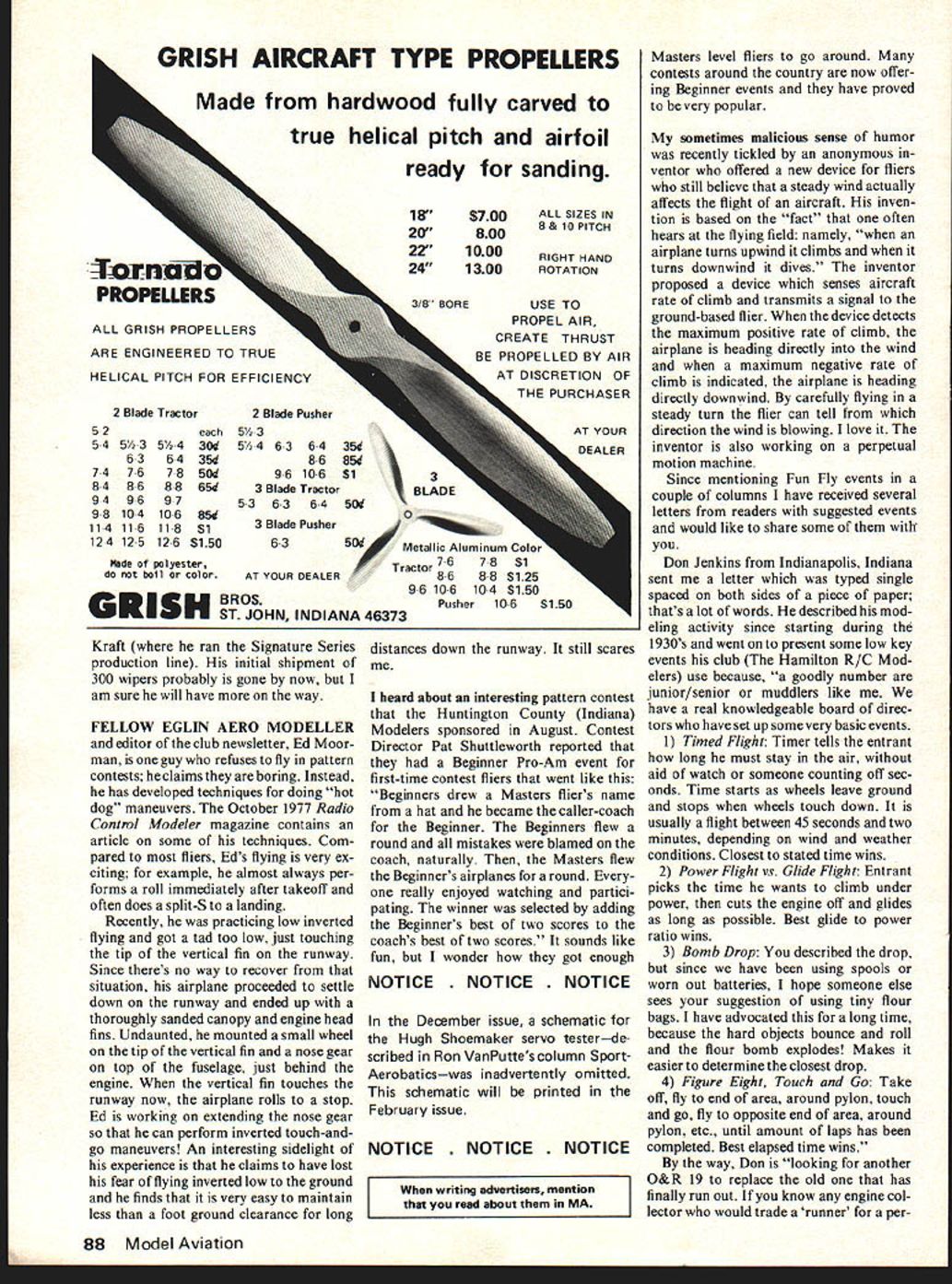 [IIiSporFAerobatics EJRon Van Pulte ONCE IN new product tech nique comes out really shakes up RC hobby development digital proportional such advancement Still other new products techniques may quite earthshaking promise solid advancement far reaching effects What call Giezen danner potentiometer wiper assembly new potentiometer wiper developed Bruno Giezendanner Switzerland RC aero batic world champion 1969 1971 Precision aerobatic competition requires extremely accurate reliable servo oper ation severe environment characterized high vibration levels heavy g loadings Most pattern fliers have discovered servo potentiometer wear biggest problems must contend maintaining competition airplanes potentio meter wiper element begins wear servo gets nervous centering unrelia ble Some pattern fliers have found must clean lubricate replace potentiometer elements ten flights order remain competitive problem caused beryllium copper potentiometer wiper used servos wiper spring loaded make good electrical contact potentiometer element friction tween wiper element causes relatively soft carbon element wear sufficient wear has occurred servo thinks several different outpUt arm positions electrically same results nervous action and/or poor centering servo What Bruno Giezendanner has done develop new wiper assembly cludes small piece material acts interface between wiper potentiometer element interface ma terial tiny truncated cone fits small hole wiper spring force between wiper assembly ele ment keeps conical interface coming out hole new wiper assembly cuts potentiom eter element wear minimum servo maintenance need done after hun dreds flights instead tens flights Some pattern fliers have claimed no detect able potentiometer element wear after 200 flights Regardless actual long-term performance new product has clearly demonstrated can make aircraft system maintenance lot easier Giezendanner potentiometer wiper assembly being distributed coun try Pro Line Electronics 10632 N 21st Ave Phoenix AZ introduced servos October 14 Pro Line also has replacement wipers $280 R/C South Route 3 Box 43 Nims Lane Pensacola FL 32504 also has Giezendanner wiper $300 apiece R/C Continued page 87 January 1978 21 Among past champions World Championships Springfield Bruno Giezandanner won 1969 1971 also Swiss champ 10 times ST 60-powered 63in Scorpion its distinctive wing planform designed Bruno brother Emil Own electric retracts PeckPolymers Mini-Bell real bell-ringer 02 power 1/3-scale version Goldberg Senior Falcon Liberty Bell Span 26 two- three-channel radio Japanese team manager just autographed World Championships official programa popular customwhen picture snapped Sleek looking model ready box belongs Okumura fundamental items Transmitter Tests First obvi ous Try switch knob pushbutton control stick trim lever find out doing what should take system outside perform range check described manual came system general dislike range checks cover less about 50 feet ground range because its too hard detect changes shorter ranges have systems calls 9- 10-foot ground range test antenna transmitter collapsed much possible antenna disap pears inside transmitter case test first section pulled way out Measure ground range terms paces length stride walking normally See last months column additional details Next charge transmitter pack fully extend antenna full length note time turn transmitter night wont shooting someone down its raining snowing Note output meter reading Now go something else Check output meter hour Note time falls half-scale calculate elapsed time new system operates 4 hours can expect moderately-used system drop about 3 hours after 5 years happens buy yourself new transmitter battery pack time shortens much less 5 years probably have least shorted cell pack should replaced Recharge transmitter set aside Receiver Servo Tests testing transmitter should have noticed servos jumping sticking running noticeably slower others find mark piece tape description prob lem stick servo Try swapping servos around prove trouble servo transmitter receiver have servo tester can help pinpoint troubles Repairs matter deciding whos going ityou factory local service center event convinced receiver needs retuning might check circuit discover two coils output end cir cuit ones likely need adjustment antenna coils rarely shift enough warrant readjustment Make tuning wand like described page 12 September 1977 column tune best ground range very important point about retun ing no value attempting retune receiver being disturbed noisy servo have jittery servo probable cause loose dirty wiper potentiometer feedback potentiometer electrical noise results such condition can easily cut ground range half Without getting technical about reason range reduction AGC Automatic Gain Con trol action within receiver response servo noise Therefore use good servos tuning Receiver Battery Tests subject has done death recent years Buy borrow battery analyzer test battery pack performance 25% below normal find out fix replace pack new battery pack cheapest insurance can buy continued happy flying Summary discussion has delib erately kept very simple just convince you can will perform simple maintenance chores described above guarantee will fly longer better next year have fun doing dont have electron ics technician take proper care equipment George Myers 70 Froehlich Farm Rd Hicksville NY 11801 RC Aerobatics/VanPutte continued page 21 South run Steve Helms well known pattern flier out standing work did Pro Line January1978 87 5MUF-L-ITSERIESNEW PRODUCTS ISTON SETTING TOOL ST FOR EVERY CLUB / MUFFLER/SIh CAR MUFFLER K& B 35ccuiienuwiC CLEANER21 QT 16500 Mufflers s zeENGINE MOUNTS Schnue le09 15 379NOTE cog r1e1SK4B 459SEE YOUR 1925395DEALER FOR 2940489PRICE OF 6080859MOUNT FOR YOUR ENGINE 1150to1795FACTORYFOR NOSE GEARSOR SEND TO CALIJMET SERIES MUFFLERS BATTERY CHARGER See yir dealer no dealer 10100 convenient order direct SCALE INSTRUMENT KITSSer 25C ccxtJet
