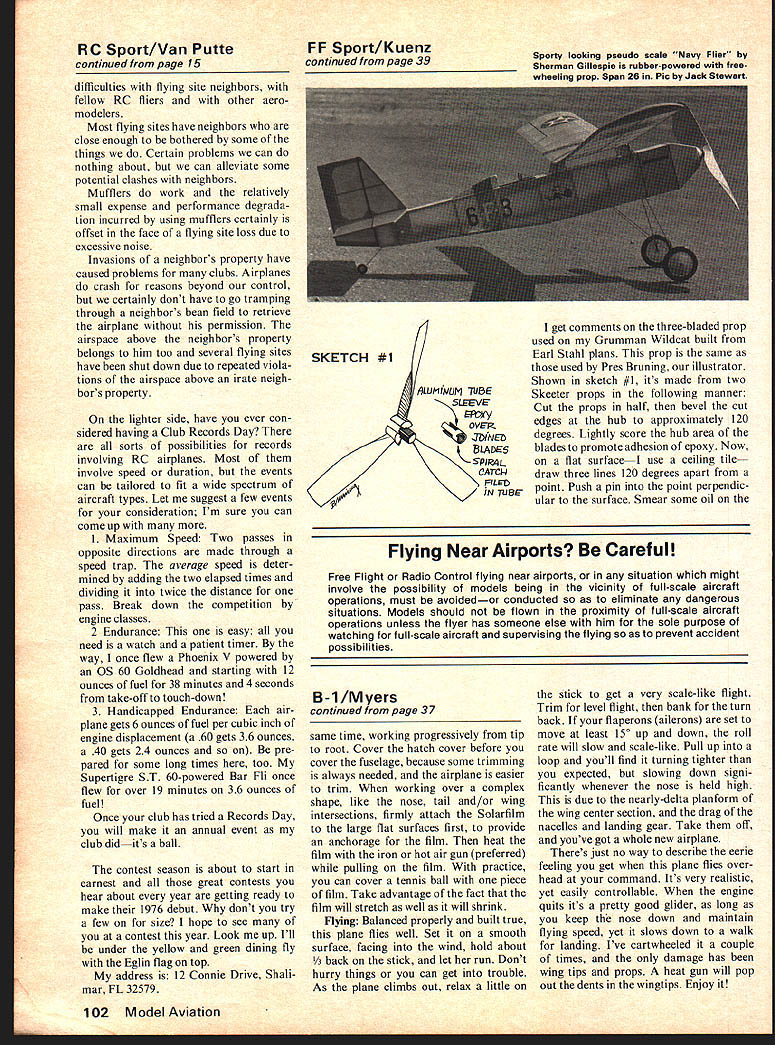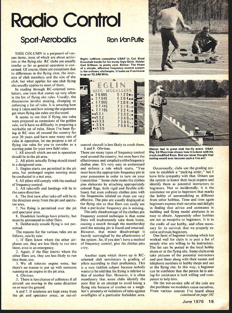 Radio Control Spori-Aerobatics THIS COLUMN potpourri var ous items about activi ties flying site RC clubs usually similar far general operation con cerned course exceptions due differences flying sites inter ests club members size club what applies club flying site usually applies reading through RC-oriented news letters item comes up very often list flying site rules Usually discussions involve making changing enforcing list rules amazing long takes strong arguments get flying site rules discussed seems flying site rules prepared extensions golden rule wed have no difficulty preparing workable set rules Since Ive fly ing RC sites around country over 20 years have seen sets rules operation let propose set flying site rules consider starting point own field rules 1 All aircraft operation should pit area 2 All pilots actually flying should stand designated area 3 Engine starts permitted pit area prolonged engine running must conducted test area 4 All pilots will comply method frequency control 5 All take-offs landings will same direction 6 The first turn after take-off will direction away pit specta tor area 7 No flying permitted over pit spectator area 8 Deadstick landings have priority must announced other fliers 9 Deliberately unsafe flying per mitted reasons various rules follows rule rule 1 If fliers know other air planes less likely run emergency 2 Again flier knows other fliers less likely run too 3 We tolerate engine noise theres no reason put up someone running-in engine pit area 4 Obvious 5 There less chance collisions aircraft moving same direction near ground 6 7 airplanes kept away pit spectator areas out-ofRon Van Putte Right LeMans competitor USAF Col Shad Dvorchak heads trusty Ugly Stick Holder Carl Gillham pretty cool Below Heart simple effective frequency control system ordinary clothespin looks someone upon 72240 MHz control aircraft less likely crash 8 9 Obvious types frequency control used around country have effectiveness simplicityofthefrequency clothes pins Its very easy understand enforce rule starts must have appropriate frequency pin possession order turn transmitter Some clubs make clothes pins elaborate attaching appropriately colored flags both rigid flexible rib bons ordinary clothes pins frequencies labeled very effective pins usually displayed flying site fliers can easily see particular frequency pin missing disadvantage clothes pin frequency control technique some fliers will inadvertently take home causing search through membership until missing pin found returned However minor disadvantage heavily outweighed effectiveness system So dont have method frequency control give clothes pins try Another topic shows up RC oriented club newsletters grading pilots according proficiency very ticklish subject because nobody wants told flying inferior another flier However often mandatory some clubs identify poor flier attempt avoid losing flying site because crashes neigh bors property violations rules against overflights particular forbidden area Occasionally clubs use grading sys tem establish pecking order have little sympathy Others use system honor local experts identify potential instructors beginners incidentally assistance give beginners marks hobby aeromodeling different other hobbies Time time again beginners express surprise delight finding advice assistance building flying model airplanes easy obtain Apparently other hobbies receptive beginners credit hobby often neces sary its survival properly re ceive train beginners facet beginner training has worked well clubs post list people willing instructors list can posted local hobby shops flying site Some clubs take pictures potential instructors post along names telephone numbers hobby shops out flying site way beginner can confident person ask ing assistance both willing com petent help him not-so-nice side coin problems modelers cause ourselves various sources Ive heard about continued page 102 June1976 15 U Slalom taxi great club funfly event USAF Mal Ed Moorman shows done much modified Kaos Bet never thought taxiing would ever become such fine art RC Sport/Van Putte continued page 15 difficulties flying site neighbors fellow RC fliers other aero modelers Most flying sites have neighbors close enough bothered some things Certain problems can nothing about can alleviate some potential clashes neighbors Mufflers work relatively small expense performance degrada tion incurred using mufflers certainly offset face flying site loss due excessive noise Invasions neighbors property have caused problems clubs Airplanes crash reasons beyond control certainly dont have go tramping through neighbors bean field retrieve airplane permission airspace above neighbors property belongs him too several flying sites have shut down due repeated viola tions airspace above irate neigh bors property lighter side have ever con sidered having Club Records Day sorts possibilities records involving RC airplanes Most involve speed duration events can tailored fit wide spectrum aircraft types Let suggest few events consideration Im sure can come up 1 Maximum Speed Two passes opposite directions made through speed trap average speed deter mined adding two elapsed times dividing twice distance pass Break down competition engine classes 2 Endurance easy need watch patient timer way once flew Phoenix V powered OS 60 Goldhead starting 12 ounces fuel 38 minutes 4 seconds take-off touch-down 3 Handicapped Endurance air plane gets 6 ounces fuel per cubic inch engine displacement 60 gets 36 ounces 40 gets 24 ounces pre pared some long times too Supertigre ST 60-powered Bar Fli once flew over 19 minutes 36 ounces fuel Once club has tried Records Day will make annual event club didits ball contest season about start earnest great contests hear about year getting ready make 1976 debut dont try few size hope see contest year Look up Ill under yellow green dining fly Eglin flag top address 12 Connie Drive Shahmar FL 32579 FF Sport/Kuenz continued 