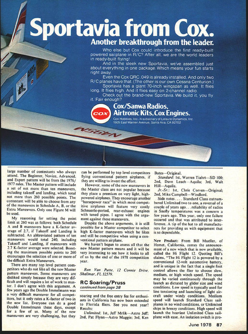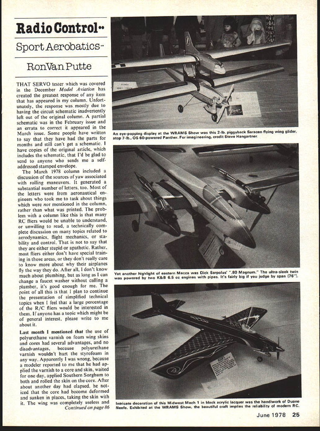 Radio Control Sport Aerobatics RonVan Putte THAT SERVO tester covered December Model Aviation has created greatest response item has appeared column Unfort unately response mostly due having circuit schematic inadvertently left out original column partial schematic February issue errata correct appeared March issue Some people have written say have parts months still cant get schematic have copies original article includes schematic Id glad send anyone sends selfaddressed stamped envelope March 1978 column included discussion sources yaw associated rolling maneuvers generated substantial number letters too Most letters aeronautical en gineers took task about things mentioned column rather what printed prob lem column like RC fliers would unable understand unwilling read technically com plete discussion topics related aerodynamics flight mechanics sta bility control say either stupid apathetic Rather fliers either dont have special train ing areas dont really care know about airplanes fly way After dont know much about plumbing long can change faucet washer calling plumber its good enough point plan continue presentation simplified technical topics feel large percentage R/C fliers would interested anyone has topic might general interest please write about Last month mentioned use polyurethane varnish foam wing skins cores several advantages no disadvantages because polyurethane varnish wouldnt hurt styrofoam way Apparently wrong because modeler reported ap plied varnish core skin waited day applied Southern Sorghum both rolled skin core After about another day elapsed iced core become deformed sunken places taking skin wing completely useless Continued page 86 June 1978 25 An eye-popping display WRAMS Show 2-lb piggyback Saracen flying wing glider atop 7-lb. OS 60-powered Panther imagineering credit Steve Hangartner Yet another highlight eastern Mecca Dick sarpolus u Magnum ultra-sleek twin powered two K&B 65 cc engines pipes Its fairly big judge span 76 Intricate decoration Midwest Mach 1 black acrylic lacquer handiwork Duane Neefe Exhibited WRAMS Show beautiful craft implies reliability modern RC came FAST Club Southern California $14124 $45000 sale airplane neckties made Dolly Wischer Three color patches being sold support 1978 Scale Team Price $150 three $400 available Bob Underwood 4109 Concord Oaks Dr St Louis MO 63128 Scale Documentation Source Gene Thomas Classic Models has come up unprecedented innovation documentation booklets fur nished kits Heath Parasol Heath Baby Bullet Church Midwing kits will made two sizes Peanut 1 scale 3 scale kit plane will follow booklets contain 3-view drawings photos cutaways color schemes detail sketches showing ternal structure Also included brief history planes booklets available separately $200 Classic Models PO Box 681 Melville NY 11746 Ready made documentation would make life too easy modelers Bob Wiseher Ri 1 S-221 Lap/iam Peak Road Delafield WI 53018 R C Aerobatics VanPutte continued page 25 varnish purchased has solvent will destroy foam covered too soon because core looked perfect ready cover day af ter painted polyure thane varnish have no problems Sears polyurethane varnish no matter soon wing skin applied after using varnish So suggest either us ing Sears polyurethane varnish testing other brands scrap foam before trying wing word out Southern R/C products going stop pro duction balsa fuselage kits due high price and/or unavailability quality balsa Pensacola Florida-based firm will expand fiberglass fuselage kit line now includes Rhett Millers Compensator Steve Helms Bootlegger Ron Chidgeys Tiger Tail Three hope also produce glass fuselage-foam wing verision Alley Kat because consider best intermediate trainer-sport airplane designs ever produced new Master class pattern rules have almost everyone involved Master pattern somewhat confused emotional Some competitors downright incensed over dramatic change rules caught everyone surprise Others delighted bright prospects see competition class new rules probably neither good nor bad currently being viewed big problem faces contest directors competitors infant contest season What now have already received contest flyers several clubs announce will use 1976/1977 rules classes attitude makes sense since rules decisions regarding what pattern will flown Expert Master class com petitors hasnt made Contest Board time written other hand some contest direct ors recognizing some form new FAI Masters pattern will ap proved AMA competition year have decided use modified schedule am contest director Jim Kirkland Memorial contest sched uled May 6 7th vacillating over approach use After long telephone call Don Lowe present Paris new pattern formulated decided use modified form new pattern Don swung argument favor new pattern admitting cant convince old friend use new pattern can hope convince stranger use Kirkland Memorial has always used abbreviated patterns order get least four rounds competition 86 Model Aviation discarded Apparently brand polyurethane large number contestants always attend Beginner Novice Advanced Expert pattern will 1976/ 1977 rules Master pattern will include set ten maneuvers including takeoff landing total 260 possible points contestant will able choose maneuvers Schedule B Extra Maneuvers Only Figure M will used reasoning setting point limit 260 follows both Schedule B maneuvers have K-factor av erage 27 Takeoff Landing subtracted An abbreviated pattern ten maneuvers would total 240 including Takeoff Landing maneuvers 27 K-factor average selected Boost ing maximum possible points 260 encourages selection difficult Extra Maneuvers top level pattern com petitors like new Master pattern maneuvers Some maneuvers disliked simply because very dif ficult will require lot work mas ter dont agree argument few years ago Double lmmelmann very difficult maneuver compet itors rates K-factor two new list Everyone can good Double lmmelmann days except few us new maneuvers very challenging can 