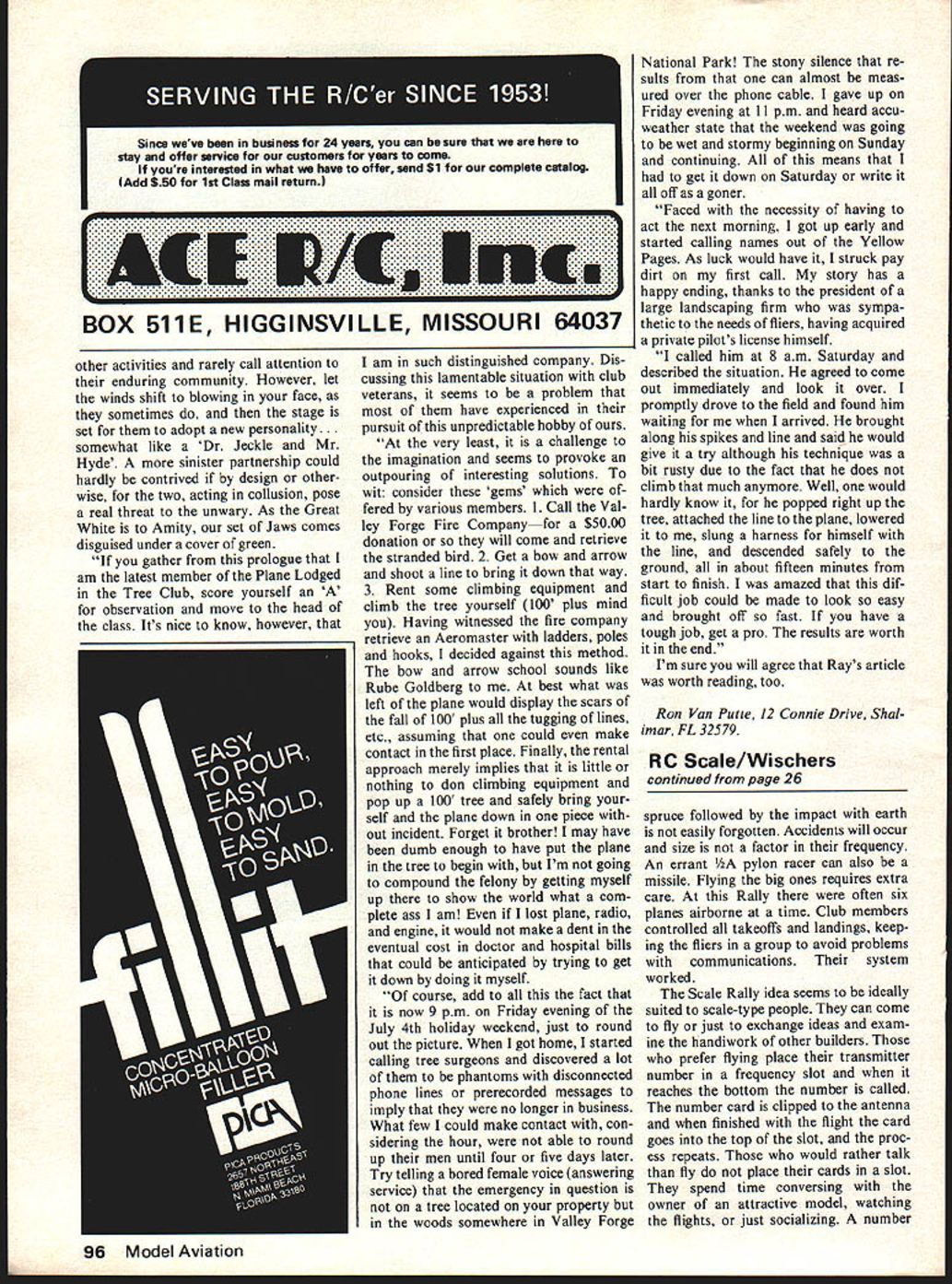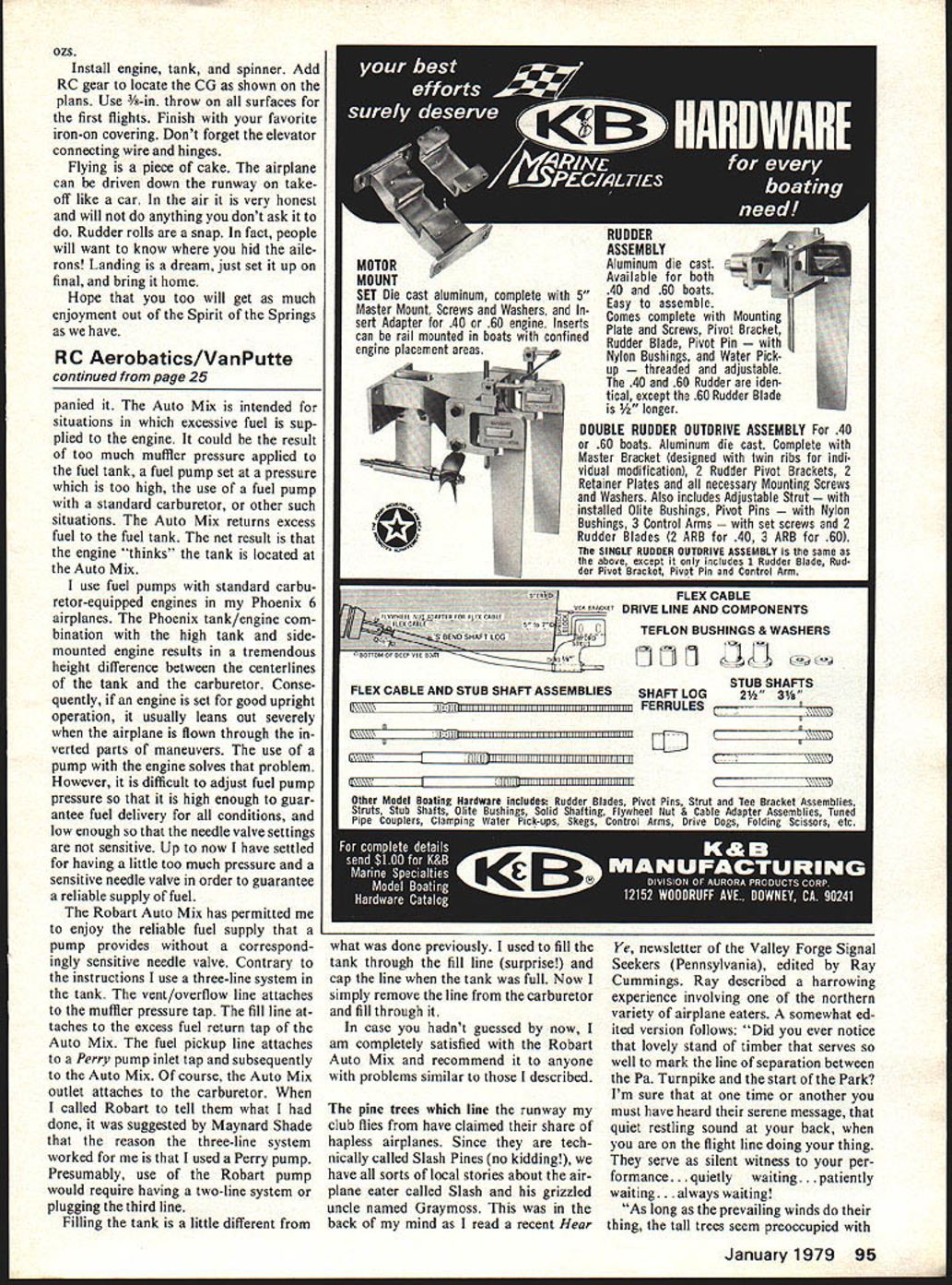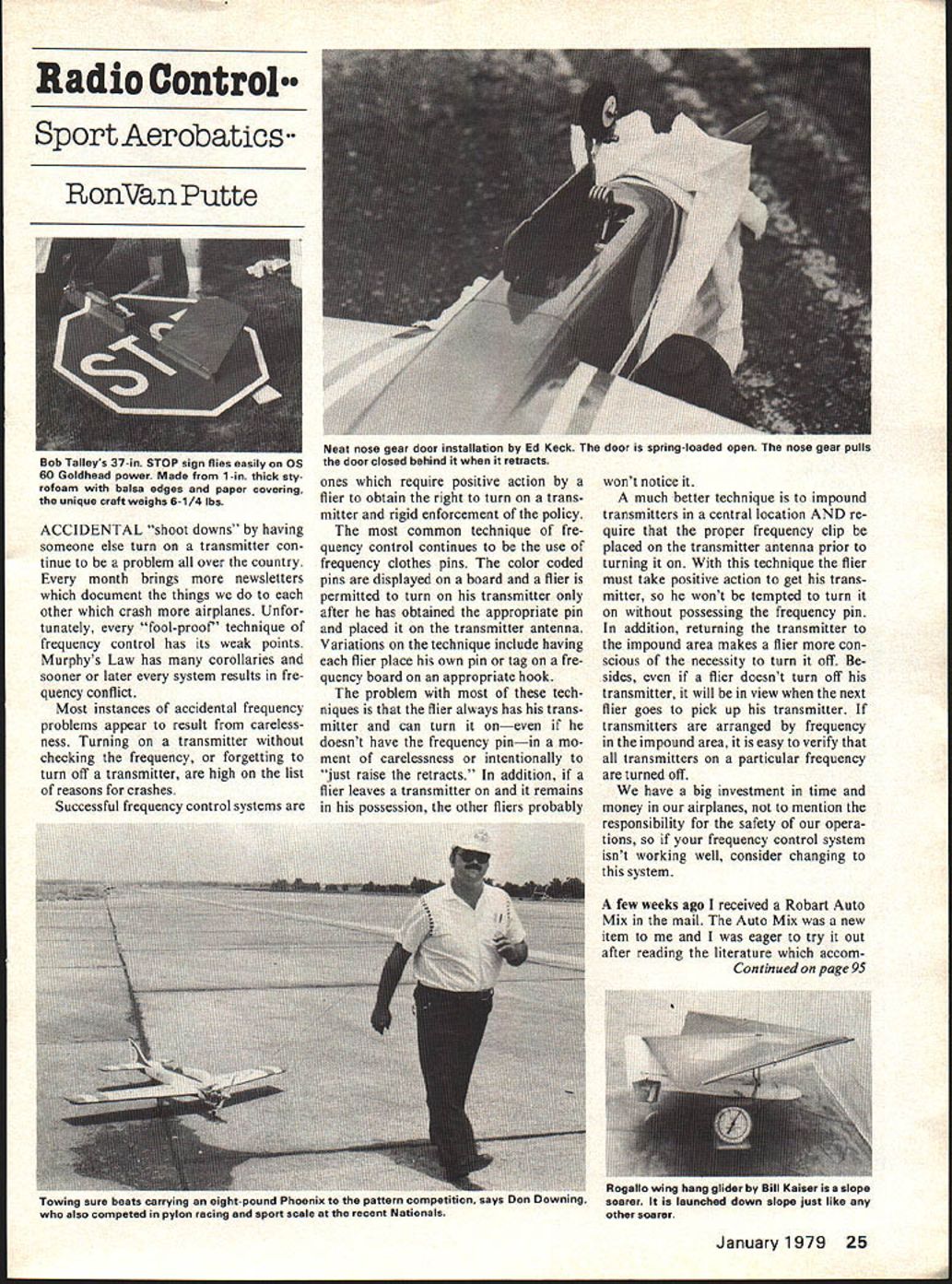 Radio Control Sport Aerobatics RonVan Putte ACCIDENTAL shoot downs having someone else turn transmitter con tinue problem over country month brings newsletters document things other crash airplanes Unfor tunately fool-proof technique frequency control has its weak points Murphys Law has corollaries sooner later system results fre quency conflict Most instances accidental frequency problems appear result careless ness Turning transmitter checking frequency forgetting turn off transmitter high list reasons crashes Successful frequency control systems ones require positive action flier obtain right turn trans mitter rigid enforcement policy common technique fre quency control continues use frequency clothes pins color coded pins displayed board flier permitted turn transmitter after has obtained appropriate pin placed transmitter antenna Variations technique include having flier place own pin tag fre quency board appropriate hook problem tech niques flier always has trans mitter can turn oneven doesnt have frequency pinin mo ment carelessness intentionally just raise retracts addition flier leaves transmitter remains possession other fliers probably wont notice much better technique impound transmitters central location AND re quire proper frequency clip placed transmitter antenna prior turning technique flier must take positive action get trans mitter wont tempted turn possessing frequency pin addition returning transmitter impound area makes flier con scious necessity turn off sides flier doesnt turn off transmitter will view next flier goes pick up transmitter transmitters arranged frequency impound area easy verify transmitters particular frequency turned off have big investment time money airplanes mention responsibility safety opera tions frequency control system isnt working well consider changing system few weeks ago received Robart Auto Mix mail Auto Mix new item eager try out after reading literature accom Continued page 95 January 1979 25 Bob Talleys 37-in STOP sign flies easily OS 60 Goldhead power Made 1-in thick sty rofoam balsa edges paper covering unique craft weighs 6-1/4 lbs Neat nose gear door installation Ed Keck door spring-loaded open nose gear pulls door closed behind retracts Towing sure beats carrying eight-pound Phoenix pattern compe also competed pylon racing sport scale recent Nationals Rogallo wing hang glider Bill Kaiser slope Ing soarer launched down slope just like other soarer ozs Install engine tank spinner Add RC gear locate CG shown plans Use 3/s-in throw surfaces first flights Finish favorite iron-on covering Dont forget elevator connecting wire hinges Flying piece cake airplane can driven down runway take off like car air very honest will anything dont ask Rudder rolls snap fact people will want know hid aile rons Landing dream just set up final bring home Hope too will get much enjoyment out Spirit Springs have RC Aerobatics/VanPutte continued page 25 panied Auto Mix intended situations excessive fuel sup plied engine could result too much muffler pressure applied fuel tank fuel pump set pressure too high use fuel pump standard carburetor other such situations Auto Mix returns excess fuel fuel tank net result engine thinks tank located Auto Mix use fuel pumps standard carbu retor-equipped engines Phoenix 6 airplanes Phoenix tank/engine com bination high tank sidemounted engine results tremendous height difference between centerlines tank carburetor Conse quently engine set good upright operation usually leans out severely airplane flown through verted parts maneuvers use pump engine solves problem However difficult adjust fuel pump pressure high enough guar antee fuel delivery conditions low enough needle valve settings sensitive Up now have settled having little too much pressure sensitive needle valve order guarantee reliable supply fuel Robart Auto Mix has permitted enjoy reliable fuel supply pump provides correspond ingly sensitive needle valve Contrary instructions use three-line system tank vent/overflow line attaches muffler pressure tap fill line taches excess fuel return tap Auto Mix fuel pickup line attaches Perry pump inlet tap subsequently Auto Mix course Auto Mix outlet attaches carburetor called Robart tell what done suggested Maynard Shade reason three-line system worked used Perry pump Presumably use Robart pump would require having two-line system plugging third line Filling tank little different what done previously used fill tank through fill line surprise cap line tank full Now simply remove line carburetor fill through case hadnt guessed now am completely satisfied Robart Auto Mix recommend anyone problems similar described pine trees line runway club flies have claimed share hapless airplanes Since tech nically called Slash Pines no kidding have sorts local stories about air plane eater called Slash grizzled uncle named Graymoss back mind read recent Hear RUDDER ASSEMBLY Aluminum die Available 40 60 boats Easy assemble Comes complete Mounting II Plate Screws Pivot Bracket Rudder Blade Pivot Pin n Bushings Water Pick up aded adjustable 40 60 Rudder iden tical except 60 Rudder Blade er DOUBLE RUDDER OUTDRIVE ASSEMBLY 40 60 boats Aluminum die cast Complete Master Bracket designed twin ribs indi vidual modification 2 Rudder Pivot Brackets 2 Retainer Plates necessary Mounting Screws Washers Also includes Adjustable Strut alled Olite Bushings Pivot Pins n Bushings 3 Control Arms screws 2 Rudder Blades 2 ARB 40 3 ARB 601 SINGIr RUDDER OUTORIVE ASSEMBLY same above except includes 1 Rudder Blade Rud der Pivot Bracket Pivpt Pin control Arm FLEX CABLE DRIVE LINE AND COMPONENTS TEFLON BUSHINGS & WASHERS STUB SHAFTS SHAFT LOG21/2 31/e FERRULES Ye newsletter Valley Forge Signal Seekers Pennsylvania edited Ray Cummings Ray described harrowing experience involving northern variety airplane eaters somewhat ed ited version follows Did ever notice lovely stand timber serves well mark line separation between Pa Turnpike start Park Im sure time anothe