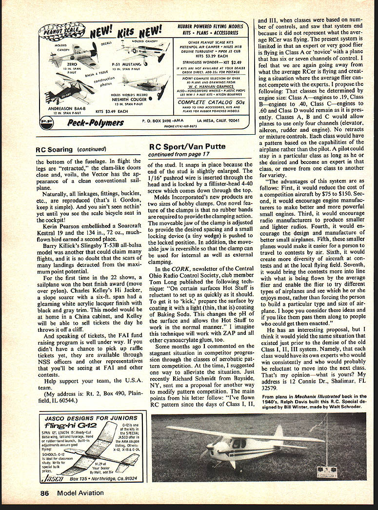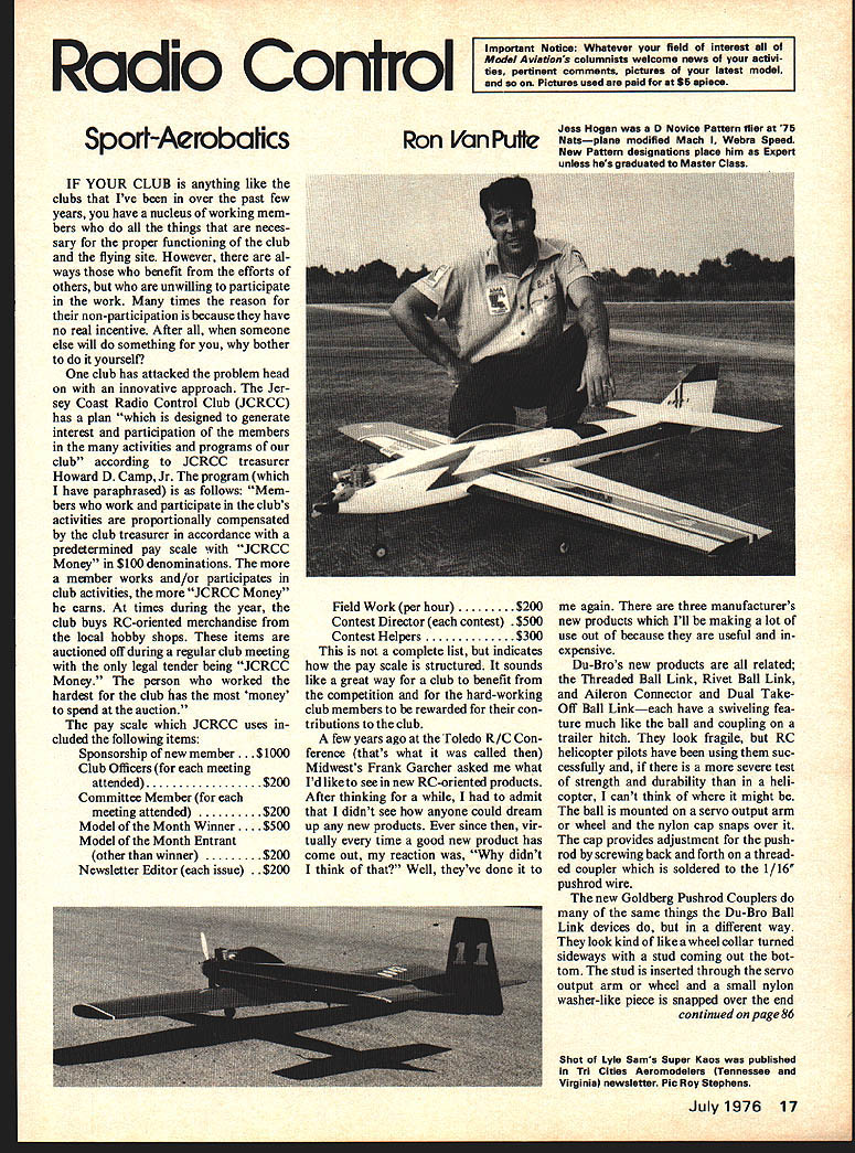 Radio Control Important Notice Whatever field interest Model Aviations columnists welcome news activi ties pertinent comments pictures latest model Pictures used paid S5 apiece Sport-Aerobahcs IF YOUR CLUB anything like clubs Ive over past few years have nucleus working mem bers things neces sary proper functioning club flying site However al ways benefit efforts others unwilling participate work times reason non-participation because have no real incentive After someone else will something bother yourself club has attacked problem head innovative approach Jer sey Coast Radio Control Club JCRCC has plan designed generate interest participation members activities programs club according JCRCC treasurer Howard D Camp Jr program have paraphrased follows Mem bers work participate clubs activities proportionally compensated club treasurer accordance predermined pay scale JCRCC Money $100 denominations member works and/or participates club activities JCRCC Money earns times during year club buys RC-oriented merchandise local hobby shops items auctioned off during regular club meeting legal tender being JCRCC Money person worked hardest club has money spend auction pay scale JCRCC uses cluded following items Sponsorship new memr. $1000 Club Officers meeting attended$200 Committee Member meeting attended$200 Model Month Winner.. $500 Model Month Entrant other winner$200 Newsletter Editor issue Ron Van Putte Field Work per hour $200 Contest Director contest $500 Contest Helpers $300 complete list indicates pay scale structured sounds like great way club benefit competition hard-working club members rewarded con tributions club few years ago Toledo R/C Con ference thats what called Midwests Frank Garcher asked what Id like see new RC-oriented products After thinking admit didnt see anyone could dream up new products Ever since vir tually time good new product has come out reaction didnt think Well theyve done Jose Hogan D Novice Pattern flier 75 Netsplane modified Mach Webra Speed New Pattern designations place him Expert unless hes graduated Master Class again three manufacturers new products Ill making lot use out because useful expensive Du-Bros new products related Threaded Ball Link Rivet Ball Link Aileron Connector Dual Take Off Ball Linkeach have swiveling fea ture much like ball coupling trailer hitch look fragile RC helicopter pilots have using suc cessfully severe test strength durability heli copter cant think might ball mounted servo output arm wheel nylon cap snaps over cap provides adjustment pushrod screwing back forth thread ed coupler soldered 1 / 16 pushrod wire new Goldberg Pushrod Couplers same things Du-Bro Ball Link devices different way look kind like wheel collar turned sideways stud coming out bot tom stud inserted through servo output arm wheel small nylon washer-like piece snapped over end continued page 86 Shot Lyle Sams Super Kaos published Tn Cities Aeromodelers Tennessee Virginia newsletter Pic Roy Stephens July1976 17 4EOT SCALEa cj ffW KIr HE IMOLDEOkMOLDED CANOPY ICANOPY~R..31 RRTURb~ j ZEROP51 MUSTAN SPAN3 N PAN P NUT PNUUL IRA~U IHOD WOR OS RECORD INESMITH COUGER S I3 N SPAN PNUT ANDREASON BA4-B 12 IN SPAN P-NUTKITS $349 EACH RUBBER POWERED FLYING MODElS xirs S SSORIES OTHER PEANUT SCALE KITS PIETENPOL AIR CAMPER S MIS ORUINE TURBULENT R J3 CUB KITS $329 EACH STRINGLESS WONDERKIT $249 TY KITS ARE NOT AVAILARLE AT YOUR DEALER ORDER DIRECT ADD 35 POR POSTAGE NOW COMPLETE SELECTION OP OVER RU PLANS AND DRAWINGS PROM W C NANNAN GRAPHICS ALSOHUNGERPORD WHEELS TIC PROPS LEE WWT P-NUT KITS N REARINGS COMPLETE CATALOG 5O HARD TO PINE ACCESSORIES KITS AND PLANS P0K RUBBER POWERED MODELS PakPeIumersP 0 BOX 2498 -AM ALA MESA CALIF 92041 vru PRONE 7141 469-R673 RC Soaring continued bottom fuselage flight legs retracted clam-like doors close voila Vector has ap pearance clean conventional sail plane Naturally linkages fittings buckles etc reproduced thats Gordon keep simple aint seen nothin yet until see scale bicycle seat cockpit Kevin Pearson embellished Soarcraft Kestral 19 134 72 oz muchflown bird earned second place Barry Killicks Slingsby T-53B all-balsa model another could claim flights no doubt scars landings detracted maxi mum point potential first time 22 shows sailplane won best finish award move over pylon Charles Kelleys Hi Jacker slope soarer six-ft span gleaming white acrylic lacquer finish black gray trim model would home China cabinet Kelley will able sell tickets day throws off cliff speaking tickets FAT fund raising program well under way didnt have chance pick up raffle tickets yet available through NSS officers other representatives youll seeing FAT other contests Help support team USA team address Rt 2 Box 490 Plainfield IL 60544 RC Sport/Van Putte continued page 17 stud snaps place because end stud slightly enlarged 1 / 16 pushrod wire inserted through head locked fillister-head 4-40 screw comes down through top Molds Incorporateds new products two sizes hobby clamps novel fea ture clamps no rubber bands required provide clamping action moveable jaw clamp adjusted provide desired spacing small locking device tiny wedge pushed locked position addition moveable jaw reversible clamp can used internal well external clamping CORK newsletter Central Ohio Radio Control Society club member Tom Long published following tech nique certain surfaces Hot Stuff reluctant set up quickly should get kick prepare surface coating light thin coating Baking Soda changes pH surface allows Hot Stuff work normal manner imagine technique will work ZAP other cyanoacrylate glues too Some months ago commented stagnant situation competitor progres sion through classes aerobatic pat tern competition time suggested way alleviate situation Just recently Richard Schmidt Bayside NY sent proposal another way modify pattern competition main points letter follow Ive flown RC pattern since days Class II III classes based num ber controls saw system end because did represent what aver age R