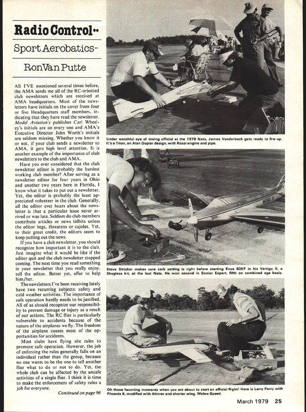 Radio Control Sport Aerobatics RonVan Putte AS IVE mentioned several times before AMA sends RC-orien ted club newsletters received AMA headquarters Most news letters have initials cover four five Headquarters staff members dicating have read newsletter Model Aviations publisher Carl Wheel eys initials AMAs Executive Director John Worths initials seldom missing Whether know club sends newsletter AMA gets high level attention another example importance club newsletters club AMA Have ever considered club newsletter editor probably hardest working club member After serving newsletter editor four years Ohio another two years Florida know what takes put out newsletter Yet editor probably least ap preciated volunteer club Generally editor ever hears about news letter particular issue never ar rived late Seldom club members contribute articles news tidbits unless editor begs threatens cajoles Yet great credit editors seem keep putting out news have club newsletter should recognize important club Just imagine what would like editor quit club newsletter stopped coming next time read something newsletter really enjoy tell editor Better yet offer help him/her newsletters Ive receiving lately have two recurring subjects safety cold weather activities importance safe operation hardly needs justified us should recognize responsibil ity prevent damage injury result actions RC flier particularly vulnerable accidents because nature airplanes fly freedom airplane causes op portunities accidents Most clubs have flying site rules promote safe operation However job enforcing rules generally falls individual rather group because no wants to tell another flier what to Yet whole club can affected unsafe activities single flier think time make enforcement safety rules job everyone Continued page 96 March 1979 25 Under watchful eye timing official 1978 Nats James Vanderback gets ready fire up Its Trion Alan Duplar design Rossi engine pipe Steve Stricker makes sure carb setting right before starting Enya BOXF Vertigo II Skyglass kit last Nats won second Senior Expert fifth combined age basis Oh haunting moments about start official flight Larry Perry Phoenix 6 modified thinner shorter wing Webra Speed SEND COUPON AND 250 FOR YOUR CATALOG TODAY weight proportional square velocity weight 2 2 times pattern ship velocity 2/3 pattern ship monsters will less damagingor perhaps equal under worst condition Horsepower limitations 2 hp-3 hp will limit speeds weights sizes F F Van Keurin Jr Greenville MS Oh Beautiful Bird am writing reference picture page 38 November issue Model Aviation lower lefthand corner Tom Stark Bird model am RC flier senior citizen Years back flew Bird its five cylinder Kinner Would please put touch Tom Stark would love get set plans model model back thirties greatest Thank help can give matter am enclosing self-addressed stamped envelope reply Arthur F Cervenka Oakdale NY have put Mr Cervenka touch Tom Stark Bird incidentally regarded have truly excellent airplane RC Technique/Myers continued page 17 article will paid itif send form publishable article send letter editor uses get just glory Finally could send informa tion get enough build item Name Address City StateZip Send MIDWEST PRODUCTS CO h4Hoba Indiana 46342 71400 South Indiana SI MA column will credit source magazine will pay $5 $15 contribution Its up you word Academy have meaning have share knowledge Thats another month Got get back Technicians course Keep writing George Myers 70 Froehlich Farm Rd Hicksville NY 11801 RC Aerobatics/Van Putte continued page 25 accident can have humorous side Cedar Rapids Skyhawks Log book edited Richard Hayslip con tains periodic articles written Ed Coc ciola entitled Notes Novices entire article November issue decided month guy will stick hand 14 prop being turned 60 engine let take five gashes half fingernail dont need giving advice nobody parts country clubs involved activities other flying since its too cold fly Before get irate letters Alaska Michigan North Dakota other states people fly year-round want make clear also RC fliers state Florida dont fly couple months during winter because its too cold know guys very well shave face morning cold weather activities never quite enjoyable flying warm sunshine can make winter bearable popular club cold weather activities conducting monthly indoor contests airplanes can built variety rules flown available large areas enjoyable indoor contests ever competed held 15 X 30 foot room nine-foot ceiling school gymnasium available better Some fellow club members sure surprise unexpected talent build ing flying indoor models An event might like tackle sponsorship Delta Dart program Local scouting other youth organ iza tions usually delighted have club sponsor such activity Besides theres lot satisfaction derived helping kids make first flying models Write AMA information about get involved have airplanes engines radio equipment assorted modeling accessories dont use sponsor club auction Almost modelers have something theyd like have taken off hands some can use get few bucks back selling something dont use better protect sellers some valuable items club auctions allow designation minimum acceptable bid require seller buy item bidding doesnt go high enough Its lot fun might manage buy something youve looking course us use cold weather building projects am no exception winter intend undertake build ing project has thinking stage quite House Balsa Y2A airplanes have always interested because obvious quality kit materials plans instructions ever never seen fly re luctant invest time air planes Two weeks ago oppor tunity fly House Balsa FW 190 experience convinced go ahead project FW 190 has some difficulty getting off ground since doesnt have steer able tailwheel has ailerons instead rudder However once airplane gets flying speed just like pattern air plane both stable responsive definitely beginners airplane course wind does bother airplane size 60-powered airplane wind abo