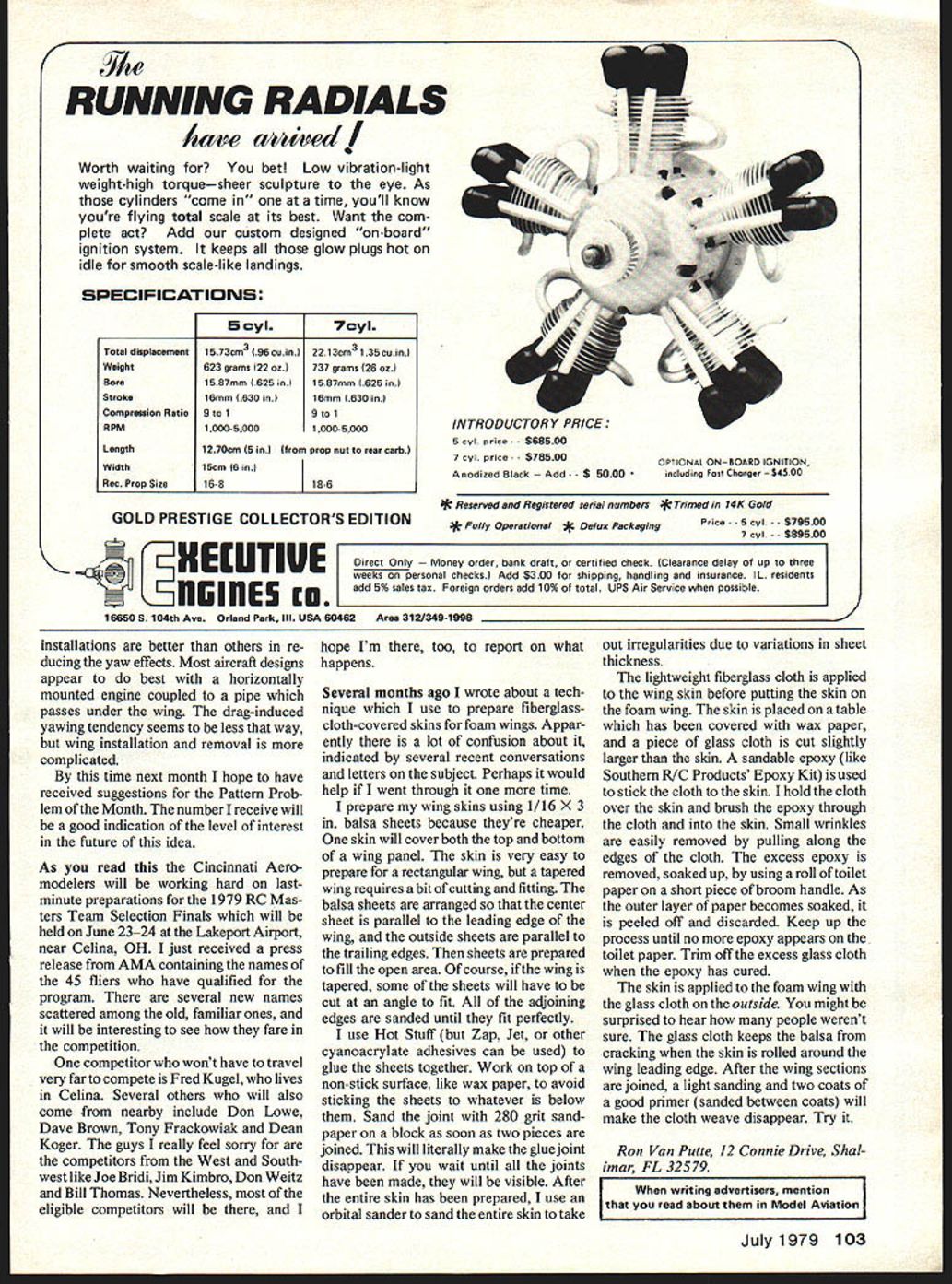 BACK spring 1954 Purdue University Engineering School learning about aeronautical engineering However time spent think ing about college looking forward flying first radio-controlled airplane deBolt Kitten purchased late previous summer mind lot during winter spring semesters finally flown successftilly summer Atwood 049 power radio system included ECE hard tube receiver homebuilt groundbased transmitter batteries escape ment Sigma 4F relay receiver airborne system weighed cur rent four-channel system single channel Regardless enjoyable flying session old Kitten subsequent years fly deBolt Sonic Cruiser Viscount designs todays RC modelers can also trace early flying enjoyment owning deBolt kit Thats gleam nostalgia came eyes Model Aviations editor Bill Winter sent letter Fran Ptaszkiewicz Fran has plans deBolts kits both RC Control Line airplanes offers send list receives stamped selfaddressed envelope Prices plans very reasonable Write Fran Ptaszkiewicz 23 Marler Drive Tonawanda NY 14150 way Fran looking copy Live Wire Senior plans According Fran Senior interim design between Live Wire Trainer Cruiser very built available copies plans master destroyed during fire Harold late 1950s have copy plans please write Fran let him know Pattern Problem Month submitted Major Dick Cline Sierra Vista AZ way Problem idea something add column first problem included last month Its up rest share want same Dicks problem follows have Hobby Barn Curare HP 61 has center-of-gravity front-to-back side-to-side about right Inside outside loops fine problem end third loop Im heading about 450 direction entry quite common problem ever several possible causes sometimes difficult correct able straighten loops out would probably see model turning continuously original heading means directional trim correct airplane skidding through air Among main causes type motion incorrect engine alignment installation vertical fin angle fuselage curved banana shaped fuselage asymmetric yawing effects mufflers pipes engine offset error usually difficult detect Probably best way find out whether contributing problem offset engine direction opposite way heading changing retrim ailerons rudder described last months column heading change loops reduced know engine offset problem can carry eliminate careful during vertical fin installation have fiberglass fuselage integral vertical fin probably have fin straight However weve probably vertical fin end up installed crooked balsa fuselage rudder can used trim out inherent yawing tendency crooked fin will Continued page 102 July 1979 23 varied flock airplanes appeared st Western Ohio Radio Kontrol Society WORKS Flying Circus sponsored annually club flying site near Dayton Photograph Chuck Shade trlars I~re3oun uuunI .ow Ip stop him flying RC airplanes assisted Mel Bray prepared special trans miller sticks Charlie grip Six pairs ayes watch maneuvers George Aibright fires up engine UtopiaUtopia Enterprises Co Completely prebuilt ready finish Earl Haury flies competition new releases Bucker ITT herb clukey wingspan Seagu 11for rubber available soon C02 power SEE YOURsend 25$ DEALER NOWcatalog FLYLINE MODELS INC 282000A53V55u5B PAISPAX VIRGINIA 2200TOOl 532030 cisely extend human arms legs senses man controls crate alivethe pilot its brain will build model Cubs forever Maybe Hazel Sigs Clipped-Wing Cubthe big flies typical air show ship others mind finest model Cubs classic sense 6-foot J-3 Chuck Hollinger appeared Air Trails during fifties kitted Berkeley Berkeley Fairchild low-wing trainer another Hollinger masterpiece Berkeley failed product line went Fox Sig Well bet Sig has some Hollinger J-3 plans barn about Sig Mac Mike Ah Cub-yellow Hollinger Cub What collectors item what bird model Cub captures essence real Cub its framing its flight stuff dreams made RC Technique/Myers continued page 19 about Lithium batteries ELTs know about should no trick make up similar system using nickle cadmium batteries important points 1 backup battery should have separate electrical path receiver avoid total failure broken wire 2 backup battery should operate simultaneously parallel ANNOUNCING Fast Steep Climb FLat Slow Glide 4 new P30 class model designed novice mind has potential win toughest THE POTENT30 Delece kit lectures include Rolled balsa fuselage wing mount dt Completed prop nose plug tail plugS rudder Precut wing ribs spar notches job rated balta strips Highest qualoty tossue lu bed Contest rubber Detailed instructoons flying tips help winl CAT NO R2 $695 PP check money Order CHAS WERLE 3620 MORSE AVE NOS SACTO CALIF 95821 primary battery backup battery idea should incor porated plane powered engine larger 049 larger heavier airplane important protection becomes wind blows dust eyes system fails club has few rules number 1 rule Buddy System Flying alone asking trouble Suppose have make landing cant see kid standing behind runway Does situation always leave enough time take eyes off plane quick look larger models certainly feasible use two parallel completely independent RC systems control No doubt will some complaints about Hogging Channels increased reliability will Mathematically operating two parallel systems 9 reliability system reli ability becomes 99 think unnecessarily high consider fact reliability goal Lunar Module 99999 try figure out achieved Well friends Ive run out column space before have run out ideas have read far consider call new ideas increased RC systms reli ability will publish far space permits credit presenting George Myers 70 Froehlich Farm Rd Hicksvile NY 11801 Ugly/Beckman continued page 22 epoxy use Tra-Bond 2248 made Tra Can Inc 55 North St Medford Mass 02155 can supply what call BIPAX premeasured amounts resin hardener single plastic bag separated plastic clip remove clip mix two parts cut off corner bag squeeze out epoxy Pot life three hours have plenty time assemble things must follow special curing schedule muffler parts fitted ready mix apply epoxy Put thin coat su