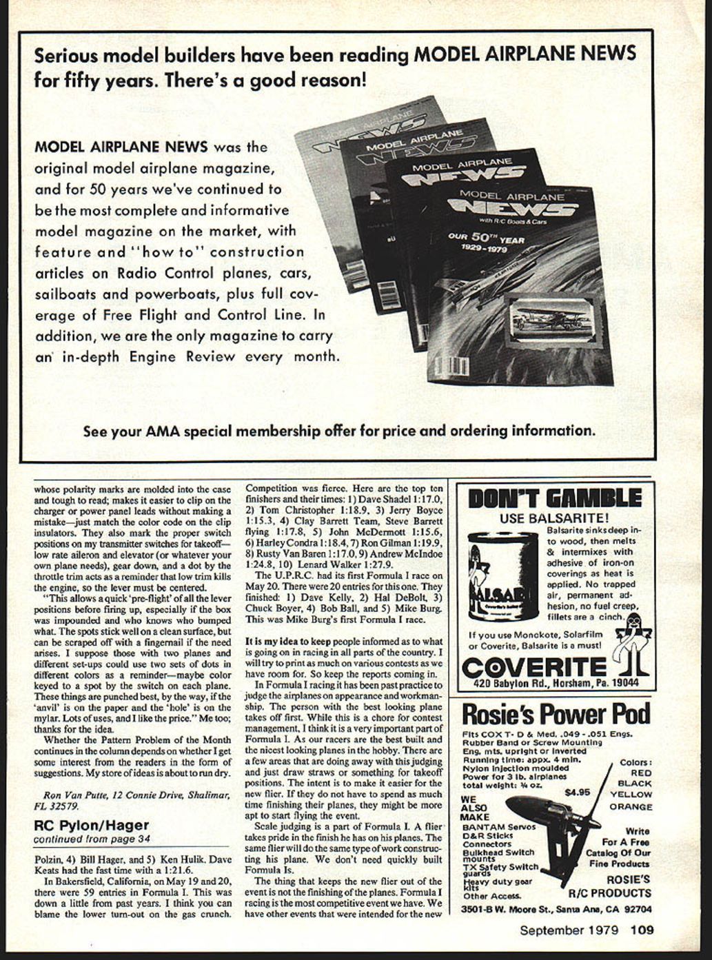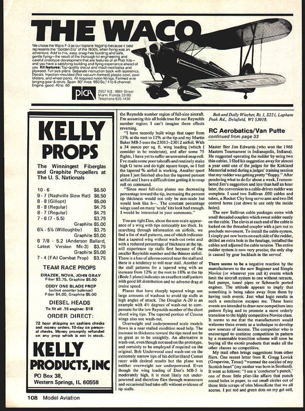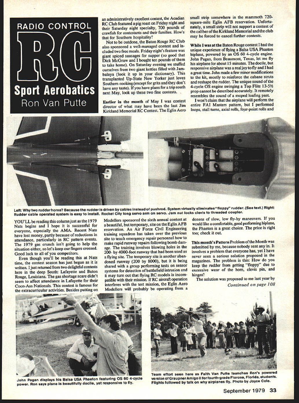 an administratively excellent contest Acadian RC Club featured pig roast Friday night Saturday night specialty 700 pounds crawfish contestants families Hows Southern hospitality outdone Baton Rouge RC Club also sponsored wellmanaged contest cluded two free meals Friday nights feature giant spiced sausages supper good Dick McGraw bought ten pounds take home Saturday evening stuffed ourselves two giant kettles filled Jam balaya look up dictionary transplanted Up-State New Yorker just loves Southern cooking except grits dont have taste have plans trip south next May look up two fine contests Earlier month May contest director what may have last Jim Kirkland Memorial RC Contest Egiin Aero small strip somewhere mammoth 720square-mile Eglin AFB reservation Unfortu nately small strip will support contest caliber Kirkland Memorial club may forced cancel further contests Baton Rouge contest unique experience flying Balsa USA Phaeton biplane powered 05 60 4-cycle engine John Pagan Beaumont Texas let fly airplane about 15 minutes docile responsive airplane real joy fly great time John made few minor modifications kit mostly reinforce cabane struts reshape rudder unique sound 4-cycle OS engine swinging Top Flite 13-5w prop cannot described accurately remotely resembles sound moped loafing past wont claim airplane will perform entire FAI Masters pattern performed loops stall turns axial rolls four-point rolls Left two rudder horns Because rudder driven cables instead pushrod System virtually eliminates floppy rudder See text Right Rudder cable operated system easy install Rocket City long servo arm servo Jam nut locks cievis threaded coupler YOULL reading column just 1979 Nats begins hope successful everyone especially AMA Recent Nats have lost money partly because reductions attendance particularly RC pattern events 1979 gas crunch isnt going help situation either lets keep fingers crossed Good luck competitors though youll reading Nats time contest season has just begun written Ijust returned two delightful contests deep South Lafayette Baton Rouge Louisiana gas shortage scare didnt seem affect attendance Lafayette Coon-Ass Nationals contest famous extracurricular activities Besides putting Modellers sponsored sixth annual contest beautiful temporary site Eglin AFB reservation An Air Force Civil Engineering training squadron has taken over previous site teach emergency repair personnel make rapid runway repairs following bomb dam age training involves blowing holes 200-by 4000-foot runway used flying site temporary site another aban doned runway 200 8000 being shared group performing tests sensor systems detection battlefield intrusion may turn out flying RC models incom patible mission RC aircraft operation interferes test mission Egiin Aero Modellers will probably operating dozens slow low fly-by maneuvers would like comfortable good performing biplane Phacton great choice price right too check out months Pattern Problem Month submitted because nobody sent involves problem everyone has yet have never seen serious solution proposed magazines problem keep rudder getting floppy due excessive wear horn clevis pin hinges solution was proposed last year Continued page 108 September1979 33 Team eTtort seen nere I-ann yen -ute launches Rons powered version GraupnerAmlgo II forfourth-grade Florosa Florida students Flights followed talk airplanes fly Photo Joyce Cole THE chose Waco F-3 biplane flagship because represents Golden Era 1930s flying adventure Add easy snag-free building safe gentle flyingthe result thorough kit engineering careful prototype development features Platt Kits have satisfying building flying experience ahead Kit featuresTop-quality diecut machined balsa plywood Full size plans Separate instruction book isometrics Decals Injection-moulded vacuum-formed plastic cowl cowl blisters wheel pants required nylon fittings Formed wire langing gear & struts Span 60 Area 950 Sq 4 6 channel Engine good 40 60 2657 NE 188th Street Miami Florida 33180 Telephone 935-1436 KELLY PROPS Winningest Fiberglas Graphite Propellers U S Nationals 10-6 9 7 Nashville Slow Rat 8- 8 Gillopt 8 8 Regular 8-7 Regular 7 6 7 55 $650 $650 $500 $475 $475 $375 Graphite $500 614 5% Willoughby $375 Graphite $500 6 7/8 52 Anderson Ballard Latest Version Mk-3 $375 Graphite $500 7 4 FAI Combat Prop $375 TEAM RACE PROPS DRAZEK NOVA JOHN GRAY Fiber $375 Graphite $500 ODDY ONE BLADE PROP w/out counter balence Fiber $400 Graphite $500 DIESEL HEADS fit 15 engines $18 ORDER DIRECT 72 hour shipping cashiers checks money orders 10-day person al checks Money promptly refunded prop stock KELLY PRODUCTS INC P0 Box 38 Western Springs IL 60558 108 Model Aviation Reynolds number region full-size aircraft rm assuming holds true Reynolds number region cant imagine effects reversing have recently built wings taper 15% root 12% tip Martin Baker MB-S uses 2301523012 airfoil 34 ounce per sq ft wing loading consider moderate after some 75 flights have yet suffer unwanted snap roll Ive made some poor takeoffs routinely make high G turns tight square loops feel tapered % airfoil working Another sport plane Ijust finished also has tapered percent airfoil have difficult time getting snap roll command Since full-size planes use decreasing percentage toward tip increasing percent tip thickness would non-scale would look like h- constant percentage wings used scale kits look bad enough would interested comments right Dan about non-scale appear ance wing tips noticeably too thick searching through information airfoils find list stall patterns indicates tapered wing wash-out twist reduced percentage thickness tip will experience tip stalls first because smaller Reynolds number thinner airfoil loss aileron control nearthe stall tendency roll near stall Another stall patterns tapered wing increase 12% root 18% tip Bede 5 plane indicates excellent stall pattern good lift distribution no adverse drag cruise speed Planes have sharply tapered wings use large am