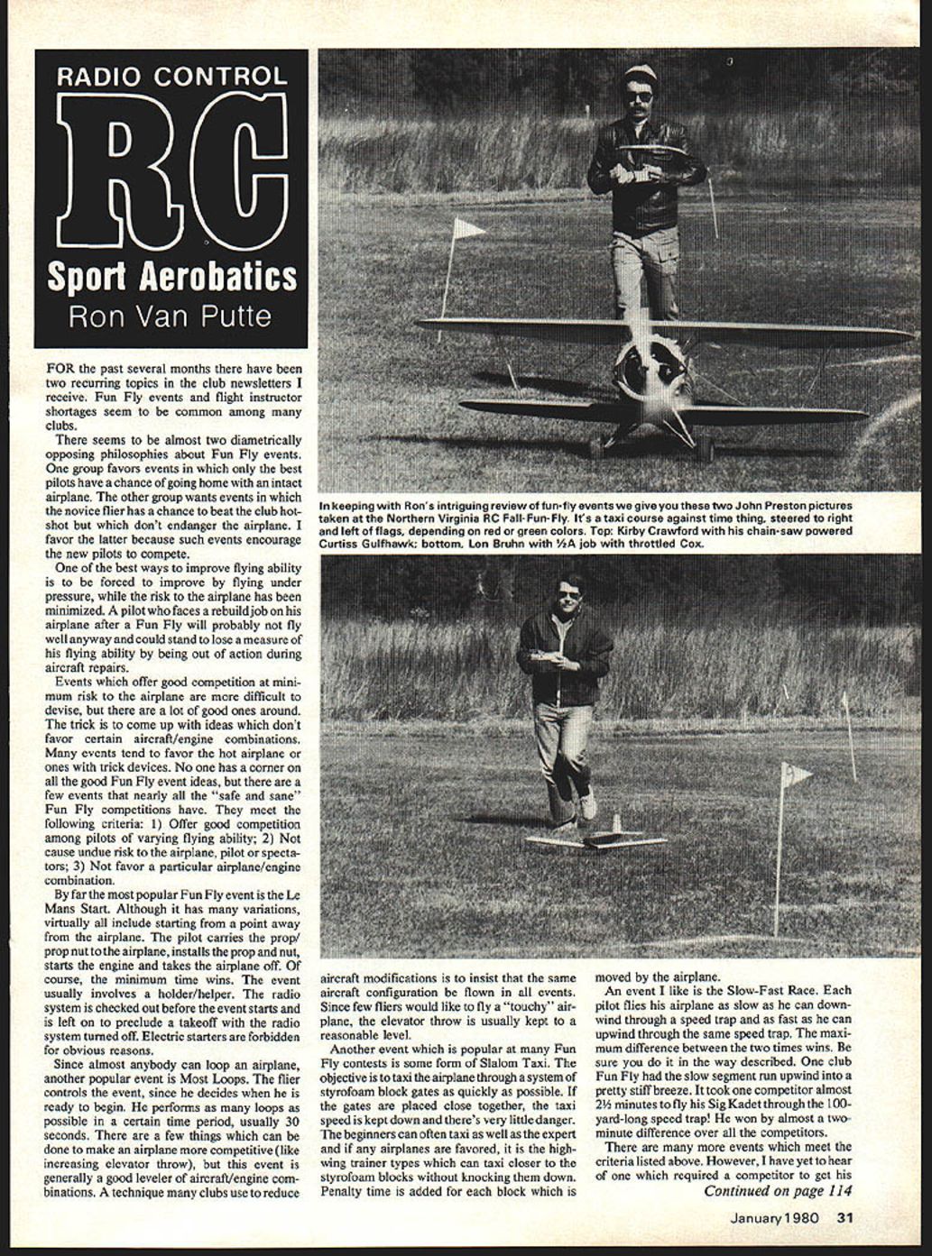 FOR past several months have two recurring topics club newsletters receive Fun Fly events flight instructor shortages seem common among clubs seems almost two diametrically opposing philosophies about Fun Fly events group favors events best pilots have chance going home intact airplane other group wants events novice flier has chance beat club hot shot dont endanger airplane favor latter because such events encourage new pilots compete best ways improve flying ability forced improve flying under pressure risk airplane has minimized pilot faces rebuild job airplane after Fun Fly will probably fly well anyway could stand lose measure flying ability being out action during aircraft repairs Events offer good competition mini mum risk airplane difficult devise lot good ones around trick come up ideas dont favor certain aircraft/engine combinations events tend favor hot airplane ones trick devices No has corner good Fun Fly event ideas few events nearly safe sane Fun Fly competitions have meet following criteria 1 Offer good competition among pilots varying flying ability 2 cause undue risk airplane pilot specta tors 3 favor particular airplane/engine combination far popular Fun Fly event Le Mans Start Although has variations virtually include starting point away airplane pilot carries prop prop nut airplane installs prop nut starts engine takes airplane off course minimum time wins event usually involves holder/helper radio system checked out before event starts left preclude takeoff radio system turned off Electric starters forbidden obvious reasons Since almost anybody can loop airplane another popular event Most Loops flier controls event since decides ready begin performs loops possible certain time period usually 30 seconds few things can done make airplane competitive like increasing elevator throw event generally good leveler aircraft/engine com binations technique clubs use reduce alrcraft modifications insist same aircraft configuration flown events Since few fliers would like fly touchy alr plane elevator throw usually kept reasonable level Another event popular Fun Fly contests some form Slalom Taxi objective taxi airplane through system styrofoam block gates quickly possible gates placed close together taxi speed kept down theres very little danger beginners can often taxi well expert airplanes favored highwing trainer types can taxi closer styrofoam blocks knocking down Penalty time added block moved airplane An event like Slow-Fast Race pilot flies airplane slow can down wind through speed trap fast can upwind through same speed trap maxi mum difference between two times wins sure way described club Fun Fly slow segment run upwind pretty stiff breeze took competitor almost 2 minutes fly Sig Kadet through 100yard-long speed trap won almost twominute difference over competitors events meet criteria listed above However have yet hear required competitor get Continued page 114 January1980 31 keeping Rons intriguing review funfly events give two John Preston pictures taken Northern Virginia RC Fall- Fun- Fly Its taxi course against time thing steered right left flags depending red green colors Top Kirby Crawford chain-saw powered Curtiss Gulfhawk bottom Ion Bruhn /A iob throttled Cox Go GRISH propeller True helical pitch airfoil win-power 2 Blade Tractor 53each 545354g 63 64Nc 7476 78Nc 8486 88Uc 9496 97 9810-4106Sc 114116118 *1 12412-512-6iUD 2 Blade Pusher 5- 3 5-46-36-4USc 86USc 9610-6*1 3 Blade Tractor 53 6364 HOc 3 Blade Pusher 63USC Metallic Aluminum Color Tractor 168 $1 8688ia 96 106104iUS Pusher106*1U Grumman Guardian XTB3F-28 /\ Class Carrier ICLD-102 IBy I{CataIog25cRog Edwards ERNISTIC MODELS PO BOX 6974 ALBUQ NM 87197 sophisticated simplest Deckers custom-designed built out titanium Na turally Roy Spavins contribution other end towhook wizardry name hardware dealer bought cup hooks Both Austrians hand-towed South Africans winched used simple straight less thing go wrong hooks USA team captured releaseable types Skip used Radio Sailplane type mounted standard fashion Steve used same type mounted up inside fuselage reduce drag Terry used Rocket City towhook installations required different type towring two custommade Sean Bannister England team similar situation towhooks produced simple effective solution tow ring club confivnted problem having correct towring available hook might screwed too close fuselage ring gets ruptured time ole Luke Leadfoot launches 16-foot Behe moth 2000 take lesson English cousins Sean fashioned end pennant withinstead towringan 18-inch nylon coated steel cable fastened ends form loop flexible loop could simply hooked standard towhook could pinched together inserted hidden type hook such Rocket City type So can see exotic materials tolerances second lens polishing won some workshop materials stralght forward building did job others Sunday fliers contest goers can leam something both schools Yet FAI F3B flier work still cut out Whatever design build remember statistics show knew models GRISH LARGE WOOD PROPELLERS HARDWOOD too hard minimizes chance costly plane engine damage True pitch airfoil fully finished balanced ready coating 3/8 BOREALL SIZES IN18 $7 6 8 & 10 PITCH 208 22 10 24 13 RIGHT HAND TRACTOR 6 RISK BROS INDIANA 46373 AEROBATIC AIRPLANES BY RCBT C MORPISON UPERB DRAWINGS S395 PLUS 5O P 0T L2L2.l bestno matter what design favorstood winners circle Dan Pruss Rt 2 Box 490 Pla infield IL 60544 RC Aerobatics/Van Putte continued page 3 airplane ground quickly could Such events plane breakers should avoided have some good ideas Fun Fly events let hear about can share others read ModelAviation second topic common among newsletters instructor problem club has good supply qualified instructors consider yourself lucky lot clubs arent fortunate clubs have two overworked instructors dont have time fly own airplanes sport virtually requires instructor give beginner reasonable chance learning fly breaking lot airplanes other sports way acceptable leve