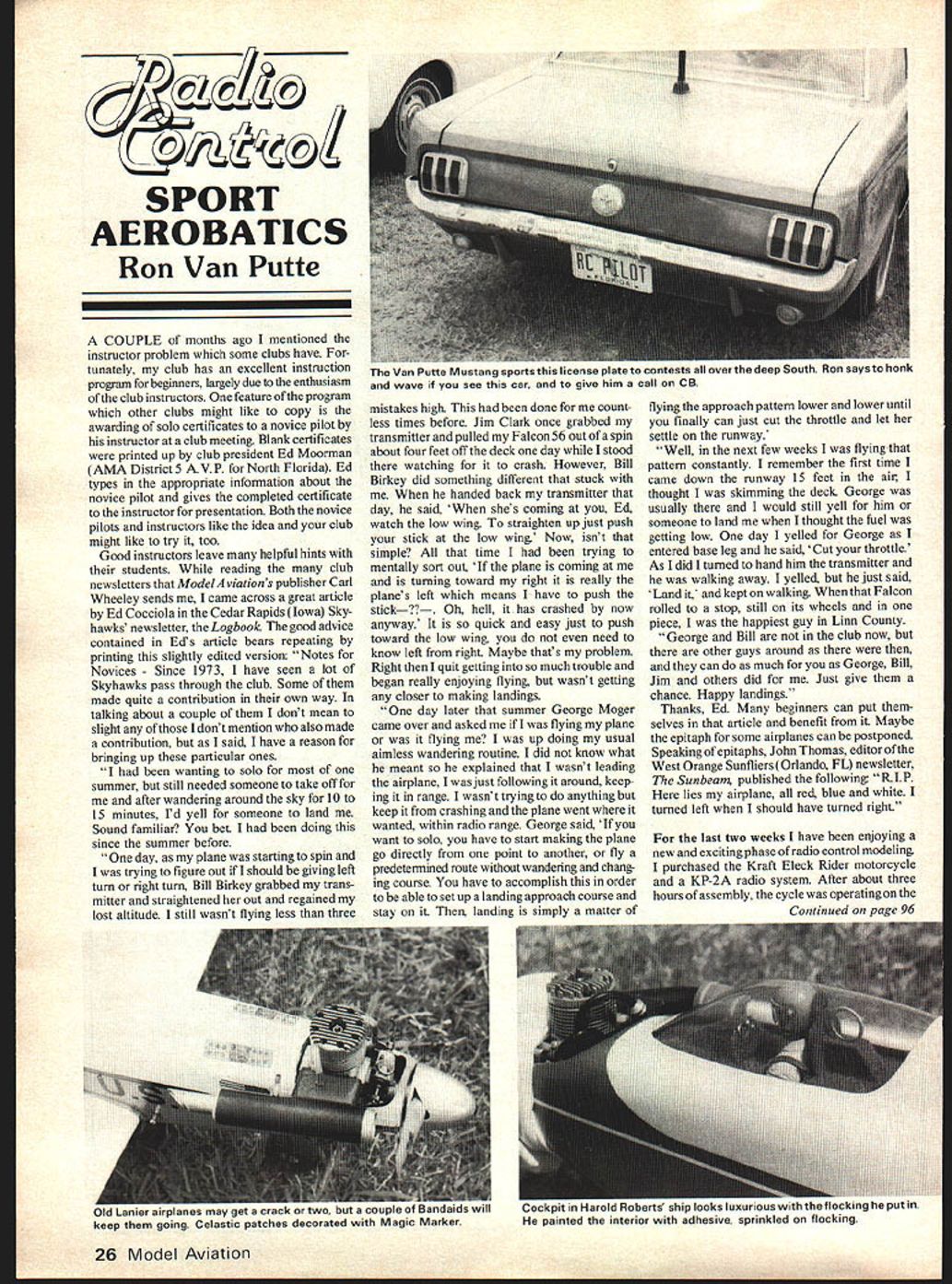 SPORT AEROBATICS Ron Van Putte COUPLE months ago 1 mentioned instructor problem some clubs have tunately club has excellent instruction program beginners largely due enthusiasm club instructors feature program other clubs might like copy awarding solo certificates novice pilot instructor club meeting Blank certificates printed up club president Ed Moorman AMA DistrictS AVP North Florida Ed types appropriate information about novice pilot gives completed certificate instructor presentation Both novice pilots instructors like idea club might like try too Good instructors leave helpful hints students reading club newsletters ModelAviations publisher Carl Wheeley sends came across great article Ed Cocciola Cedar Rapids low Skyhawks newsletter Logbook good advice contained Eds article bears repeating printing slightly edited version Notes Novices Since 1973 have seen lot Skyhawks pass through club Some made quite contribution own way talking about couple dont mean slight ofthose dont mention also made contribution said have reason bringing up particular ones wanting solo summer still needed someone take off after wandering around sky fur 10 15 minutes Id yell someone land Sound familiar bet doing since summer before day plane starting spin trying figure out should giving left turn right turn Bill Birkey grabbed trans mitter straightened Out regained lost altitude still wasnt flying less three mistakes high done count less times before Jim Clark once grabbed transmitter pulled Falcon 56 out spin about four feet off deck day stood watching crash However Bill Birkey did something different stuck handed back transmitter day said shes coming Ed watch low wing straighten up just push stick low wing Now isnt simple time trying mentally sort out plane coming turning toward right really planes left means have push stick? Oh hell has crashed now anyway quick easy just push toward low wing need know left right Maybe thats problem Right quit getting much trouble began really enjoying flying wasnt getting closer making landings day later summer George Moger came over asked flying plane flying up doing usual aimless wandering routine did know what meant explained wasnt leading airplane just following around keep ing range wasnt trying anything keep crashing plane went wanted within radio range George said want solo have start making plane go directly point another fly predetermined route wandering chang ing course have accomplish order able set up landing approach course stay landing simply matter flying approach pattern lower lower until finally can just cut throttle let settle runway Well next few weeks flying pattern constantly remember first time came down runway 15 feet air thought skimming deck George usually would still yell him someone land thought fuel getting low day yelled George entered base leg said Cut throttle As did turned hand him transmitter walking away yelled just said Land kept walking Falcon rolled stop still its wheels piece happiest guy Linn County George Bill club now other guys around can much George Bill Jim others did Just give chance Happy landings Thanks Ed beginners can put selves article benefit Maybe epitaph some airplanes can postponed Speaking epitaphs John Thomas editor West Orange Sunfliers Orlando FL newsletter Sun beam published following RIP lies airplane red blue white turned left should have turned right last two weeks have enjoying new exciting phase radio control modeling purchased Kraft Eleck Rider motorcycle KP-2A radio systern After about three hours assembly cycle operating Continued page 96 26 Model Aviation Van Putte Mustang sports license plate 10 conTests aii over oeep uuth Ron says honk wave see car give him call CB airplanes may get crack two out coupie 01 keep going Celastic patches decorated Magic Marker ld Roberts ship looks luxurious nocing ne put iii painted interior adhesive sprinkled flocking Purchasing R/C Aircraft easy YOUNIQUE AT Hobby Capital keep large ready supply af Custom-Bilt RC Aircraft Kits Engines RC Units times And. thanks ta years af experience dealing people sections af US. prepare special ane-of-a-kind RC Aircraft far special one-ofa-kind RC Flyer wha demands unique laok express tastes Chances youll find custom paint finish exquisite detailed cockpit interiors glassed engine compartments real scale wheels custom grilled nose section will knock socks offi. youll probably never see another like cause Hobby Capitol expert stressed preparation goes far beyond standard checkout RC shoppers turning up increasing numbers convenient showroom because word out. outstanding buys service finest selection unique RC Aircraft anywhere its HOBBY CAPITOL Old Ignition Trode4n Buy sell old time ignition engines Box up what have send us honest appraisal could worth new proportional set have engines can also start collection welcome built-up airplanes used proportionals old time ignition engines Come trade us lop dollar paid Built Order Rons Kt stock choose Its s400OO Pipet Tri-Poce Quarter Scale 89 wingspan 42 Sq Ft detailed plans $1699 PR Send $i00 self addressed stamped envelope far detailed list Built-Up R/C Models ond 50% Sale Hobby Capitol 46 N Oak St Ventura CA 93001 Phone 805 643-7616 / 642-8465 efforts promote models look fly like full-size counterparts may finally blossom ing full bloom Las Vegas TOC thing andthe IMAC organization promoting aerobatic models have copies full scale machines CAP addition pack hopefully add pleasure others just did Glen Hazel Sig gang up Iowa doing share promote IMAC philosophy decide build CAP sashay up next year enjoy bash put benefit us modelers RC Aerobatics/Van Putte continued page 26 street front house said technique faultless beginning Eleck Rider performed perfectly Id half truthful cycle did perform perfectly technique left lot desired initially poor driving ability its advant ages Whenever lost control cycle spun out ran curb dashed under car clobbered mailbox post demonstrated durability system After 