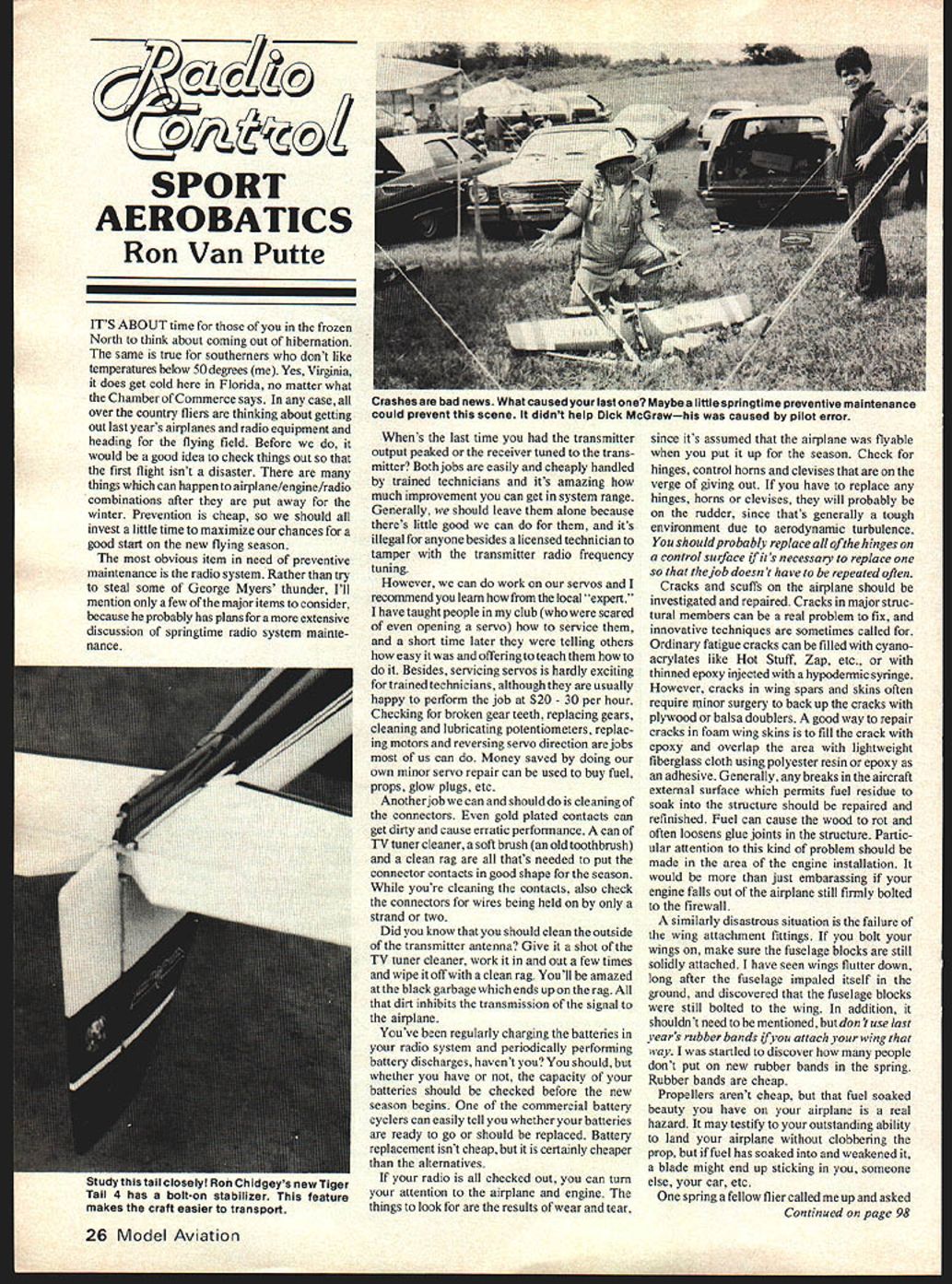 SPORT AEROBATICS Ron Van Putte ITS ABOUT time frozen North think about coming Out hibernation same true southerners dont like temperatures below 50 degrees Yes Virginia does get cold Florida no matter what Chamber Commerce says case over country fliers thinking about getting out last years airplanes radio equipment heading flying field Before would good idea check things out first flight isnt disaster things can happen airplane/engine/radio combinations after put away winter Prevention cheap should invest little time maximize chances good start new flying season obvious item need preventive maintenance radio system Rather try steal some George Myers thunder Ill mention few major items consider because probably has plans extensive discussion springtime radio system mainte nance Whens last time transmitter output peaked receiver tuned trans mitter Both jobs easily cheaply handled trained technicians its amazing much improvement can get system range Generally should leave alone because theres little good can its illegal anyone besides licensed technician tamper transmitter radio frequency tuning However can work servos recommend leam local expert have taught people club scared opening servo service short time later telling others easy offeringto teach howto Besides servicing servos hardly exciting trained technicians although usually happy perform job $20 30 per hour Checking broken gear teeth replacing gears cleaning lubricating potentiometers replac ing motors reversing servo direction jobs us can Money saved doing own minor servo repair can used buy fuel props glow plugs etc Anotherjob can should cleaning connectors gold plated contacts can get dirty cause erratic performance can TV tuner cleaner soft brush old toothbrush clean rag thats needed put connector contacts good shape season youre cleaning contacts also check connectors wires being held strand two Did know should clean outside transmitter antenna Give shot TV tuner cleaner work out few times wipe off clean rag Youll amazed black garbage ends up rag dirt inhibits transmission signal airplane Youve regularly charging batteries radio system periodically performing battery discharges havent should whether have capacity batteries should checked before new season begins commercial battery cyclers can easily tell whether batteries ready go should replaced Battery replacement isnt cheap certainly cheaper alternatives radio checked out can turn attention airplane engine things look results wear tear since its assumed airplane flyable put up season Check hinges control horns devises verge giving Out have replace hinges horns devises will probably rudder since thats generally tough environment due aerodynamic turbulence shouldprobably replace ofthe hinges control surface Wits necessary replace job doesnt have repeated often Cracks scuffs airplane should investigated repaired Cracks major struc tural members can real problem fix innovative techniques sometimes called Ordinary fatigue cracks can filled cyano acrylates like Hot Stuff Zap etc thinned epoxy injected hypodermic syringe However cracks wing spars skins often require minor surgery back up cracks plywood balsa doublers good way repair cracks foam wing skins fill crack epoxy overlap area lightweight fiberglass cloth using polyester resin epoxy adhesive Generally breaks aircraft external surface permits fuel residue soak structure should repaired refinished Fuel can cause wood rot often loosens glue joints structure Partic ular attention kind problem should made area engine installation would just embarassing engine falls Out airplane still firmly bolted firewall similarly disastrous situation failure wing attachment fittings bolt wings make sure fuselage blocks still solidly attached have seen wings flutter down long after fuselage impaled itself ground discovered fuselage blocks still bolted wing addition shouldnt need mentioned don t use last years rubber bands ifyou attach wing way startled discover people dont put new rubber bands spring Rubber bands cheap Propellers arent cheap fuel soaked beauty have airplane real hazard may testify outstanding ability land airplane clobbering prop fuel has soaked weakened blade might end up sticking someone else car etc spring fellow flier called up asked Continued page 98 26 Model Aviation Crashes bad news What caused last Maybe little springtime preventive maintenance could prevent scene didnt help Dick McGrawhis caused pilot error tUdytflistaiIcl .jn Chidgeys newTiger Tail 4 has bolt-on stabilizer feature makes craft easier transport CUT / 4 OFEP SLIT ALONG THE FULL LENGTH OF THE MATING SURFACES Still Using bid Fashioned HingesS A - will gain control efficiency eliminating gap between moveable stationary control surfaces EASY TO INSTALL IA/STALL bINGE USE STRAIGHT PAl TO MAKE SMALL HOLE EVERY IA/CR OR SO ORP CYAAIOACRYLATE GLIE Al HOLES CAPILLARY ACOON aILL CARRY GLUE ALONG ENTRE JO/NT PRIcE 3 ff l95N FOR 400 rIGAIAL SECVR/TY AS A/EEOEO FOR FINISHING ____________________________________ SENT SMALL P/Al EVERY FEW / HES CUT OFF FLUSH FLL AGO SAAO will amazed performance gained using simple inexpen sive improvement FREE MOVEMENT 450 STRONG AND LIGHTWEIGHT COMPLETELY FUELPROOF COMPATABLE WITH ALL IRON-ON MATER IALS COMES IN 3 FT LENGTHS SMALL 1/5 OR LARGE 1/A added main stringers along sides Leave off rear top stringers until tail surfaces installed Omit bottom rear stringers until wing fitted fuselage later top forward section lower forward section sheeted 3/32 can planked using 3/32 strips Add s ply plates mounting com pression struts s ply skid base spruce block cut support tail skid added engine installation now completed used Webra 91 Edson adjustable mount Edson thrust wedges give rightthrust offset After wings tail surfaces have built installed fuselage finished adding rear stringers top bottom sections Wing Fillet After wing has installed / 16 ply base glued wing saddle extend ing 3 inches out fuselage sides wing assembled fuselage bas