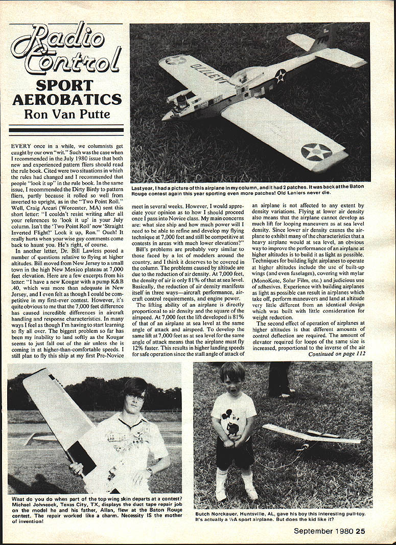 SPORT AEROBATICS Ron Van Putte EVERY once columnists get caught own wit Such case recommended July 1980 issue both new experienced pattern fliers should read rule book Cited two situations rules changed recommended people look up rule book same issue recommended Dirty Birdy pattern fliers partly because rolled well inverted upright Two Point Roll Well Craig Arcari Worcester MA sent short letter couldnt resist writing after references look up July column Isnt Two Point Roll now Straight Inverted Flight Look up Ron Ouch really hurts wise guy comments come back haunt Hes right course another letter Dr Bill Lawless posed number questions relative flying higher altitudes Bill moved New Jersey small town high New Mexico plateau 7000 feet elevation few excerpts letter have new Kougar pump K&B 40 adequate New Jersey felt though could com petitive first-ever contest However its quite obvious 7000 feet difference has caused incredible differences aircraft handling response characteristics ways feel though Im having start learning fly over biggest problem far has inability land softly Kougar seems just fall out air unless coming higher-than-comfortable speeds still plan fly ship first Pre-Novice meet several weeks However would appre ciate opinion should proceed once pass Novice class main concerns what size ship much power will need able refine develop flying technique 7000 feet still competitive contests areas much lower elevations Bills problems probably very similar faced lot modelers around country think deserves covered column problems caused altitude due reduction air density 7000 feet density air 81% sea level Basically reduction air density manifests itself three waysaircraft performance air craft control requirements engine power lifting ability airplane directly proportional air density square airspeed 7000 feet lift developed 81% airplane sea level same angle attack airspeed develop same lift 7000 feet sea level same angle attack means airplane must fly 12% faster results higher landing speeds safe operation since stall angle attack airplane affected extent density variations Flying lower air density also means airplane cannot develop much lift looping maneuvers sea level density Since lower air density causes air plane exhibit characteristics heavy airplane would sea level obvious way improve performance airplane higher altitudes build light possible Techniques building light airplanes operate higher altitudes include use built-up wings fuselages covering mylar MonoKote Solar Film etc judicious use adhesives Experience building airplanes light possible can result airplanes take off perform maneuvers land altitude very little different identical design built little consideration weight reduction second effect operation airplanes higher altitudes different amounts control deflection required amount elevator required loops same size increased proportional inverse air Continued page 112 September 1980 25 Lastyear picture otthis airplane mycolumn 2 patches Itwas backatthe Baton Rouge contest again year sporting patches Old Laniers never die 4 Wnat part top wing skin departs contest Michael Johncock Texas City TX displays duct tape repair job model father Allan flew Baton Rouge contest repair worked like charm Necessity IS mother inventionl Butch Norckauer Huntsville AL gave boy interesting pull-toy Its actually 1/2A sport airplane does kid like WHEELS CONTROL-UNEFREE-FUGHT SCALE PILOTS CYUNDERS ENGINE KITS MACHINE GUN KITS PLASTIC DISPLAY MODELS SEND $1 FOR COMPLETE ILLUSTRATED CATALOG DEPT MA PAWNEE ST SAN MARCOS CA 9 VINTAGESMOOTHGOLDEN AGENEW sizes21/3CONTOURsizes214BALLOON 3431/i"234 31/i 13341314 133h2hz4/ 11443/i114334 11/44%31451/4 11451144s/ 11/i53 156/a214514 1/a6A AiMs sliding clearance mentioned above time hold-down tabs attached excess length extending below deck level assembly should tried its fit fuselage careful windshield rear closure correct height slide blocks ride size 1/32 diameter music wire laminated after groove filed both matching cemented surfaces groove will followed #60 drill sharp end piece freshly cut 1/32 wire Make least ten thesewell oversize may trimmed have wire hole parallel perpendicular edges After assembly checked fitting fuselage deck wise establish guide wire positions attach slider blocks working workboard fixture Once satisfaction can mask transparent sections paint frames Canopy frames painted using aluminum pig mented dope masked cellophane scotch tape Mounting fuselage becomes simple task can done last item final assembly RC Aerobatics/Van Putte continued page 25 purchased local electronics store $230 figure Im worth ground lug went under transformer mounting screw show elsewhere column Gerrys convinced Future lots charger will have charger short-circuit reverse-polarity protected batteries arent Five minutes hooked up backwards wont destroy bat teries 5 hours will right save Observations experiences MEN C-50/4 charger I The charger usually goes High rate charging few minutes no matter much have used batteries doesnt happen immediately Sometimes takes 30 seconds switch take place 2 If need reassurance charger really working two ways initiate High rate charging recommended way c batteries charger plug charger 110 VAC supply alterna tive Ivc using ill effects momentarily connect charger pack polarity reversed High rate usually comes plug charger correctly after treatment 3 This great last charger As examplc last Saturday spent morning yard helicopter came lunch plugged system C-50/4 lunch over ready continue flying half-hour charger puts back about charge 4 The trickle charger great too leave helicopter connected time its always fully charged ready go 5 If charger seems noisy tighten screws bend side-plates little Its quiet everything tight 6 Heres Gerry Jarvis Always dis connect charger before turning RC system might unlucky enough have switch makes up system before releases charger case high voltage charger might damage system 7 How about dont nee