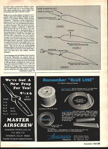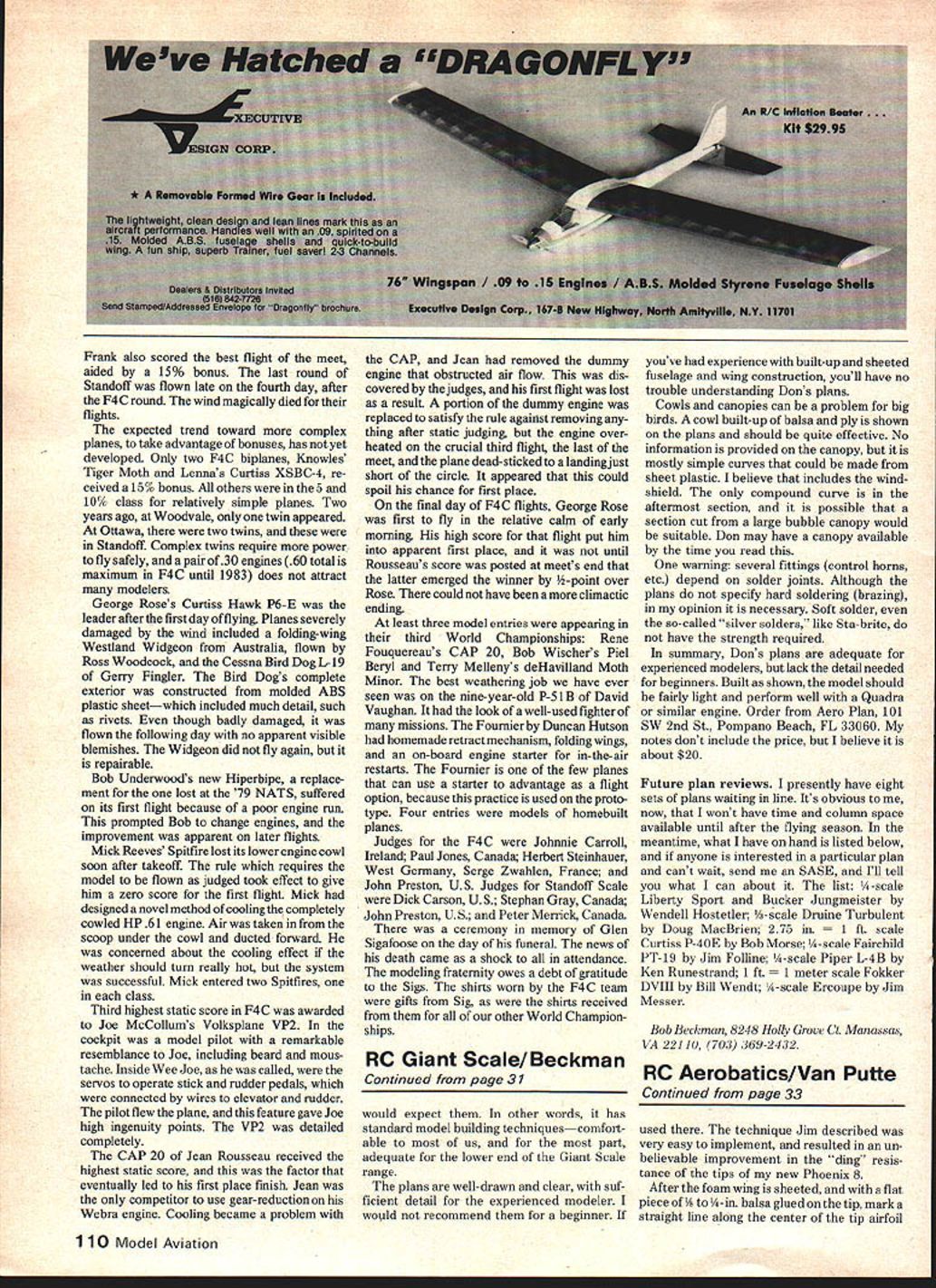 SPORT AEROBATICS Ron Van Putte IN THE June 1980 column asked Charlie Bair Milt Sanders co-designers Zonker RC canard airplane let hear Well Milt Sanders called let know hes stationed England AFB Louisiana Charlie Bair stationed Vance AFB Oklahoma Milt says has some Zonker kits sale fuselage kit fabricated Ralph White Fliteglas Models high quality fuselages anyone would like informa tion about getting Zonker details Bairs Sanders experience unique air plane write Milt Sanders 708 Fendler Parkway Pineville LA 71360 received letter Doug Dahlke Oshkosh WI regarding April 1980 column stated constant pitch prop tends advance distance equal prop pitch revolution prop Doug dis agrees An excerpt what wrote follows prop doesnt tend advance distance equal prop pitch know theory offwoy way off aint close Lets take Fox 35a very common engineand put 10 x 6 Top Flite prop use Fox SuperFuel RC sport ship would expect top speed around 80 mph Yet Dukes rated rpm 9500 shouldnt over 56 mph 100% efficiency Yes know engines unload air Ive never heard 60% unloading air would appreciate whatever comments care make fact model planes fly bunch faster prop pitch suggests could should didnt really want get technical discussion propellers work doesnt seem way out Perhaps can clear air three diagrams cross section propeller simple airfoil Figure 1 three arrows figure demon strate three different conditions first commonthe airfoil developing lift thrust air moving across airfoil direction shown air moves second case lift produced zero air moving across airfoil third case negative lift produced course airplane must produce sufficient thrust overcome drag will slow down means second third cases pertinent discussion can ignored Lets take look propeller turning over airplane rest airflow relative propeller shown Figure 2 Note airflow opposite direction rota tion propeller Now lets look what happens airplane moving forward airflow due forward motion added vectorially airflow due rotation obtain direction total airflow relative propeller Figure 3 Note speed increased angle total airflow vector changes will eventually reach zero thrust angle airplane could go fast enough course way make propeller turn faster effect forward motion would reduced airplane could go faster before zero thrust speed reached limiting factor propeller speed drag produced propeller Consequently lot work has done blade shape airfoil cross section reduce drag Lets back up bit airplane rest fixed-pitch prop high drag situ ation engine bogs down trying turn rotational speed maximum engine power output However airplane moves forward angle attack prop sees reduced drag goes down engine capable turning prop faster unloading situation keeps changing until thrust produced prop equal airplane drag maximum speed air plane fuel engine prop suppose glow plug combination Everything else being equal way increase airplane speed working propeller Now lets go back Dougs disagreement statement about prop tending advance distance equal prop pitch revolution airplane moved faster what would expect based prop pitch propeller would negative thrust region airplane would have slow down So what wrong Dougs example nothing wrong example except engine must unloading sufficiently permit engine rotational speed reach necessary value dont get something nothing other explanation can come up would physically impossible Part reason confusion about unloading phenomenon several engine manufacturers conservative about report32 Model Aviation Mr Smooth Don Lowe readies eighth famous series rnoenlx airplanes prettiest best flier too nnaiiun lignieri wings rreeiaIIs too iving orrrneratortne land- Uaption seen thewing model made castaway bits pieces New Orleans contest ing engine performance during static test suspect Fox ever other manufacturers report engine rpm high side confusion results subject engines heres another tidbit Rudder Brudder pub lished Sentral illinois Radio Society newsletter Vibration larger displacement engines comes mass single piston solution lies lightening piston reduce mass can best accom plished drilling multitude lightening holes though top piston may find will have decreasing effect compression engine lithe cylinder tightly clamped large vise overnight will find c6mpression has greatly restored use little trick engines have terrific compression engine head removed Another method counteract mass single piston overbalance prop blade opposite piston can done Scotch-taping fishing weights back side blade attach front looks bad hope find tips helpful Rudder Brudder chatting Jim Medley Conyers GA Huntsville AL contest asked ilL intersted building ideas column course always am proceeded tell about technique usese wing horizontal stabilizer tips alleviate effects hangar rash familiar damaged tips result bump ing relatively soft balsa usually Continued page 110 November 1980 33 Frank also scored best flight meet aided 15% bonus last round Standoff flown late fourth day after F4C round wind magically died flights expected trend toward complex planes take advantage bonuses has yet developed Only two F4C biplanes Knowles Tiger Moth Lennas Curtiss XSBC-4 re ceived 15% bonus others 5 10% class relatively simple planes Two years ago Woodvale twin appeared Ottawa two twins Standoff Complex twins require power fly safely pair of30 engines 60 total maximum F4C until 1983 does attract modelers George Roses Curtiss Hawk P6-E leader after first day flying Planes severely damaged wind included folding-wing Westland Widgeon Australia flown Ross Woodcock Cessna Bird Dog L-19 Gerry Fingler Bird Dogs complete exterior constructed molded ABS plastic sheetwhich included much detail such rivets though badly damaged flown following day no apparent visible blemishes Widgeon did fly again repairable Bob Underwoods new Hiperbipe replace ment lost 79 NATS suffered its first flight because poor engine run prompted Bob change engines improvement apparent later flights Mick Reeves Spitfire lost its 