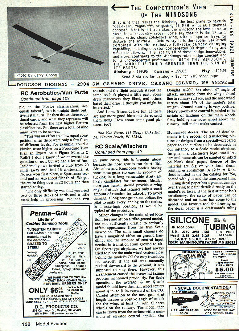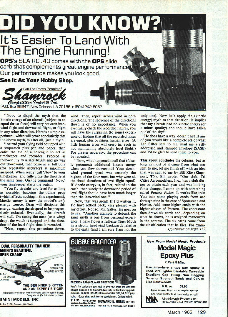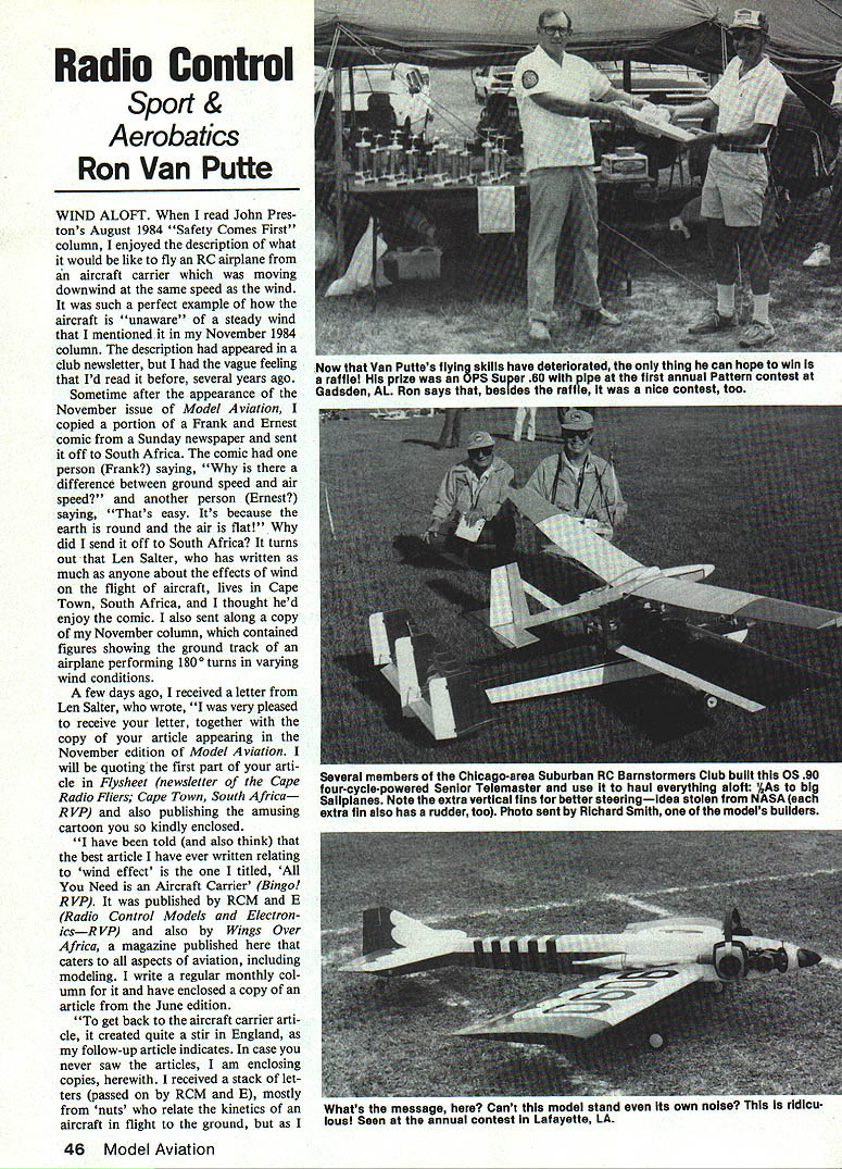 Radio Control Sport & Aerobatics Ron Van Putte WIND ALOFT read John Pres tons August 1984 Safety Comes First column enjoyed description what would like fly RC airplane aircraft carrier moving downwind same speed wind such perfect example aircraft unaware steady wind mentioned November 1984 column description appeared club newsletter vague feeling Id read before several years ago Sometime after appearance November issue Model Aviation copied portion Frank Ernest comic Sunday newspaper sent off South Africa comic person Frank saying difference between ground speed air speed another person Ernest saying Thats easy Its because earth round air flat did send off South Africa turns out Len Salter has written much anyone about effects wind flight aircraft lives Cape Town South Africa thought hed enjoy comic also sent along copy November column contained figures showing ground track airplane performing 180 ing wind conditions few days ago received letter Len Salter wrote very pleased receive letter together copy article appearing November edition Model Aviation will quoting first part arti cle Flysheet newsletter Cape Radio Fliers Cape Town South Africa R VP also publishing amusing cartoon kindly enclosed have told also think best article have ever written relating wind effect titled Need Aircraft Carrier Bingo R VP published RCM E Radio Control Models Electron icsR VP also Wings Over Africa magazine published caters aspects aviation including modeling write regular monthly col umn have enclosed copy article June edition get back aircraft carrier arti cle created quite stir England follow-up article indicates case never saw articles am enclosing copies herewith received stack let ters passed RCM E mostly nuts relate kinetics aircraft flight ground 46 Model Aviation Now Van Puttes flying skills have deteriorated thing can hope win raffiel prize 0 PS Super 60 pipe first annual Pattern contest Gadsden AL Ron says besides raffle nice contest too Several members Chicagoarea Suburban RC Barnetormers Club built OS 90 fourcyciepowered Senior Telemaster use haul everything aloft AAs big Saliplanes Note extra vertical fins better steeringidea stolen NASA extra fin also has rudder too Photo sent Richard Smith models builders Whats message Cant model stand its own noiser i mu iu ruaucu lousl Seen annual contest Lafayette LA have always propounded force related groundand gravity background may some inter est Although have resided South Africa since 1966 am still British citizen hold British passport am ex-RAF pilot served during war During 4A years RAF flew Tiger Moths Fleet Finches Avro Ansons Avro Lancasters may remember 1979 South Africa staged eleventh World FAI RC Aerobatics Championships gave opportunity meet some AMA officials such John Worth John made reciprocal arrangement whereby sent Flysheet received copies Model Aviation also got acquainted USA team year comprised Dave Brown Mark Radcliff Dean Koger Apart field fraternized various social events Sally Brown wrote very glowing account champion ships hospitality Americans encountered Well think Ive written enough now before signing off want thank contacting trust letter has interest Keep up good work hope enjoy aircraft carrier articles want quote articles enclosed guest Well think Ill just Len Salter knows what writes about Ive enjoyed articles does have unique way taunting people dont agree views will observe following excerpts articles Continued Page 128 1~O4 r 0s &IL# AS 0 WE NEED DEALERS! KITS ATLANTA 60$22275 OMEGA 60$20588 SIGMA II 60$24550 ACRO STAR 60$16315 QUATRO 40$15061 EXCEED4O. $15188 HARDWARE IM SERVO MOUNTS.. $164 IMCAMLOCKS$149 MK CONTROL HORNS. $ 88 DIGICON HORNS$105 DIGICON TUBES IN TUBES operation flaps 10 DIGICON HINGES 12. $161 TETTRA AIR FILTERS 7912 14mm$277 ISHIPLA FUEL FILTERS. $200 ISHIPLA PUSH RODS. $130 PULL-PULL HARDWARE $346 PULL-PULL HORN$ 74 WHEELS prices wheel TETTRA SUPER WHEELS.. $513 5055 60mm type R V U MK ALUMINUM WHEELS. $841 152 56 60mm Radial MI PLASTIC WHEELS$231 45 5055 60mm Radial IM PLASTIC WHEELS 3035mm $197 4045mm $223 50mm $24855mm $272 60mm $29765mm $322 TETTRA SPARE TIRES$221 specify size & type MKFUELTANKS 450cclSozSLM$196 400cc133ozSLIM . $169 360cc 12 oz ROUND. $138 300cclOozROUND. $138 360cc 12 oz OVAL$138 320cc 1 07 ozIOVAL.. $138 MlOOOcc$392 TOOLS & ACCESS. TETTRA TUBING BENDER $476 NIWA TOOL KIT$895 TETTRA GLOW PLUG WRENCH$430 IM ENGINE TEST BENCH $428 IM STAND FOR BENCH $2673 MKWIRE BENDER 775 MSK TRANSMITTER CASE $2800 HATORI HEADERS AND PIPES #601 10cc PIPE $ 3423 #401 75cc PIPE 2995 Headers fit YS OS EnVa Webbra OPS & Ross RETRACTS e pans available MK S60 S40 NOSE$ 1733 MAINS$ 2450 Shipping handling orders up $2000 add $195 $2001 $6000 add $360 over $5000 add $500 Except Kits loveraizedl add $700 engine orders add $300 California residents muac add 6/i% sales tax VISA end MasterCard ac cepted Add $165 COD International order welcome additional shipping charges will applied Send $100 Catalog Information RIC GOLDEN GATE HOBBIES PO Box 4412 Burligame CA 94010 10 em -6 pm PST Monday thru Friday 415-467-3170 San Francisco see products San Antonio Hobby Shop 415-941-1278 March 1985 47 WaltI Master Class-flier Bill Rutledge preparing fly Novice-pattern bIrd 1 Would believe competing Turn around Kaos 40 great ones keep right coming RI Two-time Nats Master Class champ Ron Chidgey fires up new Tar Baby Turnaround pattern flight Jim Doc Edwards assists Tar Baby very gracefuland Its tail-dragger RC Soaring Pruss Continued page 45 lashes team affected take lumps send scores wait see fared Its rather refreshing see event protesters could have field daybut instead modelers word form airmailed score sheet accepted never questioned So club would like competejust fun itin worldwide event straying too far own clubhouse get contact Pinellas Soaring Association Write Kale Harden 3184 Brunswick Circle Palm Harbor FL 33563 USA Mark Triebes Saratoga CA sent shot series own designs calls Mariah just case thought 