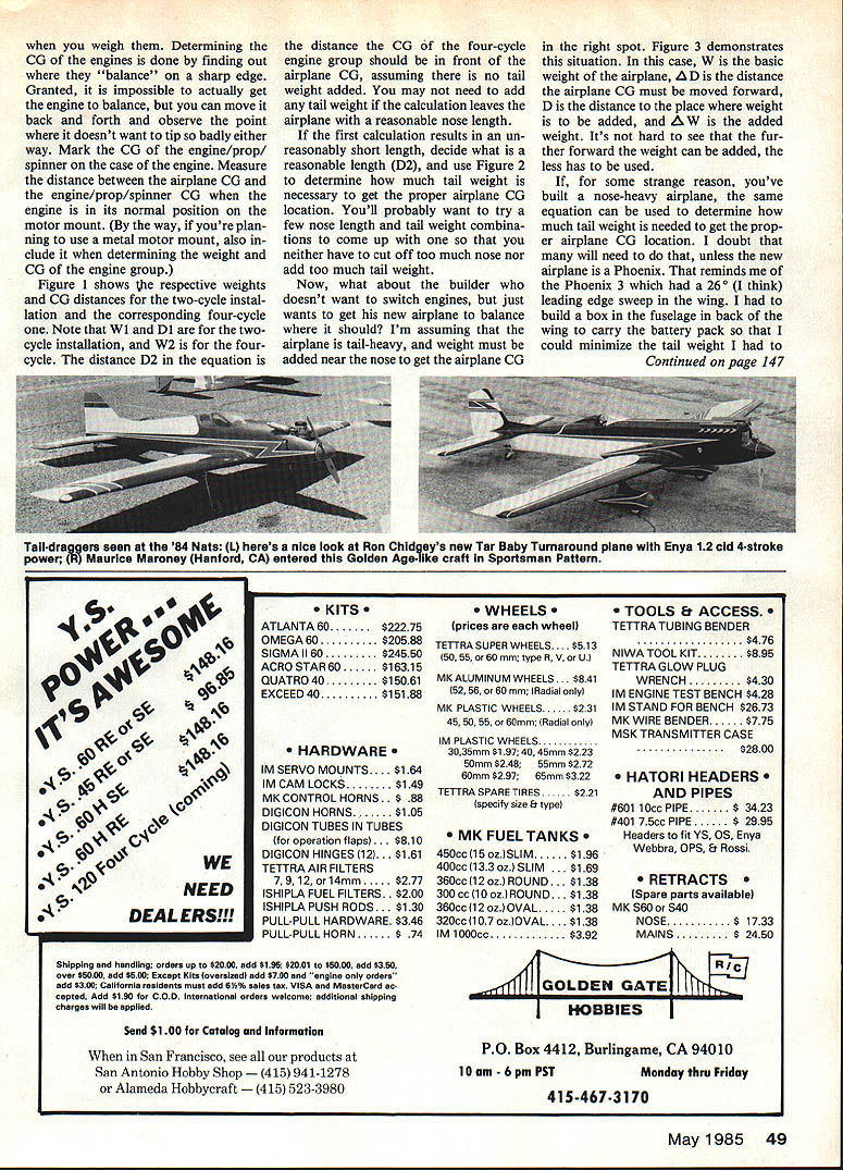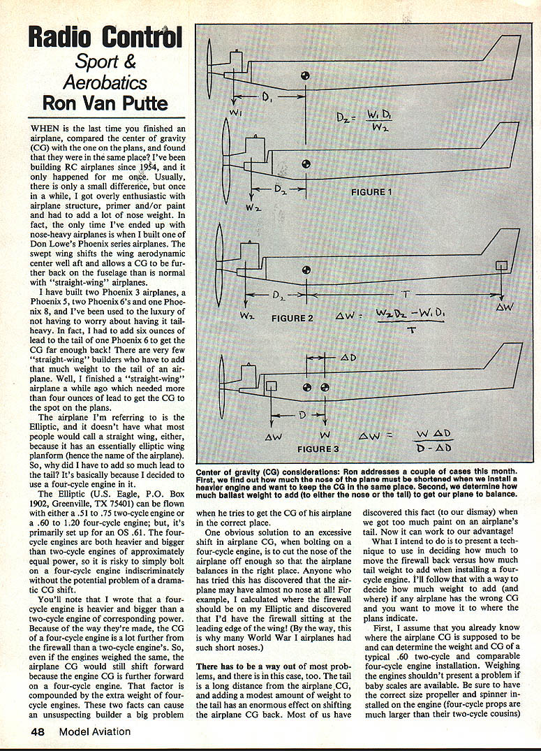 Radio Contrbl Sport & Aerobatics Ron Van Putte WHEN last time finished airplane compared center gravity CU the pians found same place Ive building RC airplanes since i94 happened once Usually small difference once got overly enthusiastic airplane structure primer and/or paint add lot nose weight fact time Ive ended up nose-heavy airplanes built Don Lowes Phoenix series airplanes swept wing shifts wing aerodynamic center well aft allows CU fur ther back fuselage normal straight-wing airplanes have built two Phoenix 3 airplanes Phoenix 5 two Phoenix 6s Phoe nix 8 Ive used luxury having worry about having tailheavy fact add six ounces lead tail Phoenix 6 get CU far enough back very few straight-wing builders have add much weight tail air plane Well finished straight-wing airplane ago needed four ounces lead get CU spot plans airplane Im referring Elliptic doesnt have what people would call straight wing either because has essentially elliptic wing planform hence name airplane So did have add much lead tail Its basically because decided use four-cycle engine Elliptic US Eagle PO Box 1902 Ureenville TX 75401 can flown either 51 75 two-cycle engine 60 120 four-cycle engine its primarily set up 05 61 fourcycle engines both heavier bigger two-cycle engines approximately equal power risky simply bolt four-cycle engine indiscriminately potential problem drama tic CU shift Youll note wrote fourcycle engine heavier bigger two-cycle engine corresponding power Because way theyre made CU four-cycle engine lot further firewall two-cycle engines So engines weighed same airplane CU would still shift forward because engine CU further forward four-cycle engine factor compounded extra weight fourcycle engines two facts can cause unsuspecting builder big problem tries get CU airplane correct place obvious solution excessive shift airplane CU bolting four-cycle engine cut nose airplane off enough airplane balances right place Anyone has tried has discovered air plane may have almost no nose example calculated firewall should Elliptic discovered Id have firewall sitting leading edge wing way World War airplanes such short noses has way out prob lems case too tail long distance airplane CU adding modest amount weight tail has enormous effect shifting airplane CU back Most us have discovered fact dismay got too much paint airplanes tail Now can work advantage What intend to present tech nique use deciding much move firewall back versus much tail weight add installing fourcycle engine ill follow way decide much weight add airplane has wrong CU want move plans indicate First assume already know airplane CU supposed can determine weight CU typical 60 two-cycle comparable four-cycle engine installation Weighing engines shouldnt present problem baby scales available sure have correct size propeller spinner stalled engine four-cycle props much larger two-cycle cousins 48 Model Aviation FitI Center gravity CG consideratIons Ron addresses couple cases month First find out much noec p ian must shortened instaii heavier engine want keep CG same piace socond determine much baliast weight add either nose tall get piane baiance weigh Determining CG engines done finding out balance sharp edge Granted impossible actually get engine balance can move back forth observe point doesnt want tip badly either way Mark CG engine/prop spinner case engine Measure distance between airplane CG engine/prop/spinner CG engine its normal position motor mount way youre plan ning use metal motor mount also clude determining weight CG engine group Figure 1 shows respective weights CG distances two-cycle instal lation corresponding four-cycle Note Wi Dl twocycle installation W2 fourcycle distance D2 equation distance CG four-cycle engine group should front airplane CG assuming no tail weight added may need add tail weight calculation leaves airplane reasonable nose length first calculation results un reasonably short length decide what reasonable length D2 use Figure 2 determine much tail weight necessary get proper airplane CG location Youll probably want try few nose length tail weight combina tions come up neither have cut off too much nose nor add too much tail weight Now what about builder doesnt want switch engines just wants get new airplane balance should Im assuming airplane tail-heavy weight must added near nose get airplane CG right spot Figure 3 demonstrates situation case W basic weight airplane stance airplane CG must moved forward D distance place weight added W added weight Its hard see fur ther forward weight can added less has used some strange reason youve built nose-heavy airplane same equation can used determine much tail weight needed get prop er airplane CG location doubt will need unless new airplane Phoenix reminds Phoenix 3 260 think leading edge sweep wing build box fuselage back wing carry battery pack could minimize tail weight Continued page 147 Talldraggers seen 84 Nate L heres nice look Ron Chidgeys new Tar Baby Turnaround plane Enya 12 old 4stroko power R Maurice Maroney Hanford CA entered Golden AgelIke craft Sportsman Pattern c4 4Cy 4C3 S WE NEED DEALERS! KITS ATLANTA 60$22275 OMEGA 60$20588 SIGMA 1160$24550 ACRO STAR 60$16315 QUATRO 40$15061 EXCEED4O .. $15188 HARDWARE IM SERVO MOUNTS.. $164 IM CAM LOCKS $149 MKCONTROLHORNS. $ 88 DIGICON HORNS $105 DIGICON TUBES IN TUBES operation flaps 10 DIGICON HINGES 12. $161 TETTRA AIR FILTERS 7912 14mm$277 ISHIPLA FUEL FILTERS. $200 ISHIPLA PUSH RODS. $130 PULL-PULL HARDWARE $346 PULL-PULL HORN$ 74 WHEELS prices wheell TETTRA WHEELS.. $513 5055 60mm type R V U MK ALUMINUM WHEELS. $841 152 56 60mm Radial MK PLASTIC WHEELS 31 4550 55 60mm Radial IM PLASTIC WHEELS 3035mm $1 97 40 45mm $223 50mm $24855mm $272 60mm $29765mm $322 TETTRA SPARE TIRES$221 Ispecify size 8 type MKFUELTANKS 4SOccllSozISLIM 196 400cc1133ozISLIM . $169 360cc 112 oz ROUND. $138 300cclOozIROUND. $138 360cc 112 ozl OVAL$138 320cc 11 07 ozIOVAL.. $138 IMlOOOcc $392 TOOLS & ACCESS. TETTRA TUBING BENDER $476 N