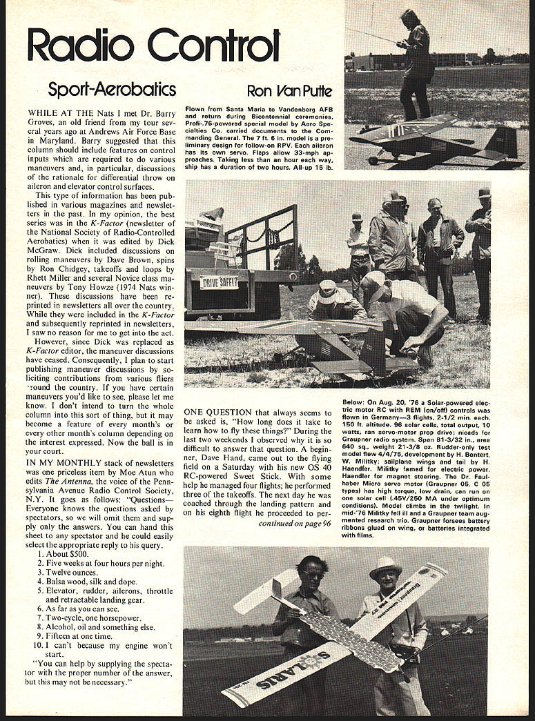 Radio Control Spori-Aerobalics WHILE AT THE Nats met Dr Barry Groves old friend tour sev eral years ago Andrews Air Force Base Maryland Barry suggested column should include features control inputs required various maneuvers particular discussions rationale differential throw aileron elevator control surfaces type information has pub lished various magazines newslet ters past opinion best series K-Factor newsletter National Society Radio-Controlled Aerobatics edited Dick McGraw Dick included discussions rolling maneuvers Dave Brown spins Ron Chidgey takeoffs loops Rhett Miller several Novice class ma neuvers Tony Howze 1974 Nats win ner discussions have re printed newsletters over country included K-Factor subsequently reprinted newsletters saw no reason get act However since Dick replaced K-Factor editor maneuver discussions have ceased Consequently plan start publishing maneuver discussions liciting contributions various fliers round country have certain maneuvers youd like see please let know dont intend turn whole column sort thing may become feature months other months column depending interest expressed Now ball court IN MY MONTHLY stack newsletters priceless item Moe Atun edits Antenna voice Penn sylvania Avenue Radio Control Society NY goes follows Questions Everyone knows questions asked spectators will omit sup ply answers can hand sheet spectator could easily select appropriate reply query 1 About $500 2 Five weeks four hours per night 3 Twelve ounces 4 Balsa wood silk dope 5 Elevator rudder ailerons throttle retractable landing gear 6 As far can see 7 Two-cycle horsepower 8 Alcohol oil something else 9 Fifteen time 10 I cant because engine wont start can help supplying specta tor proper number answer may necessary Ron Van Putte Flown Santa Maria Vandenberg AFB return during Bicentennial ceremonies Profi-76-powered special model Aero Spe cialties Co carried documents Com manding General 7 ft 6 model pre liminary design follow-on RPV aileron has its own servo Flaps allow 33-mph ap proaches Taking less hour way ship has duration two hours All-up 16 lb ONE QUESTION always seems asked long does take learn fly things During last two weekends observed difficult answer question begin ner Dave Hand came out flying field Saturday new 05 40 RC-powered Sweet Stick some help managed four flights performed three takeoffs next day coached through landing pattern eighth flight proceeded percon tinued page 96 Below On Aug 20 76 Solar-powered elec tric motor RC REM on/off controls flown Germany3 flights 2-1/2 mm 150 ft altitude 96 solar cells total output 10 watts ran servo-motor prop drive nicads Graupner radio system Span 81-3/32 in. area 640 sq. weight 21-3/8 oz Rudder-only test model flew 4/4/76 development H Bentert W Militky sailplane wings tail H Haendler Militky famed electric power Haendler magnet steering Dr Faul haber Micro servo motor lGraupner 05 C 05 types has high torque low drain can run solar cell l45V/250 MA under optimum conditions Model climbs twilight mid-76 Militky fell ill Graupner team aug mented research trio Graupner forsees battery ribbons glued wing batteries integrated films Nothing Fancy/Sexton continued page 9 center LE IE LE /8 higher TE have about degree 5 Now sure tips equal dis tance tip bottom wing 6 Epoxy wire cabane cores few spots let dry remove fuselage Remove clamps epoxy wire outside cover cores Clamp needed 7 Finish sanding paint strut suit HIGH PERFORMANCE COMPETITION PROVEN THIN RIGID BLADES OF HARD MAPLE WOOD SUPERBLY FINISHED COMPLETELY FUEL PROOF SPECIAL PRO SERIES 2 FOR RCFREE FLIGHT CONTROL LINE DIA PITCHPRICE 553485 63485 733/4110 8316456115 9456775125 10467130 106W 8W130 10SEW135 1146775 757168145 116EW150 11567150 126155 125W160 1356195 1456225 1556275 16456350 W WIDEBLADE EW EXTRAWIDE SERIES 400 8 FOR SPEED & RACING ADVANCED DESIGN NO 1 IN PYLON RACING LEADING SPEED RECORD HOLDER OP ALL TIMES RC PYLON RACING DIA PITCHPRICE 5%3164110 758125 75N SN126 8166577%150 96%77A150 CONTROL LINE SPEED& RACING DIAPITCHPRICE 4%6%110 4%55%110 6788%120 771610511125 88135 8SN 9%N135 8%77%140 91213150 N NARROW 4 8 Epoxy slow setting cabane struts fuselage wings attached step #3 Temporarily insert cross braces before attaching top wing 9 After epoxy has dried epoxy cross braces place 10 All sounds tricky really bad Study what going before starting steps Outer Wing Struts 1 Cut four /o X a strips length equal distance between wings plus inch 2 Mark /2 end insert four top bottom wings Slide struts up down until mark flush wing surface 3 Now mark /o X surfaces intersect location angle placing 1/16 alsa box around strut 4 Add 1/16 X shown Sheet #2 5 Sand paint suit re movable dont glue wings Fling Assuming radio equipment tank etc installed ready begin flying phase project 1 Check horns hinges bolts tightness 2 Check surfaces binding ex cess play 3 Try out engine before going out first flights 4 Set surfaces minimum control throw 5 Begin few taxi rolls get feel steering 6 For takeoff roll hold about l up travel l right travel rudder ad vance throttle slowly correcting turn rudder needed throttle will probably off ground flying Nothing Fancy extremely stable landing approach very slow speeds Make first landing good speed until have determined slow can go After first few flights increased elevator throw moving link up hole horn necessary very slow landings keep nose up After 100 flights no other changes kind have made changes made next Nothing Fancy will bolted top wing side mounted cowled-in engine changes will certainly help ap pearance lessen drag will probably add weight would critical plane build Nothing Fancy lieve will find little fancier name implies Good luck good flying RC Sport/Van Putte continued page 15 form three touch-and-go landings finally nicked prop fourth land ing next weekend flying no occasional suggestions instructor long did take learn fly like rest us probably took several months repair jobs Some people never seem learn manage landing haple