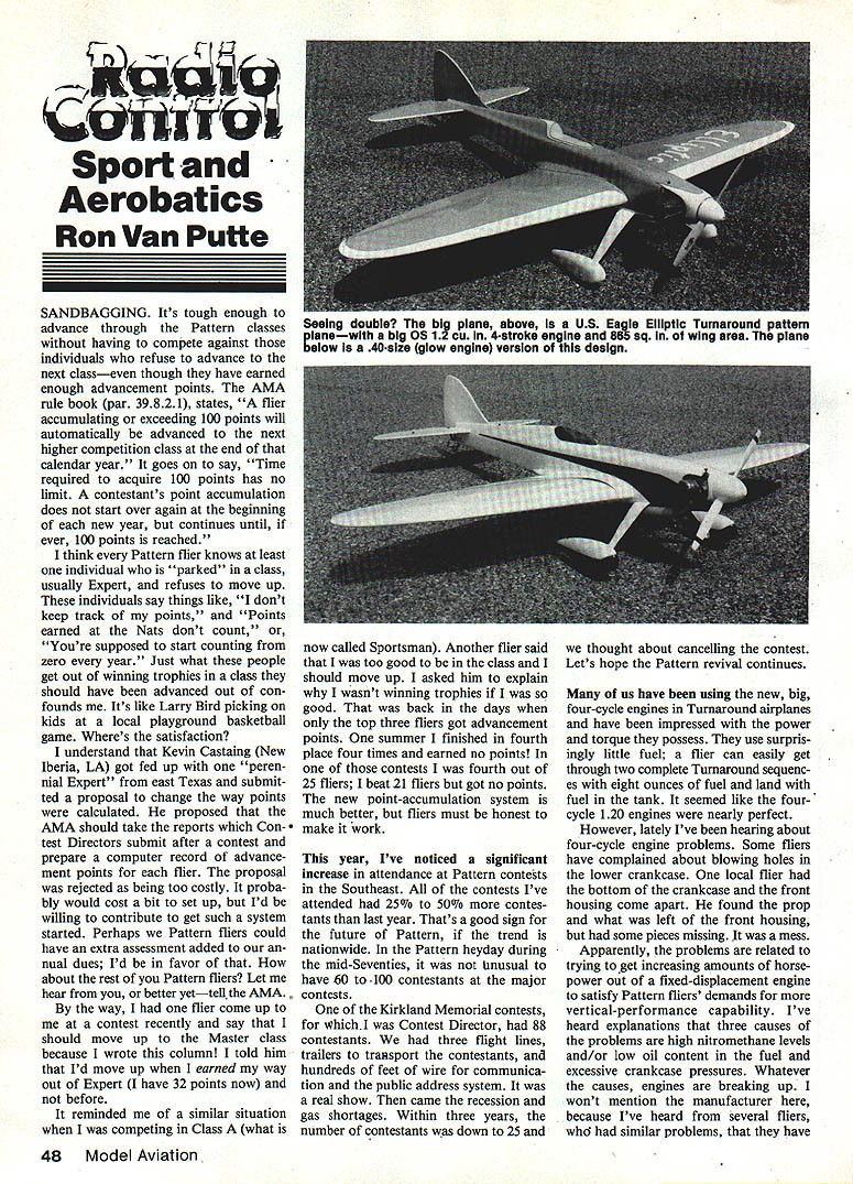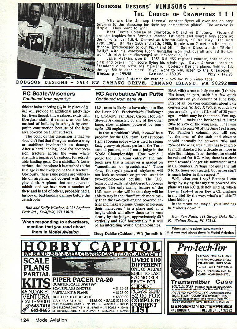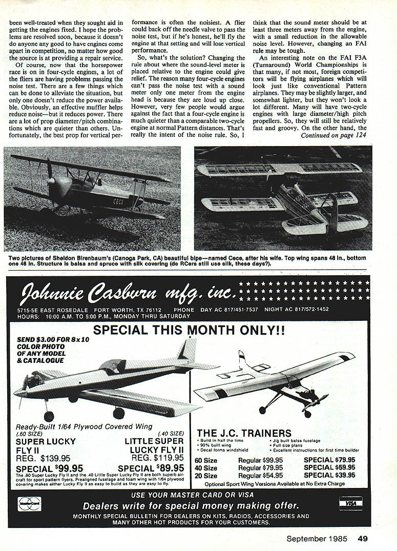 Sport Aerobatics Ron Van Putte SANDBAGGING Its tough enough advance through Pattern classes having compete against individuals refuse advance next classeven though have earned enough advancement points AMA rule book par 39821 states flier accumulating exceeding 100 points will automatically advanced next higher competition class end calendar year goes say Time required acquire 100 points has no limit contestants point accumulation does start over again beginning new year continues until ever 100 points reached think Pattern flier knows least individual parked class usually Expert refuses move up individuals say things like dont keep track points Points earned Nats dont count Youre supposed start counting zero year Just what people get out winning trophies class should have advanced out con founds Its like Larry Bird picking kids local playground basketball game Wheres satisfaction understand Kevin Castaing New Iberia LA got fed up peren nial Expert east Texas submit ted proposal change way points calculated proposed AMA should take reports Contest Directors submit after contest prepare computer record advance ment points flier proposal rejected being too costly proba bly would cost bit set up Id willing contribute get such system started Perhaps Pattern fliers could have extra assessment added nual dues Id favor about rest Pattern fliers Let hear better yettell AMA. way flier come up contest recently say should move up Master class because wrote column told him Id move up earned way out Expert have 32 points now before reminded similar situation competing Class what now called Sportsman Another flier said too good class should move up asked him explain wasnt winning trophies good back days top three fliers got advancement points summer finished fourth place four times earned no points contests fourth out 25 fliers beat 21 fliers got no points new point-accumulation system much better fliers must honest make work year Ive noticed significant increase attendance Pattern contests Southeast contests Ive attended 25% 50% contes tants last year Thats good sign future Pattern trend nationwide Pattern heyday during mid-Seventies Unusual have 0 100 contestants major contests Kirkland Memorial contests WhichI Contest Director 88 contestants three flight lines trailers transport contestants hundreds feet wire communica tion public address system real show came recession gas shortages Within three years number contestants down 25 thought about cancelling contest Lets hope Pattern revival continues us have using new big four-cycle engines Turnaround airplanes have impressed power torque possess use surpris ingly little fuel flier can easily get through two complete Turnaround sequenc es eight ounces fuel land fuel tank seemed like four cycle 120 engines nearly perfect However lately Ive hearing about four-cycle engine problems Some fliers have complained about blowing holes lower crankcase local flier bottom crankcase front housing come apart found prop what left front housing some pieces missing mess Apparently problems related trying get increasing amounts horse power out fixed-displacement engine satisfy Pattern fliers demands vertical-performance capability Ive heard explanations three causes problems high nitromethane levels and/or low oil content fuel excessive crankcase pressures Whatever causes engines breaking up wont mention manufacturer because Ive heard several fliers whd similar problems have 48 Model Aviation Seeing double big plane above US Eagle Elliptic Turnaround pattern pianewith big 05 1 2cu 4-stroke engine 865 sq wing area plane beiow 4Oslze glow engine version design well-treated sought aid getting engines fixed hope prob lems resolved soon because doesnt anyone good have engines come apart competition no matter good source providing repair service course now horsepower race four-cycle engines lot fliers having problems passing noise test few things can done alleviate situation doesnt reduce power availa ble Obviously effective muffler helps reduce noisebut reduces power lot prop diameter/pitch combina tions quieter others Un fortunately best prop vertical performance often noisiest flier could back off needle valve pass noise test hes honest hell fly engine setting will lose vertical performance So whats solution Changing rule about sound-level meter placed relative engine could give relief reason four-cycle engines cant pass noise test sound meter meter engine head because loud up close However very few people would argue against fact four-cycle engine much quieter comparable two-cycle engine normal Pattern distances Thats really intent noise rule So think sound meter should least three meters away engine small reduction allowable noise level However changing FAT rule may tough An interesting note FAT F3A Turnaround World Championships foreign competi tors will flying airplanes will look just like conventional Pattern airplanes may slightly larger somewhat lighter wont look lot different will have two-cycle engines large diameter/high pitch propellers So will still relatively fast groovy other hand Continued page 124 Two pIctures Sheldon Birenbaums Canoga Park CA beautiful bipenamed Cece after hit wife Top wing spans 48 bottom 46 Structure balsa spruce siik covering RCers stlli use silk days 40 SIZE LITTLE SUPER LUCKY FLY II REG $11995 SPECIAL S9995SPECIAL S8995 60 Super Lucky Fly 40 Little Super Lucky Fly both superb air cratt br sport pattern flyera Prealigned tusetage toam wing 164 plywood covering makea either Lucky Fly easy build aa easy Ity THE JC TRAINERS Build halt time Jig built balsa tuselage 90% built wing Full size ptans Decal torms windshield Escetlent instructions br tirst time builder September 1985 49 SPECIAL THIS MONTH ONLY! Ready-Built 1/64 Plywood Covered Wing 60 SIZE SUPER LUCKY FLY II REG $13995 60 SizeRegular $9995SPECIAL $7995 40 SizeRegular $7995SPECIAL $5995 20 SizeRegular $5495SPECIAL $3995 Optional Sport Wing Versionsat No Extra Charge DODGSON DESIGN