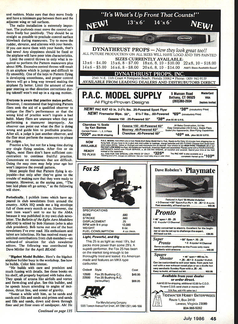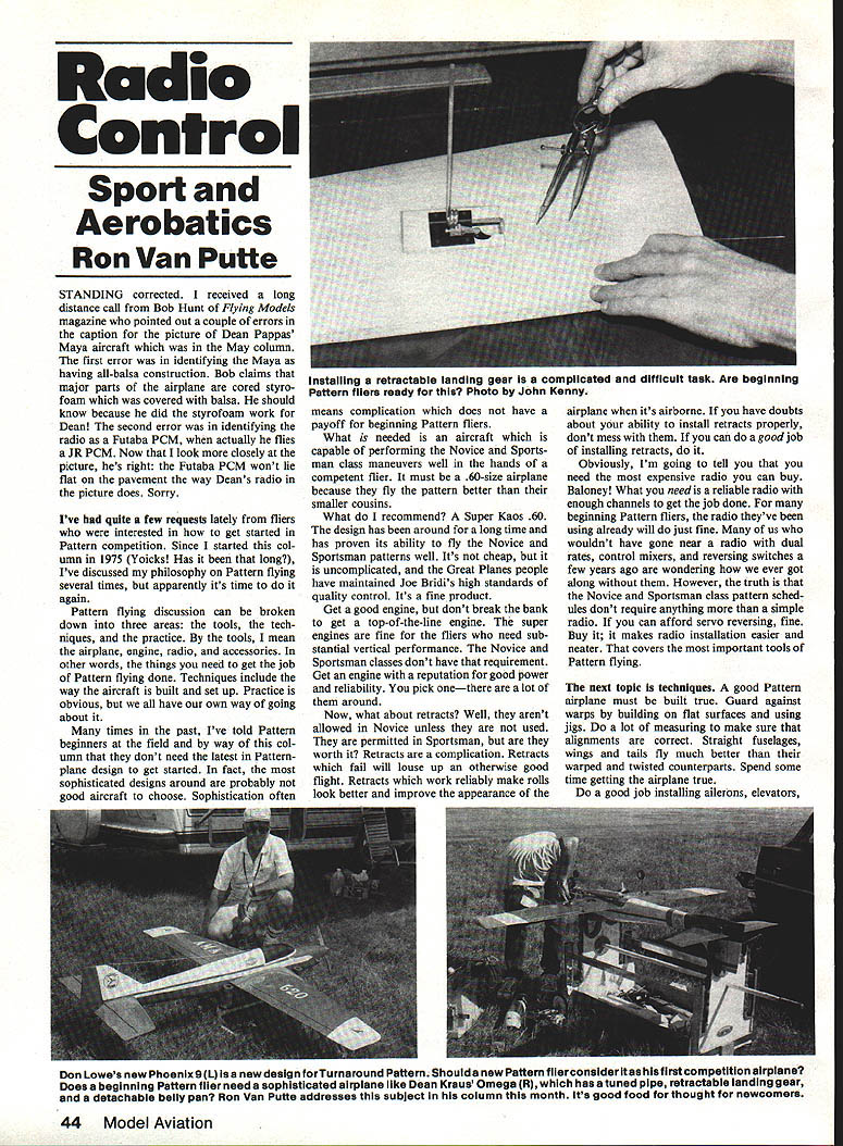 Radio Control Sport Aerobatics Ron Van Putte STANDING corrected received long distance call Bob Hunt Flying Models magazine pointed out couple errors caption picture Dean Pappas Maya aircraft May column first error identifying Maya having all-balsa construction Bob claims major parts airplane cored styro foam covered balsa should know because did styrofoam work Dean second error identifying radio Futaba PCM actually flies JR PCM Now look closely picture hes right Futaba PCM wont lie flat pavement way Deans radio picture does Sorry Ive quIte few requests lately fliers interested get started Pattern competition Since started col umn 1975 Yoicks Has long Ive discussed philosophy Pattern flying several times apparently its time again Pattern flying discussion can broken down three areas tools tech niques practice tools mean airplane engine radio accessories other words things need get job Pattern flying done Techniques include way aircraft built set up Practice obvious have own way going about times past Ive told Pattern beginners field way col umn dont need latest Patternplane design get started fact sophisticated designs around probably good aircraft choose Sophistication often means complication does have payoff beginning Pattern fliers What needed aircraft capable performing Novice Sports man class maneuvers well hands competent flier must 60-size airplane because fly pattern better smaller cousins What recommend Super Kaos 60 design has around long time has proven its ability fly Novice Sportsman patterns well Its cheap uncomplicated Great Planes people have maintained Joe Bridis high standards quality control Its fine product Get good engine dont break bank get top-of-the-line engine super engines fine fliers need sub stantial vertical performance Novice Sportsman classes dont have requirement Get engine reputation good power reliability pick onethere lot around Now what about retracts Well arent allowed Novice unless used permitted Sportsman worth Retracts complication Retracts fail will louse up otherwise good flight Retracts work reliably make rolls look better improve appearance airplane its airborne have doubts about ability install retracts properly dont mess can good job installing retracts Obviously Im going tell you need expensive radio can buy Baloney What need reliable radio enough channels get job done beginning Pattern fliers radio theyve using already will just fine us wouldnt have gone near radio dual rates control mixers reversing switches few years ago wondering ever got along However truth Novice Sportsman class pattern sched ules dont require anything simple radio can afford servo reversing fine Buy it makes radio installation easier neater covers important tools Pattern flying next topIc techniques good Pattern airplane must built true Guard against warps building flat surfaces using jigs lot measuring make sure alignments correct Straight fuselages wings tails fly much better warped twisted counterparts Spend some time getting airplane true good job installing ailerons elevators Don Lowes new Phoenixe L isa new design forTurnaround Pattern Should new Pattern flierconsider itas hisflrst competition airpiane Does beginning Pattern fiier need sophisticated airplane like Dean Kraus Omega R has tuned pipe retractable landing gear detachable belly pan Ron Van Putte addresses subject column month its good food thought newcomers 44 Model Aviation instailing retractable landing gear complicated difficult task Are beginning Pattern fliers ready Photo John Kenny rudders Make sure move freely have minimum gap between adjacent wing tail surfaces radio installation extremely impor tant pushrods must move control sur faces freely positively should straight possible preclude control surface blowback during maneuvers Try move rudder elevator ailerons hands can move hands thats bad news Any sloppiness should fixed airplane will have poor trim characteristics Limit control throws what re quired perform Pattern maneuvers plus about 50% Excessive control throws will result airplane jumpy difficult fly smoothly keys Pattern flying developing smoothness proper control throws will go long way toward making airplane fly better Limit amount nose gear steering direction corrections dur ing takeoff wont end up zig-zag motion Everyone aware practIce makes perfect However recommend beginning Pattern fliers seek aid qualified observer critique fliers performance wrong kind practice wont ingrain bad habit fliers unaware performing maneuver improperly An observer can point out what flier doing wrong guide him profitable practice After judge just another observer flier must perform maneuvers please judges Practice lot long time during single flying session After five six flights fliers dont have sufficient con centration continue fruitful practice Concentrate maneuvers difficult Doing easy ones may help ego wont improve overall pattern Most people find Pattern flying eji joyablebut after theyve gone trouble making sure ready compete However saying goes best laid plans oft go astray following will show PerIodIcally publish items have ap peared club newsletters around country AMA HQ sends big envelope full month However next item wasnt sent AMA because published own club news letter Bulletin Eglin Aero Modellers BEAM edited Bob Hanson also club president Bob turns out best newsletters Ive ever read enthusiasm talent infectious has received un solicited contributions club membersan unheard-of situation club newsletter editors following contributed Dave Mittler April BEAM Blgahot Model Builder Heres bigshot airplane builder busy workshop See builds Color him intense builds care precision much fussing details See books shelf properly baptized balsa dust speak arcana like airfoils vortex form-drag glue See builder spends hours attending angles inci dence thrust line center gravity Sweat him sands sands fills sands primes sands fills sands down down through finer yet finer coats sandpaper Ah Continued pag