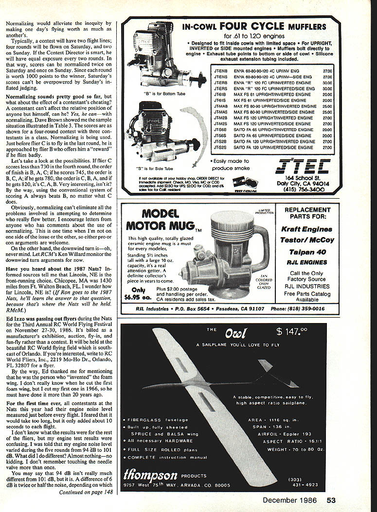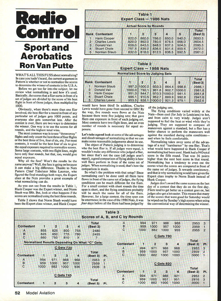 Radio Control Sport Aerobatics Ron Van Putte WHATS ALL THIS FUSS about normalizing case hadnt heard current argument Pattern whether normalize scores to determine winner contests USA Before get too far subject let review what normalizing its used Basically scores flier earns front set judges divided score best flight front judges multiplied 1000 Obviously theres flier involved best flier round front particular set judges gets 1000 points everyone else gets somewhat less After contest over two ways determine winner way use scores rounds highest total wins common way use throwaway flights count best three four flights best three five four six etc contests would best four six give equal exposure required normalize scores Some large contests two flight lines might have four rounds too would give equal exposure fuss Wont results same anyway Well fuss going because can make big difference Thanks Nats Pattern Chief Tabulator Mike Lauman figured final standings both ways Expert class Nats provides great example what normalizing can As can see results Table 1 Hank Cooper Expert winner Norm Staub fifth look what happens scores normalized using best three rounds Table 2 shows Norm Staub would have Expert class winner Hank Cooper itestant ~an Staub Vail Cooper Chale es Lewis would have third addition Charles Lewis would have gone second fifth way five rounds flown Nats because five judging sets gave fliers exposure front judging set Most contests have two flight lines number rounds necessary equal ex posure Lets take good look some advantages disadvantages normalizing can make some reasonable judgements about its use object Pattern judging determine best flier judges equal wouldnt make difference judged flier since thats case judges arent equal good comparison flying ability well fliers perform front same set judges normalizing used thats comparison made So whats problem setup Since normalizing cant done until fliers have flown front same set judges flying conditions can much different fliers small contest short rounds time span short flying conditions probably will much same fliers However large contest time span can enormous case 1986 Nats four days before fliers judged Table B 4 8500 0 8765 8375 8315 8365 ets 5 9791 judging sets flying conditions varied widely Natsfrom cool July Louisiana hot calm very windy Judges arent supposed feel heat wind theyre judging supposed compare maneuvers against standard flier has better chance perform maneuvers well against standard during calm conditions feels comfortable Normalizing takes away some advan tage real bamburner flier Thats what would have happened Hank Cooper normalizing used Hank 940 total score fifth round 36 points higher next best score round Normalizing has tendency out scores scores compared front same set judges rewards consistency normalizing would have given Expert class trophy Norm Staub instead Hank Cooper Judges dont award same scores last day contest first day Fliers tend get better contest goes judges also get lot easier means scores good Saturday would wiped out Sundays high scores using conventional way determining winner 52 Model Aviation ant oper Lewis Vail ThaIe n Staub Normalizing would alleviate inequity making days flying worth much anothers Typically contest will have two flight lines four rounds will flown Saturday two Sunday Contest Director smart will have equal exposure two rounds way scores can normalized twice Saturday once Sunday Since round worth 1000 points winner Saturdays scores cant overpowered Sundays flated judging Normalizing sounds pretty good far what about effect contestants cheating contestant cant affect relative position anyone himself can Yes canwith normalizing Dave Brown showed sample situation illustrated Table 3 scores shown four-round contest three con testants class Normalizing being used Just before flier C fly last round approached flier B offers him reward flies badly Lets take look possibilities flier C scores less 730 fourth round order finish B C scores 745 order B C ifhe gets 780 order C B gets 820 its C B Very interesting isnt way using conventional system scoring always beats B no matter what C does Obviously normalizing cant eliminate problems involved attempting determine really flew better encourage letters anyone has comments about use normalizing time Im side issue other either pro con arguments welcome other hand downwind turn isoh never mind LetRCMs Ken Willardmonitor downwind turn arguments now Have heard about 1987 Nats formed sources tell Lincoln NE front-running choice Chicopee MA 1430 miles Ft Walton Beach FL wonder far Lincoln NE Ron goes 1987 Nats hell learn answer question because thats Nats will held RAIcM Ed Izzo passing out flyers during Nats Third Annual RC World Flying Festival November 27-30 1986 Its billed manufacturers exhibition auction fly-in fun-fly rather contest will held beautiful RC World flying field south east Orlando youre interested write RC World Fliers Inc 2219 Mo-Ho Dr Orlando FL 32807 flyer way Ed thanked mentioning person invented foam wing dont really know cut first foam wing cut first 1966 must have done 20 years ago first time ever contestants Nats year engine noise level measured just before flight feared would take too long added about 10 seconds flight dont know what results rest fliers engine test results confusing told engine noise level varied during five rounds 94dB 101 dB What did different Almost nothingno kidding dont remember touching needle valve once may say 94 dB isnt really much different 101 dB difference 6 dB twice half noise depending Continued page 148 IN-COWL FOUR CYCLE MUFFLERS 61 120 engines Designed fit inside cowls limited space GHT INVERTED SIDE mounted engines lers bolt directly engine ust tube points bottom side cowl cone exhaust extension tubing included Easily made produce smoke avaIIe yosv hobby shop ORDER RRCT hnmedate shmsist ChecI MO Vbci MC COD accepted Add 52h0 tar IP& OO far C00 arId 6% sm tax far C mdsr MODEL MOT