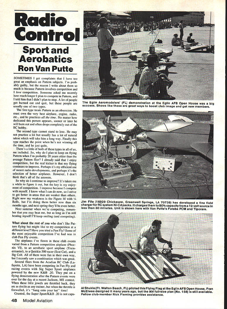 Radio Control Sport Aerobatics Ron Van Putte SOMETIMES get complaints have too great emphasis Pattern subjects Im prob ably guilty reason write about much because Pattern involves competition love competition Someone asked recently much longer plan compete Pattern told him didnt plan stop lot people get burned out quit people usually two types first type treats Pattern obsession must own very best airplane engine radio etc practices rime No matter dedicated person appears sooner later will burn out often drops completely out RC hobby second type cannot stand lose may practice lot usually has lot natural talent will take him long way Finally type reaches point hes winning time just quits Theres little both types us included So plan keep flying Pattern Im probably 20 years older average Pattern flier already said enjoy competition real kicker flying continues improve Perhaps its efficient use recent radio developments perhaps its selection better airplanes However dont think thats answers So continue improve Its taken figure out key enjoy ment competition improve because compete myself know what can now strive get better areas weaker others Right now weakness Figure M /4 Rolls Im doing better now six months ago next spring theyll better Next summer competing remem ber may beat long Im still beating myself Ill keep smiling competing What about rest dont like Pat tern flying might like try competition different level Have tried Fun Fly Some enjoyable competition Ive club Fun Fly events airplanes Ive flown club events varied Pattern competition airplane Phoe nix VI aerobatic sport airplane Train ermaster Quickie 500 racer Scat Cat Sig Colt fun own way recently saw combination great Several fliers Acadian RC Club La fayette LA have competing Fun Fly racing events Sig Super Sport airplanes powered new K&B 20 put flying demonstration after Pattern events over day recent Jackson MS contest little jewels throttled back docile trainer throttle firewalled its hang onto hat time Granted Super Sport/K&B 20 capa 48 Model Aviation Eglin Aeromodelers FL demonstration Eglin AFB Open House big success Shows like great ways boost club image get new members Jim Fife 16929 Chickasaw Greenwell Springs LA 70739 has developed fine field charger RC system Ni-Cd packs charges 80% capacity 12-volt source less 30 mInutes Unit shown Van Puttes Futaba PCM Tiporare Al Shukle Ft Walton Beach FL piloted Flying Flag atthe Eglin AFB Open House Fran McElwee designed years ago MA full-size plan No 15818 still available Fellow club-member Rick Fleming provides assistance Paul VergerLafayette LA replaces left aileron servo Atlanta quit vertical-downward part Square Loop 1/4 Rolls failed hard over Paul hold full opposite stick keep plane rolling Nice save 86 Nats second-place finisher Master class ble competing all-out Fun Fly air planes However club single-airplane Fun Fly competitor great combination relatively inexpensive has potential flying virtually Fun Fly events Acadian RC Club members told about several outstanding performances achieved airplanes Climb Glide event Climb Glide goes like airplane held throttle advanced full Time starts airplane released engine shut down after 30 seconds 60 seconds climb Time stops airplane touches down claimed flights over four minutes 60-sec ond climb too shabby conventional Super Sport does have ailerons arent difficult add flier feels hampered having rudder flier invited fly Super Sport didnt notice didnt have ailerons found out after flight somebody told him Nice airplane way new K&B 20 will surprise lot people doesnt have ball bearings piston rings cant have much power right Wrong Theres lots guts little thing Fun Fly club can lot fun good equalizer trick develop events emphasize competition endangering air planes have element luck good example Le Mans Start pilot turns transmitter receiver removes prop nut prop airplane goes starting line some distance awaymaybe 50 feet signal time started pilot carries prop nut end prop grasping other end runs/walks airplane fast can prop nut dropped must stop put back prop gets airplane installs prop nut starts engine takes off Time stops airplane breaks ground Ob viously lowest time wins Le Mans Start event works because club Continued page 148 7rn going flying words conjure up images battles balky engines instead carefree days field youre using McDaniel R/C NiStarterTM light plug NiStartersTM heavy-duty nicad power will provide up O reliable quick starts charge features famous Head LOckTM adapter brass reinforcing ring around crimped end really extends its life works sideways inverted information well NiStarter works just go local flying field may have wait Ni-StartersTM always flying K McDaniel R/C Incorporated 12206 Gusnevere RoadI enn Dale MD 20769I 301/464-2260 Telex 287901 McD-UR take hassle out hobby WHEN YOU FORGETOUR UNITS REMEMBER Wet Cell & Gelled Cell Batteries Completely automatic operation Connect forget Pays itself eries last two three times longer Two models fit size batteries REGULAR MODEL $3995 tield kit small Plus $2 S 5 H electric boat batteries Specify 61 2 24V HEAVY DUTY MODEL $4995 sport winch large boat Plus $2 50S& H electric power charging baneries spec fy 6 1 2V CaRa Products PO Box 221 Canton SD 57013SASE information 605-987-5924Dealer inquiries invited RC System NiCd Batteries chargers need age Cycler prevent memory Tester Ito find bad cells Quick charger 2 4 hours Trickle charger sate level Field Fast charger both Ru Tx Portable charger input 1 20V 1 2V Multiple charger up 3 Tx 5 Rn Completely Automatic STANDARD MODEL *179 Fits48VRsand96VtspacksPlus$5S&H Others available write call One-Speed Dremel Tool Full variable-speed operation Retains on-ott switch inside case$1 955 Model 270 280 only Plus $150 S 5 H February 1987 49 J HOT STUFFm INS TANT EXPERT 56 MINUTE VHS MODEL CONSTRUCTION TAPE seen tape-SPECIAL COUPO earlier HOT STUFF could$3000 Gets you-VIDEO-TIPS 2 have saved us anhrJOLbsPlus lea SPECIALT loz Pilots Di