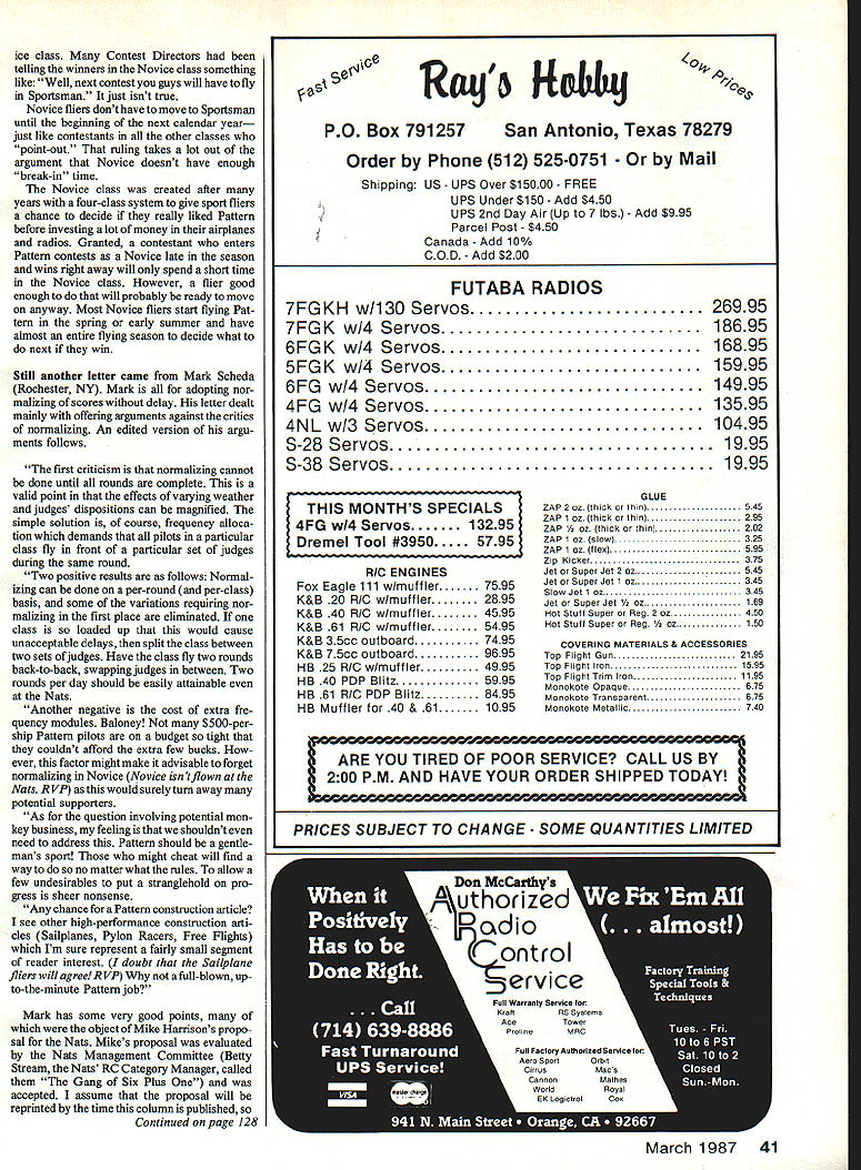 Radio Control Sport Aerobatics Ron Van Putte BOY What month has Lots RC flying No Just work However its interesting job make sure external stores bombs missiles fuel tanks like dont strike US airplanes released during flight tests Yes Virginia Santa Claus No Virginia external stores dont just fall off fly away airplane releases Sometimes have devil time getting off some airplanes what makes job interesting During last month conducting wind tunnel tests external stores separations new USAF air-to-surface attack fighter airplane will flight testing during 1987 tests conducted Arnold Engineering Development Center near Tullahoma TNthe largest wind tunnel testing facility free world team three lieutenants spent month 24 hours day/seven days week testing So getting down writing column has kind difficult Ken Willard Radio Control Modeler maga zines Sunday Flier wrote to send some helpful info attempt agitate about downwind turn bit wrote Just finished reading column December MA Naturally goaded comment First regarding scoring Actual scoring rounds can distorted barnburner round Normalized scores can distorted collu sion diving high low scores thrown outnot just throwaway try system whenever three rounds left count Another ideascore both ways add up actual normalized scores third idea Add up placements result actual plus normalized low score total placement wins did three using data column results inter estingand varied Im going give results just keep toes What ever happened professional courtesy Ken VP As downwind turn have whole new concept downwind turn made well-stacked gal turns back wind make blow skirt down An upwind turn made same gal turns corner around building comes up facing wind making skirt balloon up Now can well understand upwind turn far dangerous Last time happened Michigan Avenue Chicago windy city three pedes trians collided two taxis crashed four onlookers got severe eyestrain Commenting last item first always thought downwind turn dangerous puts problem whole new light data December column Ken refers Nats Expert class scores did scoring Ken suggested actual placing first through fifth Cooper Lewis Vail Chale Staub Throwing out high low round actual scores using remalning three scores resulted placing sequence Lewis Cooper Vall Chale Staub add actual normalized scores use high three placing Cooper Staub Vall Lewis Chale add up placing both actual normalized meth ods go low-total-placing winning placing Cooper Vail Staub Lewis Chale As can see lot variation results using different scoring methods cannot honestly say Kens sugges tions really appeals certainly give something else consider Any comments letter also came Fred Duley Crystal Lake IL wrote part have just completed letters AMA Contest Board members thought would write well due influence As ex-Pattern flier strongiy support Harrisons proposal outlaw retracts Sportsman class Its expensive time-consuming discouraging something goes wrong complex alrplane may think family man budget retracts just socioeconomic barrier overcome entering sport make easier sport fliers would inclined give Pattern try advance next class have fun process Isnt what its supposed about Novice now doesnt allow enough break-in time Advanced flier can keep advanced equipment lets have true event sport flier comment think Fred well others may have seen rule interpretation RC Aerobatics Contest Board regarding advancement Nov Proctor Antic like incredibly graceful flierslow scalelike photos taken DCRC field near what now Columbia MD 1966 1967 Will owner/builder write identify himself proper credit can given 40 Model Aviation Top Flite Models kit Ken Willard-designed Schoolboy built sport flying back 1982 Ross McMullen SilverSpring MD ATee Dee 010 powered weight 10 ozfor power loading 1 000 oz/cubic inch kit-built Kraft single-channel receiver controlled rubberband-powered Bonner compound escapement Does anybody still fly escapements digital RC/servo-operated age ice class Contest Directors telling winners Novice class something like Well next contest guys will have fly Sportsman just isnt true Novice fliers dont have move Sportsman until beginning next calendar year just like contestants other classes point-out ruling takes lot out argument Novice doesnt have enough break-in time Novice class created after years four-class system give sport fliers chance decide really liked Pattern before investing lot money airplanes radios Granted contestant enters Pattern contests Novice late season wins right away will spend short time Novice class However flier good enough will probably ready move anyway Most Novice fliers start flying Pat tern spring early summer have almost entire flying season decide what next win Still another letter came Mark Scheda Rochester NY Mark adopting nor malizing scores delay letter dealt mainly offering arguments against critics normalizing An edited version argu ments follows first criticism normalizing cannot done until rounds complete valid point effects varying weather judges dispositions can magnified simple solution course frequency alloca tion demands pilots particular class fly front particular set judges during same round Two positive results follows Normal izing can done per-round per-class basis some variations requiring nor malizing first place eliminated class loaded up would cause unacceptable delays split class between two sets ofjudges Have class fly two rounds back-to-back swapping judges between Two rounds per day should easily attainable Nats Another negative cost extra fre quency modules Baloney $500-pership Pattern pilots budget tight couldnt afford extra few bucks ever factor might make advisable forget normalizing Novice Novice isn tflown Nats R VP would surely turn away potential supporters As question involving potential mon key business feeling thatwe shouldnt need address Pattern should gentle mans sport might cheat will find way no matter what rules allow few undesirables put strangiehold pro gress shee