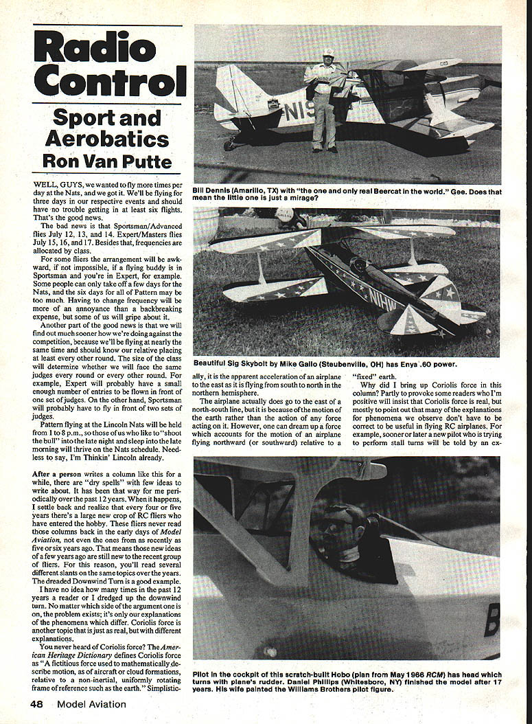 Radio Control Sport Aerobatics Ron Van Putte WEL1 GUYS wanted fly times per day Nats got Well flying three days respective events should have no trouble getting least six flights Thats good news bad news Sportsman/Advanced flies July 12 13 14 Expert/Masters flies July 15 16 17 Besides frequencies allocated class some fliers arrangement will awk ward impossible flying buddy Sportsman youre Expert example Some people can take off few days Nats six days Pattern may too much Having change frequency will annoyance backbreaking expense some us will gripe about Another part good news will find out much sooner doing against competition because well flying nearly same time should know relative placing least other round size class will determine whether will face same judges round other round example Expert will probably have small enough number entries flown front set judges other hand Sportsman will probably have fly front two sets judges Pattern flying Lincoln Nats will held ito 8pm us like shoot bull late night sleep late morning will thrive Nats schedule Need less say Im Thinkin Lincoin already After person writes column like dry spells few ideas write about has way peri odically overthepast 12 years Whenithappens settle back realize four five years theres large new crop RC fliers have entered hobby fliers never read columns back early days Model Aviation ones recentiy five six years ago means new ideas few years ago still new recent group fliers reason youll read several different slants same topics over years dreaded Downwind Turn good example have no idea times past 12 years reader dredged up downwind turn No matter side argument problem exists its explanations phenomena differ Coriolis force another topic just real different explanations never heard Coriolis force Amer ican Heritage Dictionary defines Coriolis force fictitious force used mathematically de scribe motion aircraft cloud formations relative non-inertial uniformly rotating frame reference such earth Simplistically apparent acceleration airplane east flying south north northern hemisphere airplane actually does go east north-south line because motion earth rather action force acting However can dream up force accounts motion airplane flying northward southward relative fixed earth did bring up Coriolis force column Partly provoke some readers Im positive will insist Coriolis force real mostly point out explanations phenomena observe dont have correct useful flying RC airplanes example sooner later new pilot trying perform stall turns will told ex 48 Model Aviation Bili uennis lAmarillo IA WlTfl tne oniy real Beercat world Gee Does mean little just mirage Beautiful Sig Skybolt Mike Gailo Steubenvilie OH has Enya 60 power Pilot cockpit scratch-built Hobo plan May 1966 RCM has head turns planes rudder Daniel Phillips Whitesboro NY finished model after 17 yearn HIs wife painted Williams Brothers pilot figure perienced pilot turn stall turn performed crosswind should made wind because wind helps tail come around neatly explains cross wind stall turn doesnt works Unfortu nately its wrong explanation because airplane has no idea its crosswind Now believe Ive provoked still readers will insist Im wrong about cross wind stall turn Well its job provoke readers once way have unique method getting rid flies get car people scramble after beating windows getting frustrated walt knock themselves unconscious pick up throw out window get knock themselves uncon scious Its really very simple believe conservation total energy know thats concept upwind/downwind turn proponents use convince airplane will climb doing 1800 turn downwind heading dive 1800 turn upwind heading Still confused Total energy proponents say sum potential energy kinetic energy constant turn Consequently airplane going downwind will going faster relative ground airplanes airspeed amount equal wind ve locity Conversely its going upwind will going slower airspeed wind velocity Obviously kinetic energy going downwind far higher going upwind potential energy has increase turn downwind upwind keep total energy constant other words airplane has climb Now turn done rapidly climb must rapid fly doesnt understand techni cal things keeps buzzing around car So drive down road fast its legal Sooner later fly will go back car front downwind rapid U-turn upwind windshield Thats knocks himself unconscious climbing rapidly striking head roof car Simple understand high school physics isnt Isnt often read about competing companies getting along well agreeing anything heard about dilly potential problem worked out well because both companies acted responsibly press release Ive edited Sig Manufacturing Company describes situation Incredible Name Game During course bringing out new product always lot trial tribulation racking old brains come up catchy new name Hopefuliy will say something positive about new product well being descrip tive did however have slight problem name new iron-on plastic covering material UltraCote Well going call tried catalogs printed way too As may have guessed mail model magazines both Sig Carl Goldberg Models unknown other both busily working new iron-on plastic covering material problem both picked same great name UltraCote Now comes fun part first found out about just before TIM Show Pasadena received some Continued page 160 K U CESSNA 150 AERO BAT COSMIC WIND 1W Cox Hobbies new EZ Flyers perfect control line planes first time flyer Equipped famous Cox 049 engine newly designed snap starter get airborne flying fast After winning wings step up racy Cosmic Wind same easy starting Cox 049 engine insures lots exciting flight time See complete line Cox powered models accessories Hobby retailer today Enclose $100 SASE minicatalog COX HOBBIES 1525 E Warner Ave Santa Ana CA 92705 IMPORTANT PROPELLER SAFETY MESSAGE safety precautions designed enhance enjoy ment model flying should part modelers routine both flying site workshop 1 Select correct propeller size following engine 