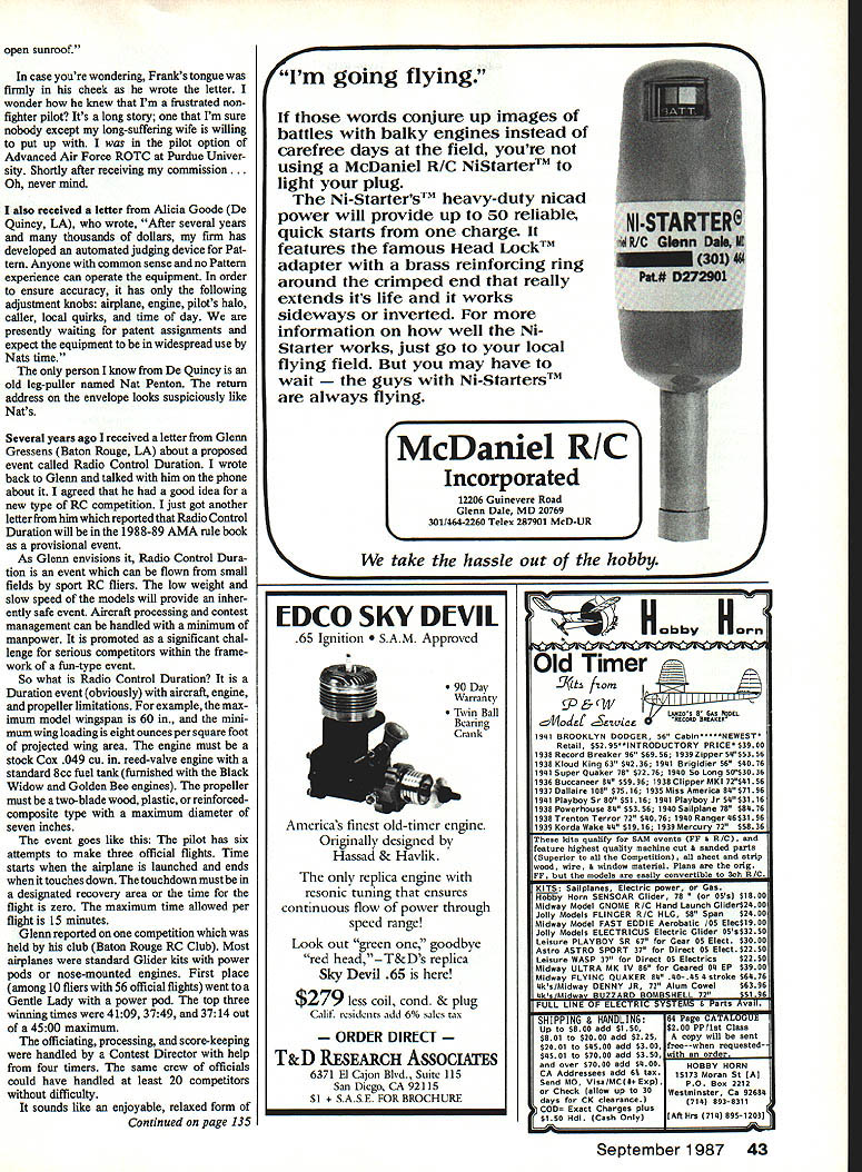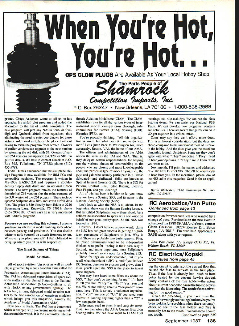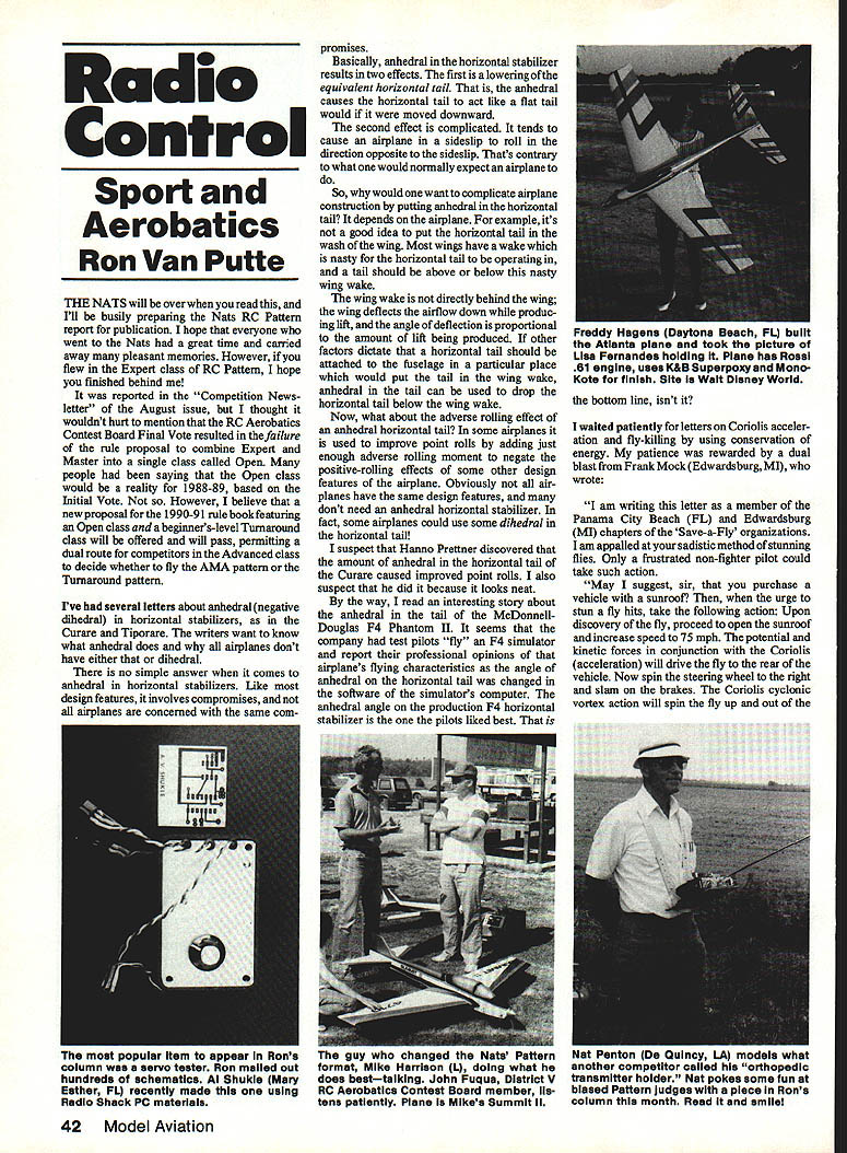 Radio Control Sport Aerobatics Ron Van Putte THE NATS will over read Ill busily preparing Nats RC Pattern report publication hope everyone went Nats great time carried away pleasant memories However flew Expert class RC Pattern hope finished behind reported Competition News letter August issue thought wouldnt hurt mention RC Aerobatics Contest Board Final Vote resulted failure rule proposal combine Expert Master single class called Open people saying Open class would reality 1988-89 based Initial Vote However believe new proposal 1990-91 rule book featuring Open class beginners-level Turnaround class will offered will pass permitting dual route competitors Advanced class decide whether fly AMA pattern Turnaround pattern Pvc several letters about anhedral negative dihedral horizontal stabilizers Curare Tiporare writers want know what anhedral does airplanes dont have either dihedral no simple answer comes anhedral horizontal stabilizers Like design features involves compromises airplanes concerned same cornpromises Basically anhedral horizontal stabilizer results two effects first lowering equivalent horizontal tail anhedral causes horizontal tall act like flat tail would moved downward second effect complicated tends cause airplane sideslip roll direction opposite sideslip Thats contrary what would normally expect airplane So would want complicate airplane construction putting anhedral horizontal tall depends airplane example its good idea put horizontal tail wash wing Most wings have wake nasty horizontal tail operating tail should above below nasty wing wake wing wake directly behind wing wing deflects airflow down produc ing lift angle deflection proportional amount lift being produced other factors dictate horizontal tail should attached fuselage particular place would put tail wing wake anhedral tail can used drop horizontal tail below wing wake Now what about adverse rolling effect anhedral horizontal tail some airplanes used improve point rolls adding just enough adverse rolling moment negate positive-rolling effects some other design features airplane Obviously air planes have same design features dont need anhedral horizontal stabilizer fact some airplanes could use some dihedral horizontal tail suspect Hanno Prettner discovered amount anhedral horizontal tail Curare caused improved point rolls also suspect did because looks neat way read interesting story about anhedral tail McDonnellDouglas F4 Phantom II seems company test pilots fly F4 simulator report professional opinions airplanes flying characteristics angle anhedral horizontal tail changed software simulators computer anhedral angle production F4 horizontal stabilizer the pilots liked best bottom line isnt waited patiently letters Coriolis acceler ation fly-killing using conservation energy patience rewarded dual blast Frank MockEdwardsburg MI wrote am writing letter member Panama City Beach FL Edwardsburg MI chapters Save-a-Fly organizations Lam appalled sadistic method stunning flies Only frustrated non-fighter pilot could take such action May suggest sir purchase vehicle sunroof urge stun fly hits take following action Upon discovery fly proceed open sunroof increase speed 75 mph potential kinetic forces conjunction Coriolis acceleration will drive fly rear vehicle Now spin steering wheel right slam brakes Coriolis cyclonic vortex action will spin fly up out 42 Model Aviation Freddy Hagens Daytona Beach FL built Atlanta plane took picture Lisa Fernandes holding Plane has Rossi 61 engine uses K&B Superpoxy Mono Kote finish Site Wait Disney World popular item appear Rons column servo tester Ron mailed out hundreds schematics Al Shukie Mary Esther FL recently made using Radio Shack PC materials guy changed Nate Pattern Nat Penton DC Quincy LA models what format Mike Harrison L doing what another competitor called orthopedic does besttalking John Fuqua District V transmitter holder Nat pokes some fun RC Aerobatics Contest Board member is- biased Pattern judges piece Rons tens patiently Plane Mikes Summit ii column month Read smile open sunroof case youre wondering Franks tongue firmly cheek wrote letter wonder knew Im frustrated nonfighter pilot Its long story Im sure nobody except long-suffering wife willing put up pilot option Advanced Air Force ROTC Purdue Univer sity Shortly after receiving ~ssion. Oh never mind also received letter Alicia Goode DC Quincy LA wrote After several years thousands dollars firm has developed automated judging device Pat tern Anyone common sense no Pattern experience can operate equipment order ensure accuracy has following adjustment knobs airplane engine pilots halo caller local quirks time day presently waiting patent assignments expect equipment widespread use Nats time person know De Quincy old leg-puller named Nat Penton return address envelope looks suspiciously like Nats Several years ago received letter Glenn Gressens Baton Rouge LA about proposed event called Radio Control Duration wrote back Glenn talked him phone about agreed good idea new type RC competition just got another letter him reported Radio Control Duration will 198 8-89 AMA nile book provisional event As Glenn envisions Radio Control Dura tion event can flown small fields sport RC fliers low weight slow speed models will provide inher ently safe event Aircraft processing contest management can handled minimum manpower promoted significant chal lenge serious competitors within frame work fan-type event So what Radio Control Duration Duration event obviously aircraft engine propeller limitations example max imum model wingspan 60 mini mum wing loading eight ounces per square foot projected wing area engine must stock Cox 049 cu reed-valve engine standard 8cc fuel tank furnished Black Widow Golden Bee engines propeller must two-blade wood plastic reinforcedcomposite type maximum diameter seven inches event goes like pilot has six attempts make three official flights Time starts airplane launched ends touches down touchd