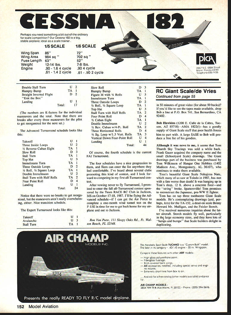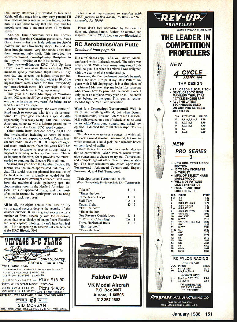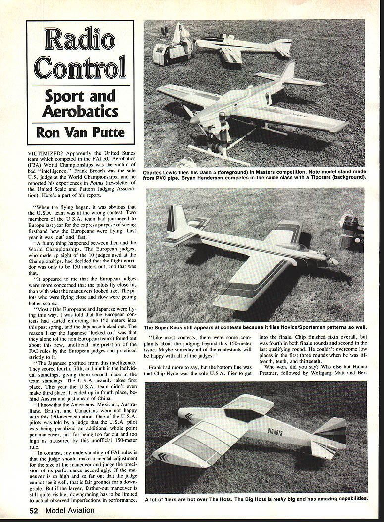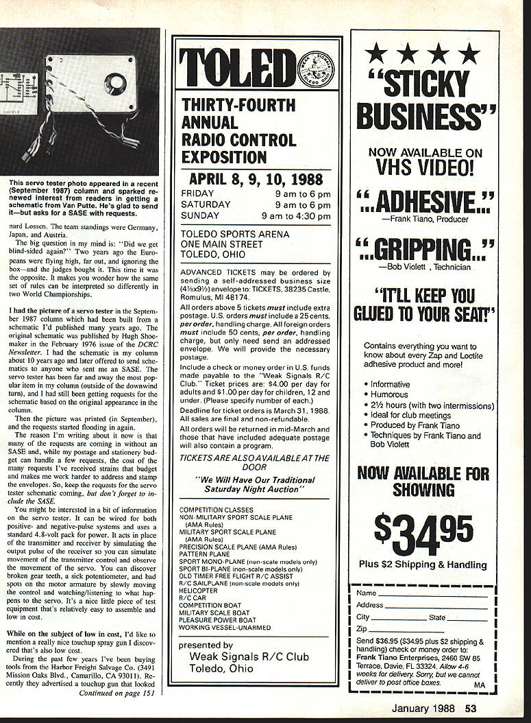 VICTIMIZED Apparently United States team competed FM RC Aerobatics F3A World Championships victim bad intelligence Frank Broach sole US judge World Championships reported experiences Points newsletter United Scale Pattern Judging Associa tion Heres part report flying began obvious USA team wrong contest Two members USA team journeyed Europe last year express purpose seeing firsthand Europeans flying Last year out fast funny thing happened between World Championships European judges made up eight 10 judges used Championships decided flight corri dor 150 meters out appeared European judges concerned pilots fly close what maneuvers looked like pi lots flying close slow getting better scores Most Europeans Japanese fly ing way told European con tests started enforcing 150 meters idea past spring Japanese lucked out reason say Japanese lucked out alone non-European teams found out about new unofficial interpretation FAI rules European judges practiced strictly Japanese profited intelligence scored fourth fifth ninth individ ual standings giving second place team standings USA usually takes first place year USA team didnt make third place ended up fourth place hind Austria just ahead China know Americans Mexicans Austra lians British Canadians happy 150-meter situation USA pilots told judge USA pilot being penalized additional whole point per maneuver just being too far out too high measured unofficial 150-meter rule contrast understanding FAI rules judge should make mental adjustment size maneuver judge preci sion its performance accordingly ma neuver high far out judge cannot see well fair grounds down grade larger farther-out maneuver still quite visible downgrading has limited actual observed imperfections performance Like contests some com plaints about judging beyond 150-meter issue Maybe someday contestants will happy judges Frank say bottom line Chip Hyde sole USA flier get finals Chip finished sixth overall fourth both finals rounds second last qualifying round couldnt overcome low places first three rounds fif teenth tenth thirteenth won did say else Hanno Pretsner followed Wolfgang Matt Ber 52 Model Aviation Radio Conoi Sport Aerobatics Ron Van Putte Charles Lewis flies Dash 5 foreground Masters competition Note model stand made PVC pipe Bryan Henderson competes same class Tiporare background Super Kaos still appears contests because tiles Novice/Sporlsman patterns well lot fliers hot over Hots Big Hots really big has amazing capabilities nard Lossen team standings Germany Japan Austria big question mind Did get blind-sided again Two years ago Euro peans flying high far out ignoring boxand judges bought time opposite makes wonder same set rules can interpreted differently two World Championships picture servo tester Septem ber 1987 column built schematic Id published years ago original schematic published Hugh Shoe maker February 1976 issue DCRC Newsletter schematic column about 10 years ago later offered send sche matics anyone sent SASE servo tester has far away pop ular item column outside downwind turn still getting requests schematic based original appearance column picture printed September requests started flooding again reason Im writing about now requests coming SASE postage stationery bud get can handle few requests cost requests Ive received strains budget makes work harder address stamp envelopes So keep requests servo tester schematic coming don t forget clude SASE might interested bit information servo tester can wired both positive- negative-pulse systems uses standard 48-volt pack power acts place transmitter receiver simulating output pulse receiver can simulate movement transmitter control observe movement servo can discover broken gear teeth sick potentiometer bad spots motor armature slowly moving control watching/listening what hap pens servo Its nice little piece test equipment thats relatively easy assemble low cost subject low cost Id like mention really nice touchup spray gun discov ered thats also low cost During past few years Ive buying tools Harbor Freight Salvage Co 3491 Mission Oaks Blvd Camarillo CA 93011 Re cently advertised touchup gun looked Continued page 151 / D IRTY-FOURTH ANNUAL RADIO CONTROL EXPOSITION APRIL 8 9 10 1988 FRIDAY9am to6pm RDAY9amto6pm SUNDAY9 am 430 pm TOLEDO SPORTS ARENA ONE MAIN STREET TOLEDO OHIO ADVANCED TICKETS may ordered sending self-addressed business size 41/5x91/2 envelope TICKETS 38235 Castle Romulus Ml 481 74 orders above 5 tickets must include extra postage US orders must include 25 cents per order handling charge foreign orders must include 50 cents per order handling charge need send addressed envelope will provide necessary postage Include check money order US funds made payable Weak Signals R/C Club Ticket prices $400 per day adults $100 per dayfor children 12 under Please specify number Deadline ticket orders March 31 1988 sales final non-refundable orders will returned mid-March have included adequate postage will also contain program TICKETS AREALSOA VAILABLEA T THE DOOR Will Have Traditional Saturday Night Auction COMPETITION CLASSES NON-MILITARY SPORT SCALE PLANE AMA Rules MILITARY SPORT SCALE PLANE AMA Rules PRECISION SCALE PLANE AMA RulesI PATrERN PLANE SPORT MONO-PLANE non-scale models SPORT 81-PLANE non-scale models onlyl OLD TIMER FREE FLIGHT R/C ASSIST R/C SAILPLANE non-scale models Only HELICOPTER R/C CAR COMPETITION BOAT MILITARY SCALE BOAT PLEASURE POWER BOAT WORKING VESSEL-UNARMED presented Weak Signals R/C Club Toledo Ohio STICKY BUSINESS NOW AVAILABLE ON VHS VIDEO ADHESIYEUU Frank Tiano Producer UUGRIPPINGU Bob Violett Technician ira KEEP YOU GWED TO YOUR SEAlI Contains everything want know about Zap Loctite adhesive product Informative Humorous 2 hours two intermissions Ideal club meetings Produced Frank Tiano Techniques Frank Tiano Bob Violett NOW AVAILABLE FOR SHOWING $3495 Plus $2 Shipping & Handling Name Address City ______________ State __________ Zip Send $3695 $3495 plus $2 shipping & han