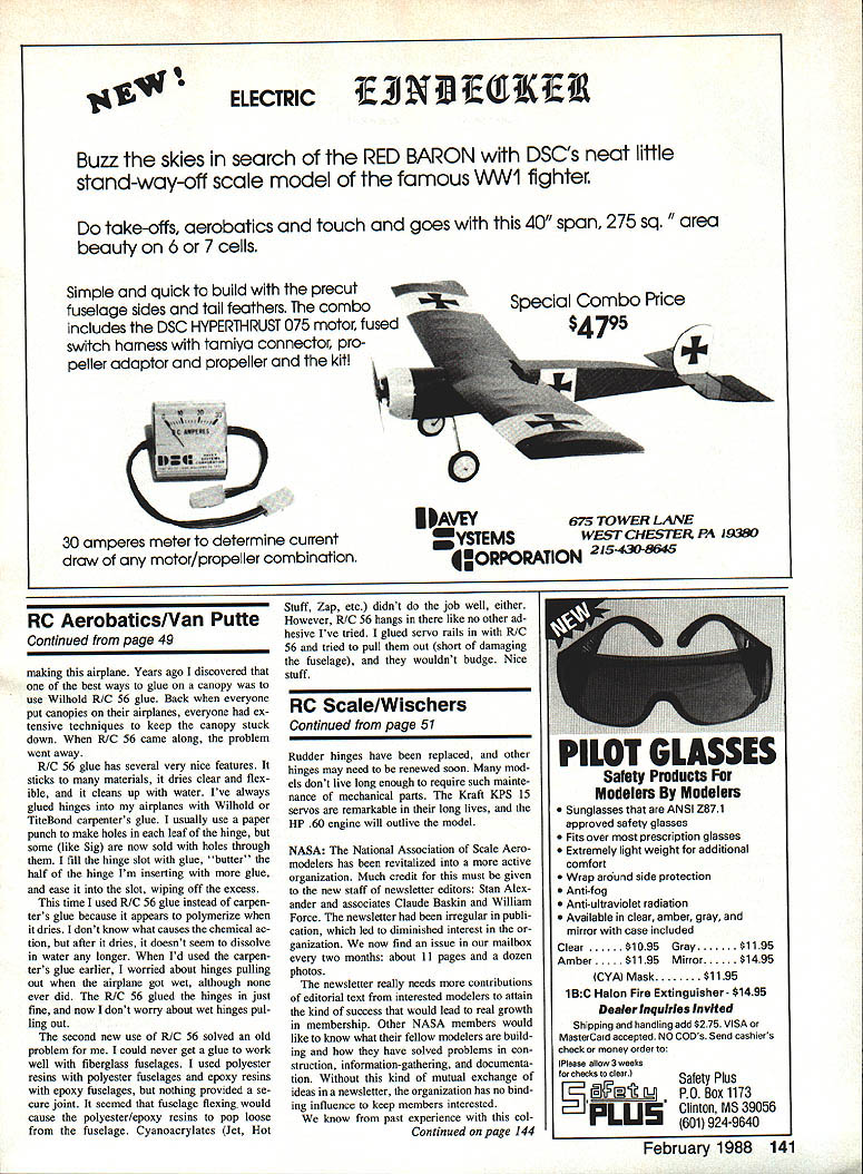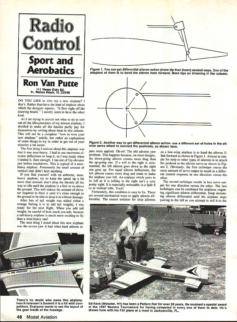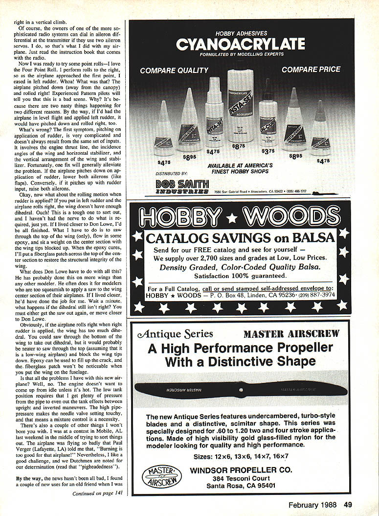 DO YOU LIKE trim out new airplane dont Rather have kind airplane about designer reports flew right off drawing board mostly seem have other kind As sat trying puzzle out what to sort out idiosyncrasies newest airplane decided make hassles partly pay themselves writing about column will complete trim new airplane article rather explanation some things try order get Out miseries bit easier first thing noticed about airplane was nose-heavy use enormous el evator deflections loop ready landed Sure enough ran Out Up elevator just before touchdown typical noseheavy airplane Fortunately small amount vertical sink didnt hurt anything find yourself airborne noseheavy airplane try keep speed up bit normal dont drop throttle way idle until airplane foot above ground will reduce amount eleva tor required flare until its close enough ground able drop damage After lots tail weight added what strange feeling add tail weight ready next flight add tail weight careful much add because tail-heavy airplane much exciting fly nose-heavy next thing noted about new airplane severe yaw hard aileron in0 Figure 1 can get differential aileron action Up Down several ways simplest bend aileron horn forward tips trimming column o _______________________ t 0. Figure 2 Another way get differential aileron action use different set holes ail eron servo wheel connect pushrods shown puts applied Oh-oh old adverse yaw problem happens because designs down-going aileron creates drag up-going roll right com manded left aileron goes down right goes up equal aileron deflections left aileron causes drag tends make airplane yaw left An airplane yaws its left rolling right isnt very pretty sight especially noticeable Split S vertical rolls Yuck Fortunately condition easy fix arc several mechanical ways apply aileron dif ferential easiest solution strip ailerons low-wing airplane bend aileron Z link forward shown Figure 1 Almost sim ple strip other types ailerons attach pushrod aileron servo shown Fig ure 2 Obviously first technique causes same amount servo output result differ ent control response direction versus other second technique results less servo Out put direction versus other two techniques can combined airplanes requir ing significant aileron differential Keep increas ing aileron differential until airplane stops yawing left attempt roll 48 Model Aviation Raio Control Sport Aerobatics Ron Van Putte I Sleepy Oaks Rd Ft Walton Beach FL 32548 Theres no doubt owns airplane Ivan Kristensens Summit II hit com petitors Everyone wants see layout gear inside fuselage Ed Keck Webster NY has Pattern flier over 20 years received special award 1987 Masters Tournament having competed date Hes shown FAI plane meet Jacksonville FL right vertical climb course owners phisticated radio systems can dial aileron dif ferential transmitter use two aileron servos thats what did air plane Just read instruction book comes radio Now ready try some point rollsI love Four Point Roll perform rolls right airplane approached first point eased left rudder Whoa What airplane pitched down away canopy rolled right Experienced Pattern pilots will tell bad scene Its cause two nasty things happening two different reasons way Id airplane level flight applied left rudder would have pitched down rolled right too Whats wrong first symptom pitching application rudder very complicated doesnt always result same set inputs involves engine thrust line incidence angles wing horizontal stabilizer vertical arrangement wing stabi lizer Fortunately fix will generally alleviate problem airplane pitches down ap plication rudder lower both ailerons like flaps Conversely pitches up rudder input raise both ailerons Okay now what about rolling motion rudder applied put left rudder airplane rolls right wing doesnt have enough dihedral Ouch tough sort out havent nerve what re quired just yet lived closer Don Lowe Id finished What have to saw through top wing flow some epoxy sit weight center section wing tips blocked up epoxy cures Ill put fiberglass patch across top cen ter section restore structural integrity wing What does Don Lowe have has probably done wings other modeler often does modelers too squeamish apply saw wing center section airplanes lived closer hed have done job Wait minute what happens dihedral still isnt right must either get saw out again move closer Don Lowe Obviously airplane rolls right right rudder applied wing has too much dihe deal could saw through bottom wing take out dihedral would probably neater saw through top assuming low-wing airplane block wing tips down Epoxy can used fill up crack fiberglass patch wont noticeable put wing fuselage problems have new air plane Well no engine doesnt want come up idle unless its hot low tank position requires get plenty pressure pipe out tank effects between upright inverted maneuvers high pipepressure makes needle valve setting touchy means mixture control necessity Theres also couple other things wont bore contest Mobile AL last weekend middle trying sort things Out airplane flying badly Paul Verger Lafayette LA told Burning too good airplane Nevertheless like good challenge Dutchmen noted determination read pigheadedness way news hasnt bad found couple new uses old friend Continued page 141 cAntique Series new Antique Series features undercambered turbo-style blades distinctive scimitar shape series specially designed 60 120 two four stroke applica tions Made high visibility gold glass-filled nylon modeler looking quality high performance Sizes 12x6 13x6 14x7 16x7 tc22l WINDSOR PROPELLER CO 384 Tesconi Court Santa Rosa CA 95401 February 1988 49 AVAILABLE AT AMERICAS DISTRIBUTED BY FINEST HOBBY SHOPS SkAJflH END WDZDD 7ssO too Gab e Road cadeo CA 93422 455-1717 MASTER AIRSCREW A High Performance Propeller Distinctive Shape ELECTRIC Buzz skies search RED BARON DSCs neat lift le stand-way-off scale model famous W\NI fighter take-offs aerobatics touch beauly 6 7 cells Simple quick build precut fuselage sides tail fe