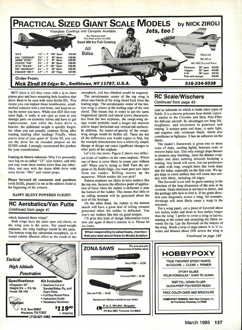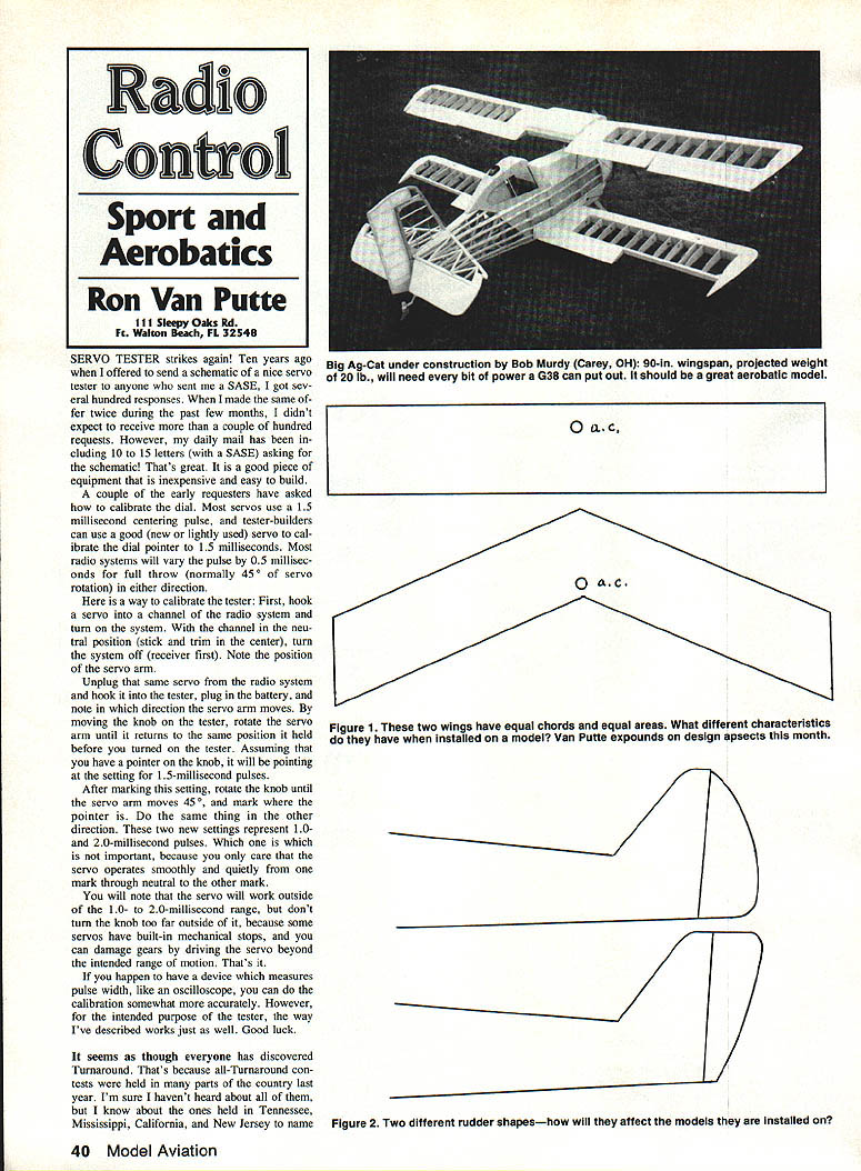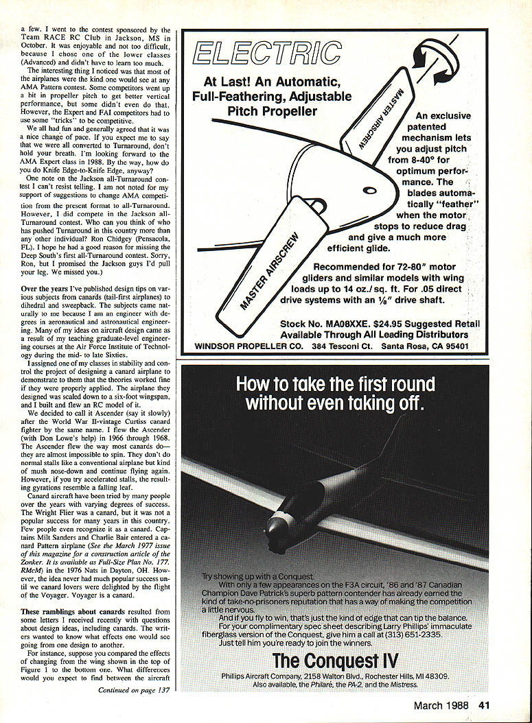 SERVO TESTER strikes again Ten years ago offered send schematic nice servo tester anyone sent mc SASE got sev eral hundred responses made same fer twice during past few months didnt expect receive couple hundred requests However daily mail has cluding 10 15 letters SASE asking schematic Thats great good piece equipment inexpensive easy build couple early requesters have asked calibrate dial Most servos use 15 millisecond centering pulse tester-builders can use good new lightly used servo cal ibrate dial pointer 15 milliseconds Most radio systems will vary pulse 05 millisec onds full throw normally 450 servo rotation either direction way calibrate tester First hook servo channel radio system turn system channel neu tral position stick trim center turn system off receiver first Note position servo arm Unplug same servo radio system hook tester plug battery note direction servo arm moves moving knob tester rotate servo arm until returns same position held before turned tester Assuming have pointer knob will pointing setting 15-millisecond pulses After marking setting rotate knob until servo arm moves 450 mark pointer same thing other direction two new settings represent 10and 20-millisecond pulses Which important because care servo operates smoothly quietly mark through neutral other mark will note servo will work outside 10- 20-millisecond range dont turn knob too far outside because some servos have built-in mechanical stops can damage gears driving servo beyond intended range motion Thats happen have device measures pulse width like oscilloscope can calibration somewhat accurately However intended purpose tester way Ive described works just well Good luck seems though everyone has discovered Turnaround Thats because all-Turnaround con tests held parts country last year Im sure havent heard about know about ones held Tennessee Mississippi California New Jersey name 0 LC 0 dc Figure 1 two wings have equal chords equal areas What different characteristics have installed model Van Putte expounds design psects month Figure 2 Two different rudder shapeshow will affect models thy installed 40 Model Aviation Radio Conoi Sport Aerobatics Ron Van Putte III Sleepy Oaks Rd Ft Walton leach FL 32548 Big Ag-Cat under construction Bob Murdy Carey OH 90-in wingspan projected weight 20 lb will need bit power G38 can put out should great aerobatic model few went contest sponsored Team RACE RC Club Jackson MS October enjoyable too difficult because chose lower classes Advanced didnt have learn too much interesting thing noticed airplanes kind would see AMA Pattern contest Some competitors went up bit propeller pitch get better vertical performance some didnt However Expert FAI competitors use some tricks competitive fun generally agreed nice change pace expect say converted Turnaround dont hold breath Im looking forward AMA Expert class 1988 way Knife Edge-to-Knife Edge anyway note Jackson all-Turnaround con test cant resist telling am noted support suggestions change AMA competi tion present format all-Turnaround However did compete Jackson allTurnaround contest can think has pushed Turnaround country other individual Ron Chidgey Pensacola FL hope good reason missing Deep Souths first all-Turnaround contest Sorry Ron promised Jackson guys Id pull leg missed Over years Ive published design tips var ious subjects canards tail-first airplanes dihedral sweepback subjects came nat urally because am engineer de grees aeronautical astronautical engineer ing ideas aircraft design came result teaching graduate-level engineer ing courses Air Force Institute Technol ogy during mid- late Sixties assigned classes stability con trol project designing canard airplane demonstrate theories worked fine properly applied airplane designed scaled down six-foot wingspan built flew RC model decided call Ascender say slowly after World War 11-vintage Curtiss canard fighter same name flew Ascender Don Lowes help 1966 through 1968 Ascender flew way canards almost impossible spin dont normal stalls like conventional airplane kind mush nose-down continue flying again However try accelerated stalls result ing gyrations resemble falling leaf Canard aircraft have tried people over years varying degrees success Wright Flier canard popular success years country Few people recognize canard Cap tains Milt Sanders Charlie Bair entered ca nard Pattern airplane See March 1977 issue magazine construction article Zonker available Full-Size Plan No 177 RMcM 1976 Nats Dayton OH ever idea never much popular success un til canard lovers delighted flight Voyager Voyager canard ramblings about canards resulted some letters received recently questions about design ideas including canards writ ers wanted know what effects would see going design another instance suppose compared effects changing wing shown top Figure 1 bottom What differences would expect find between aircraft Continued page 137 March 1988 41 Last An Automatic Full-Feathering Adjustable Pitch Propeller An exclusive patented mechanism lets adjust pitch 84Oo optimum perfor mance blades automa tically feather motor stops reduce drag give much Recommended 72-80 motor gliders similar models wing loads up 14 ozI sq ft 05 direct drive systems e shaft Stock No MAO8XXE $2495 Suggested Retail Available Through Leading Distributors WINDSOR PROPELLER CO 384 Tesconi Ct Santa Rosa CA 95401 PRACTICAL SIZED GIANT SCALE MODELS NICK ZIROLI Jets too OC-3lA 1140 Span$4200 F4U CORSAIW2 193 Span$3000 ASMS ZERO2A 191 Span$3000 CuRTISP402A 194 Span$3000 AT-e TEXAN24 1101 Span$3000 F5F BEARCAT2A 186 Span$3000 FOKKERDR-127 183 Tripe$2700 Canopies Available Plans Sent Post-Paid within USA Send 5O Full Catalog Balsa Order Nick Ziroli 29 Edgar Dr Smithtown NY 11787 USA BUT come -in-bore pinion gear have mounting hole locations allow used ferrite OSs means can replace troublesome smallshafted reducers real brute keep us ing motor have cost $35 list may seem high really notjust soon damage parts economy drives have ge